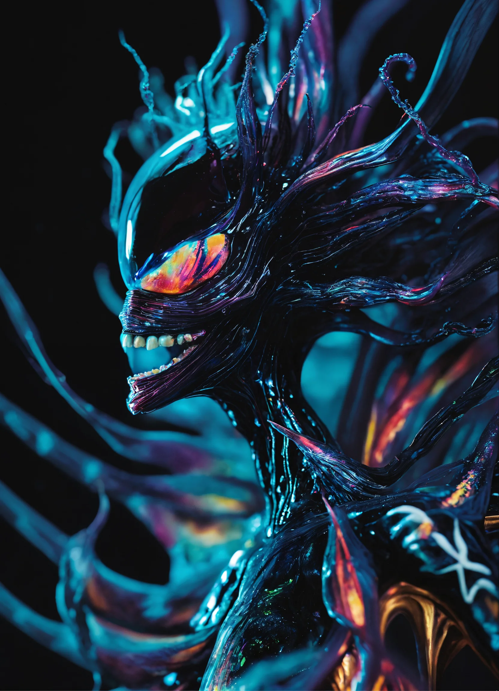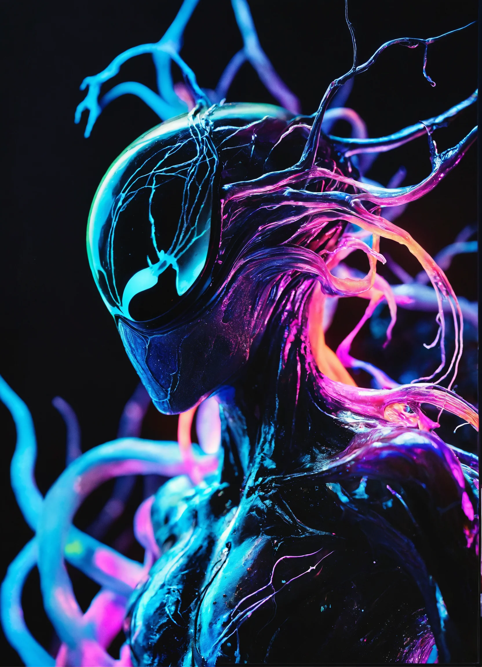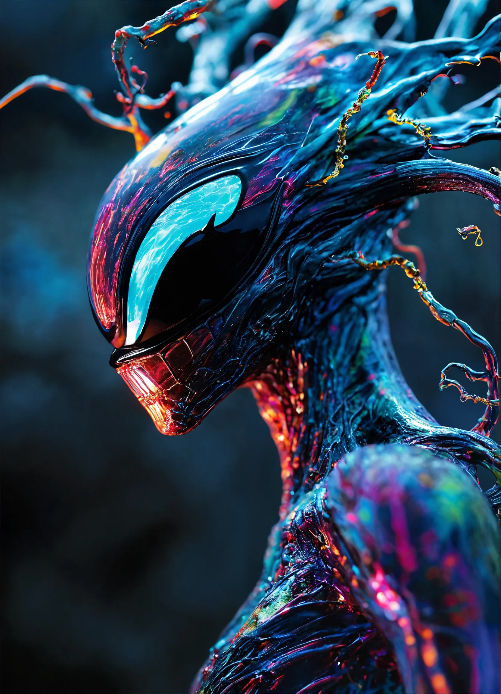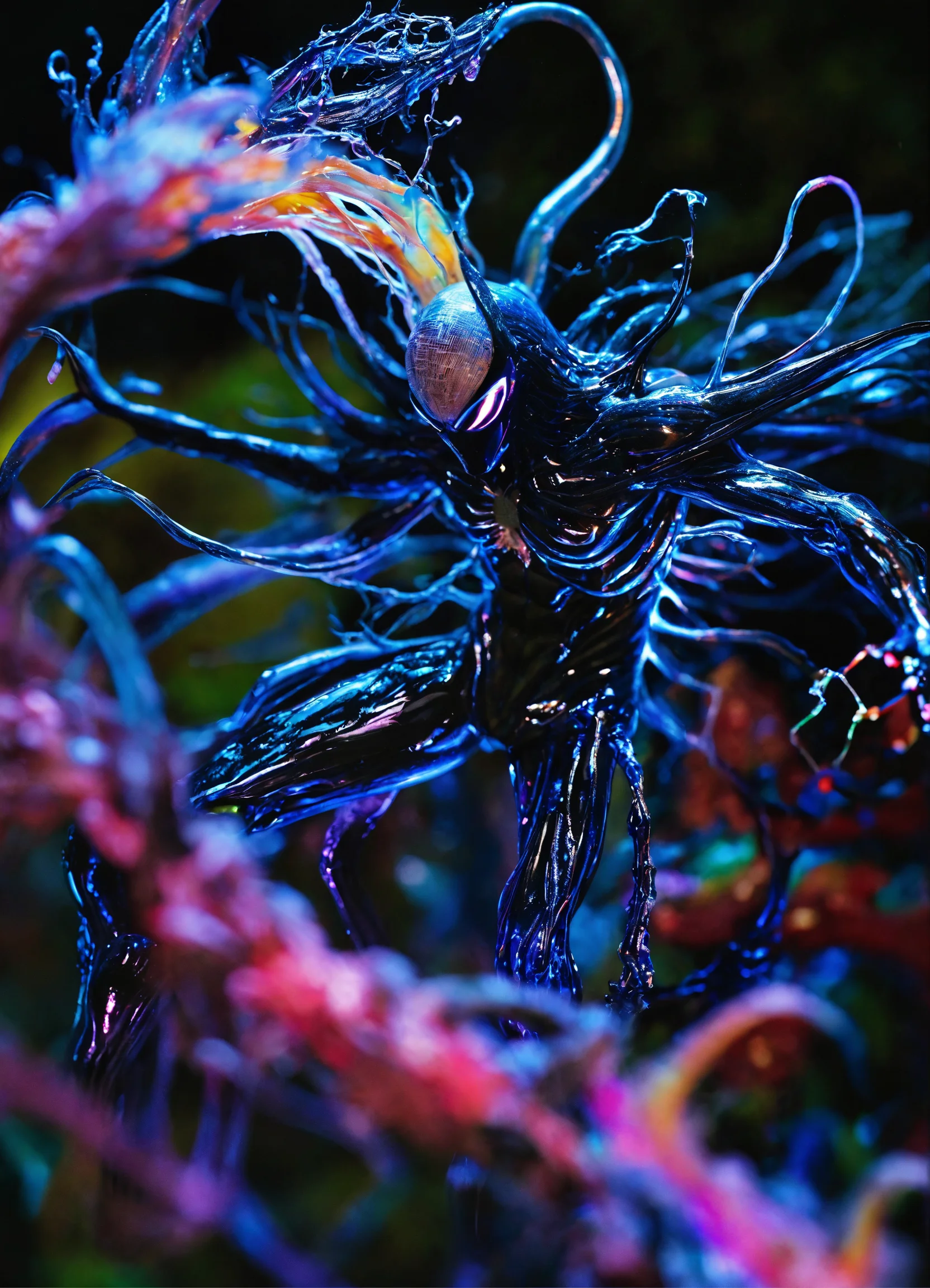 A dazzlingly shimmering sonic symbiote radiates bioluminescent hues, embodying a captivating blend of enchantment and vibrancy. its luminescent tendrils pulsate with vivid colors, while its ethereal form undulates gracefully. this mesmerizing subject, showcased in an impeccably detailed photograph, captures the symbiote's otherworldly beauty and its harmonious connection to soundwaves. the image portrays a breathtaking kaleidoscope of colors, highlighting the symbiote's iridescent splendor against a contrasting dark backdrop. each intricate detail is impeccably captured, immersing viewers in the symbiote's enchanting aura. the impeccable image quality beautifully accentuates the symbiote's awe-inspiring presence, transforming it into a captivating visual masterpiece.