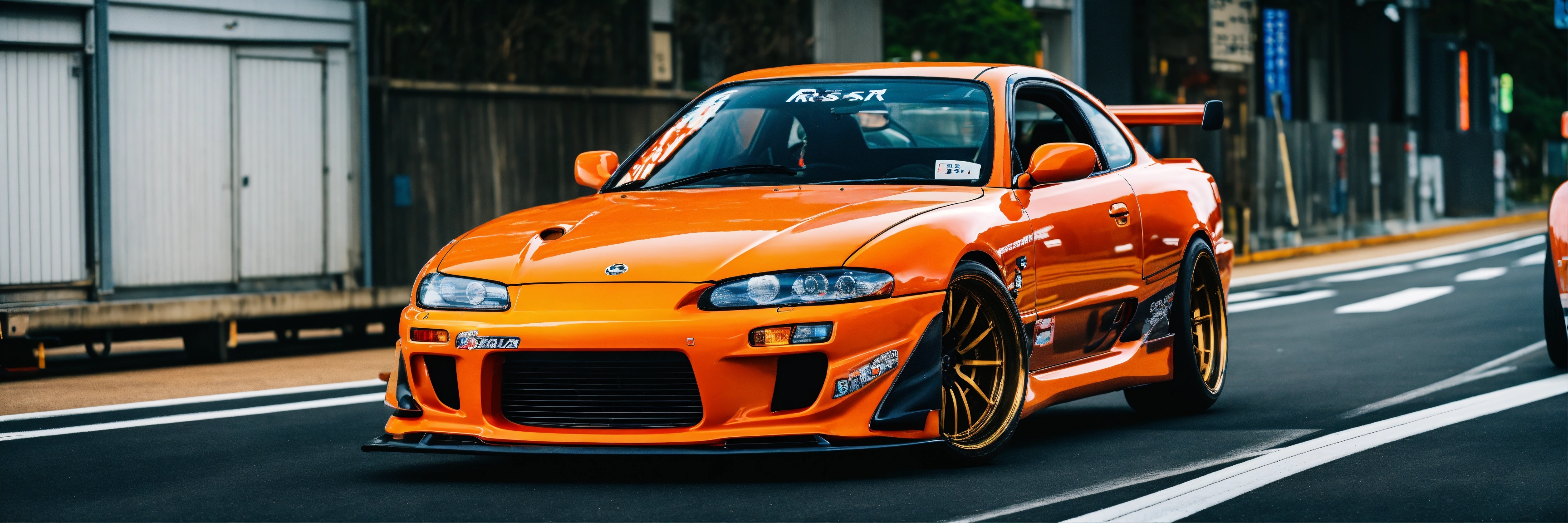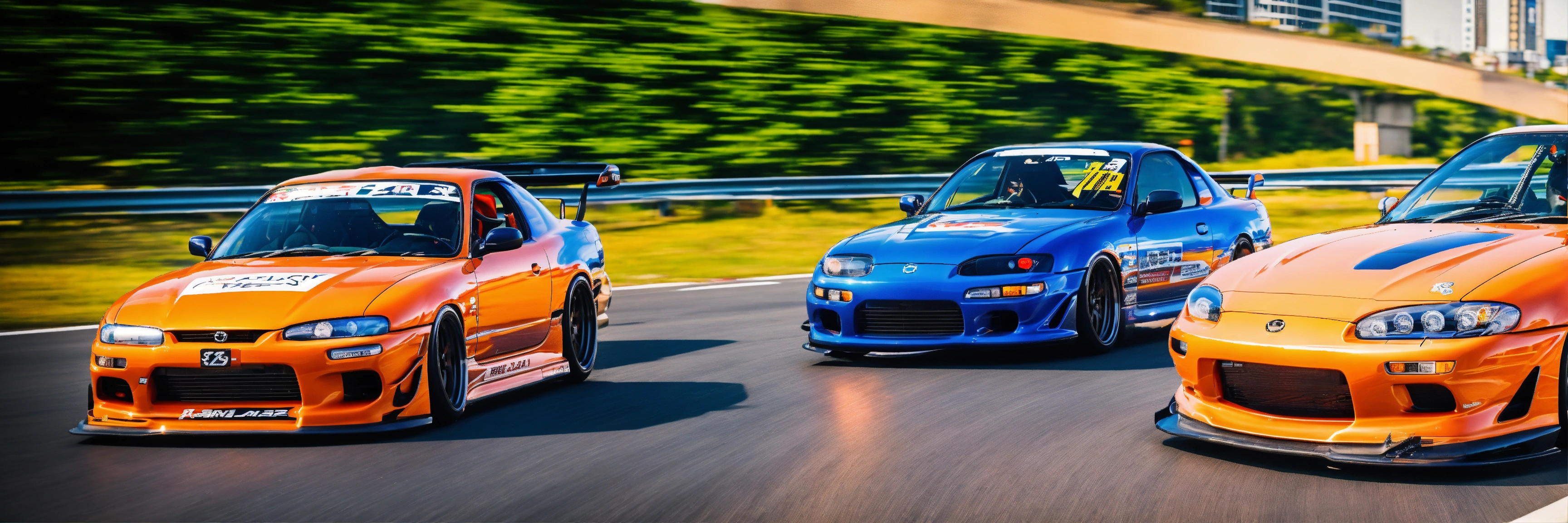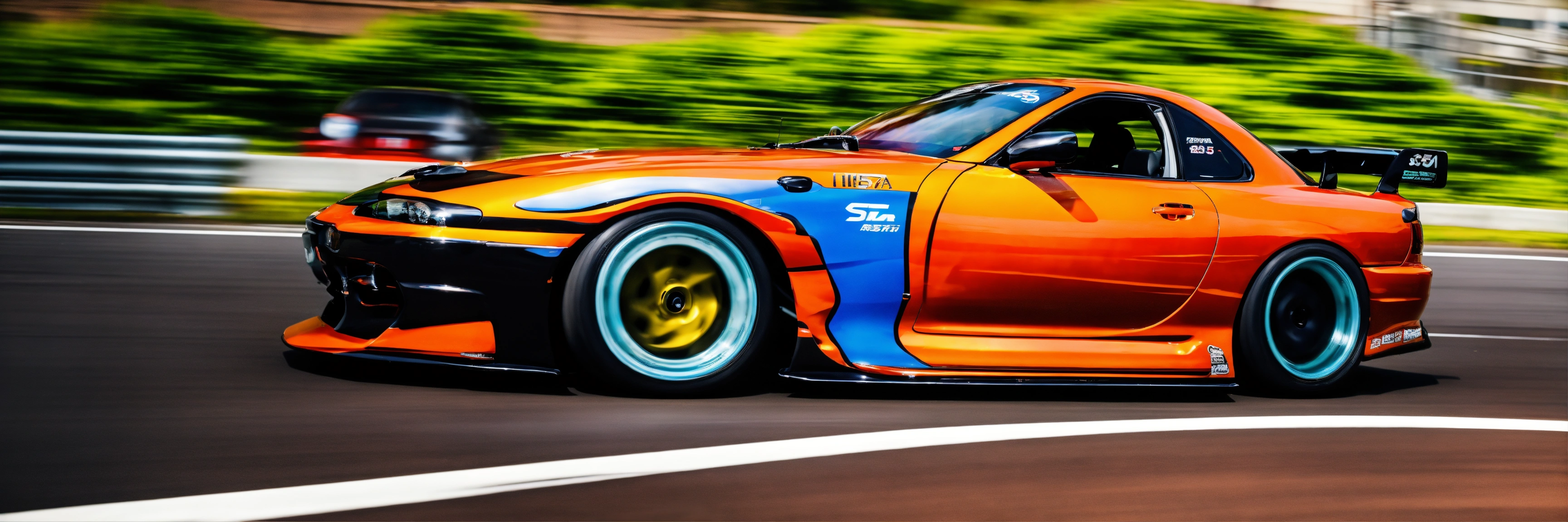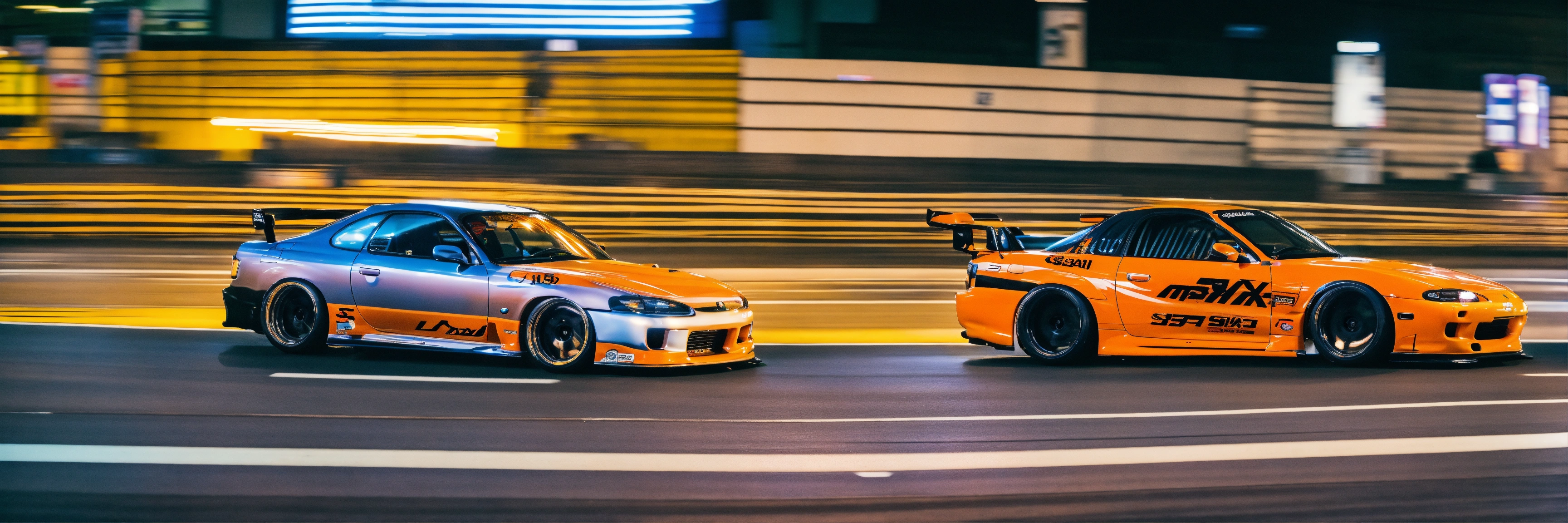 A colorful orange nissan silvia s15 with a wide-body kit racing a white mazda rx7 in tokyo highway