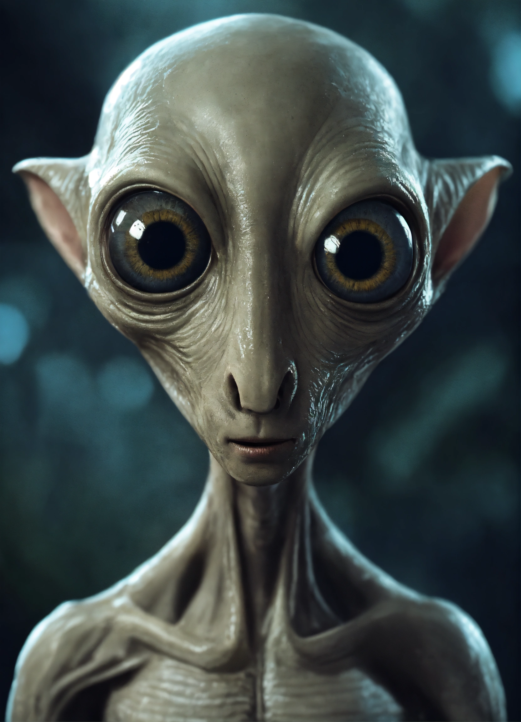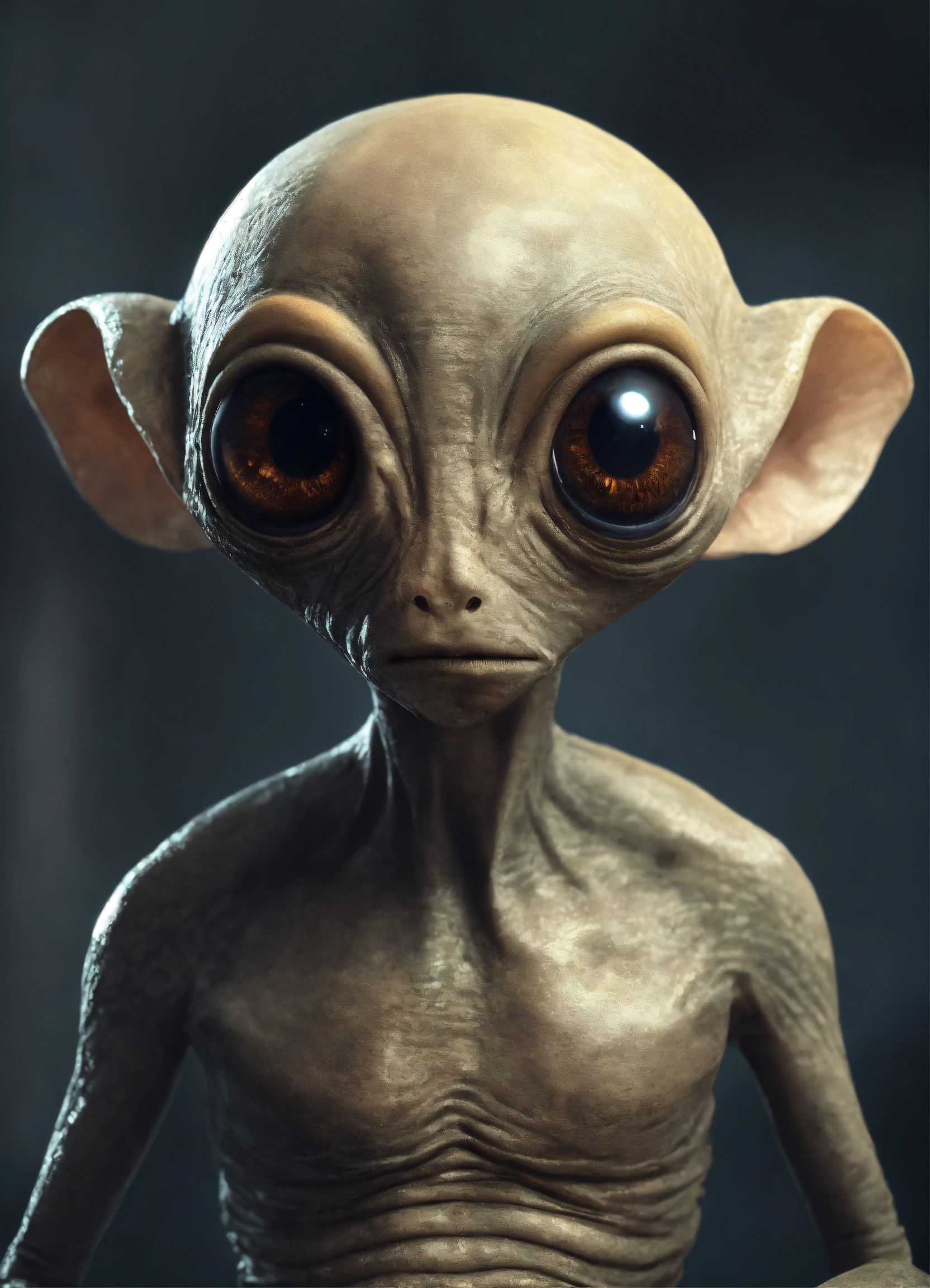 Gray alien creature with huge eyes, bald. instead of a nose there is a small gap, a mouth without lips. 3 fingers on each hand