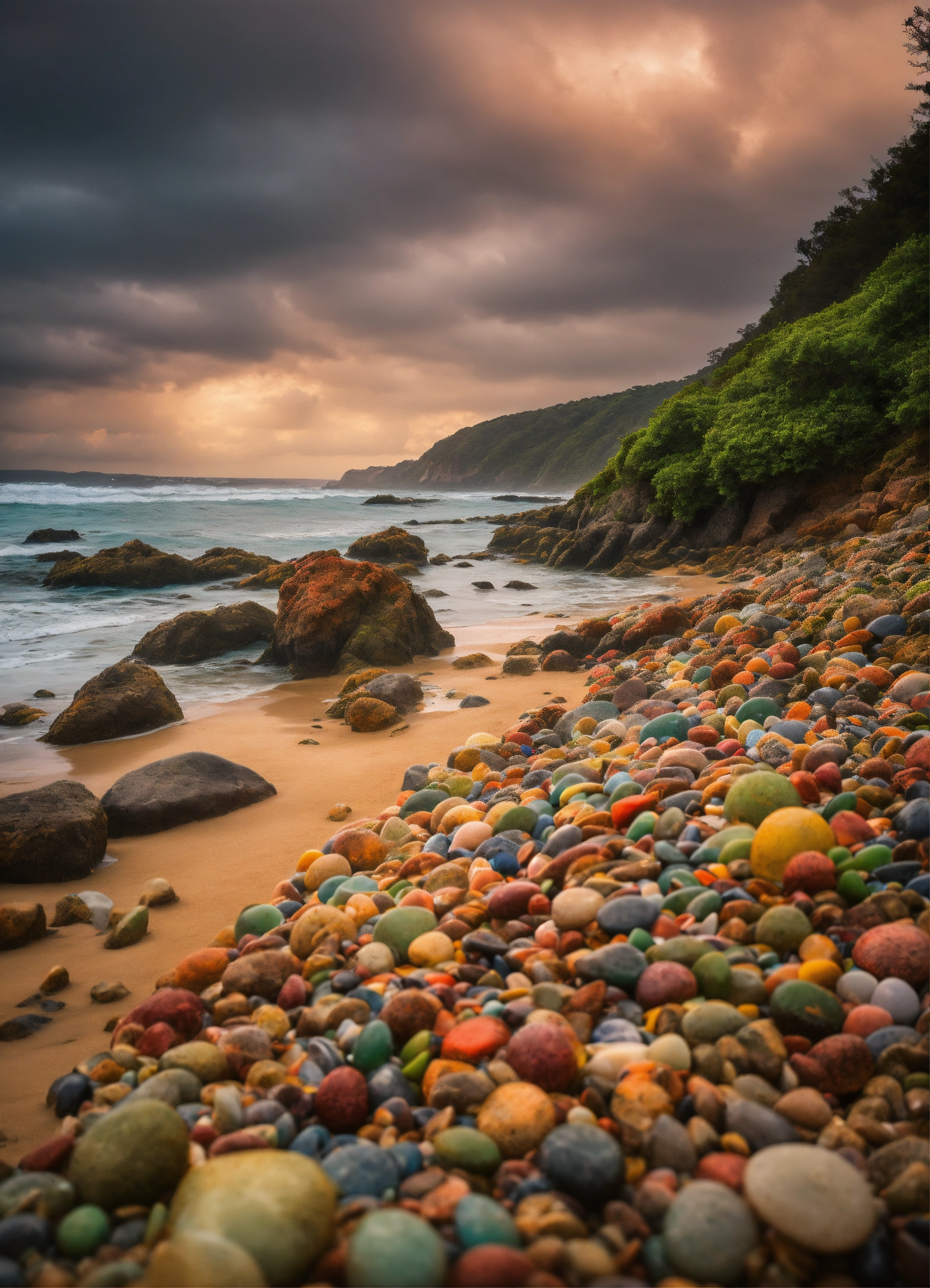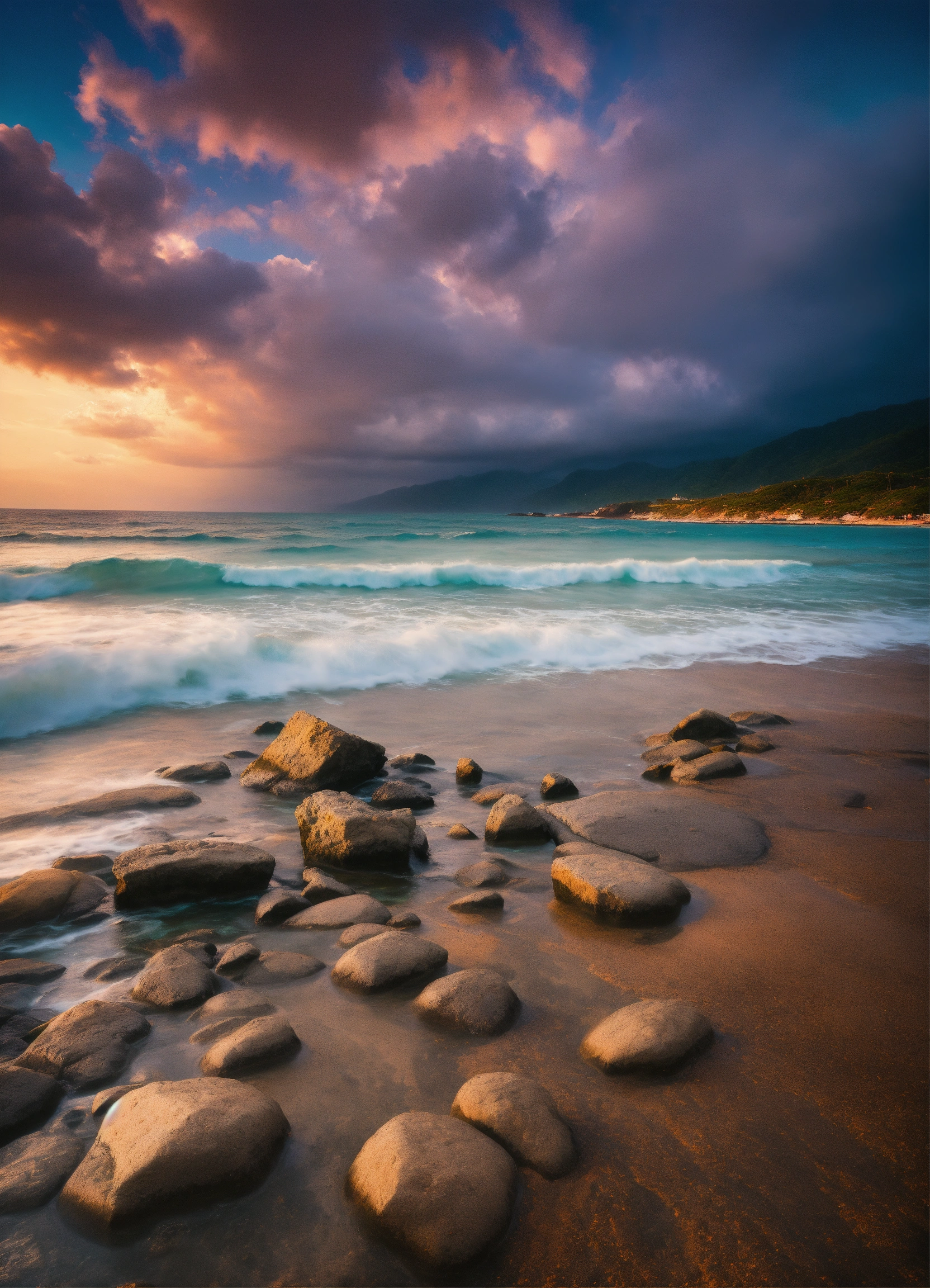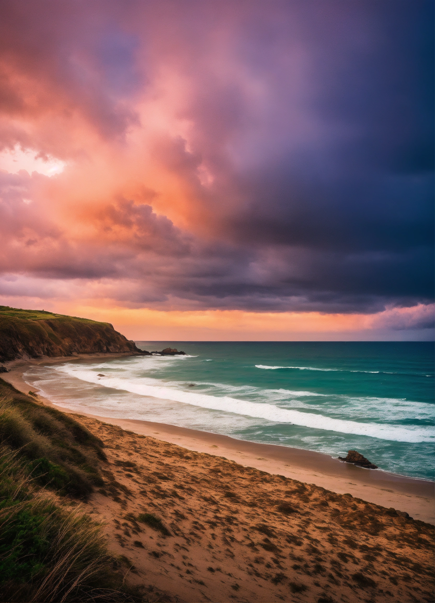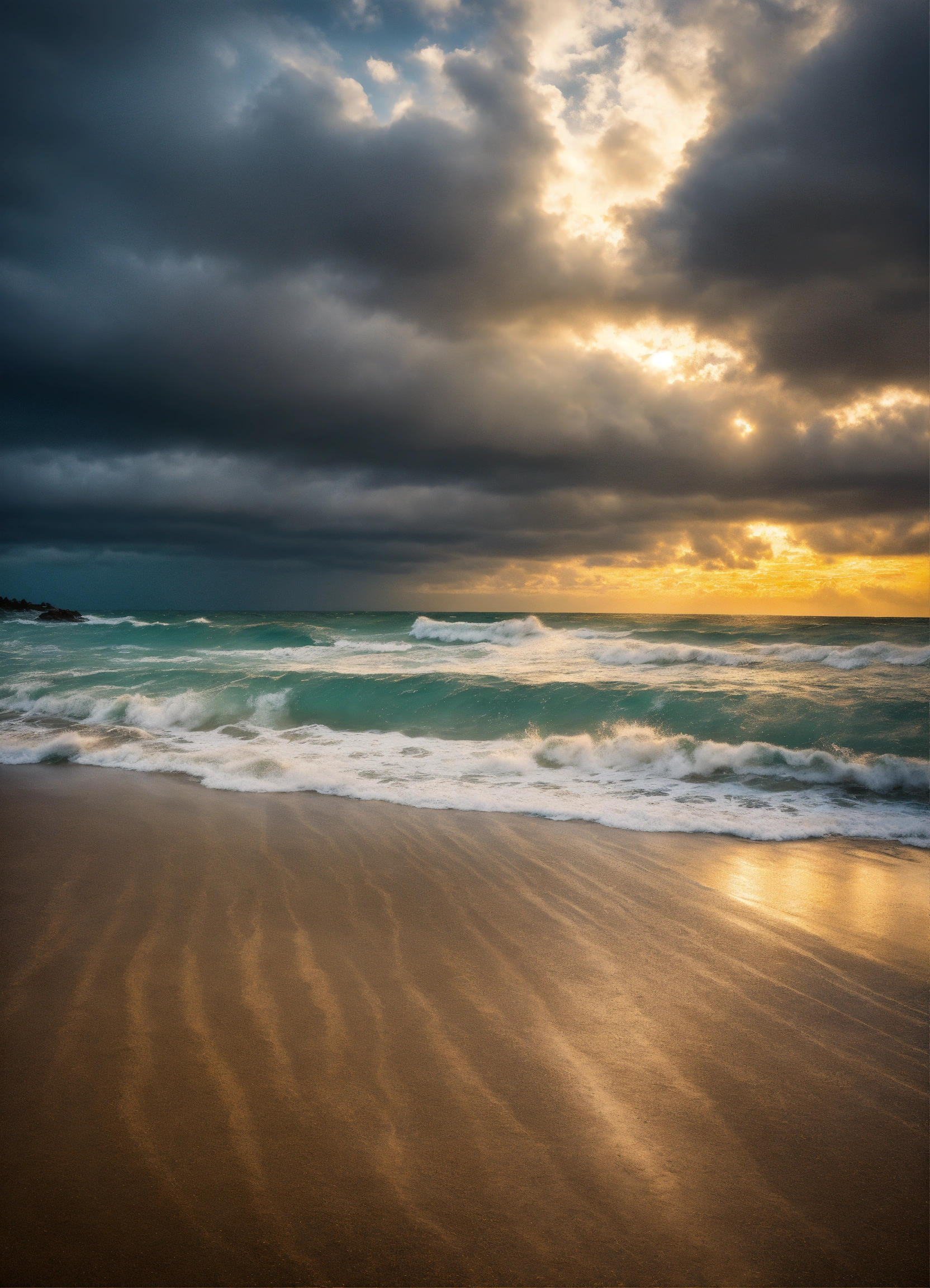Generate an image of a beach landscape. the weather should reflect a cloudy and gloomy day with imminent rain. the scene should be captured as if taken with a professional dslr camera, showcasing sharp details, a wide field of view, and vibrant colors. the artistic touch should be reminiscent of anna gialla's style, capturing the essence of the ocean in every shot