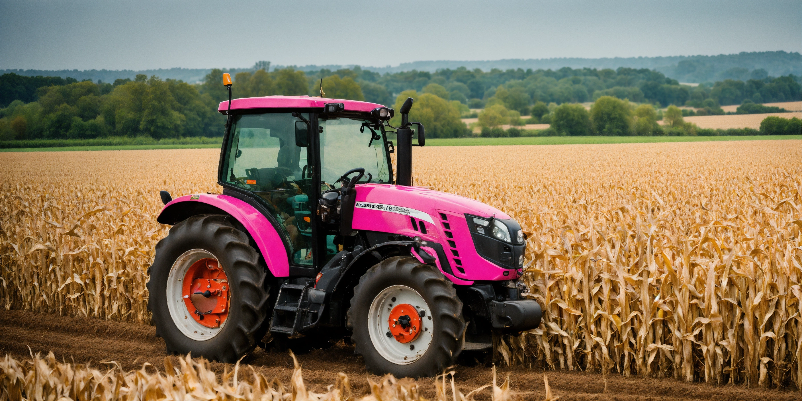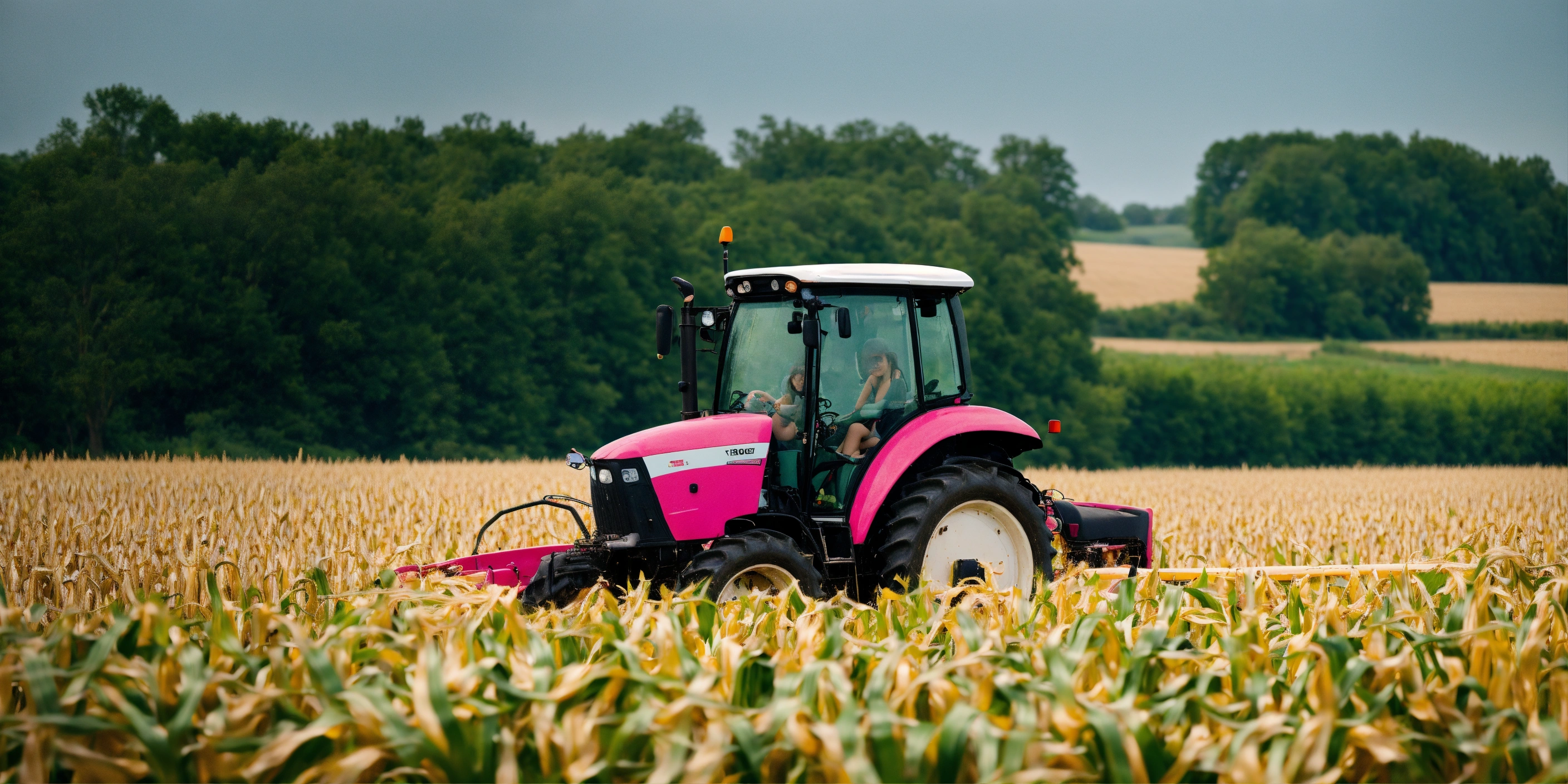 Young woman wearing pink swimming suit driving tractor chaotically in a field of maize
