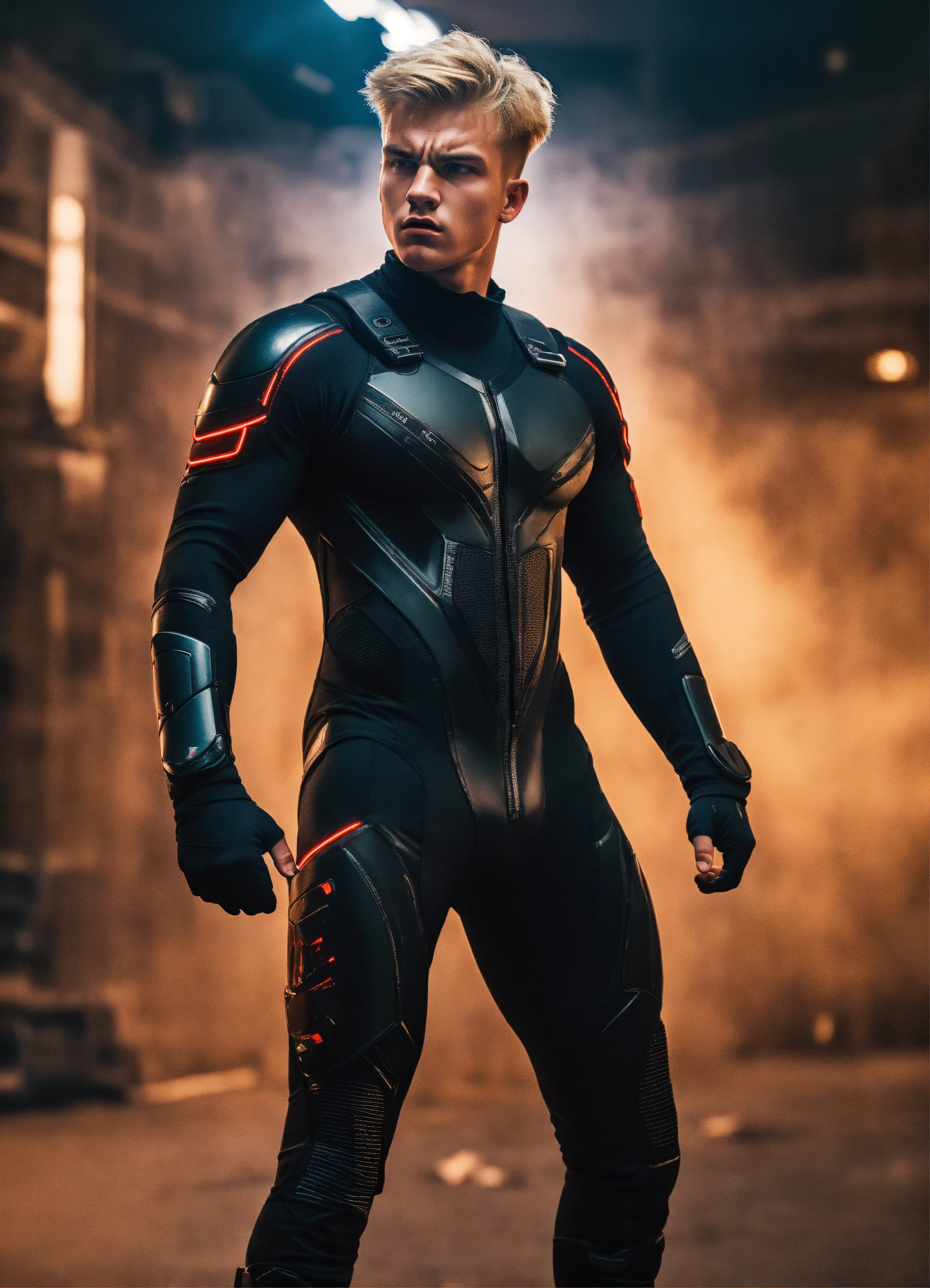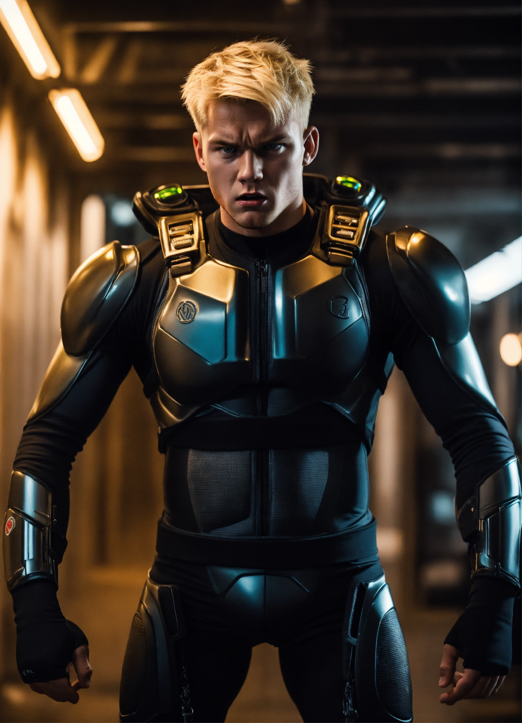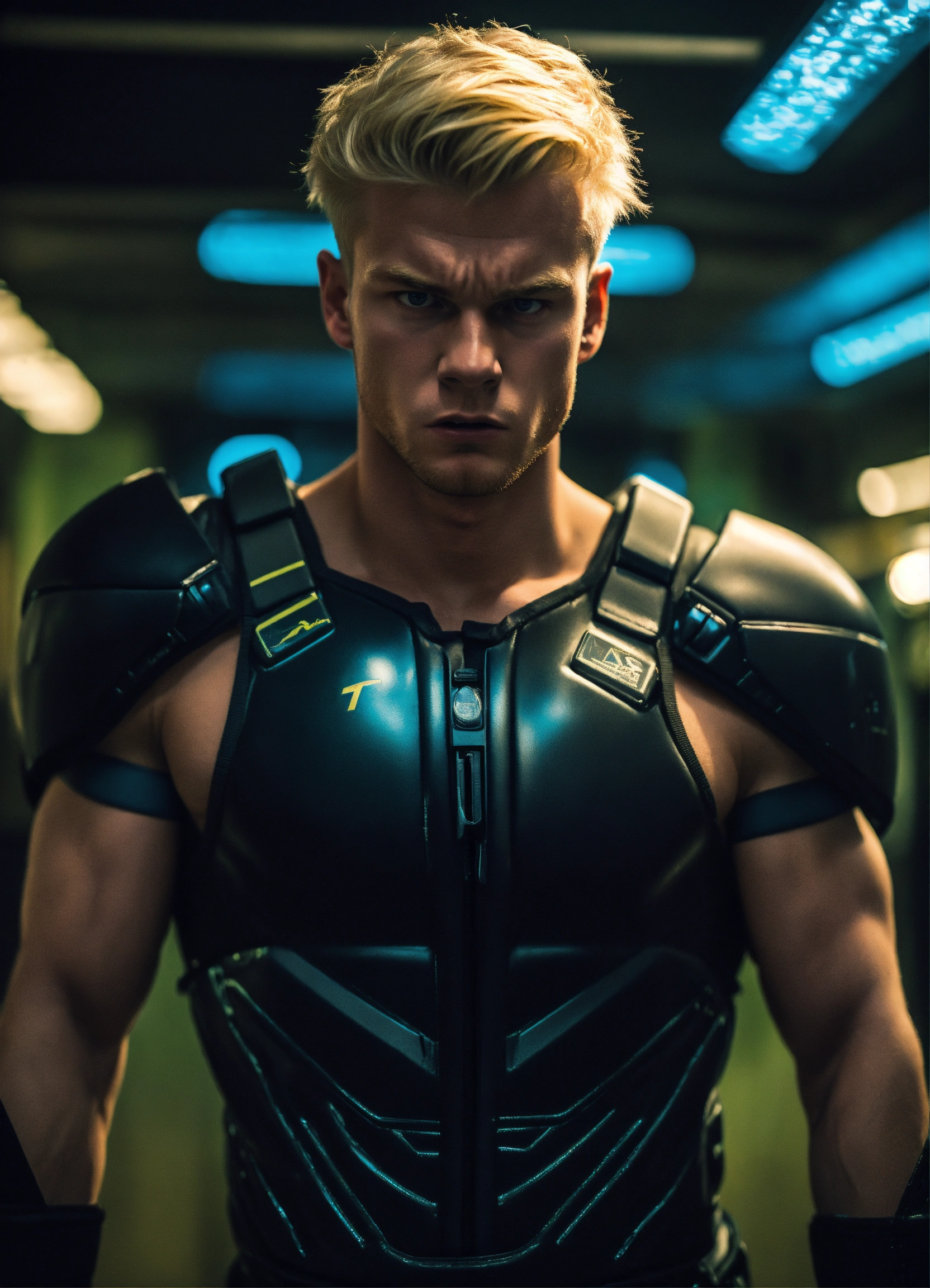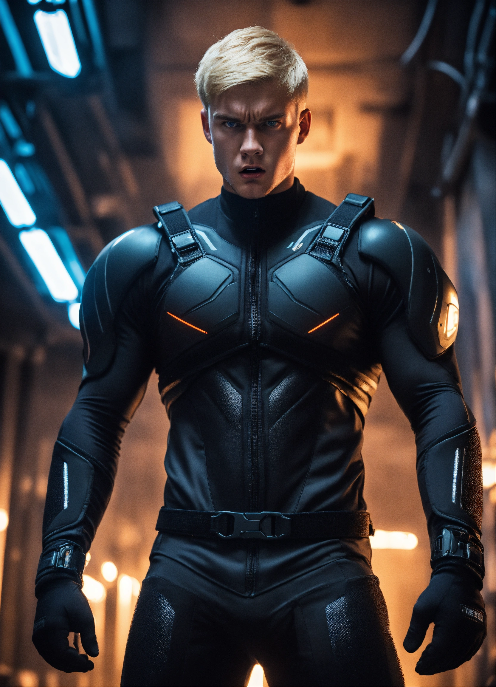 A photograph of a very big 20-year-old blonde nordic boy, with a very angry expression, wearing a black sci-fi training suit, very big muscular body, dramatic illumination, with a sci-fi background, hyperdetailed, hyperrealistic, 8 k