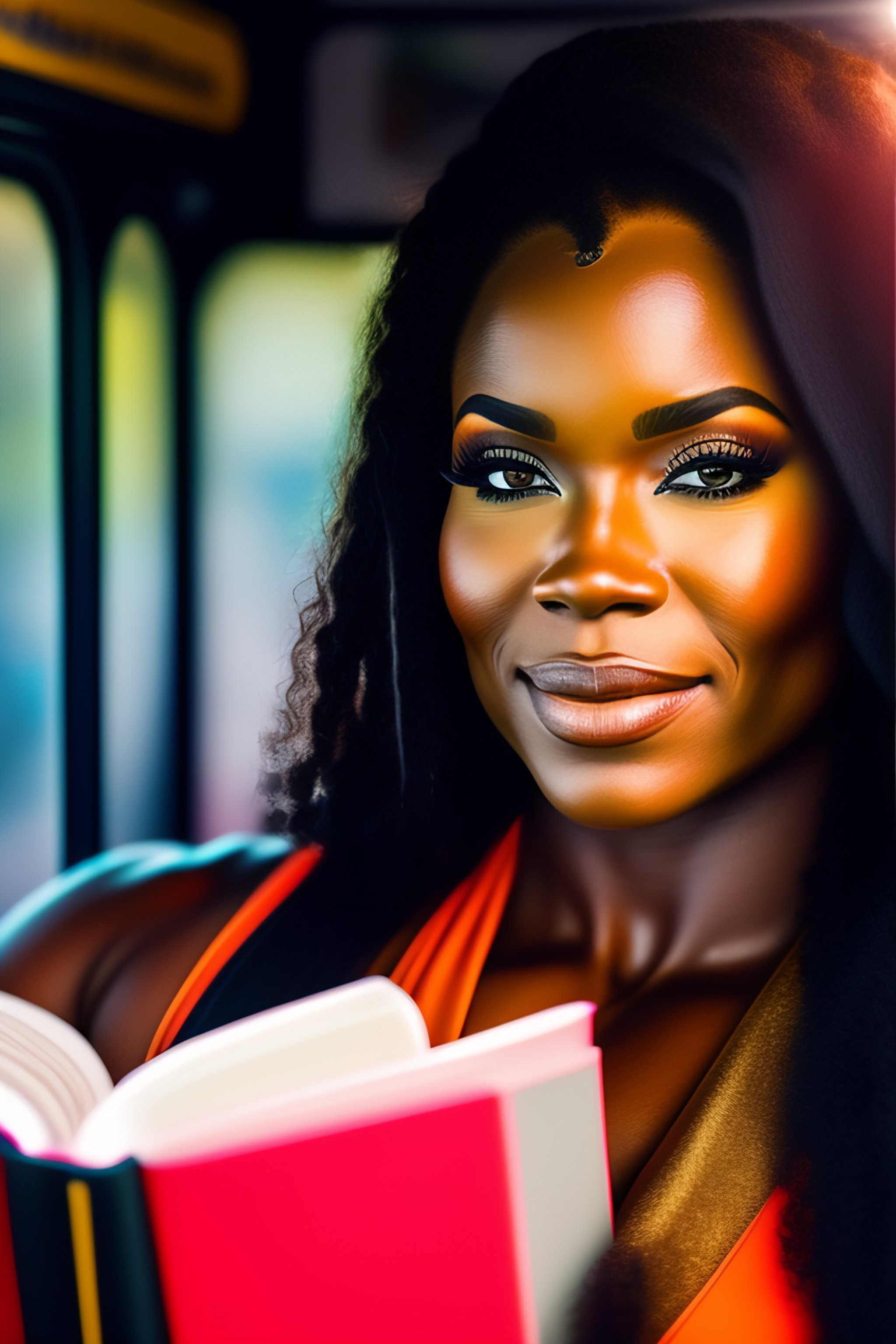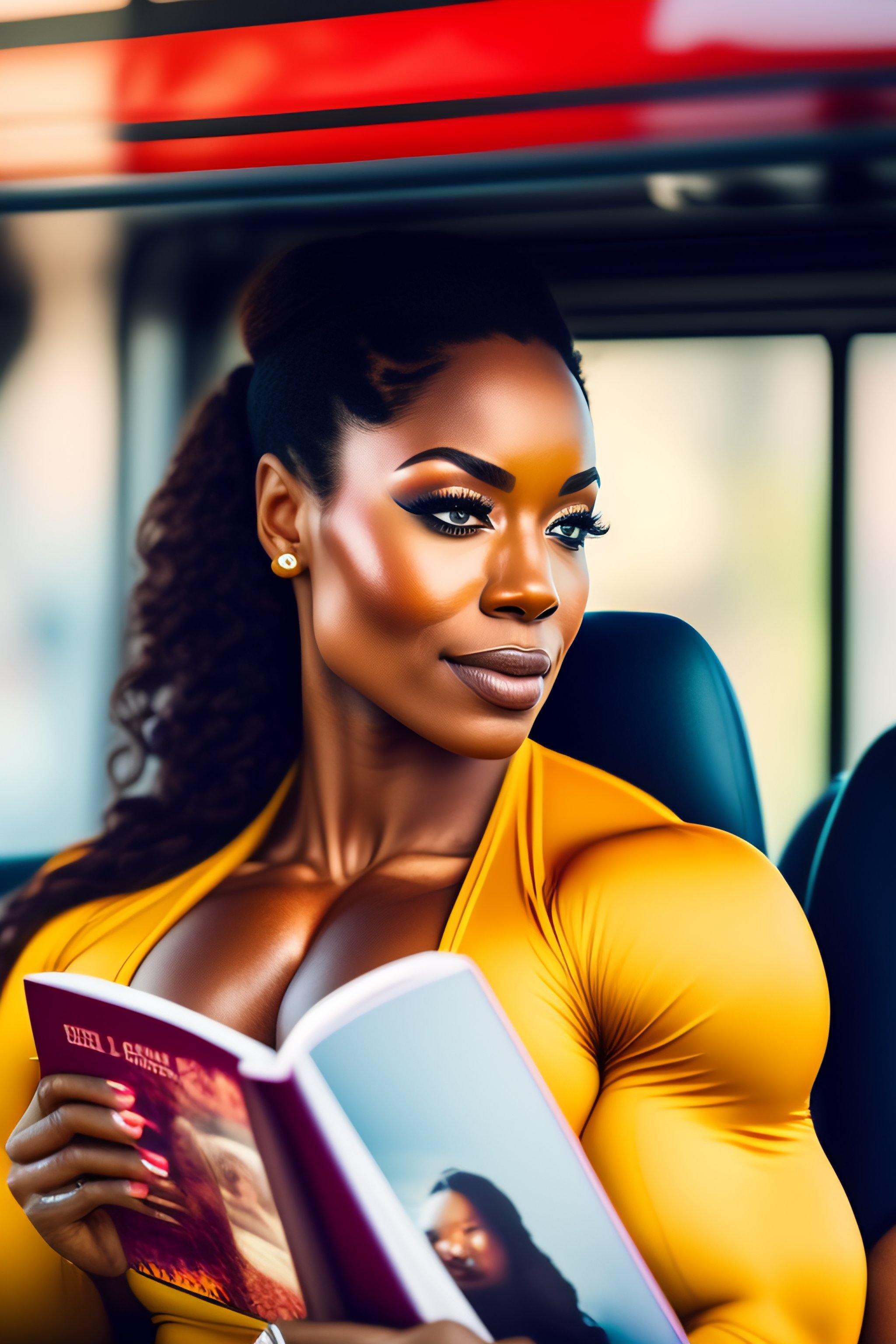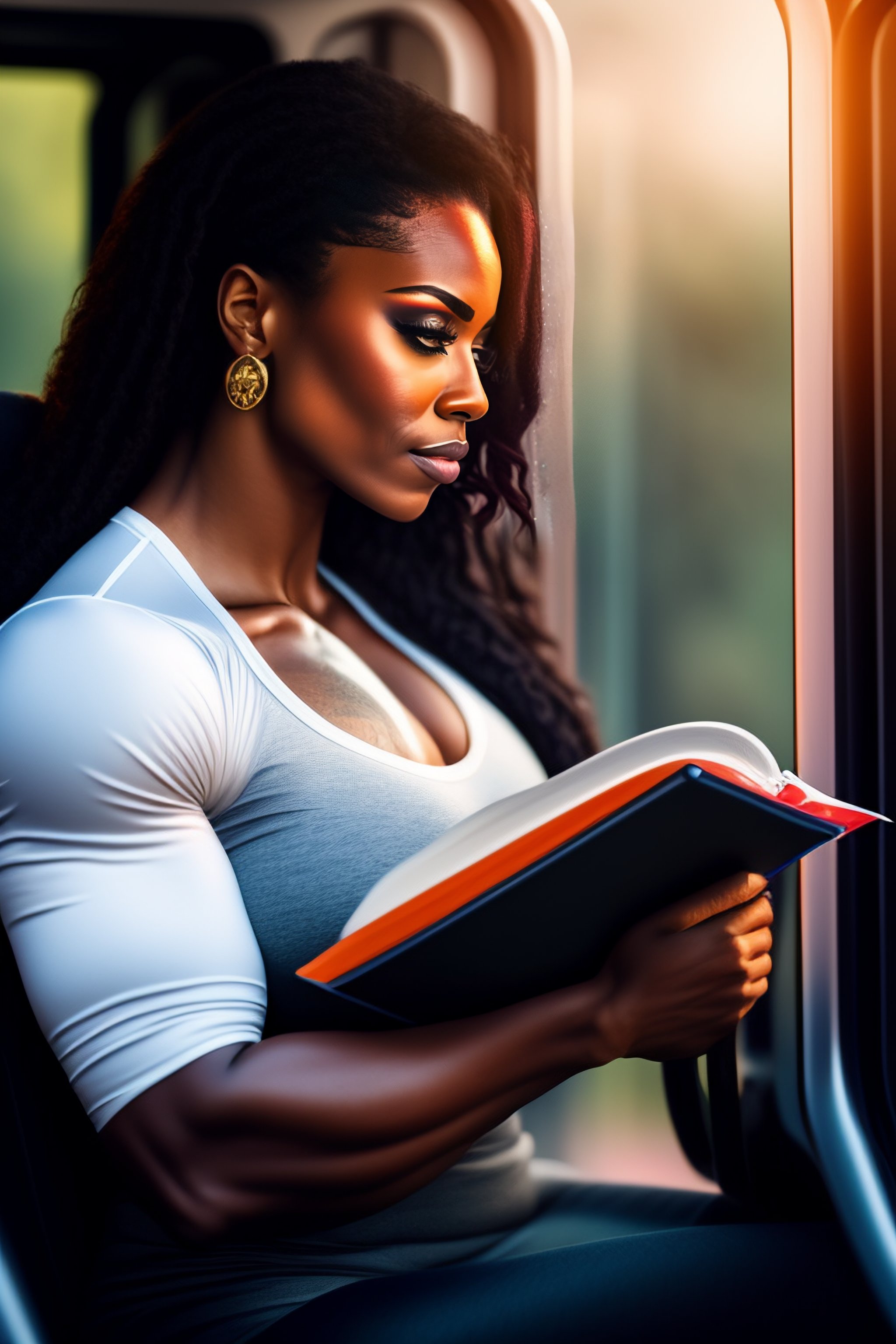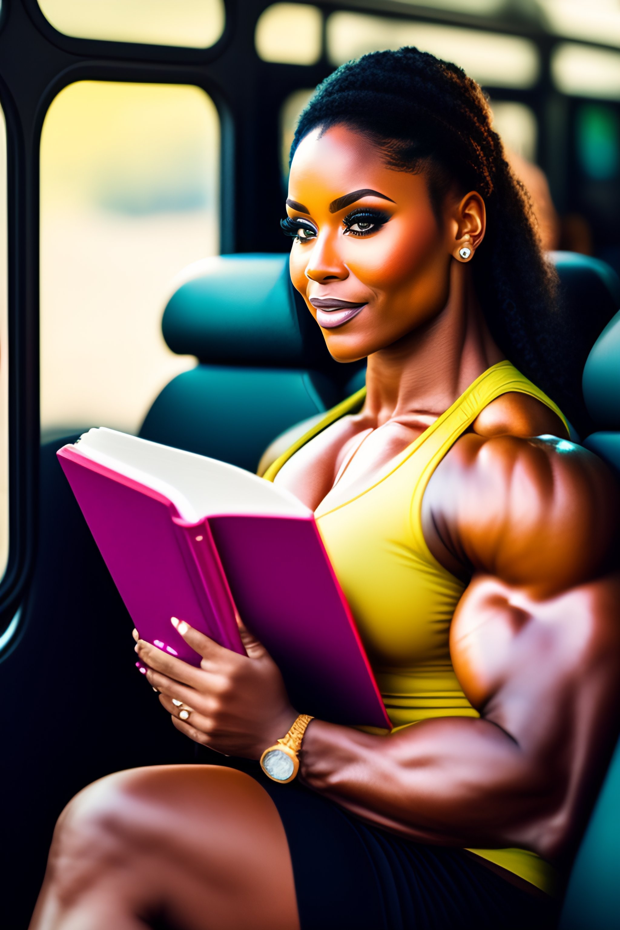 Cute woman bodybuilder ((massive thick strong muscles)) reading book in bus