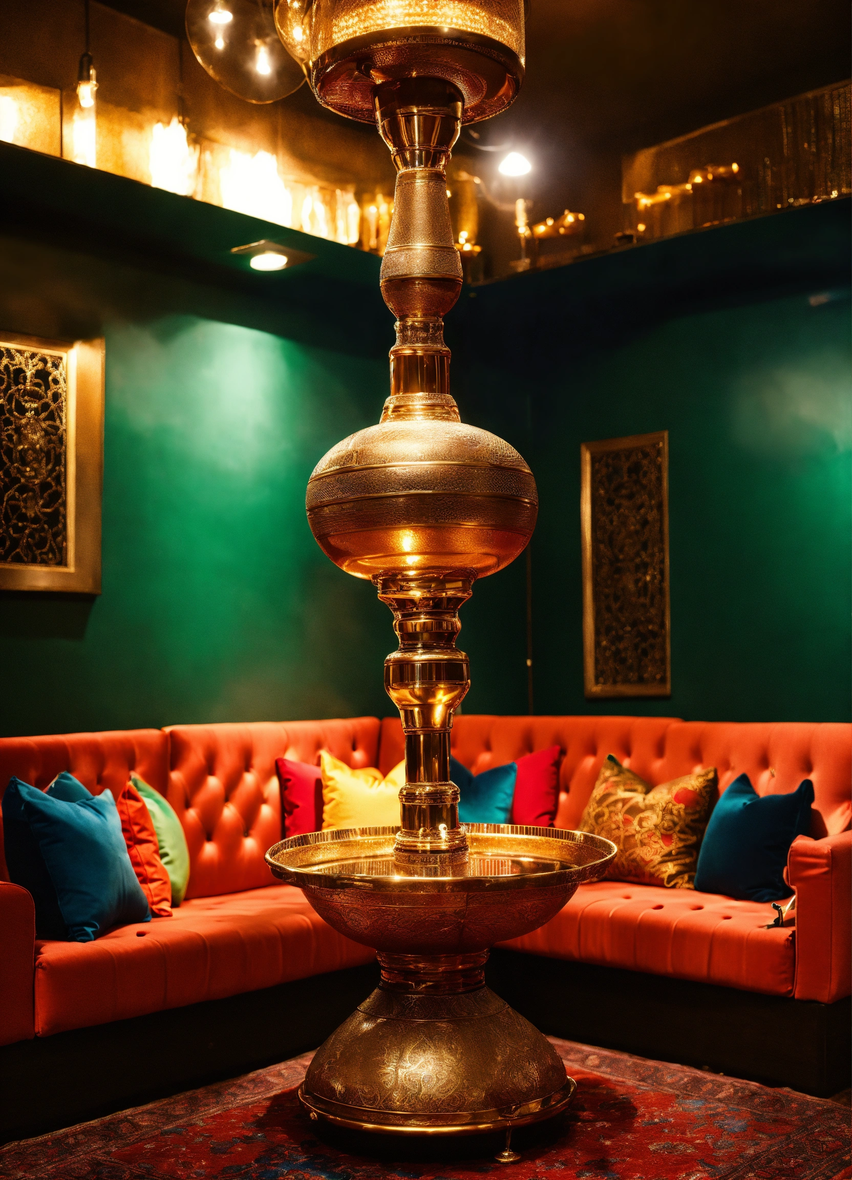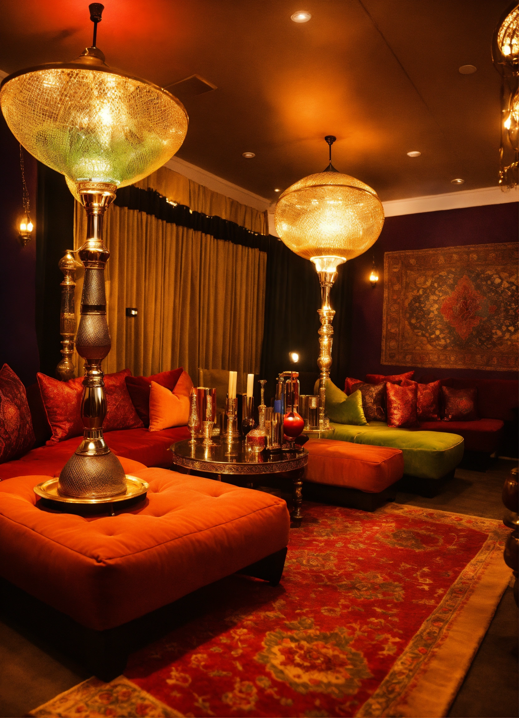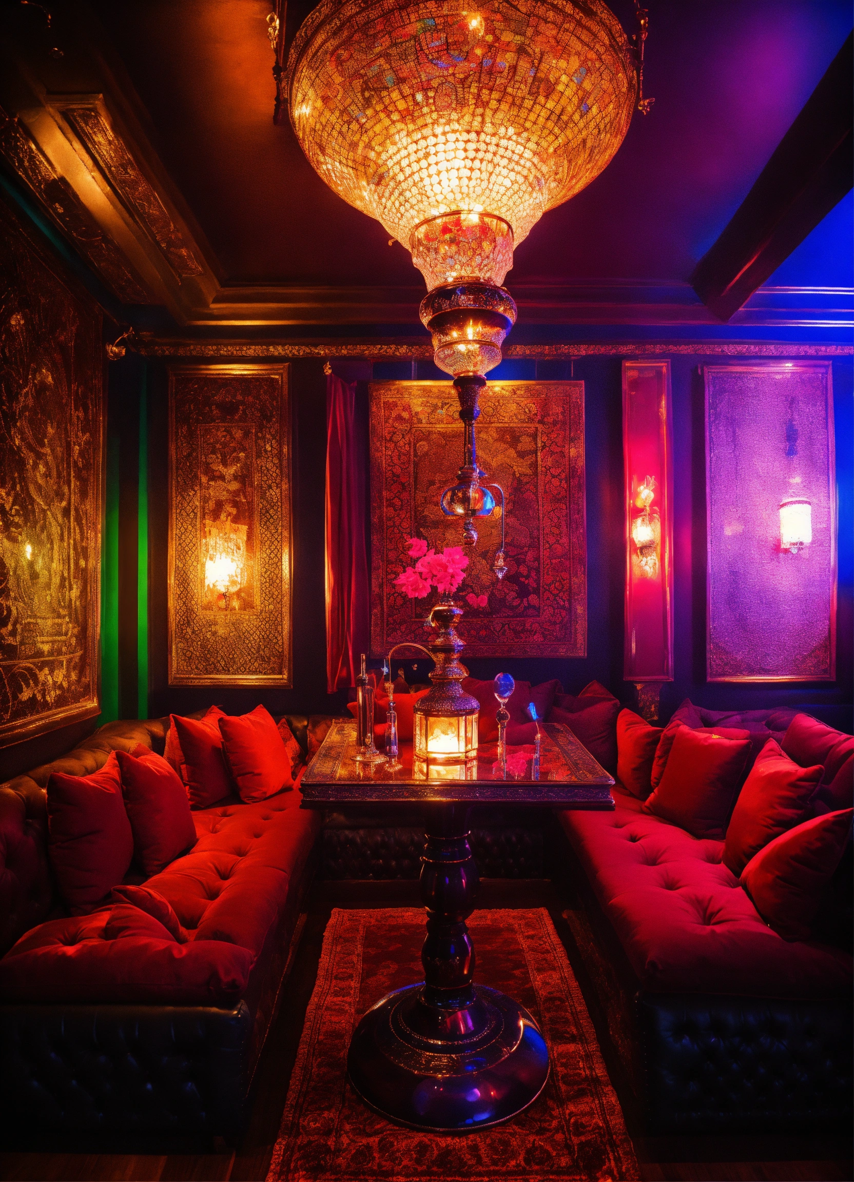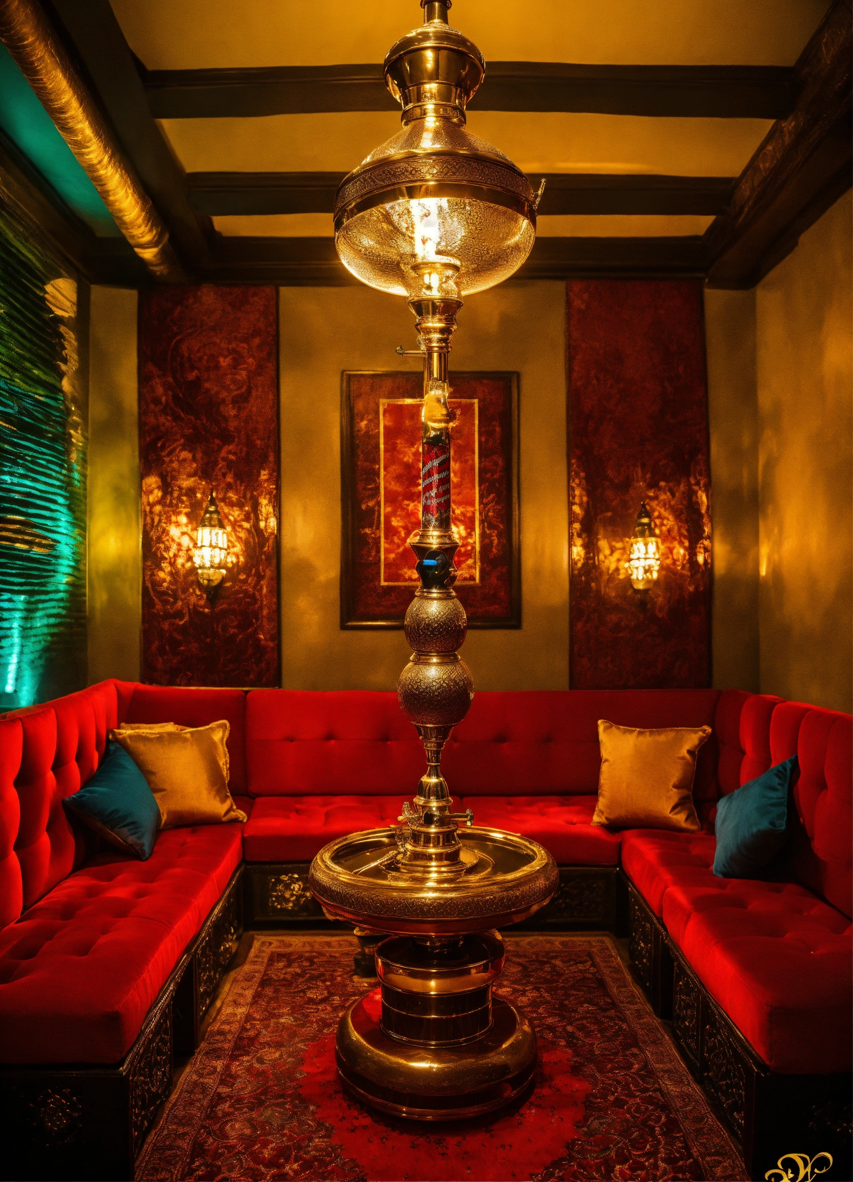 Hookah lounge, expensive hookah pipes, hookah table and cushions, affluent, rich, decadent, debauchery