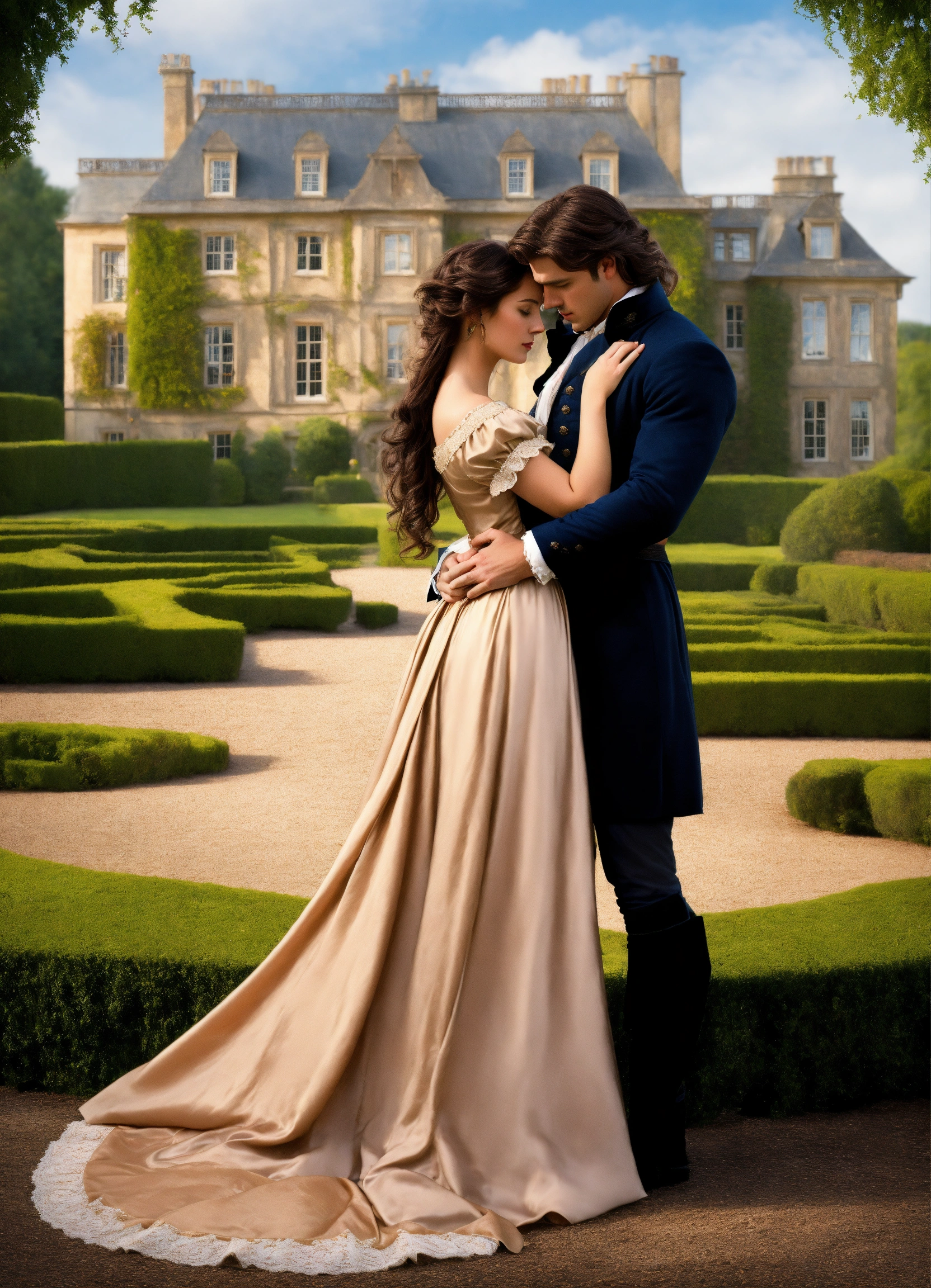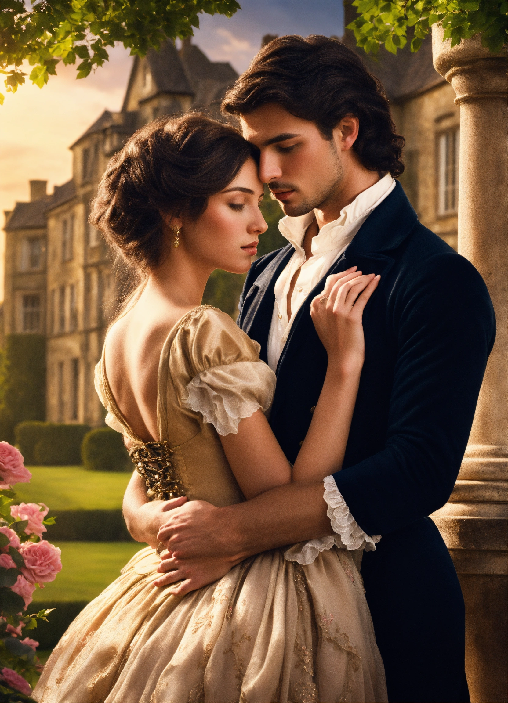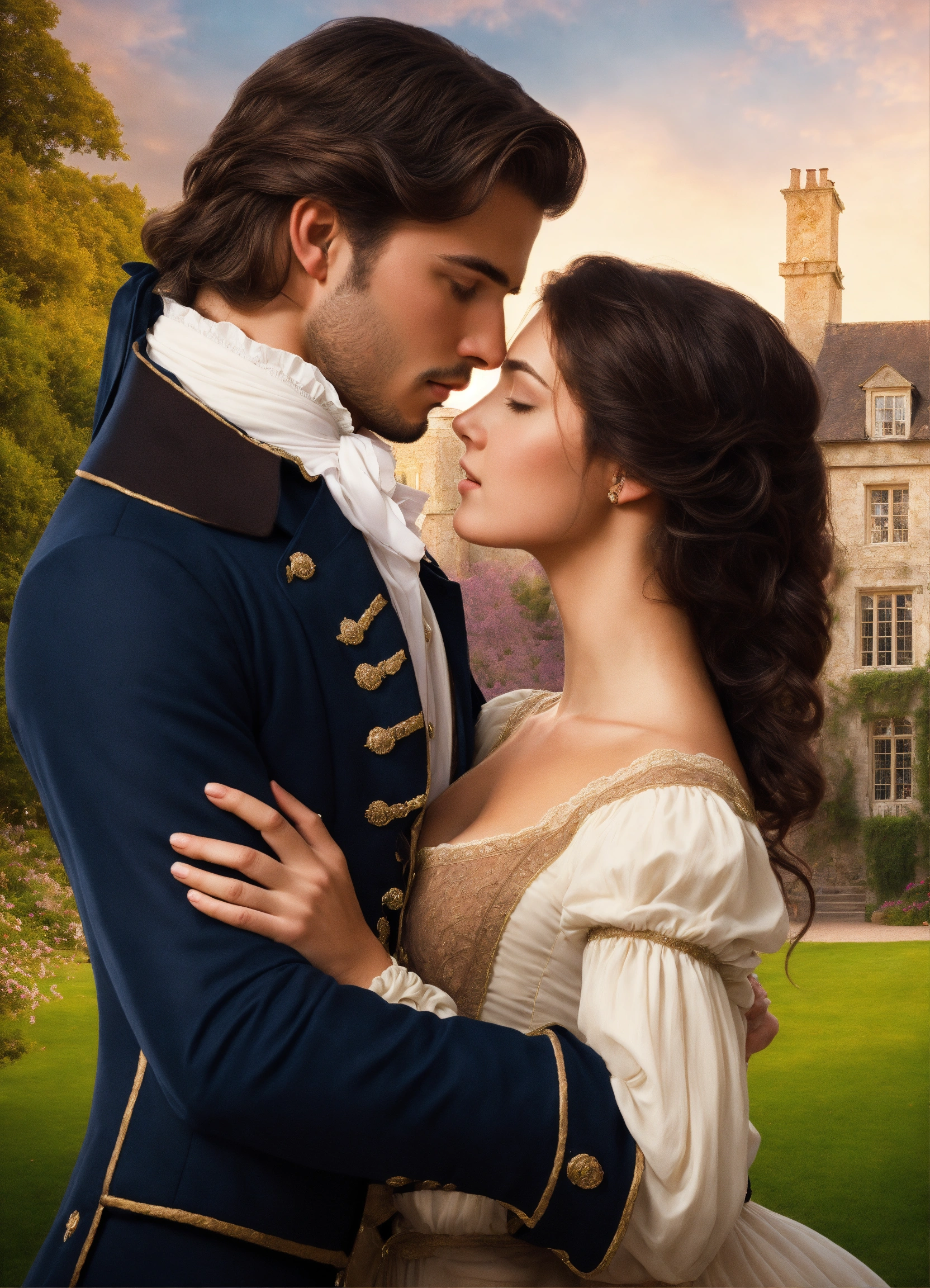 Regency romance cover, young attractive regency woman with long brown hair and a handsome tan man with short black hair, romantic embrace, romantic manor in the background