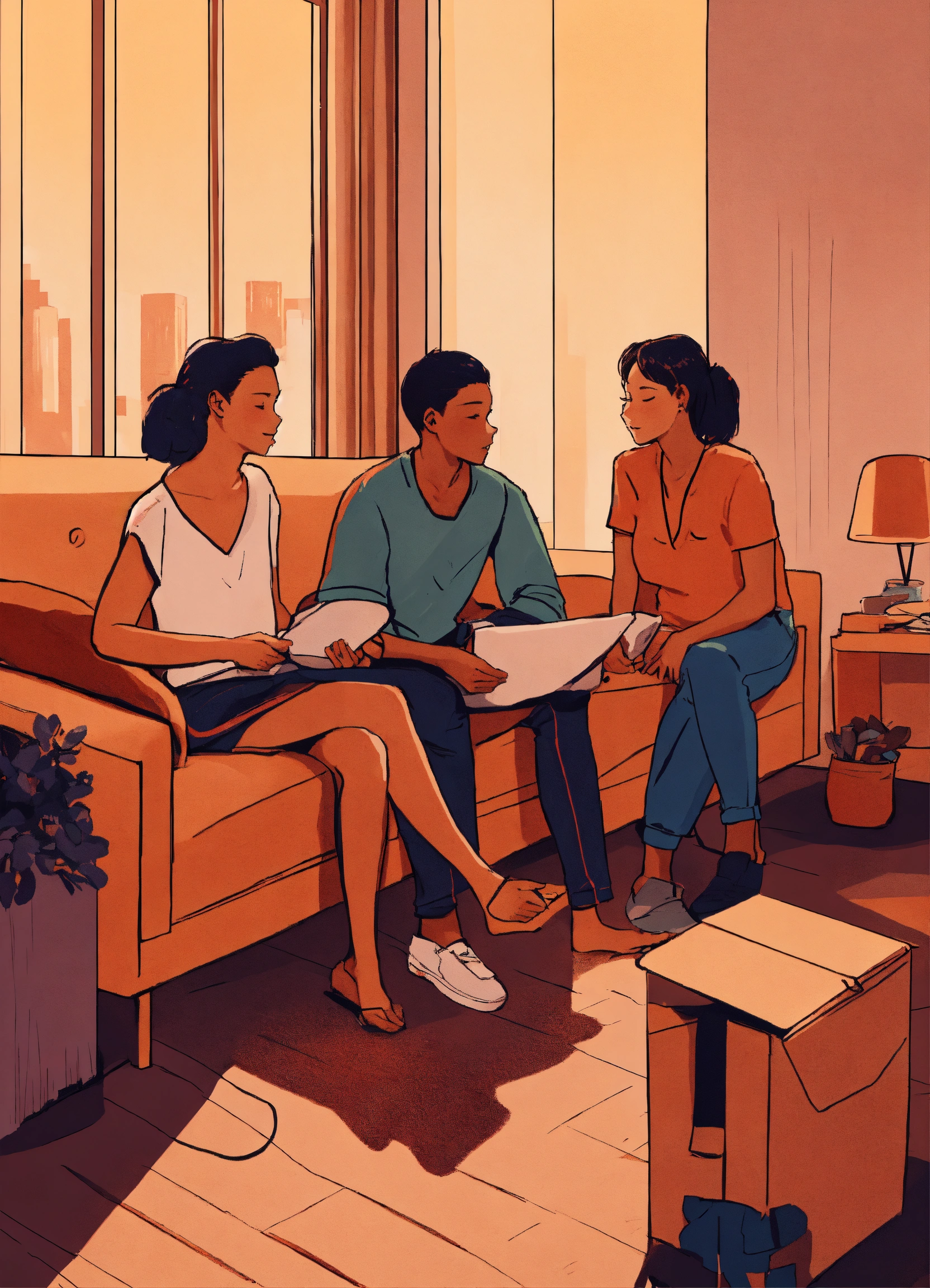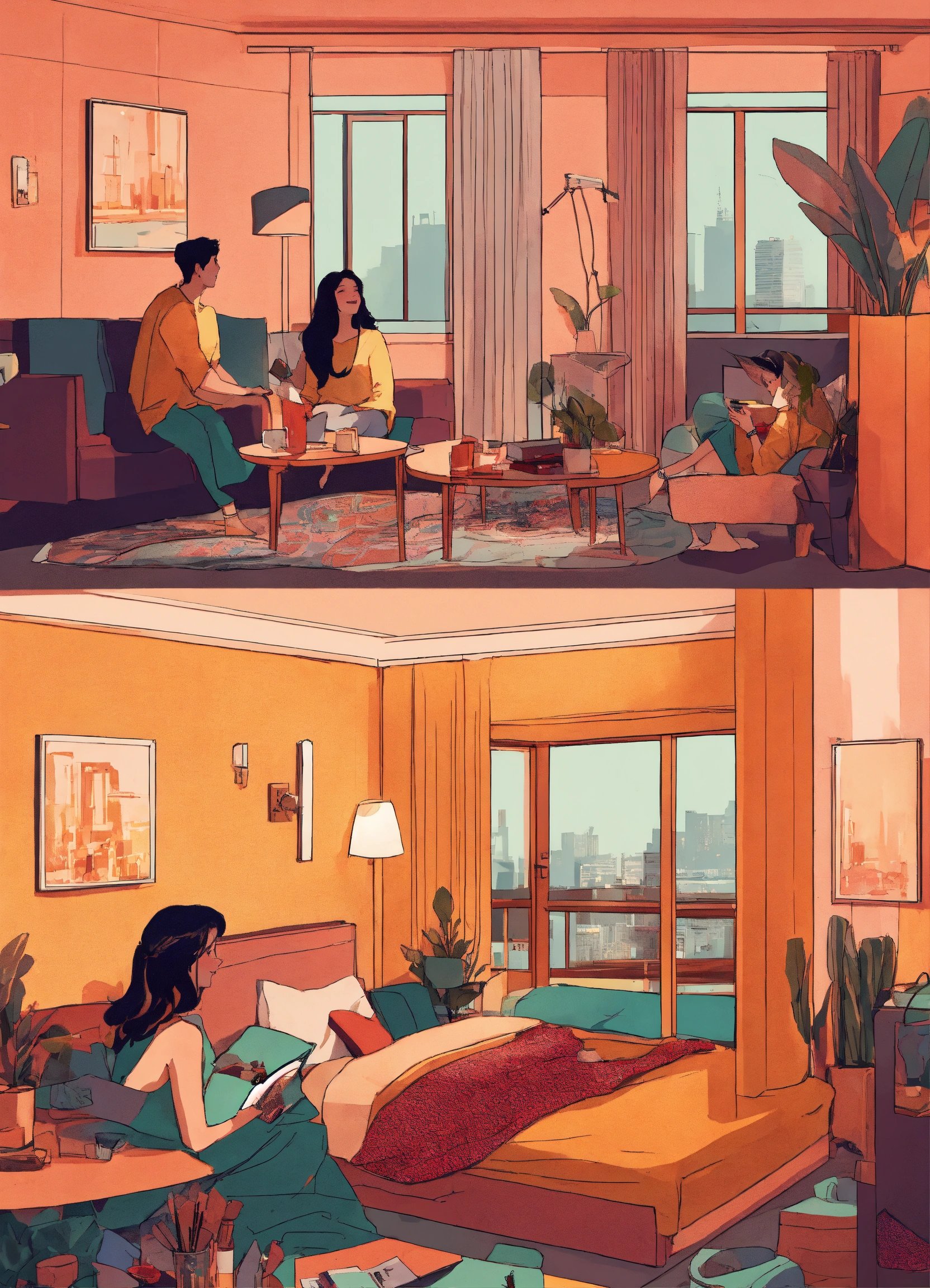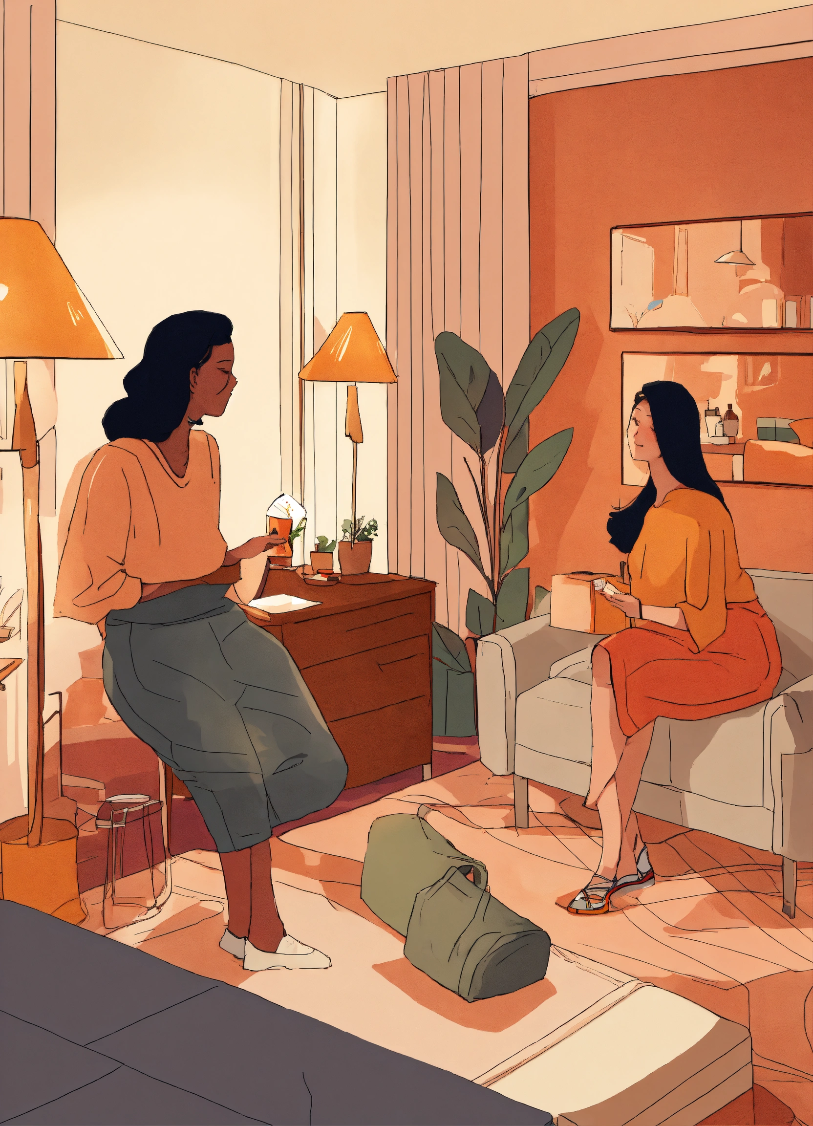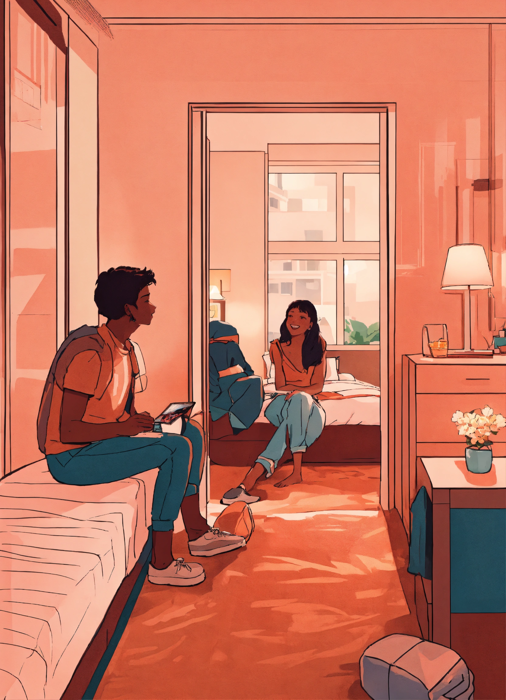 Illustration show friends alone in their hotel room, unpacking and talking about their upcoming experience.
