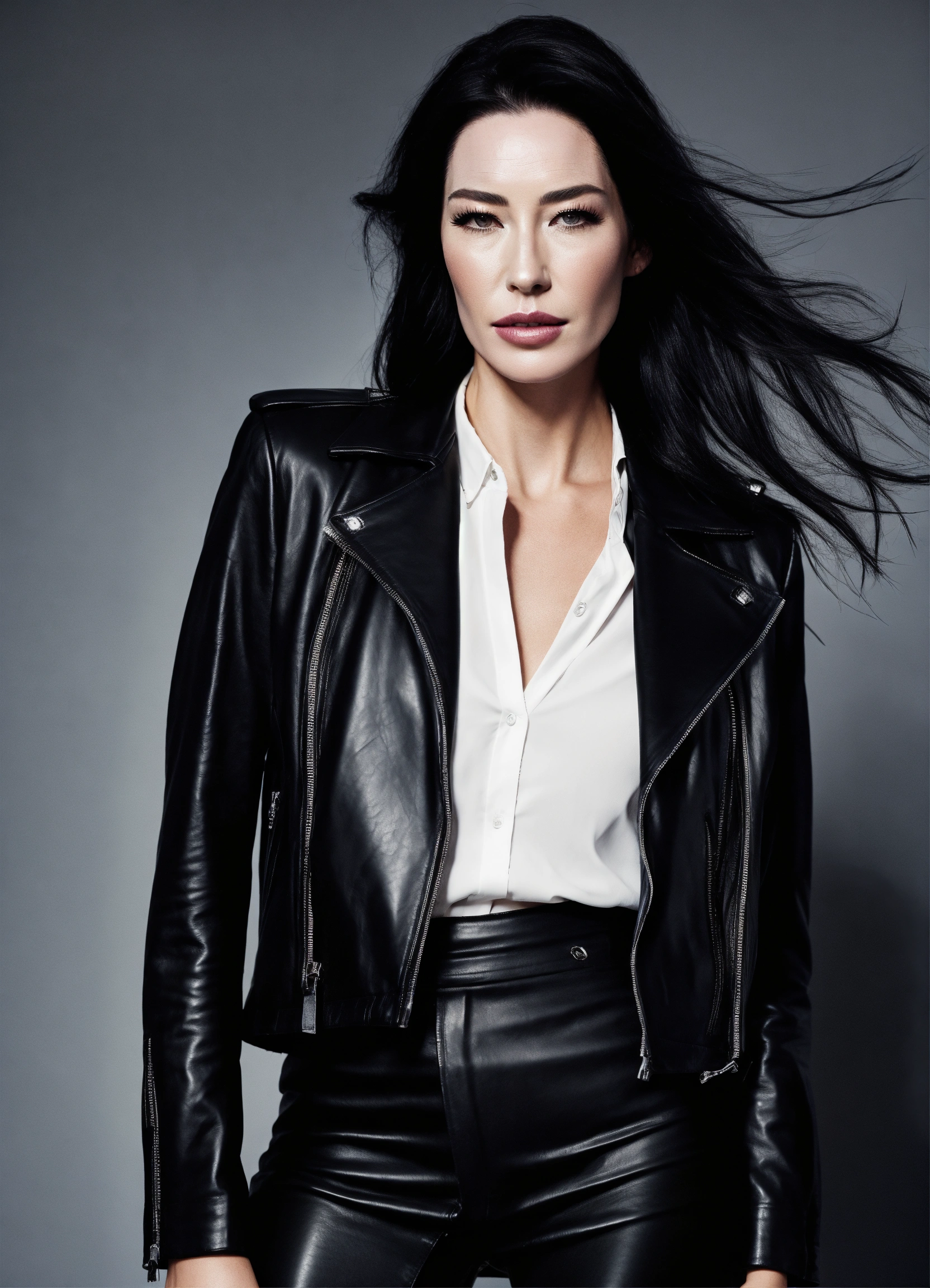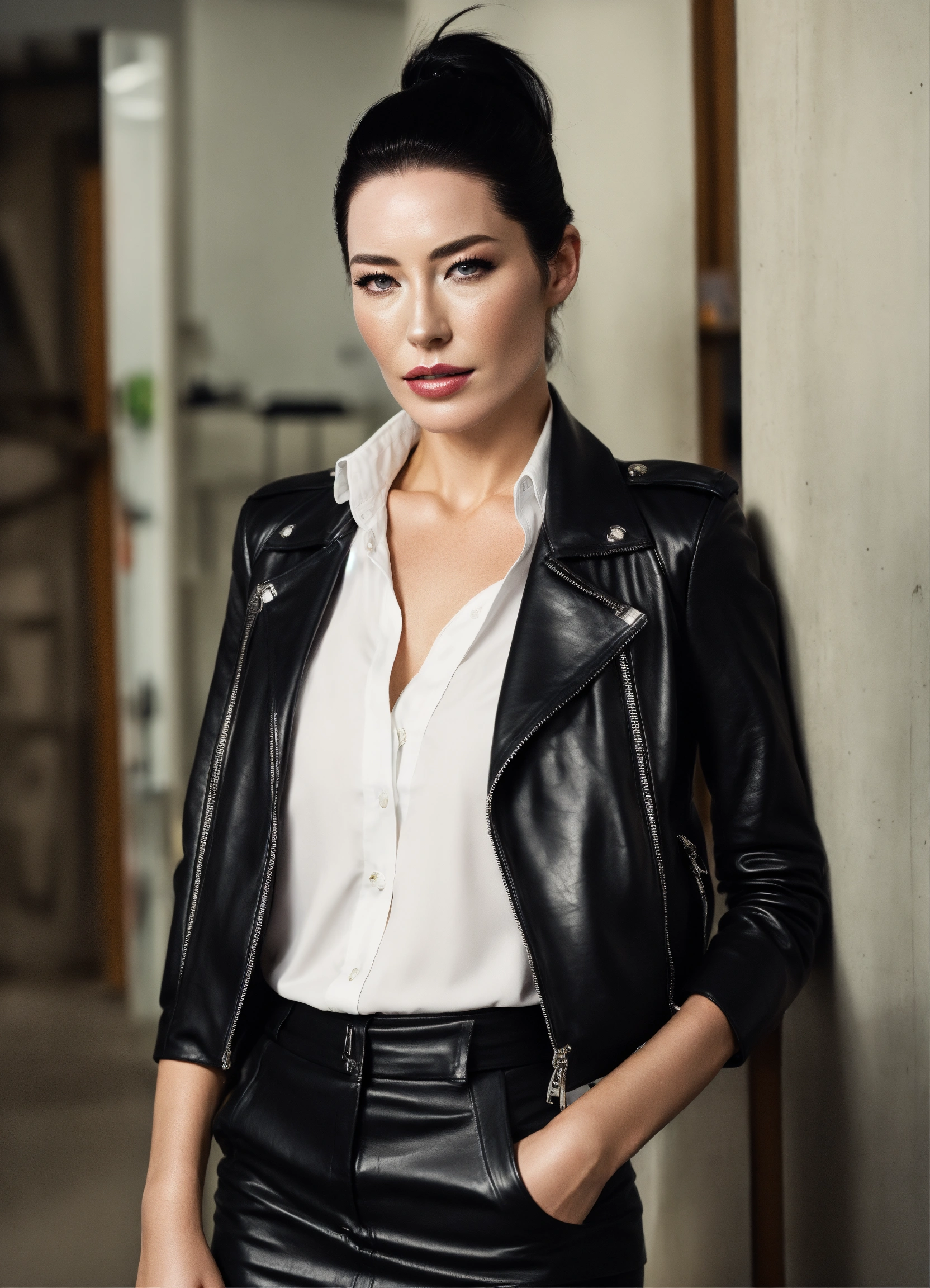 British model, distinctive face, full lips, jaime murray, wearing business suit, black leather biker jacket and black leather skirt, white shirt and black necktie, smoky eyes makeup, office room, straight black high ponytail
