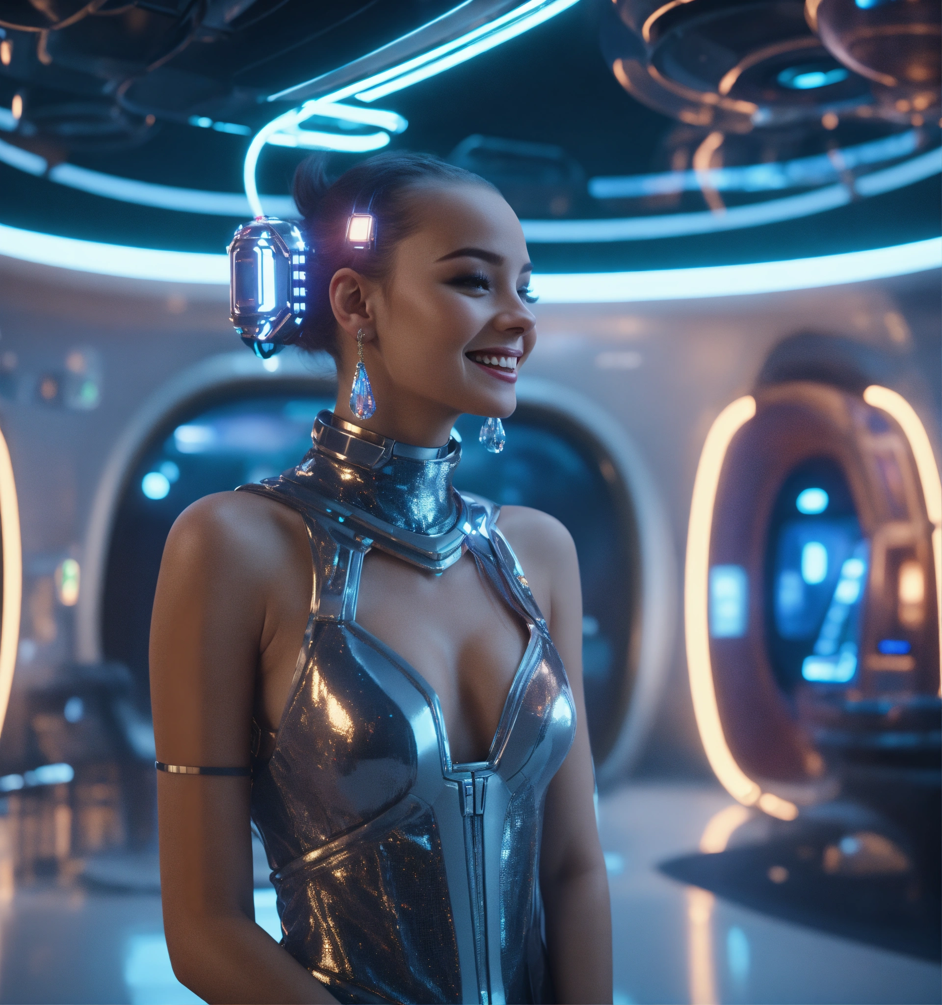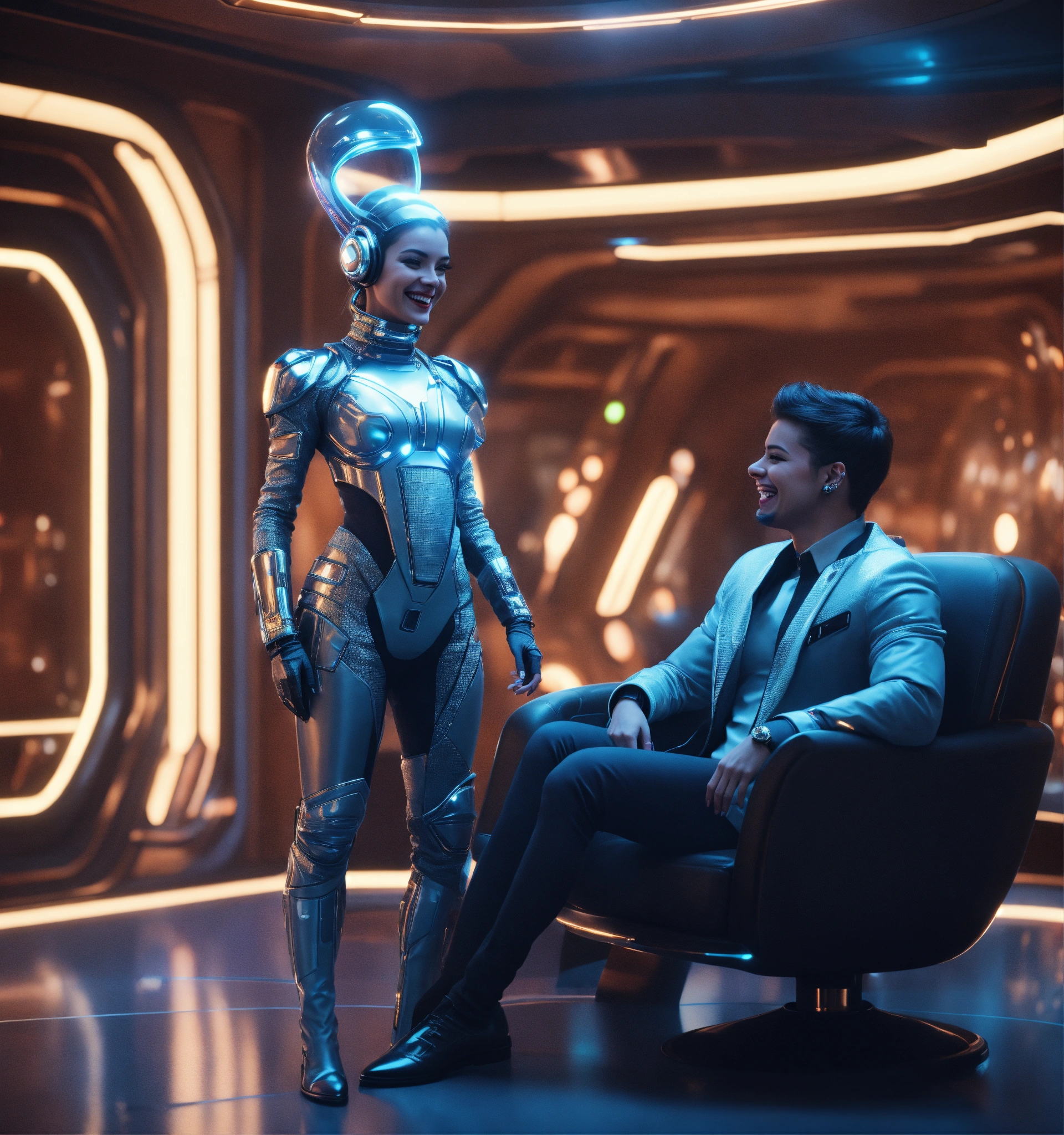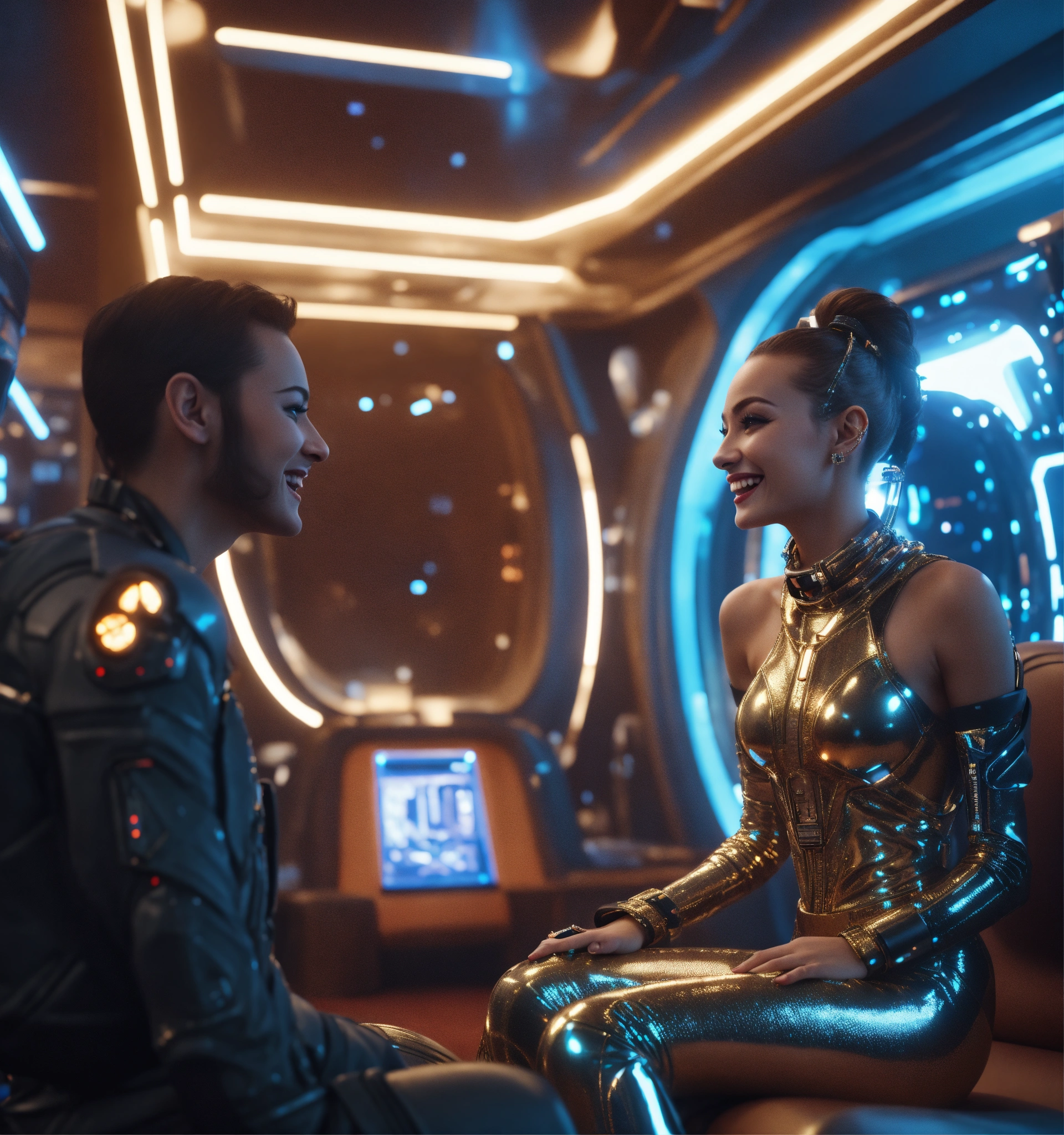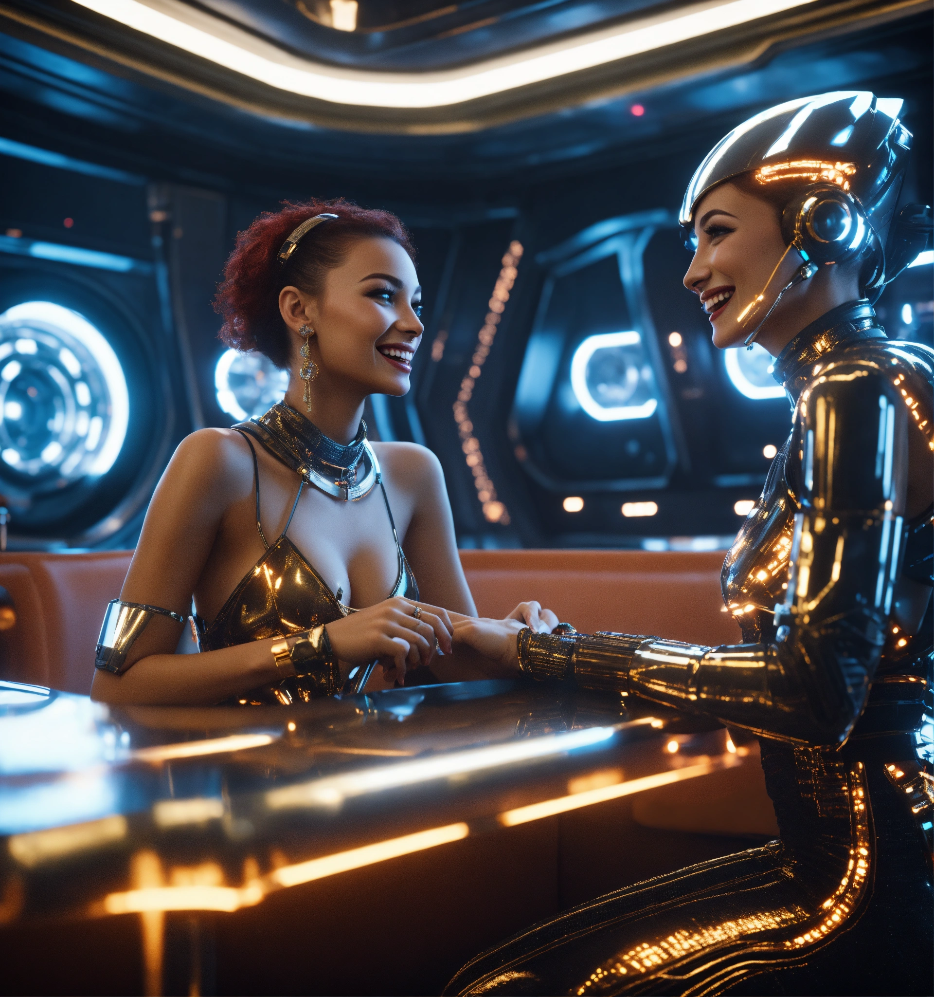 Zoom out from an alluring young alien space babe wearing a fancy space clothes and expensive jewelry in a futuristic space hotel lounge laughing with a man, realistic, futuristic, sci-fi, 8k, unreal engine