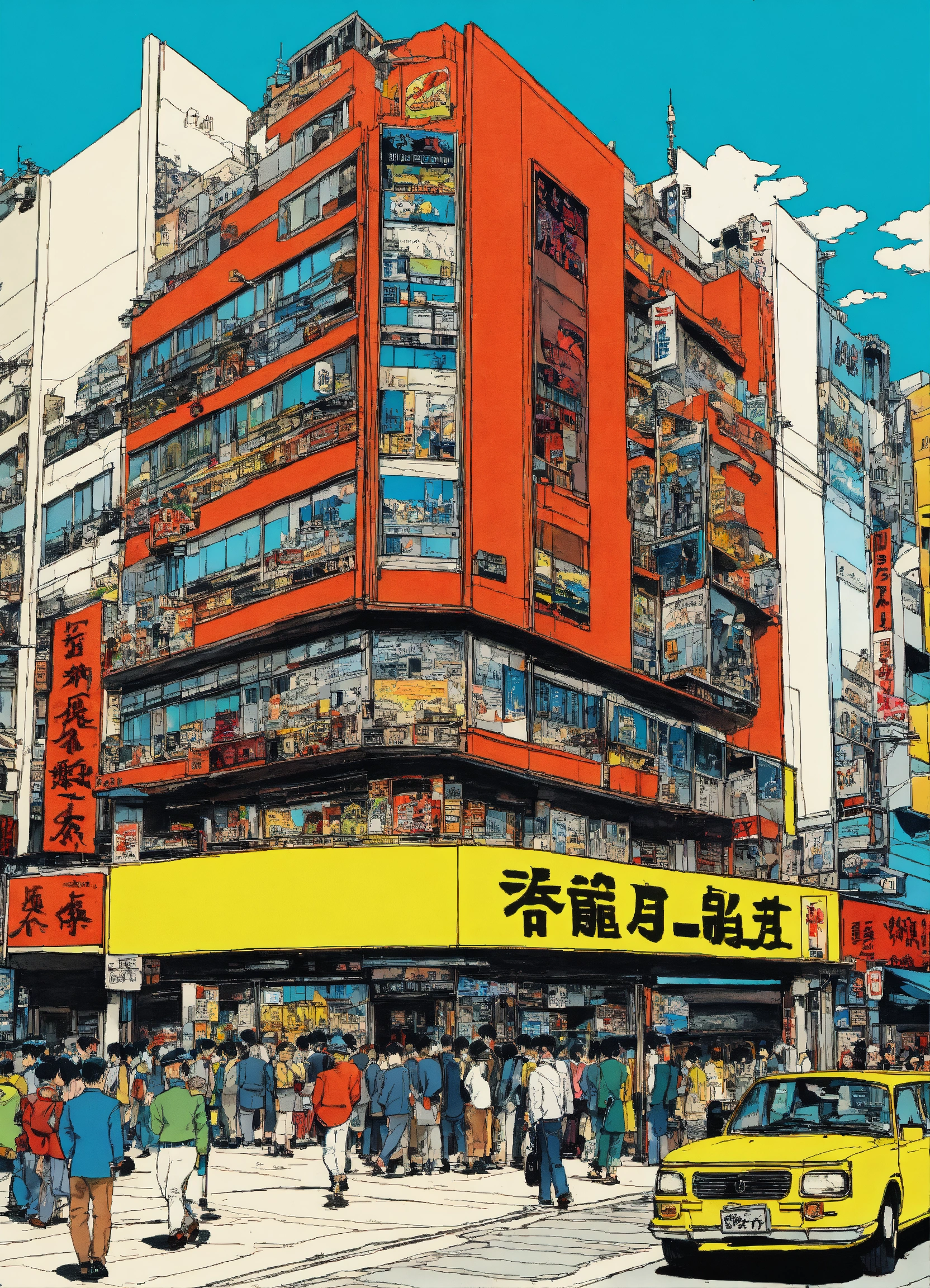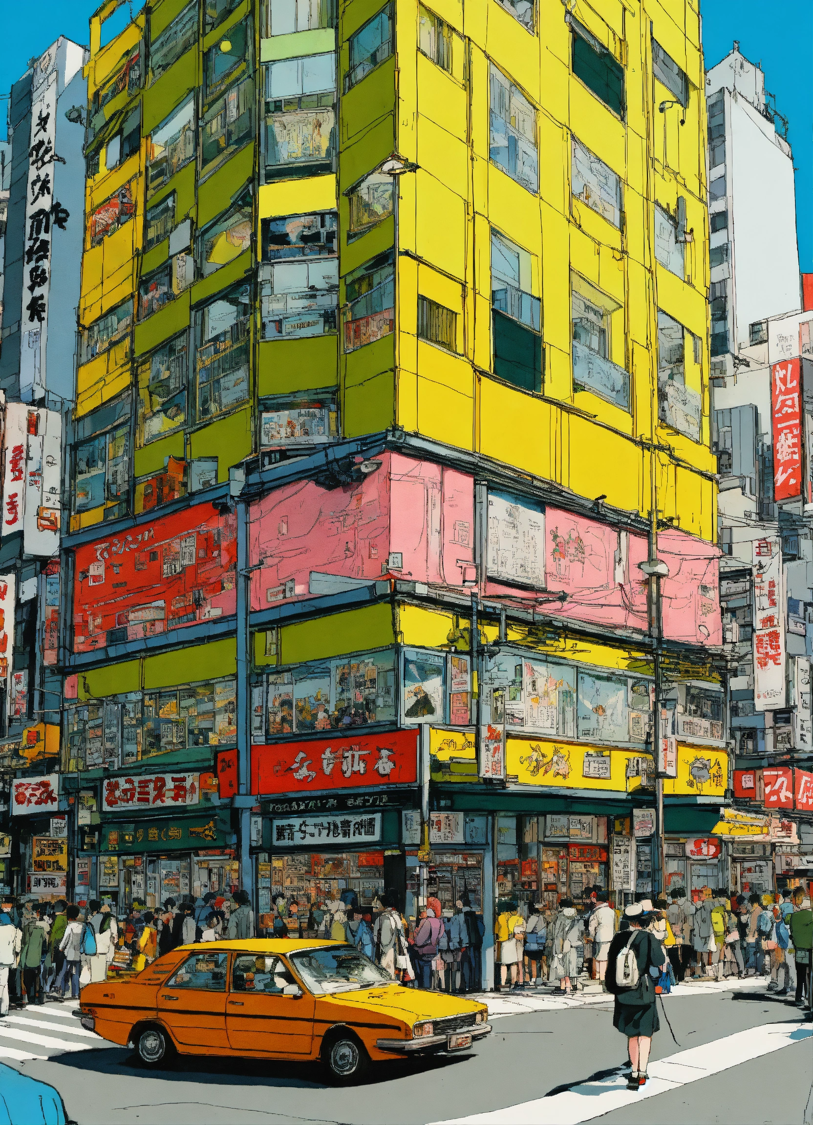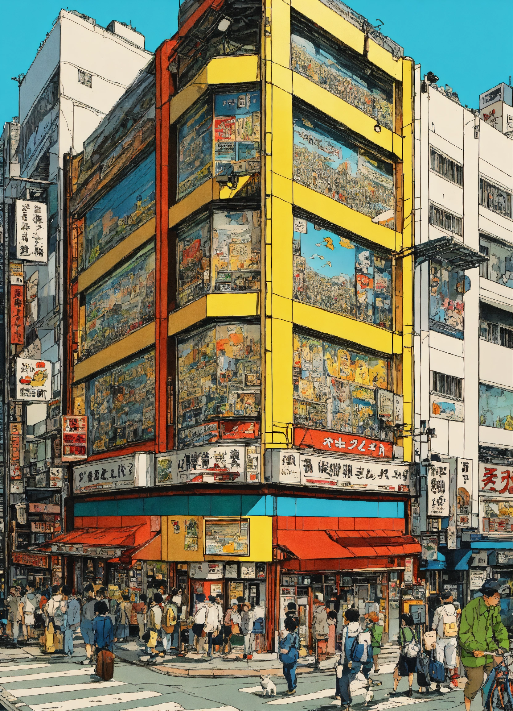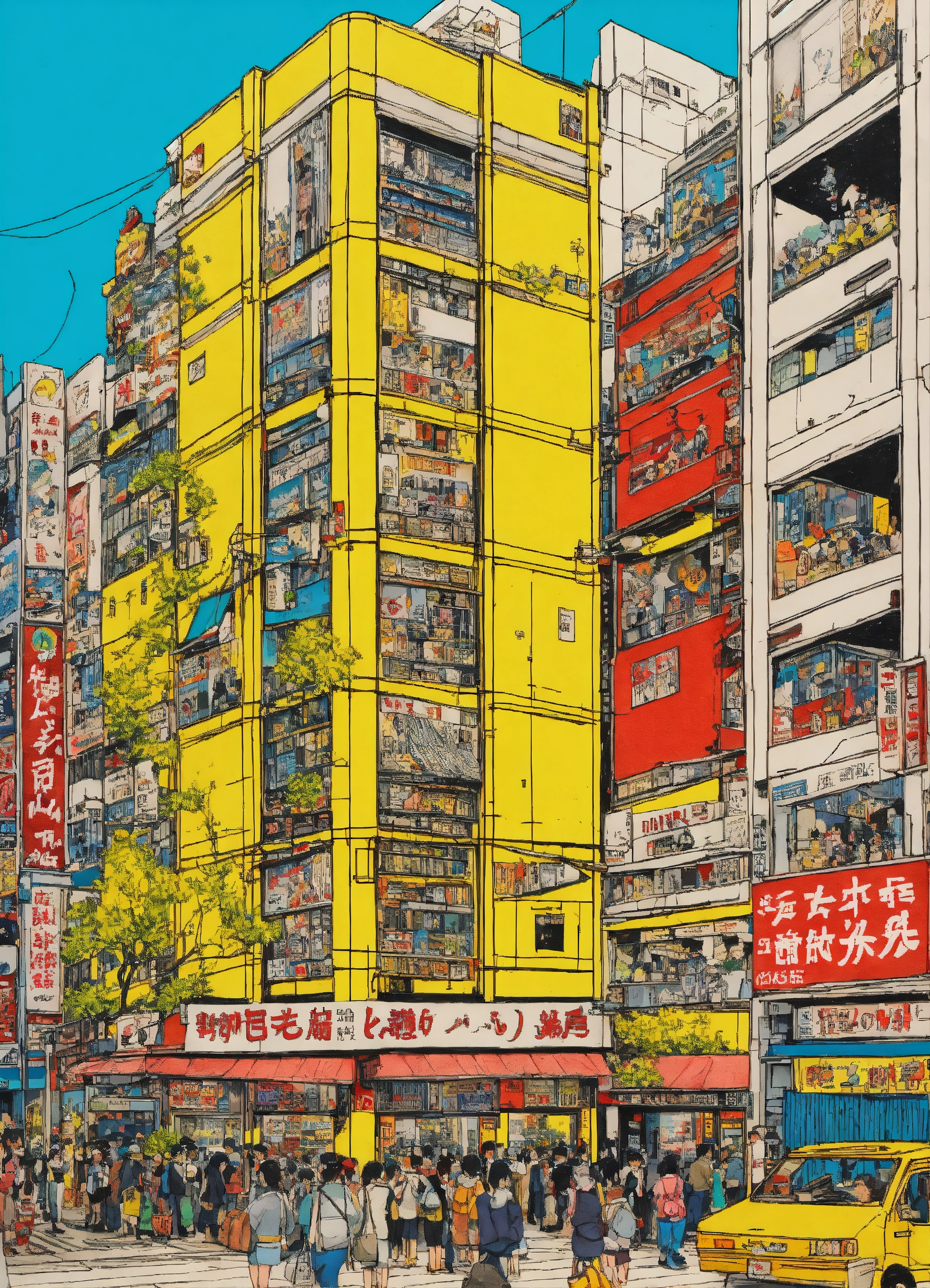 Detailed pen and ink illustration of a building in akihabara, by herge, in the style of tin-tin comics, vibrant fluor colors, detailed, lots of people, sunny day, busy neighborhood