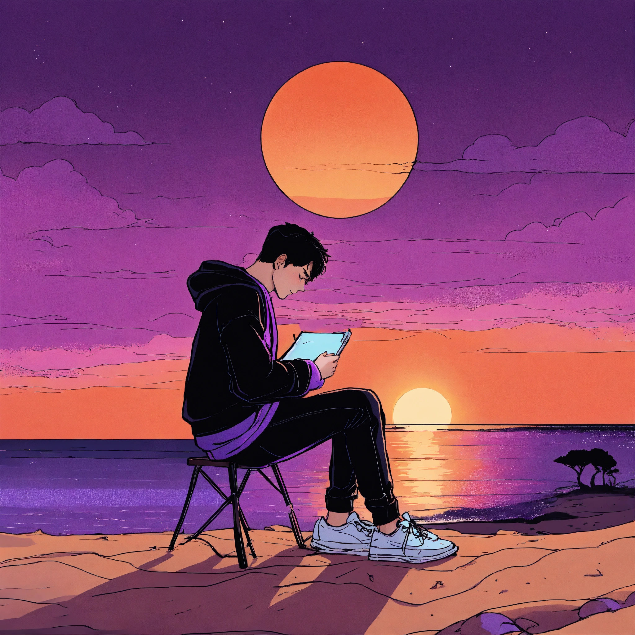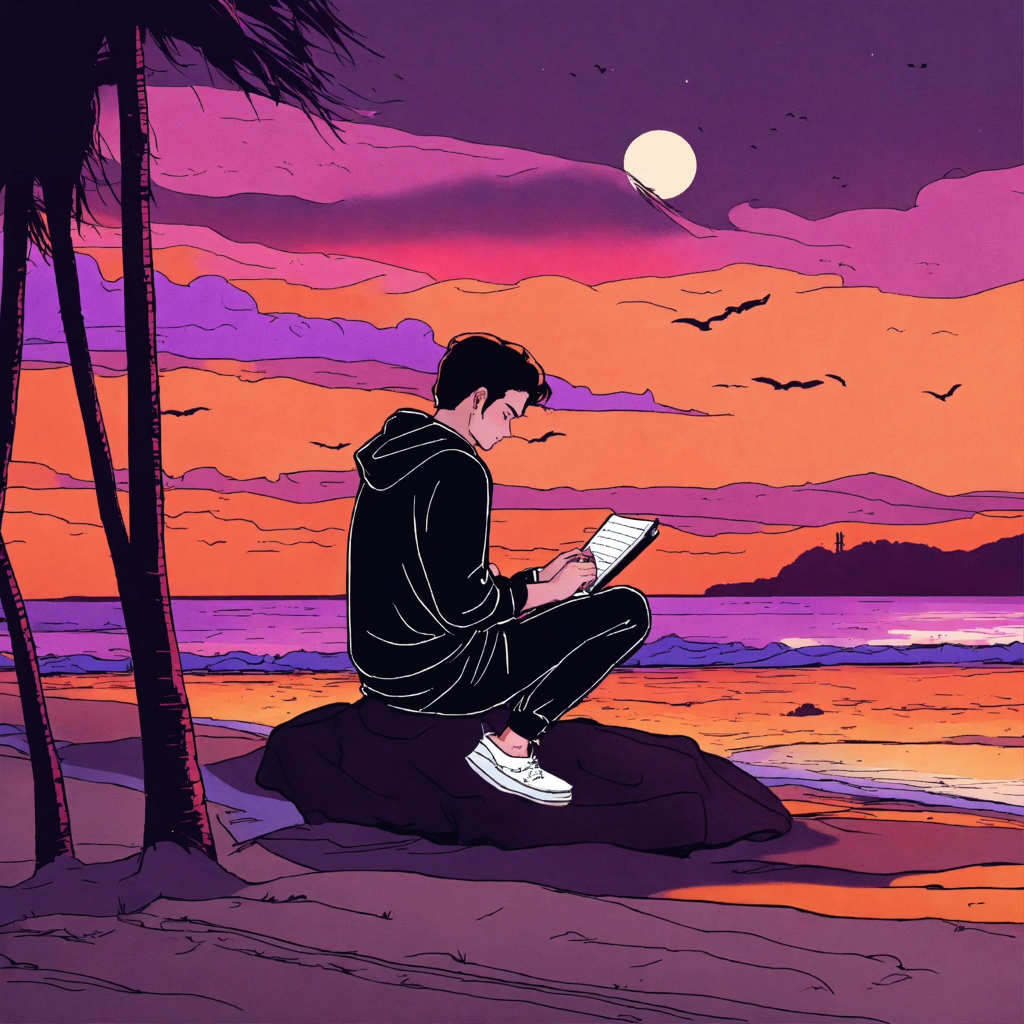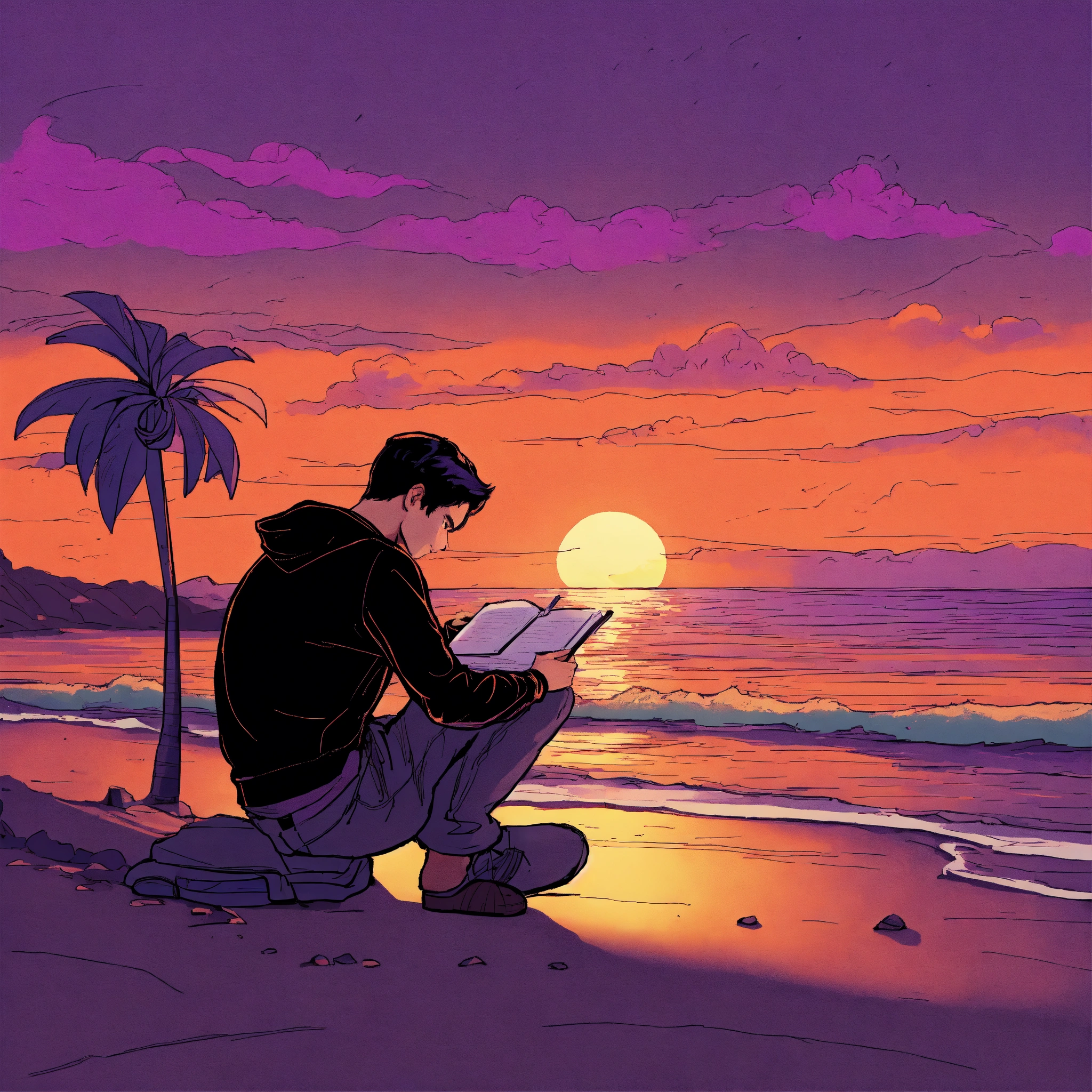 Young man writing in a notebook, wearing a black sweatshirt and black pants, on a beach with a dark purple, orange sunset, comic type