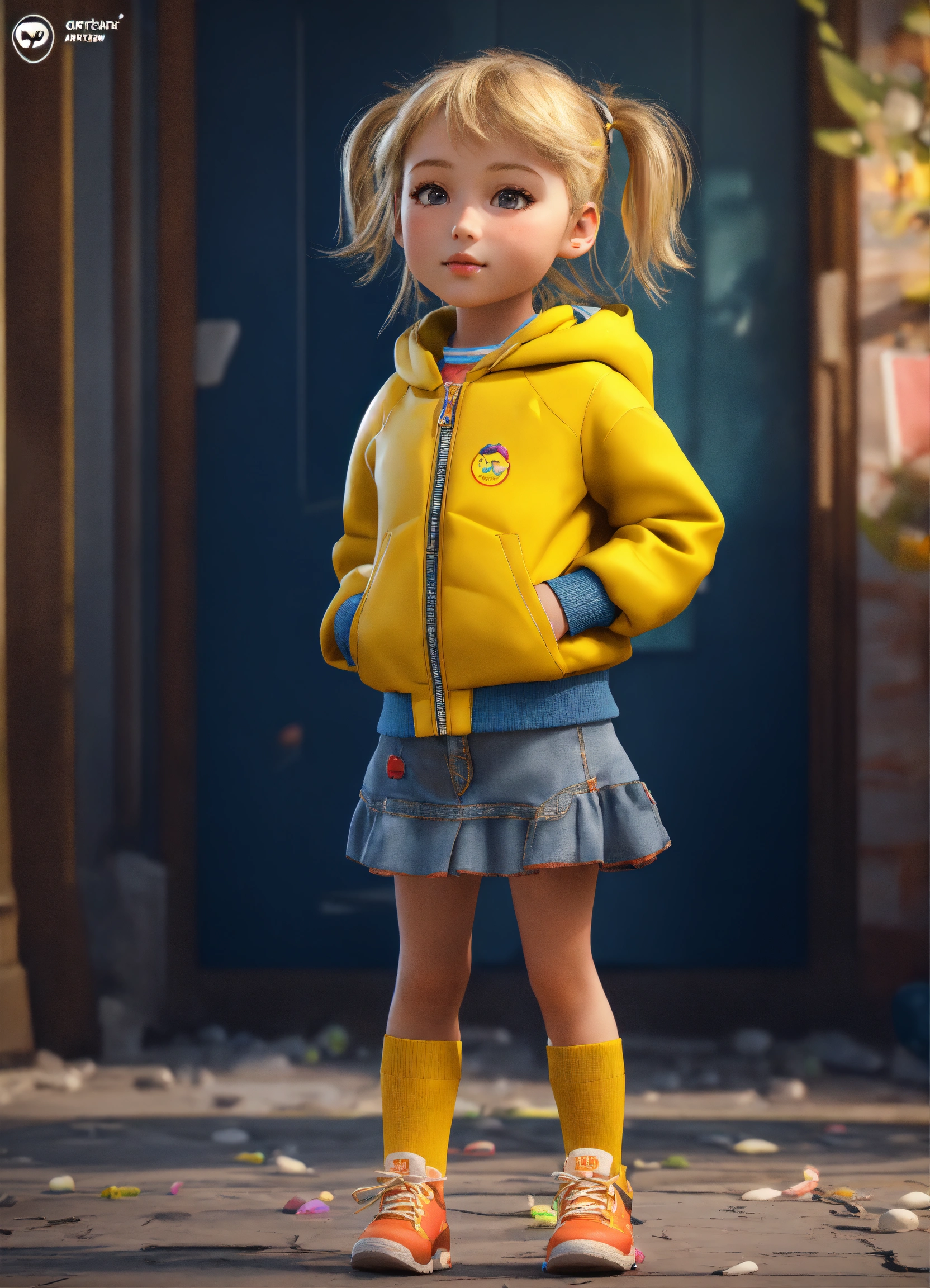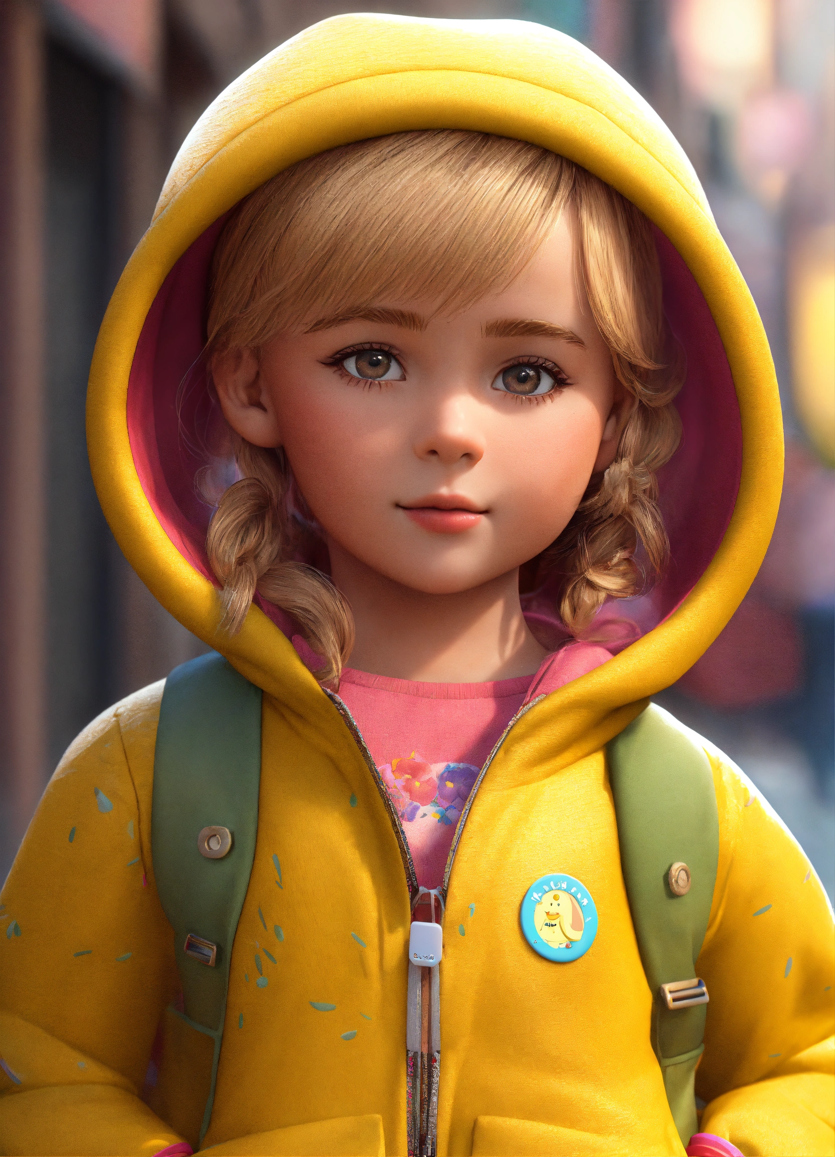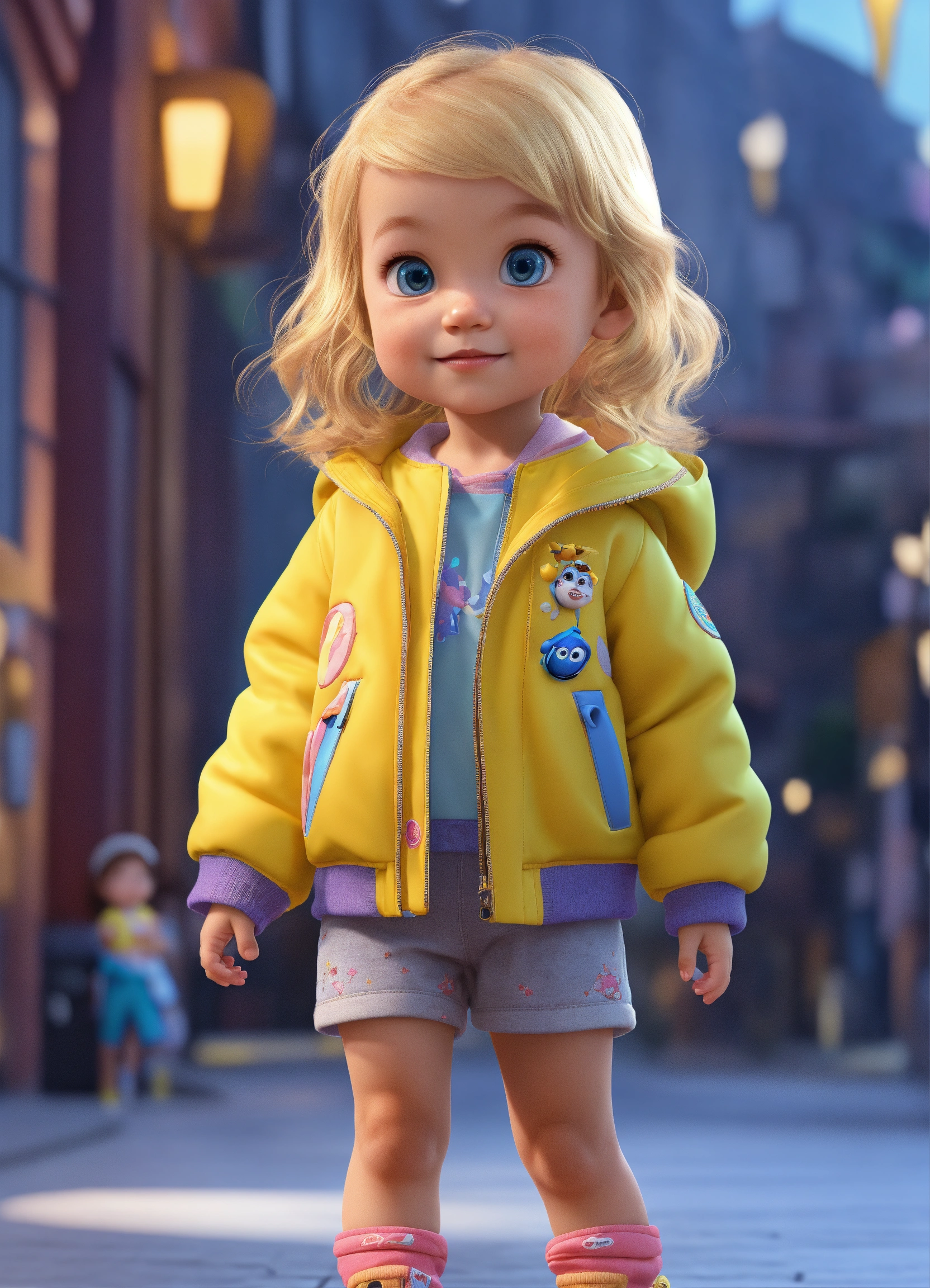 A beautiful young 3 years girl old, full body image of a cute little girl realistic, vivid colors octane render trending on artstation, and a yellow jacket, beautiful 3 d rendering, pixar cute, blond girl, andrew dickson, realistic, 3d, cartoon style, well shaded, smooth, pixar.