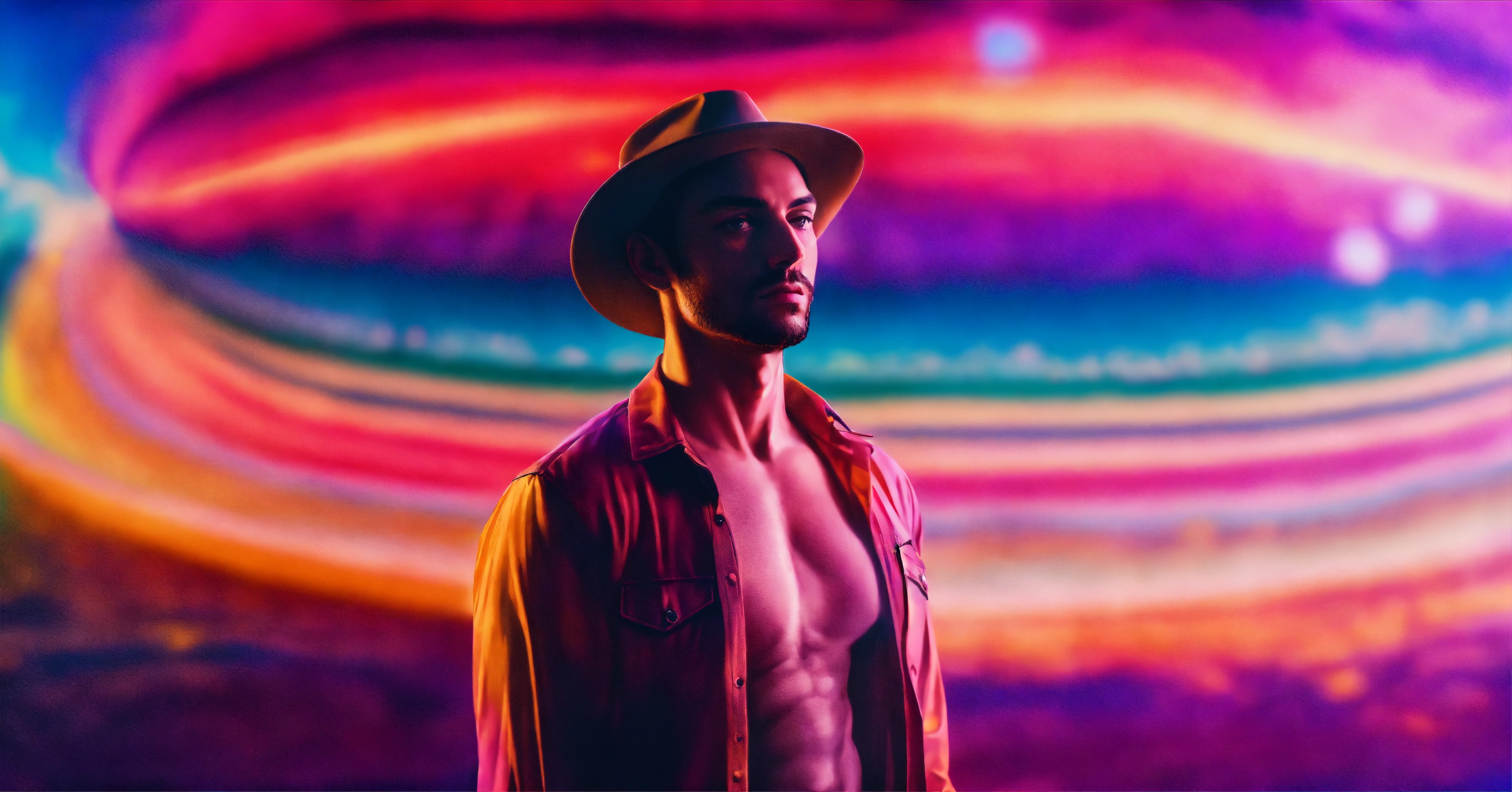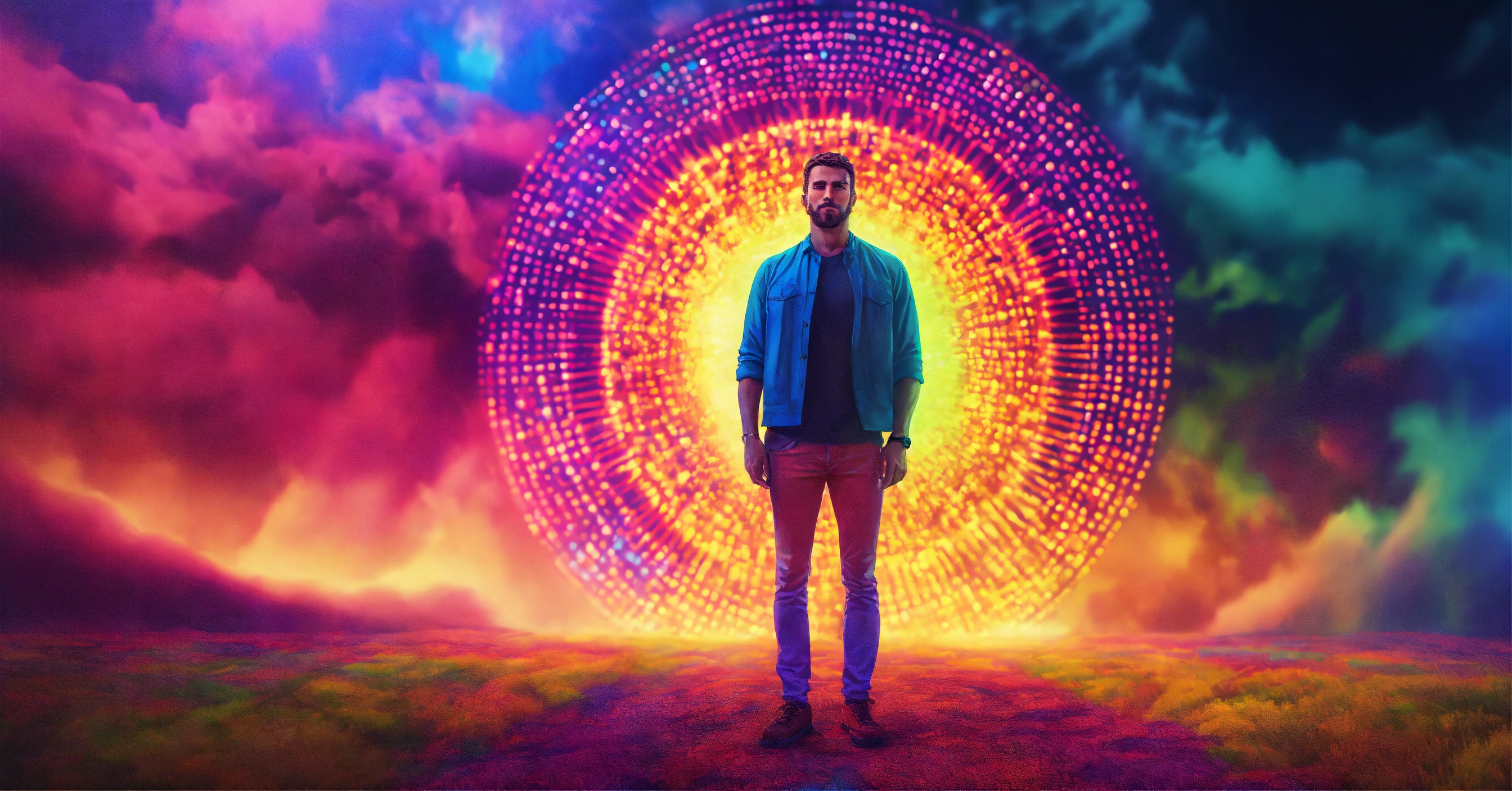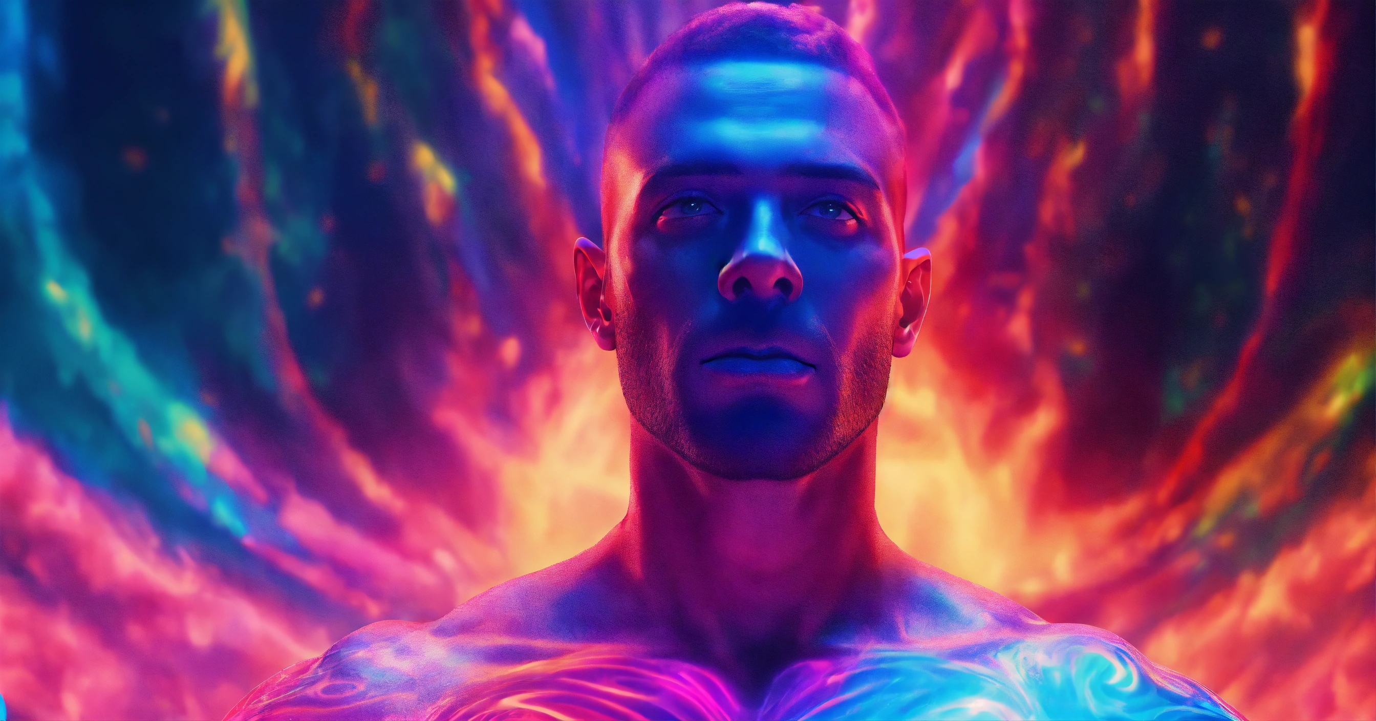 Well built man standing looking at the camera, aura floating around him, 4k resolution, psychedelic colours, photo realistic
