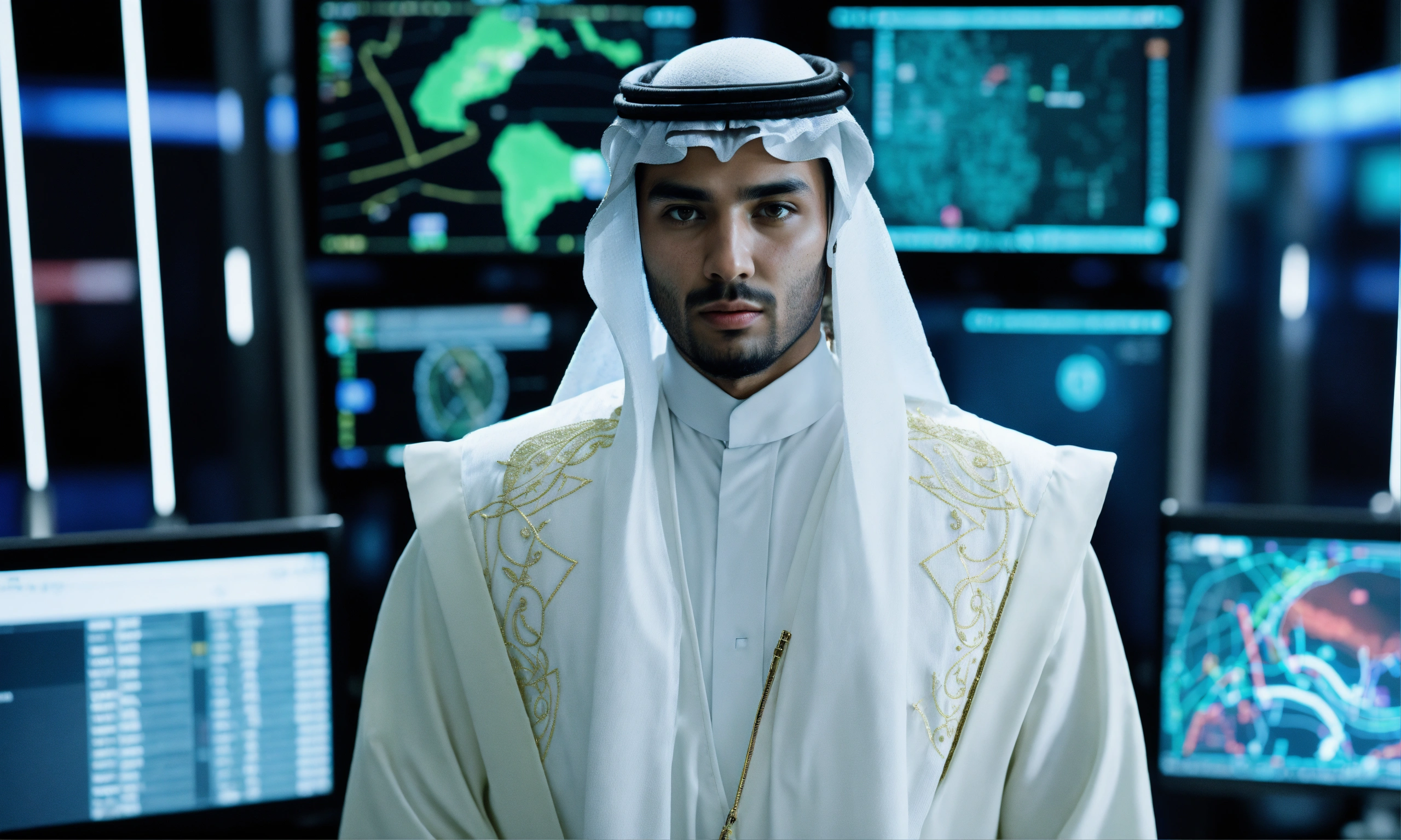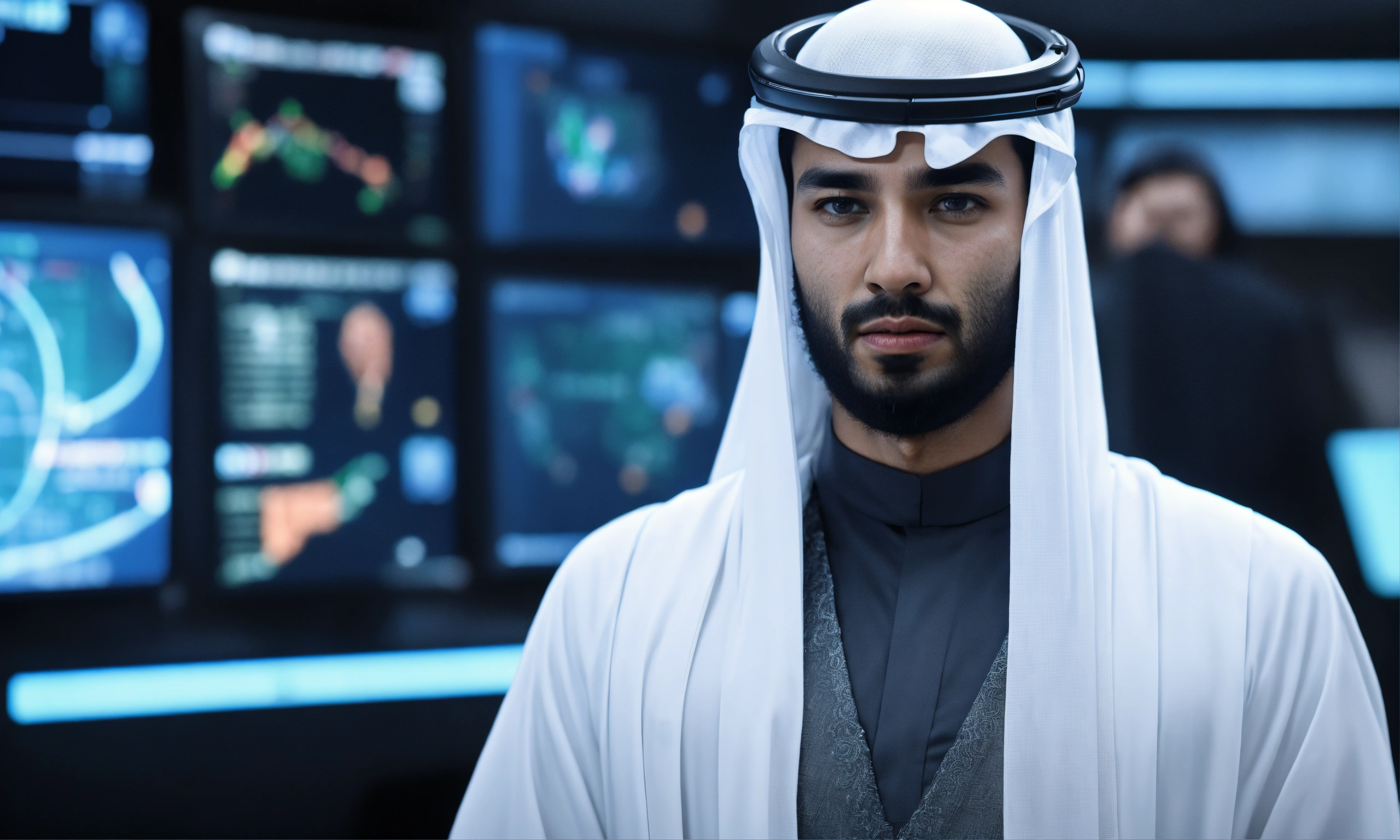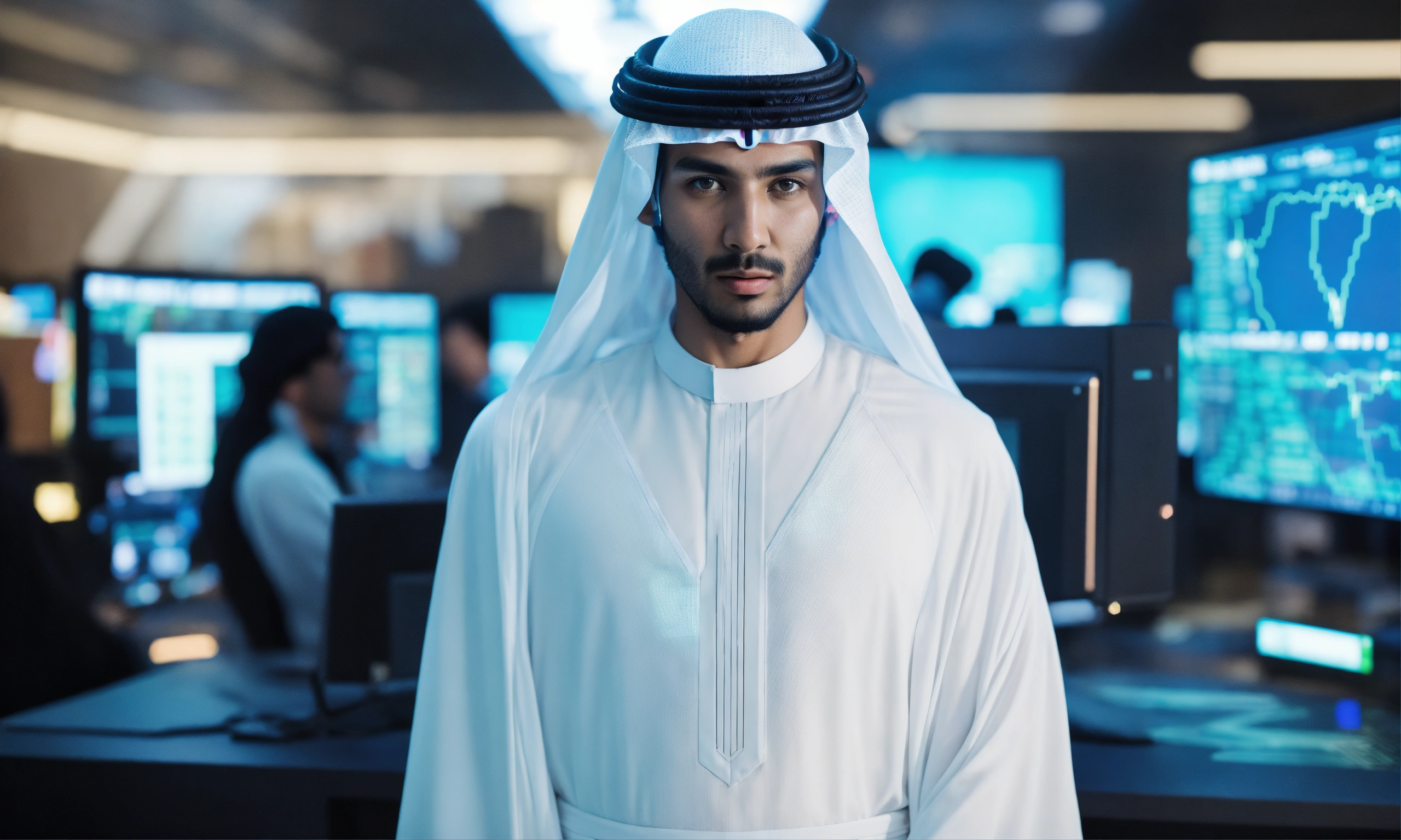 Saudi youth male, flouting screens, minority report style, augmented reality, stock market, close up, traditional white costume, black hair, computer, photo-realistic, 8k, high-definition