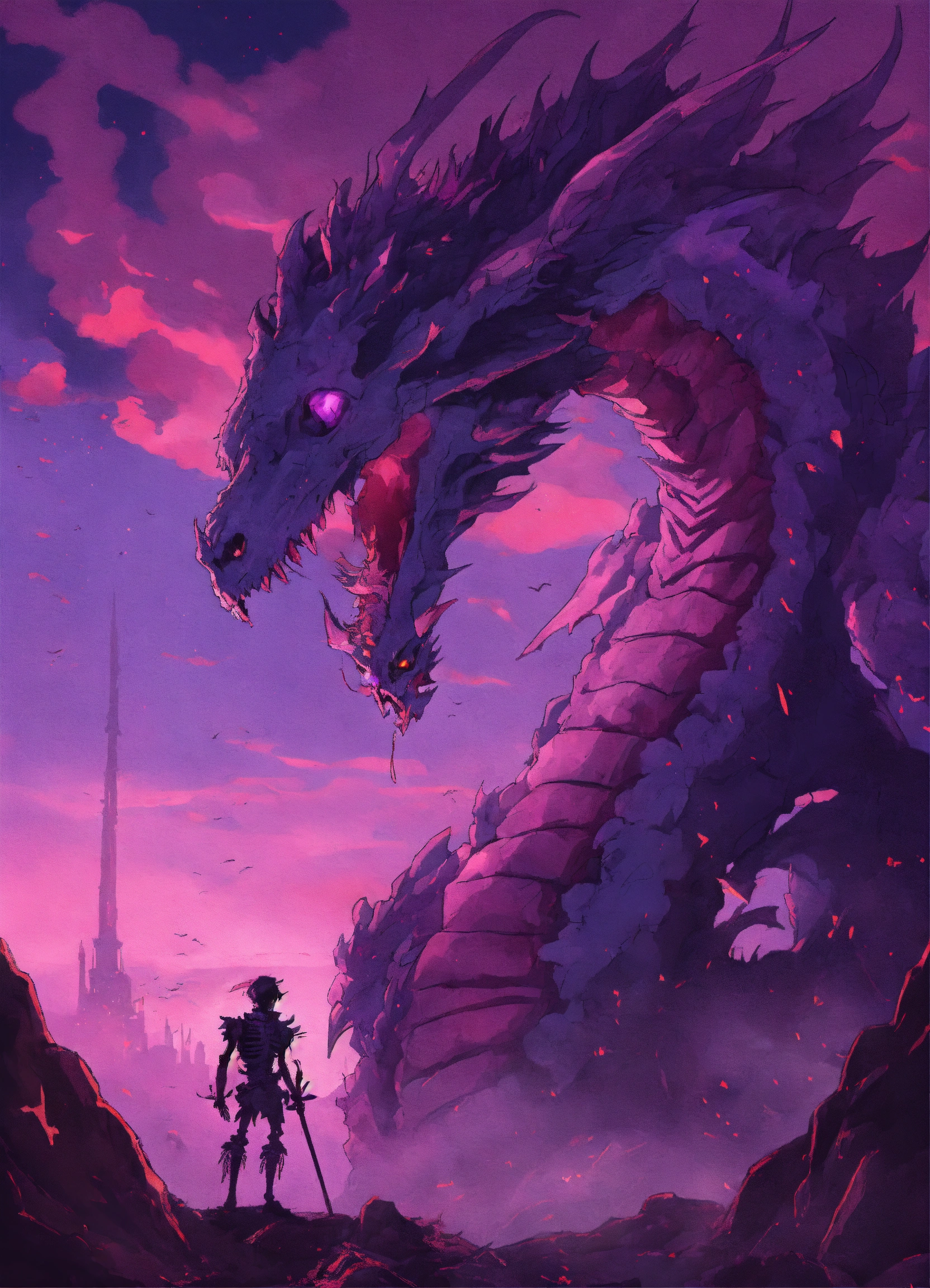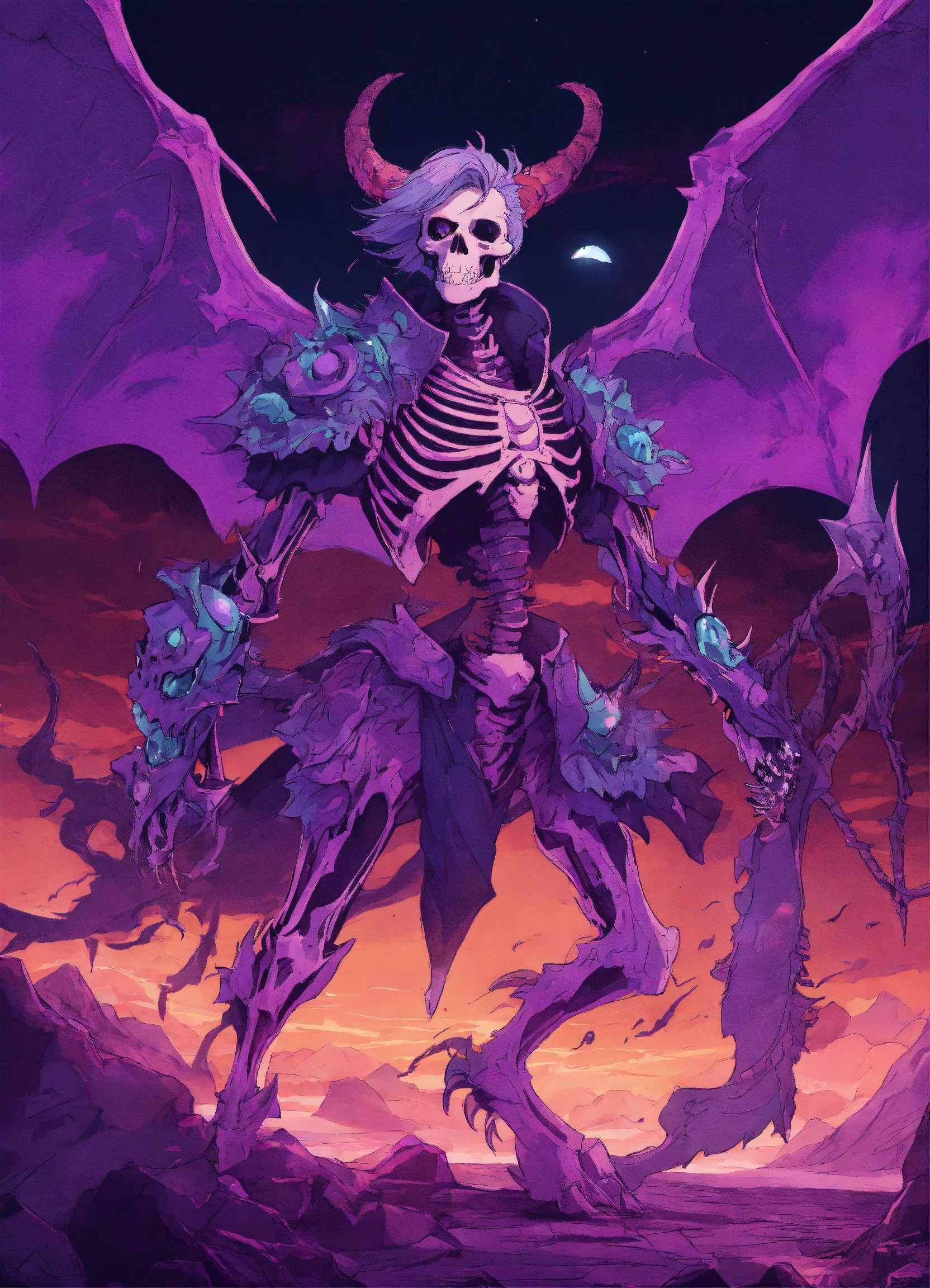 80s style anime decaying skeleton zombie dragon purple aura destroying a kingdom