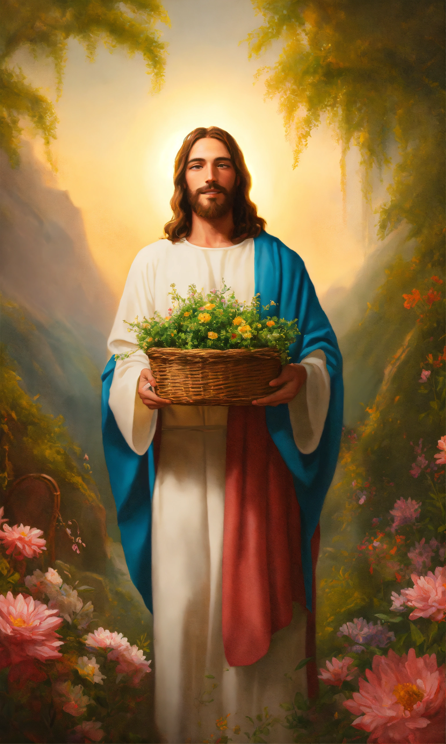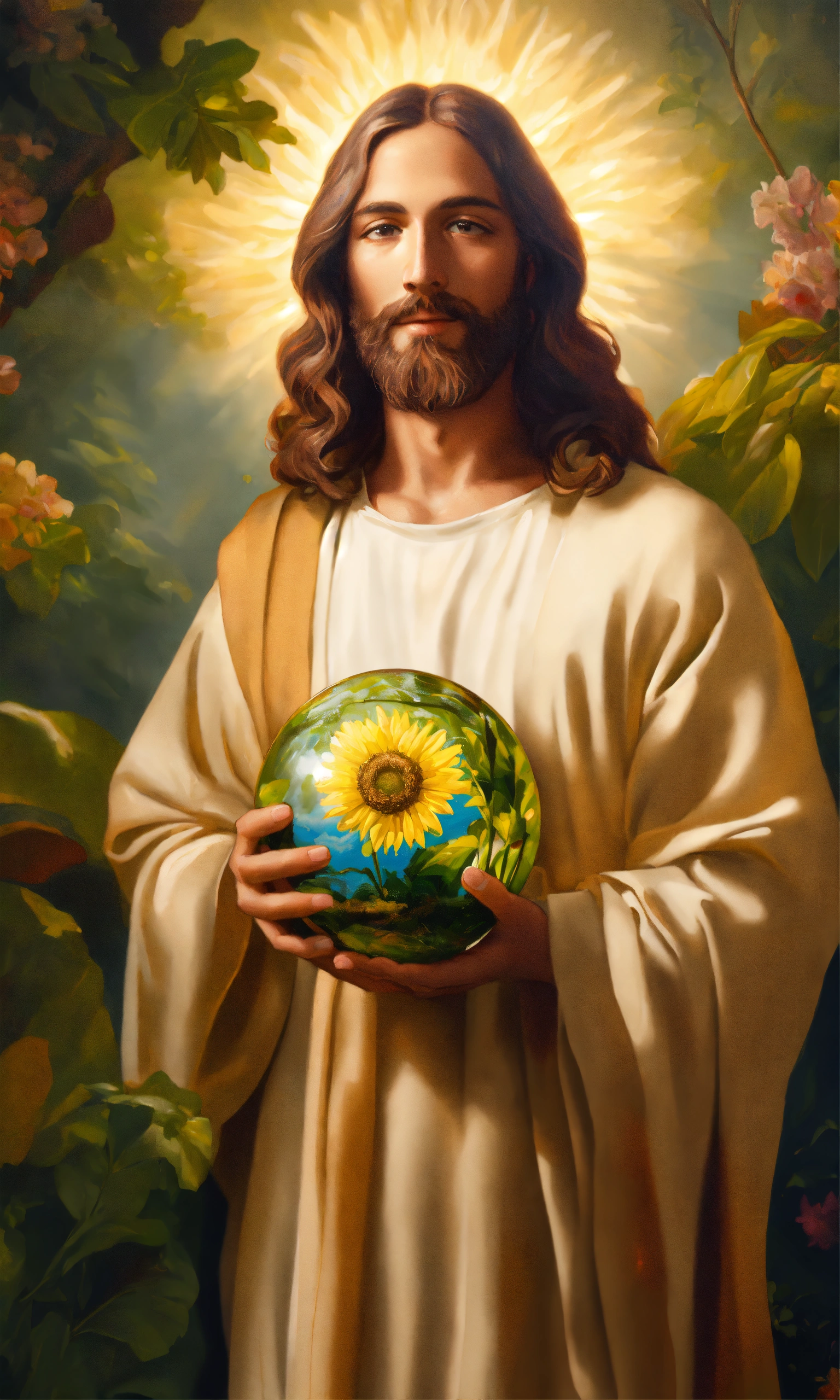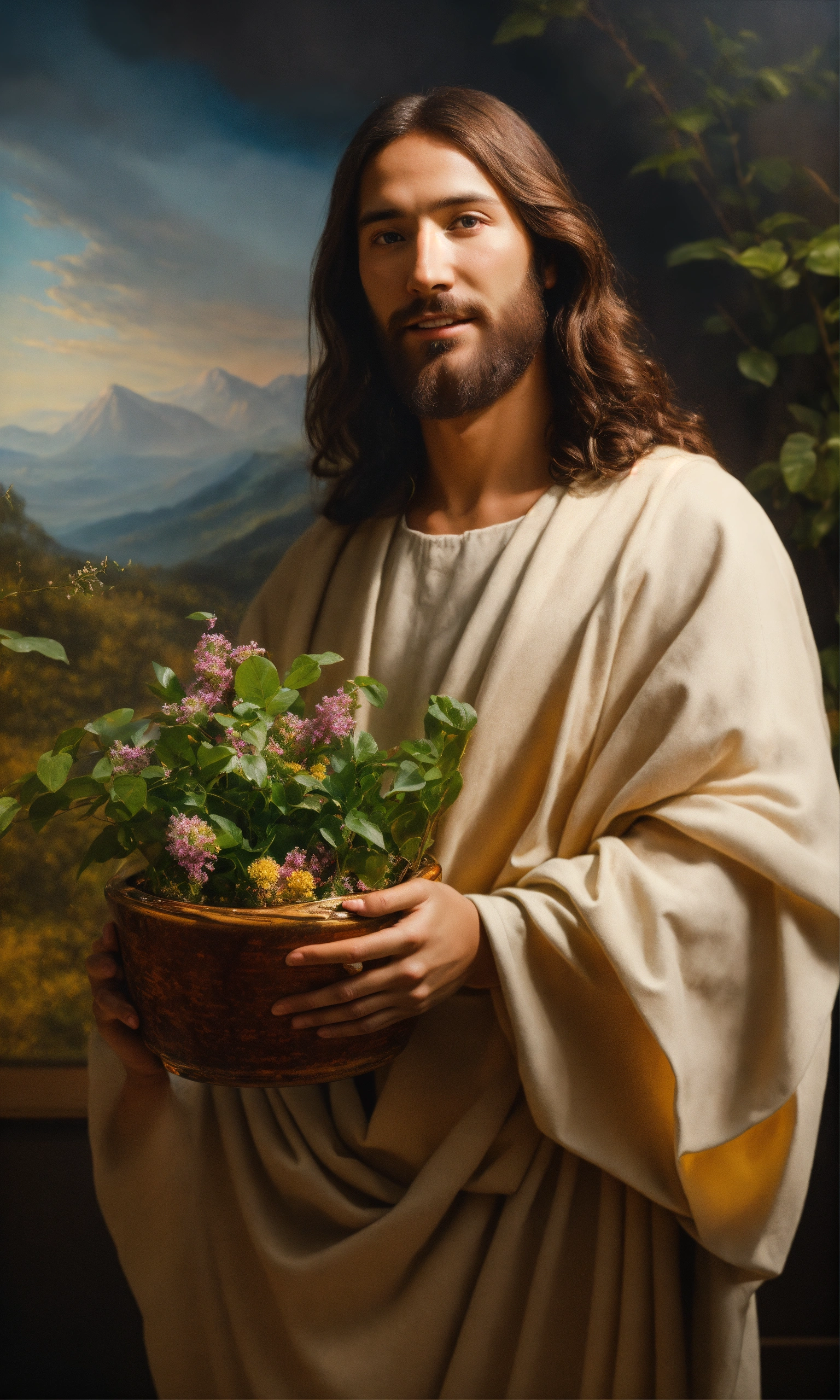 Jesus happily holding a beautiful nature oil painting, surreal photo, fujifilm xt3, indoor, good lighting, raw photo, 8k uhd, film grain, unreal engine 5, ray trace