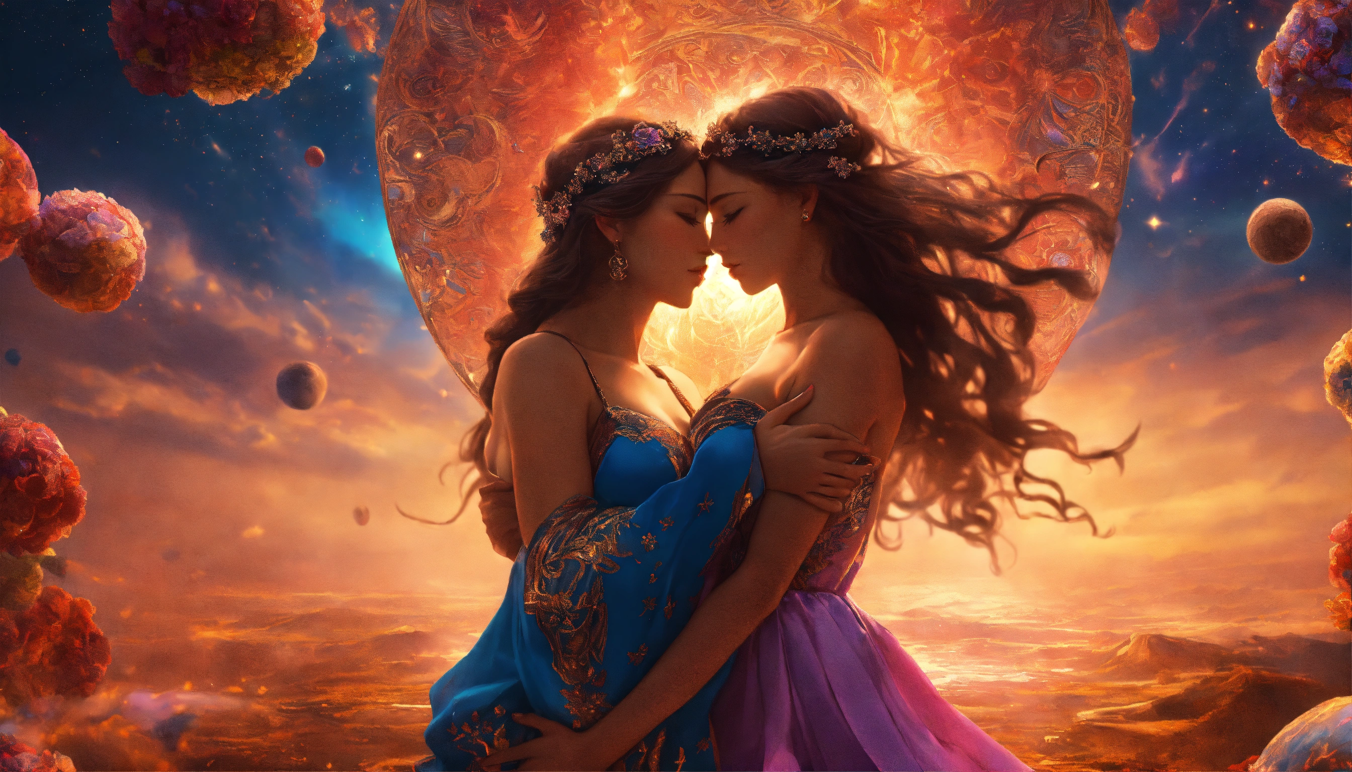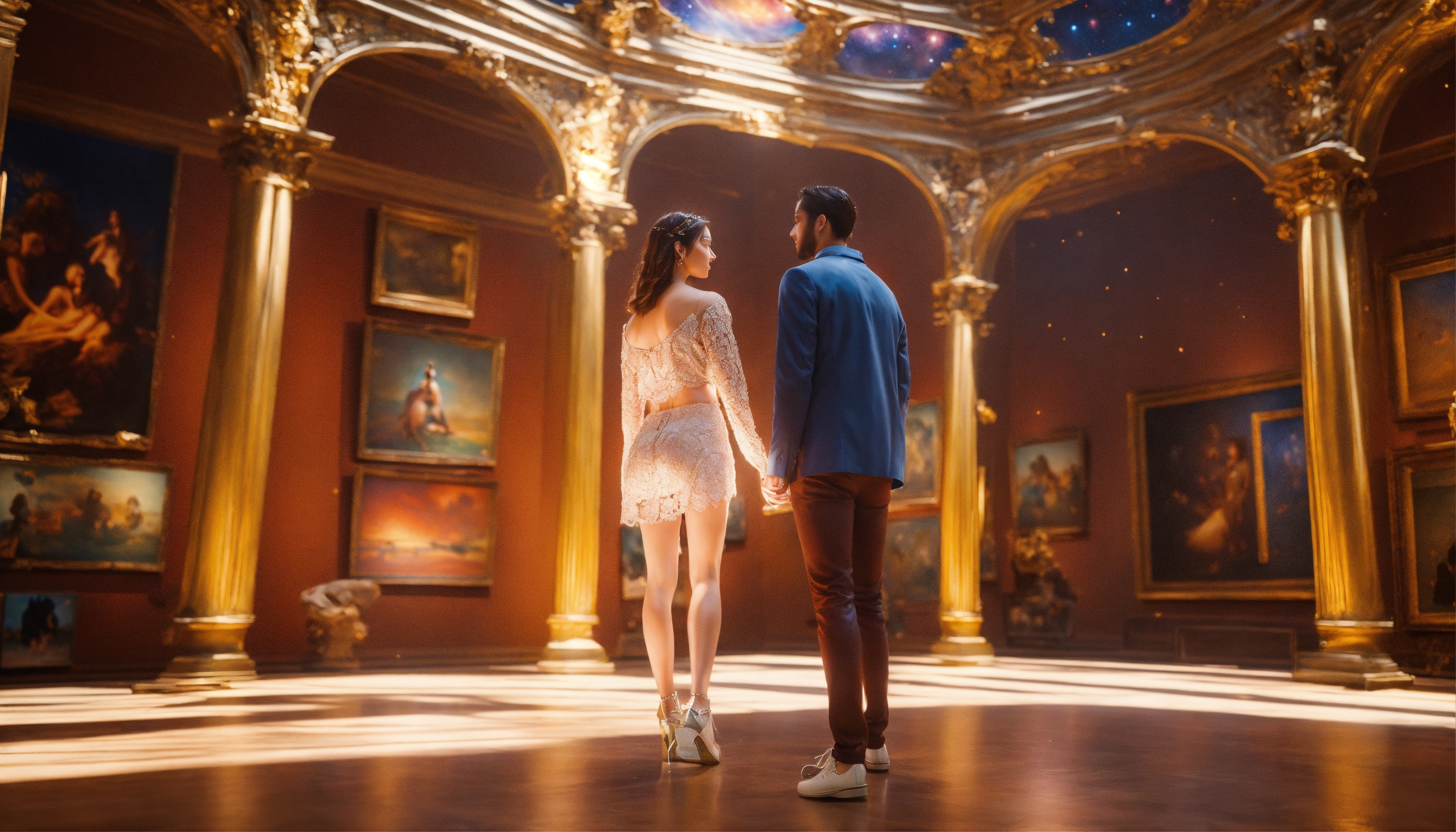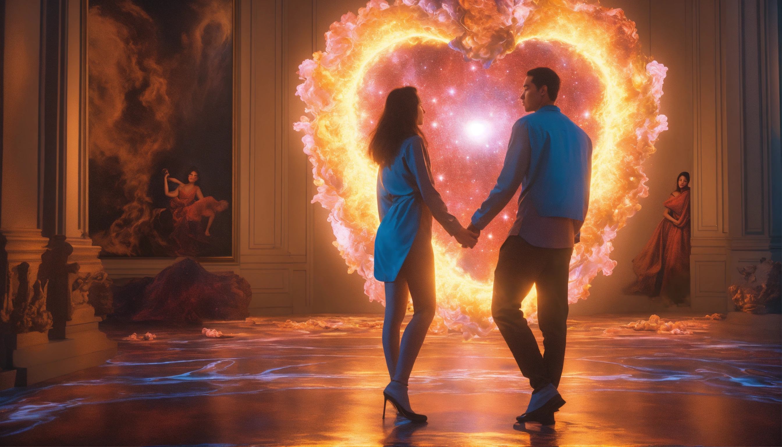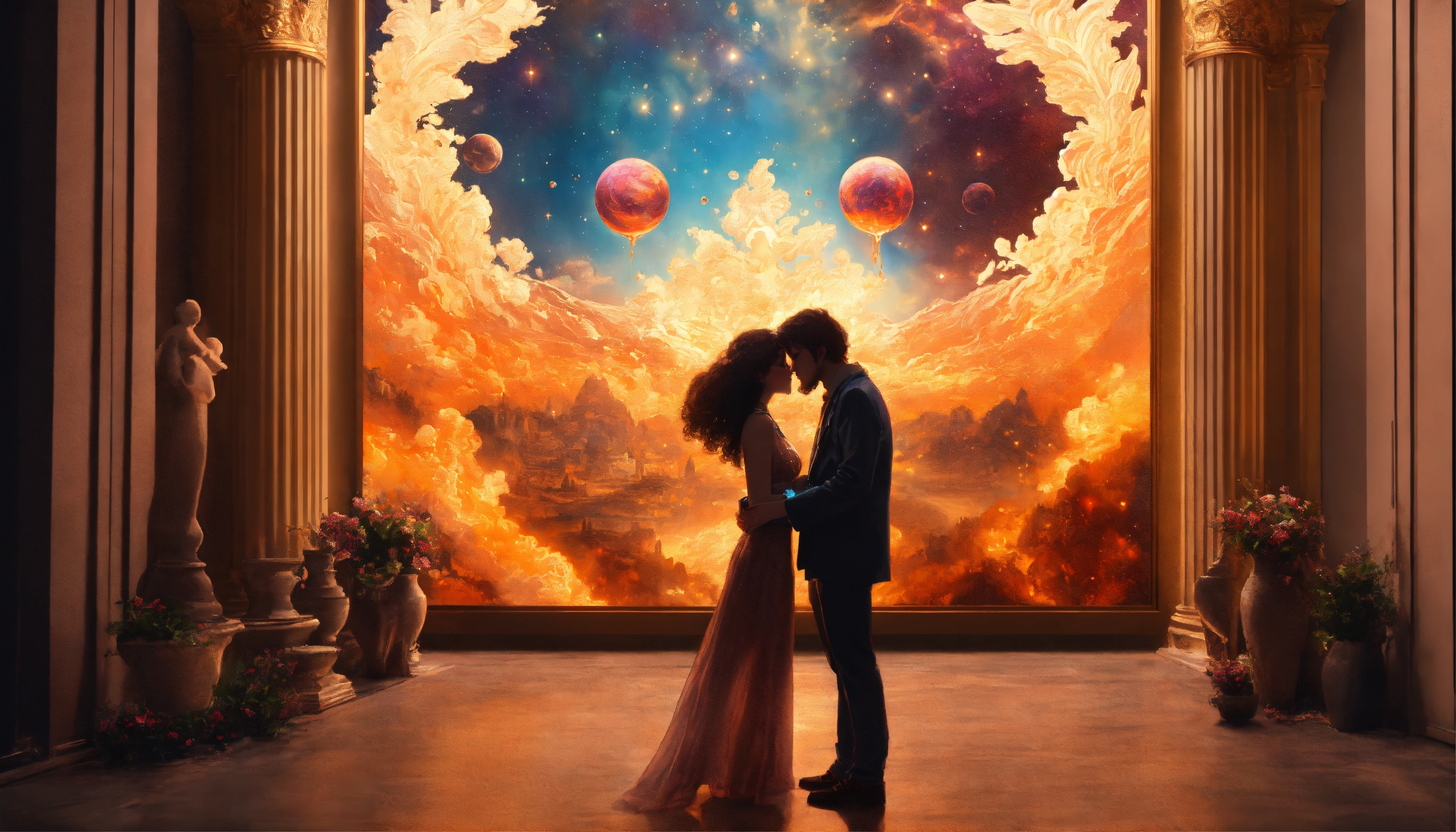 A cosmic twin flame collision of two divine counterparts falling in love at first sight at an art gallery, art gallery scenery, intricate details, ultra 8k, realistic