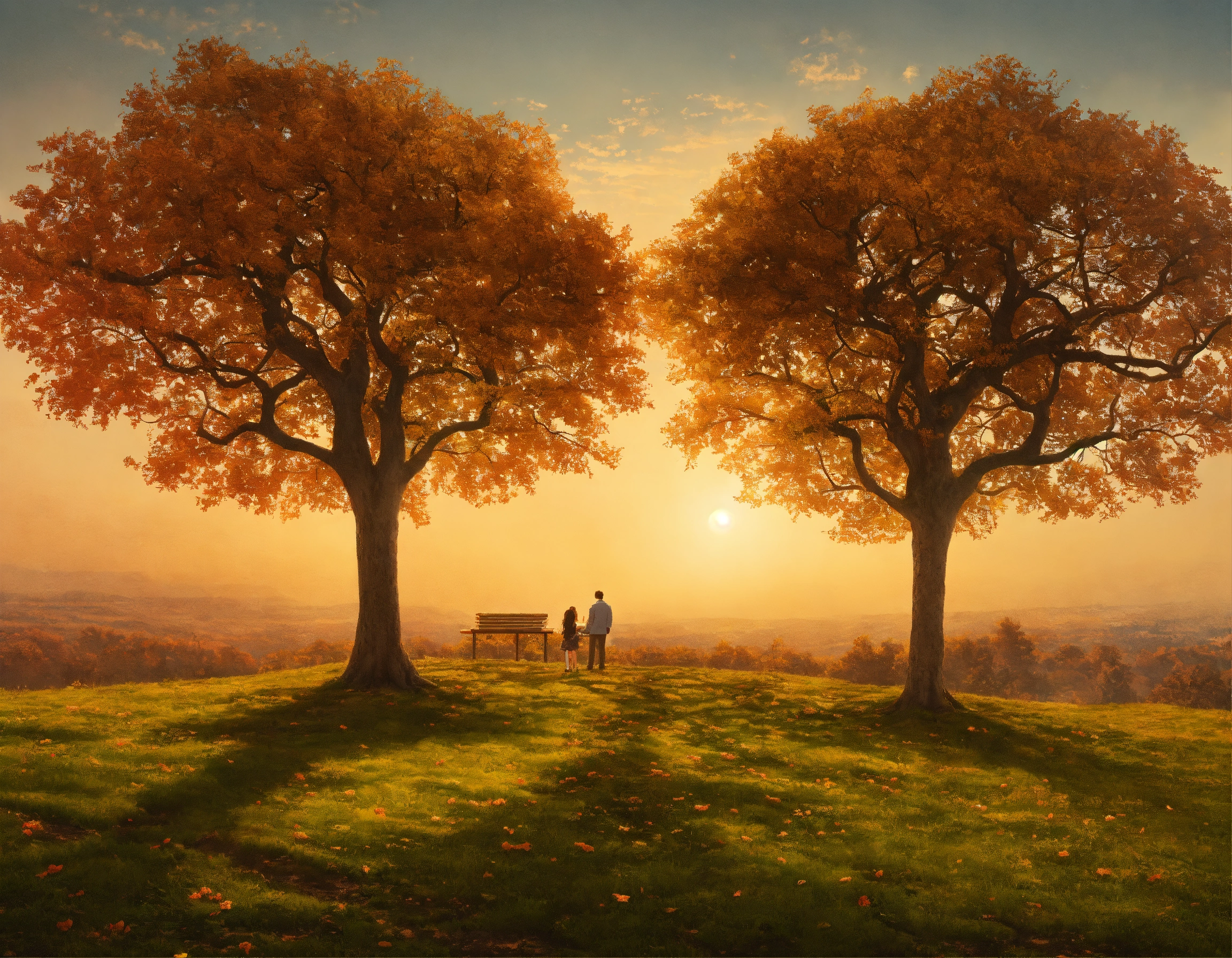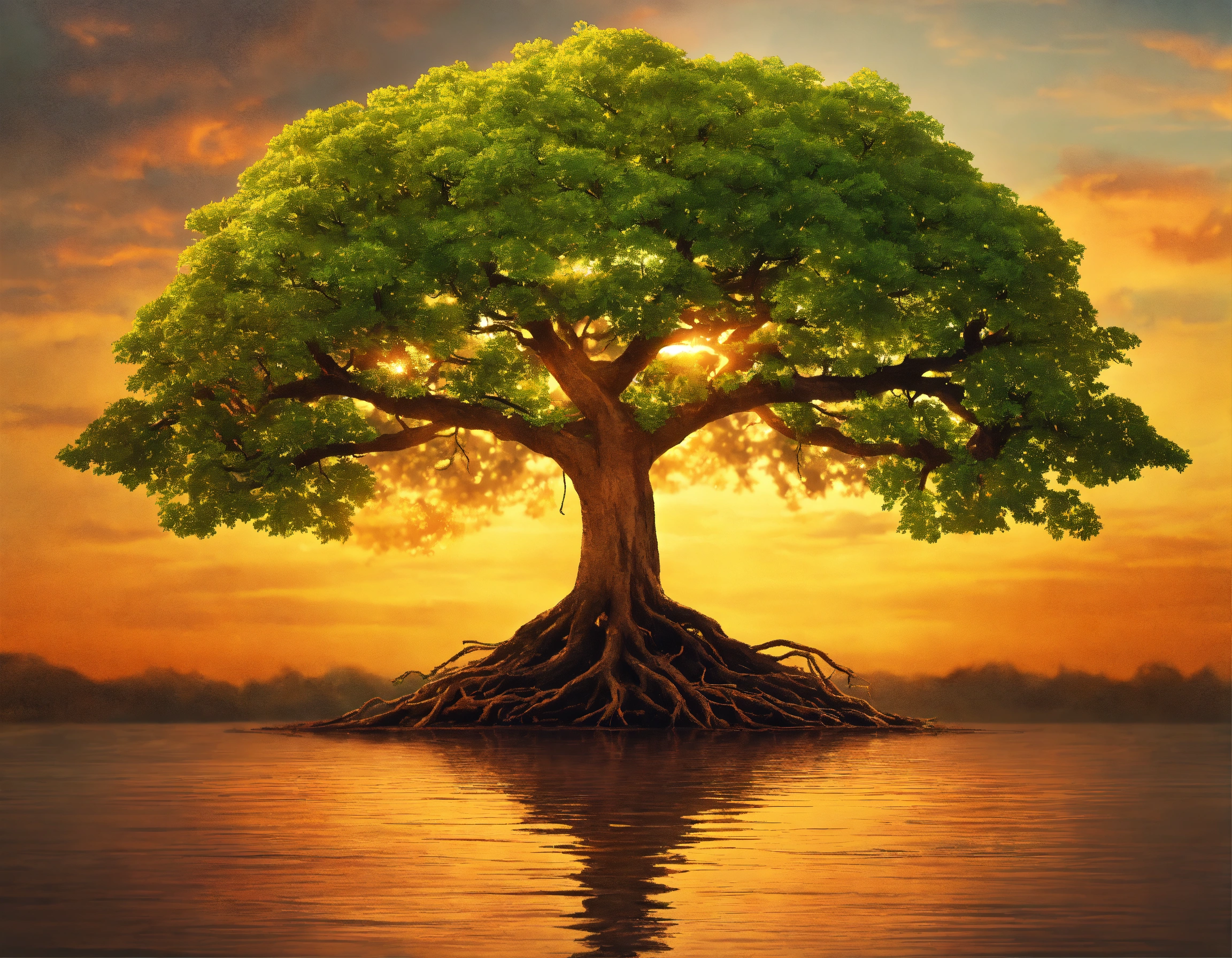 "create a visual representation of the intertwined nature of work and life. picture two trees, one symbolizing 'work' and the other 'life'. instead of standing apart, their roots and branches are seamlessly intertwined, showing the deep connection and mutual influence they have on one another. sprinkle some leaves, symbolizing moments of joy, challenges, and milestones, shared across both trees. in the background, showcase a harmonious environment perhaps a sunrise or sunset, indicating the balance and the cycle of day-to-day life. emphasize the idea of unity, interconnectedness, and the holistic approach to the work-life experience."