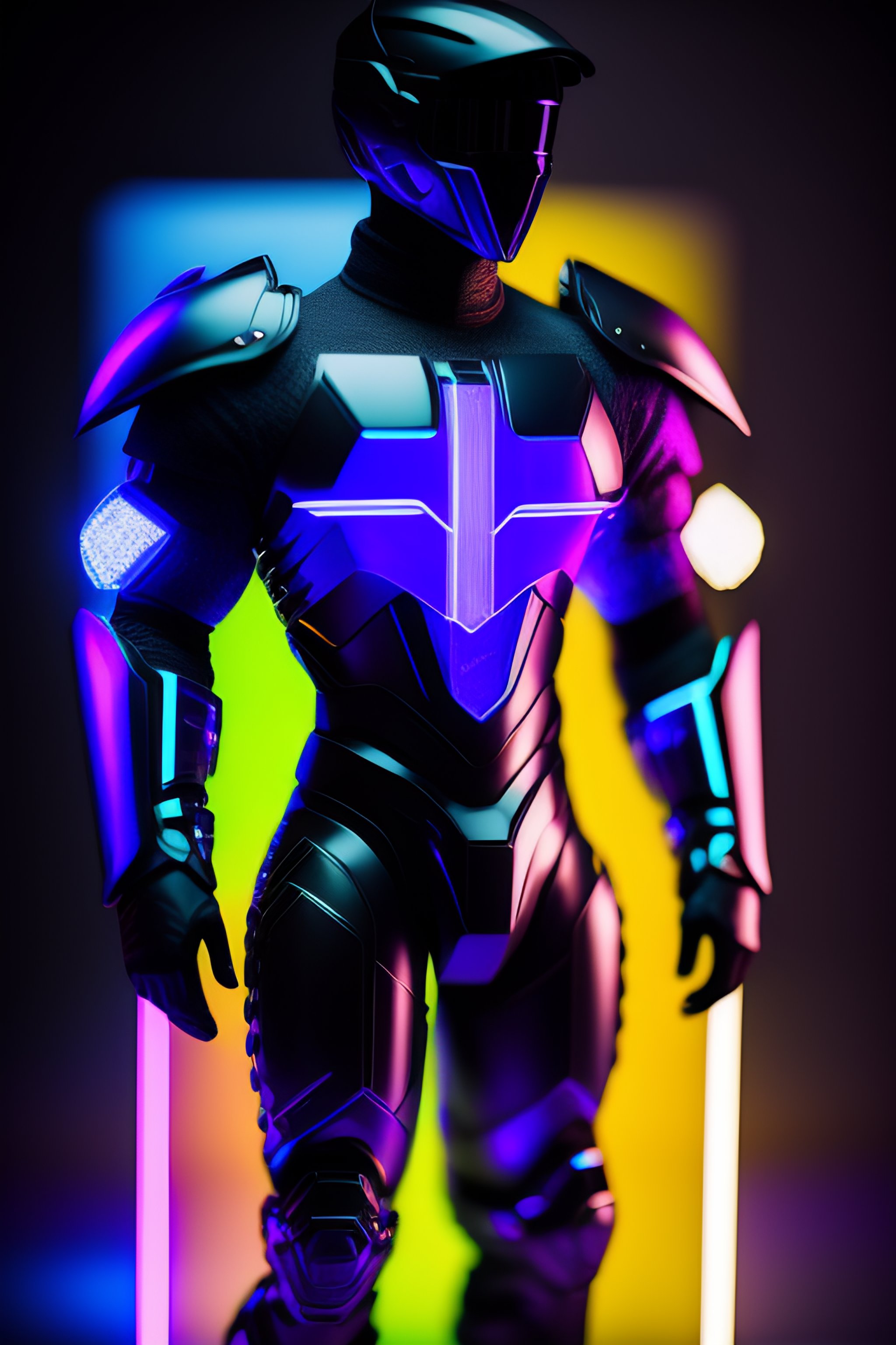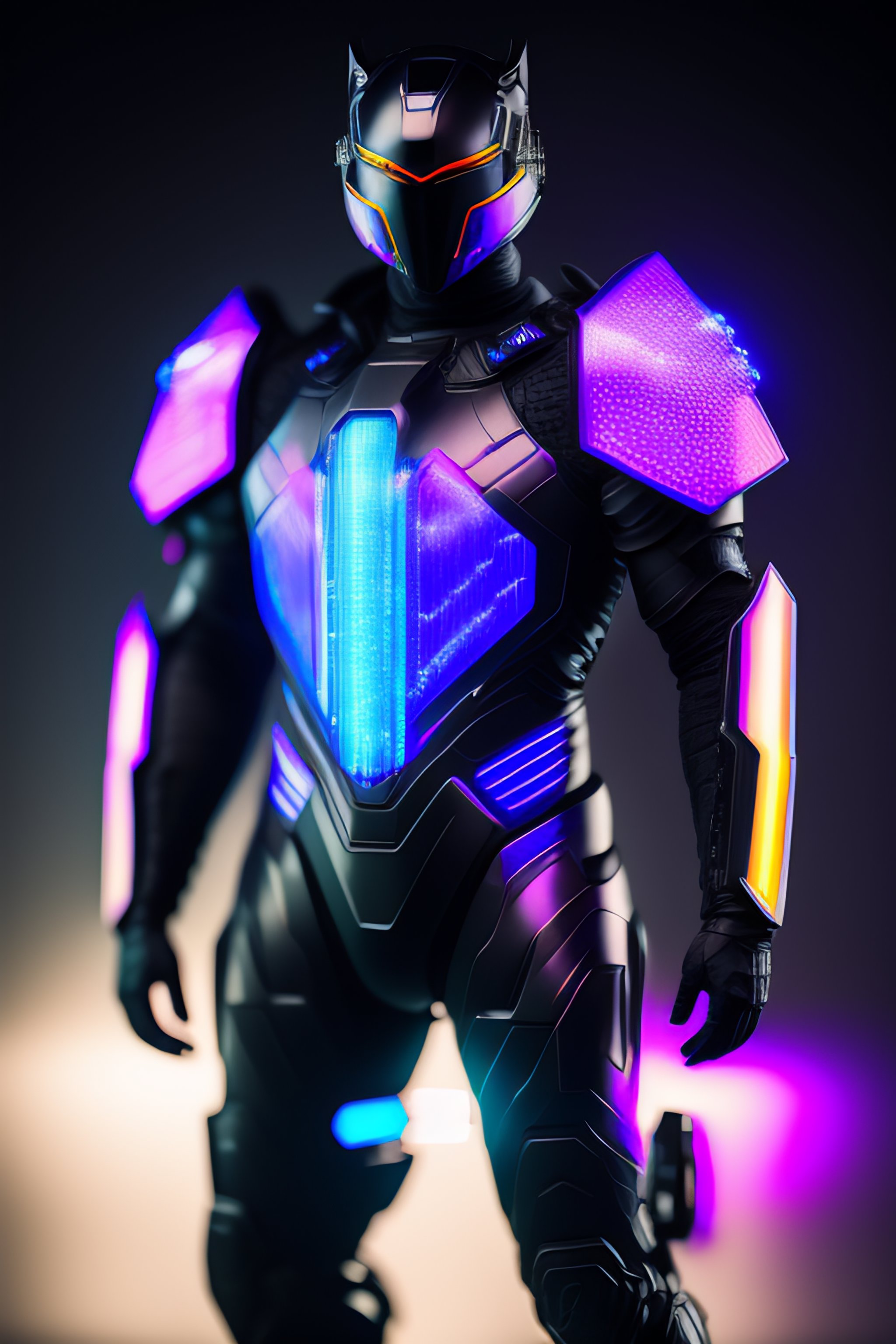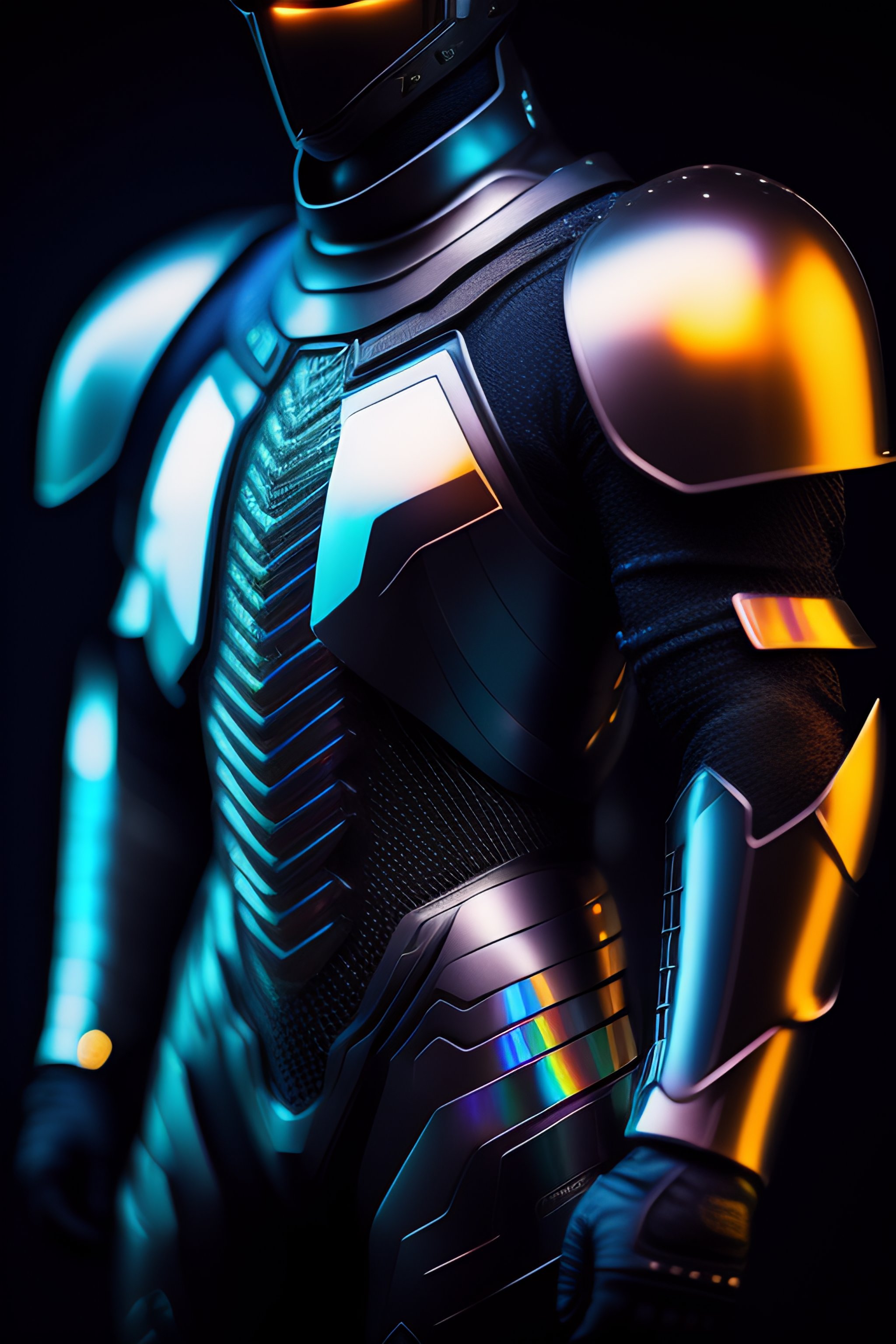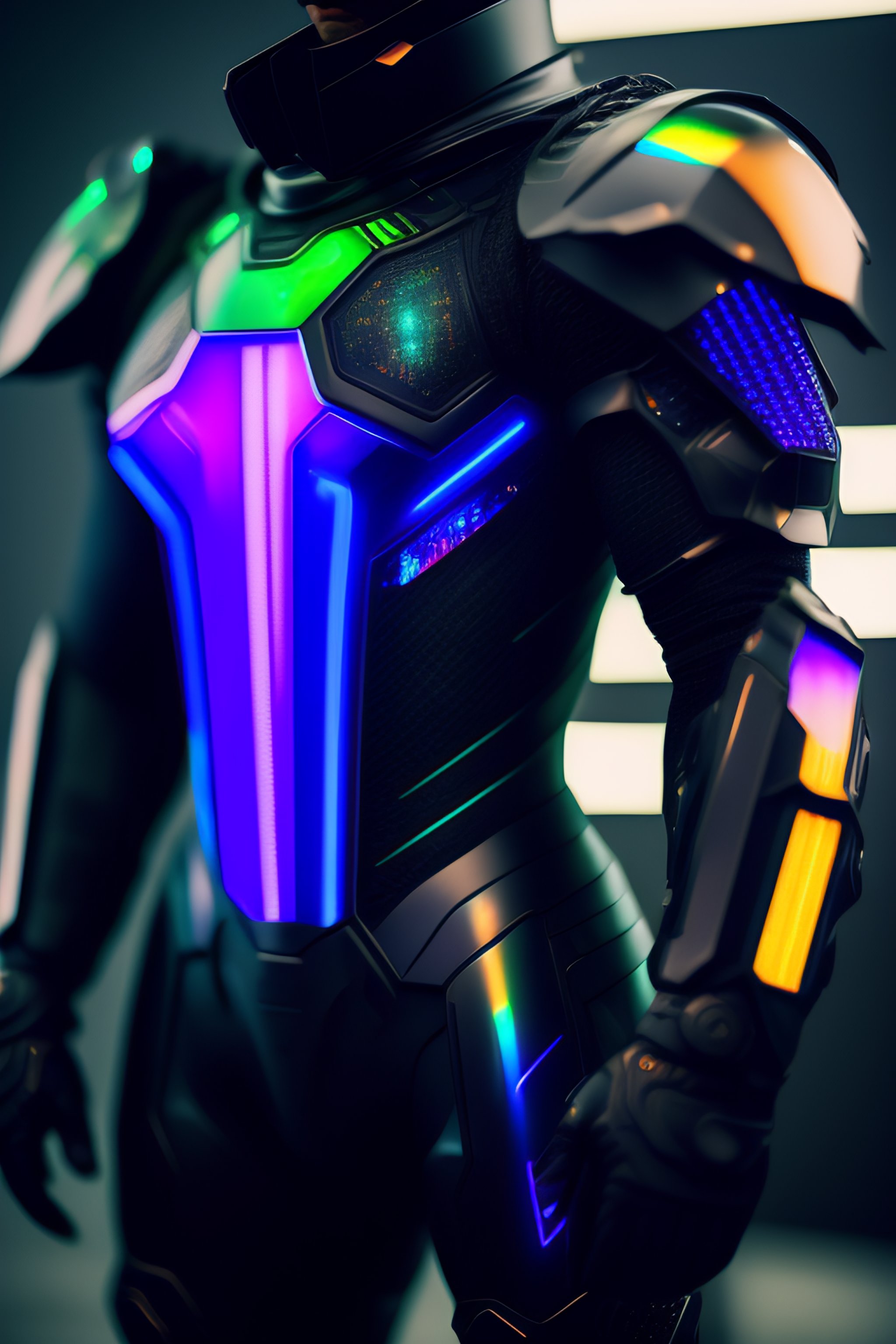 A photograph of a cyberpunk armour made of black titanium and some crystal, rgb leds rainbow, power suit, gradient, crystal, visible wires and microchip, holograph, crystal transparent torso, imposing, elegant, for men, modern minimalism, low poly lines, glitch core, dreamy, colorful, dystopia, godlike, mysterious