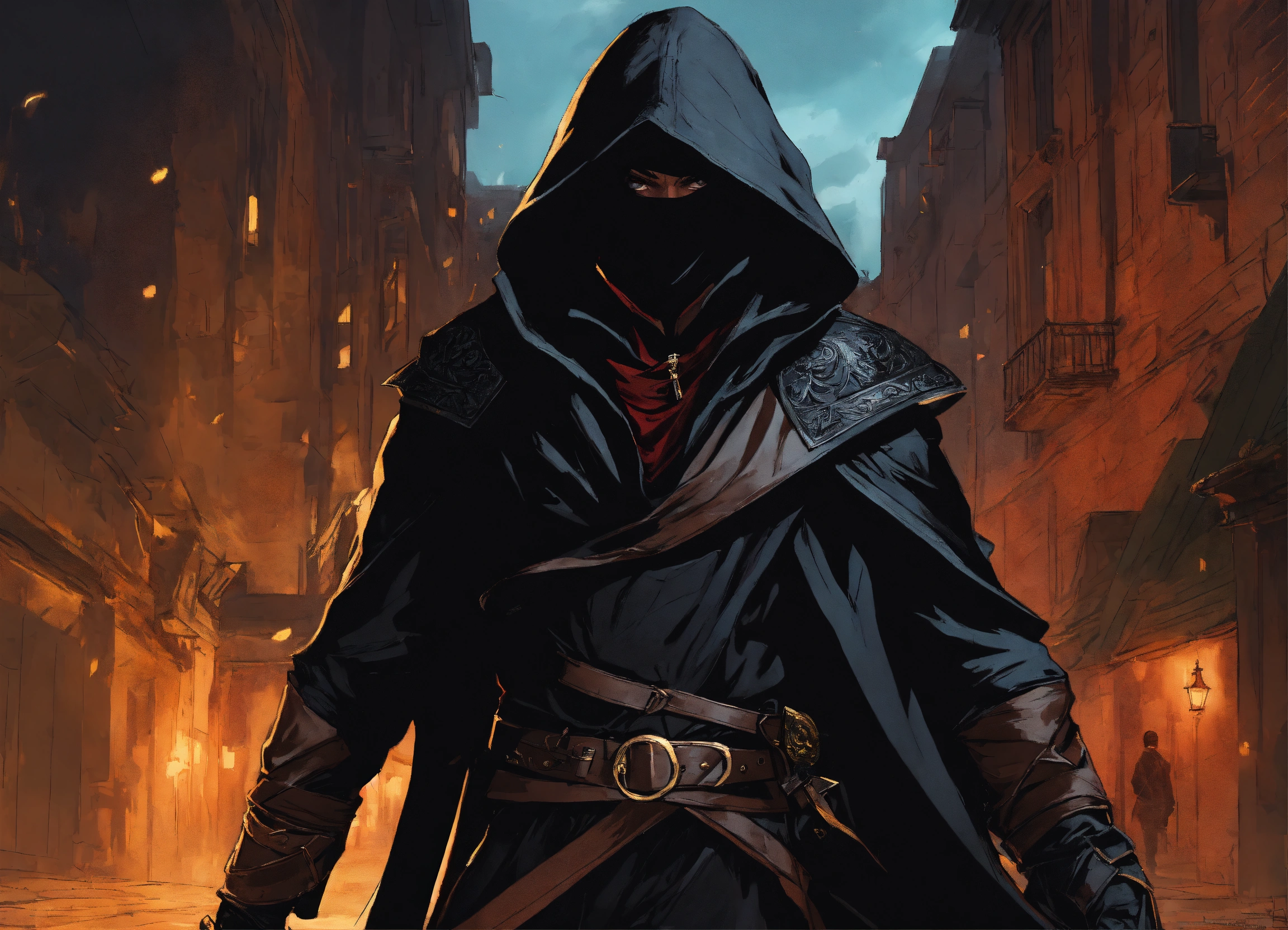 Body shot, a middle aged black male assassin in full black cloak and hood concealing his face, wielding daggers, stealthy, cinematic lighting, fantasy setting, graphic novel art