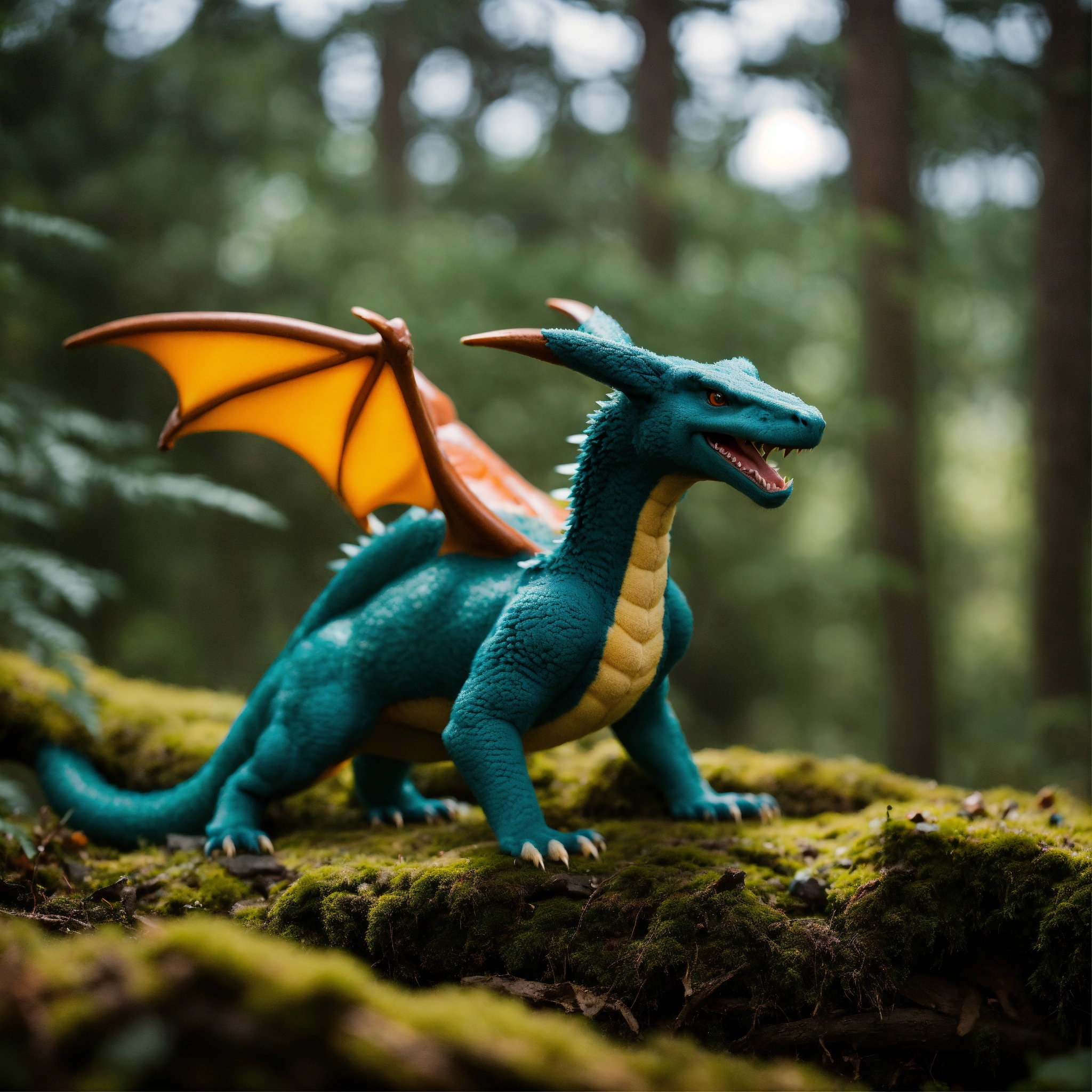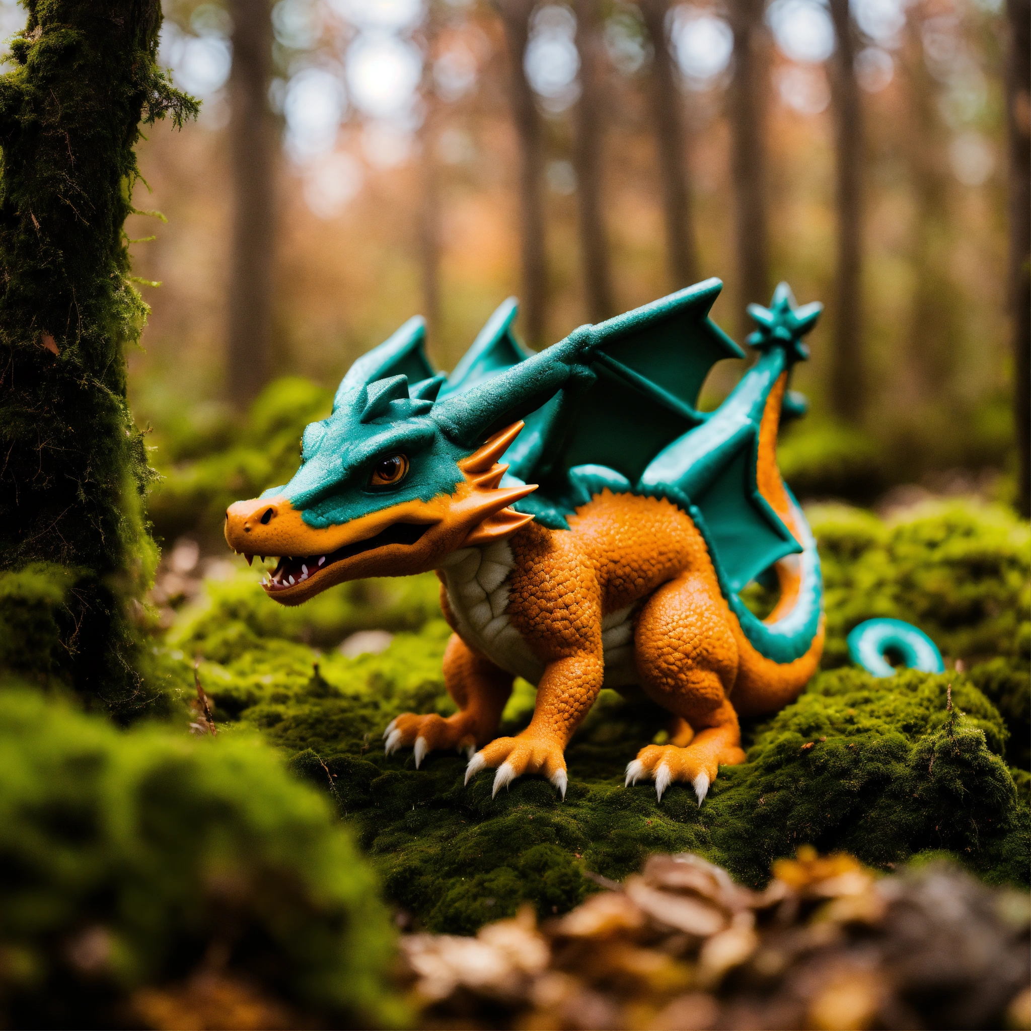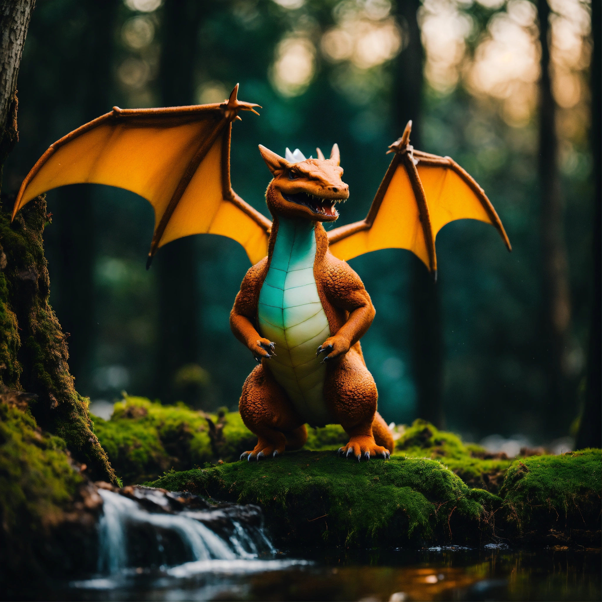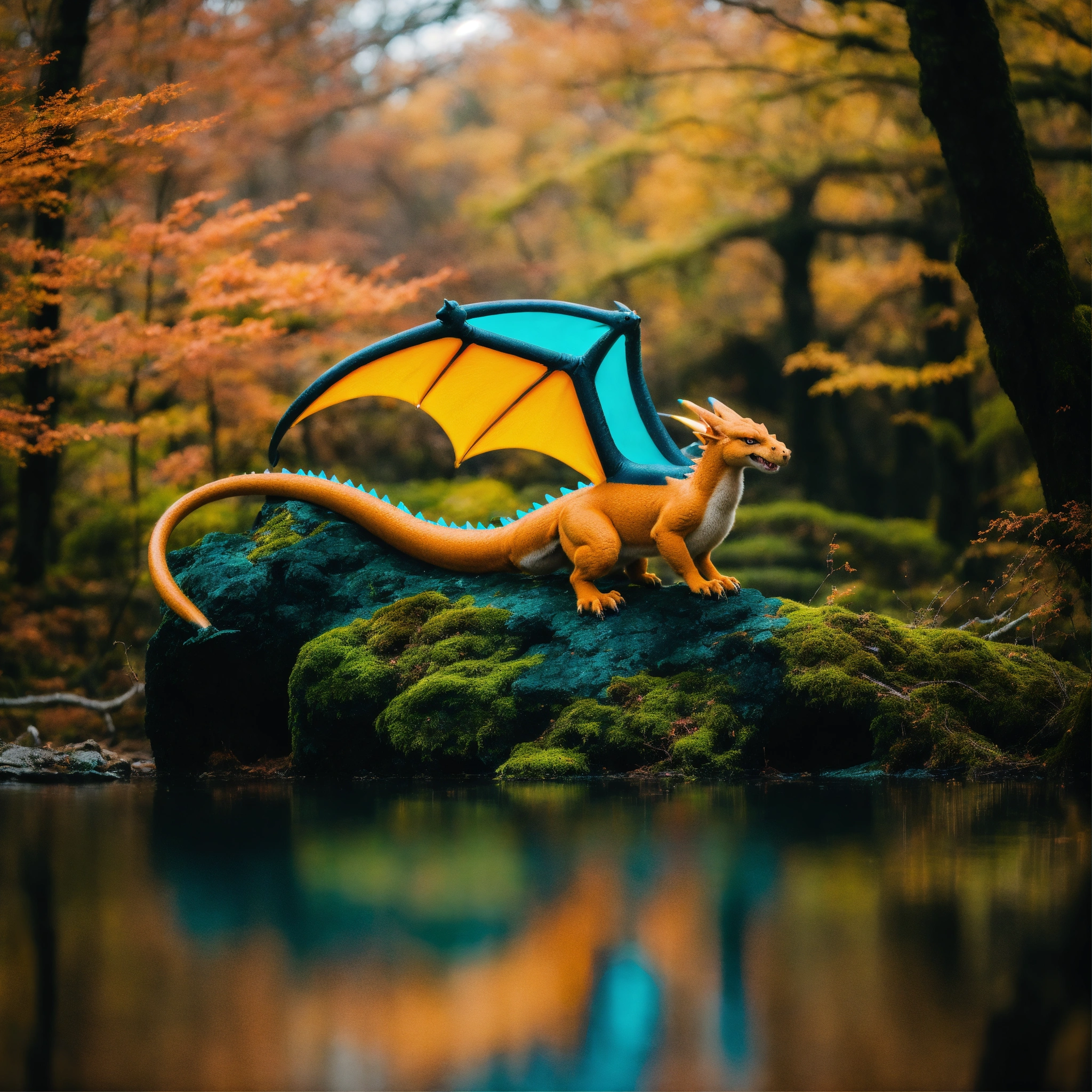 A realistic charizard animal among the trees, forest lake, moss, cold weather, dark teal and amber, sony a7 iv