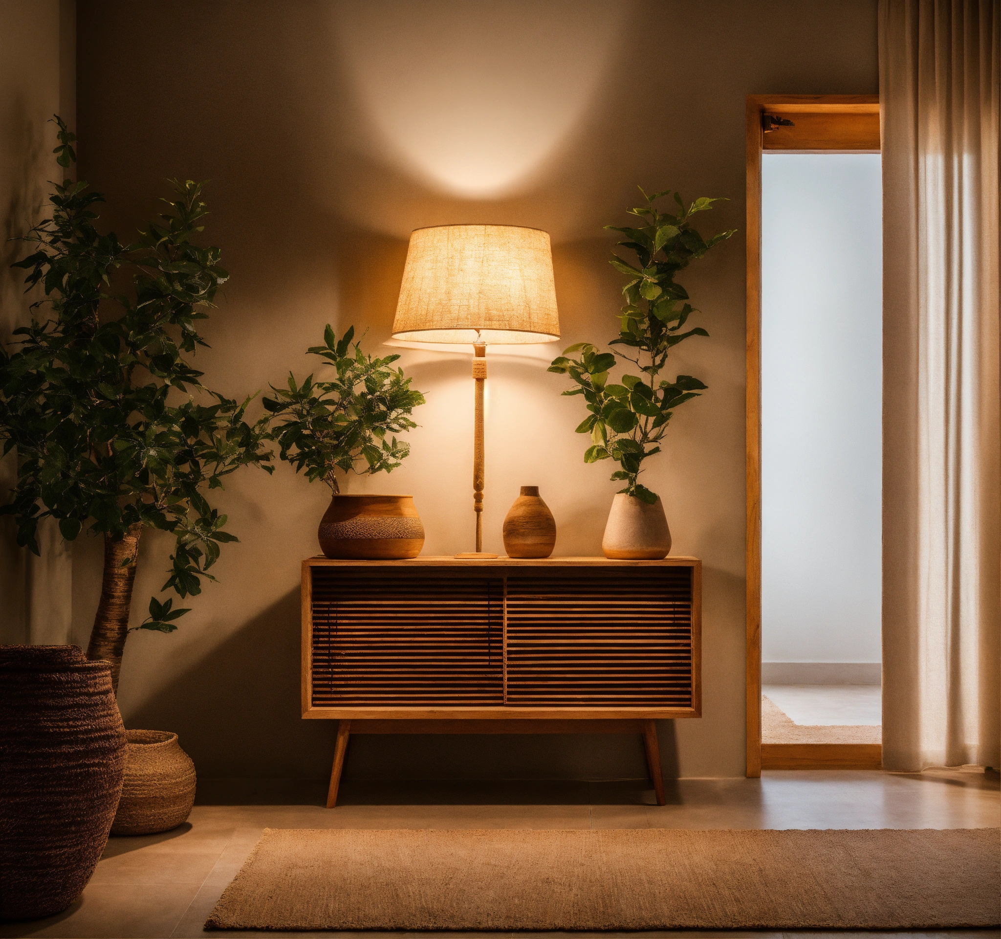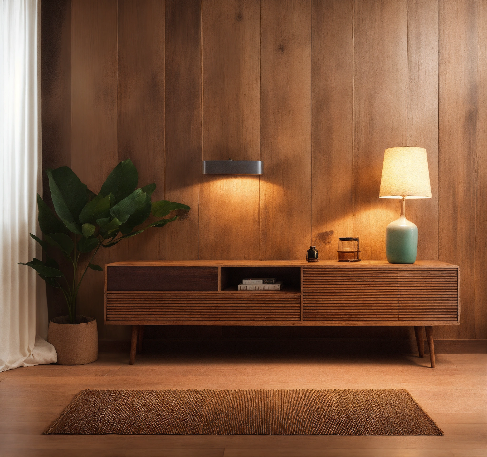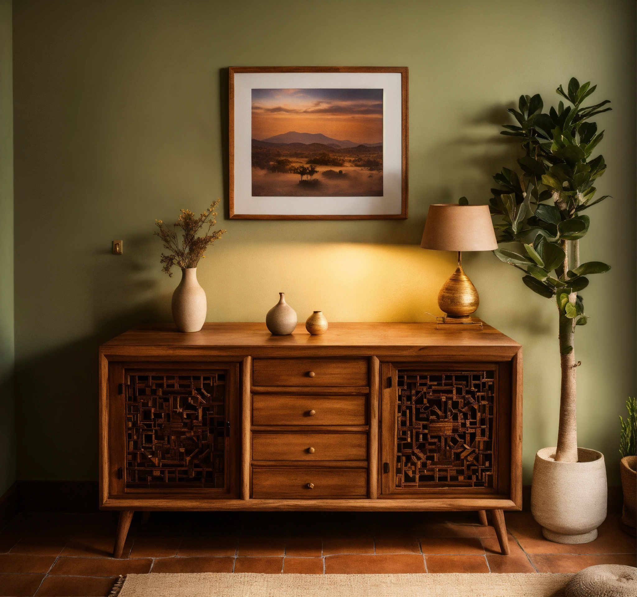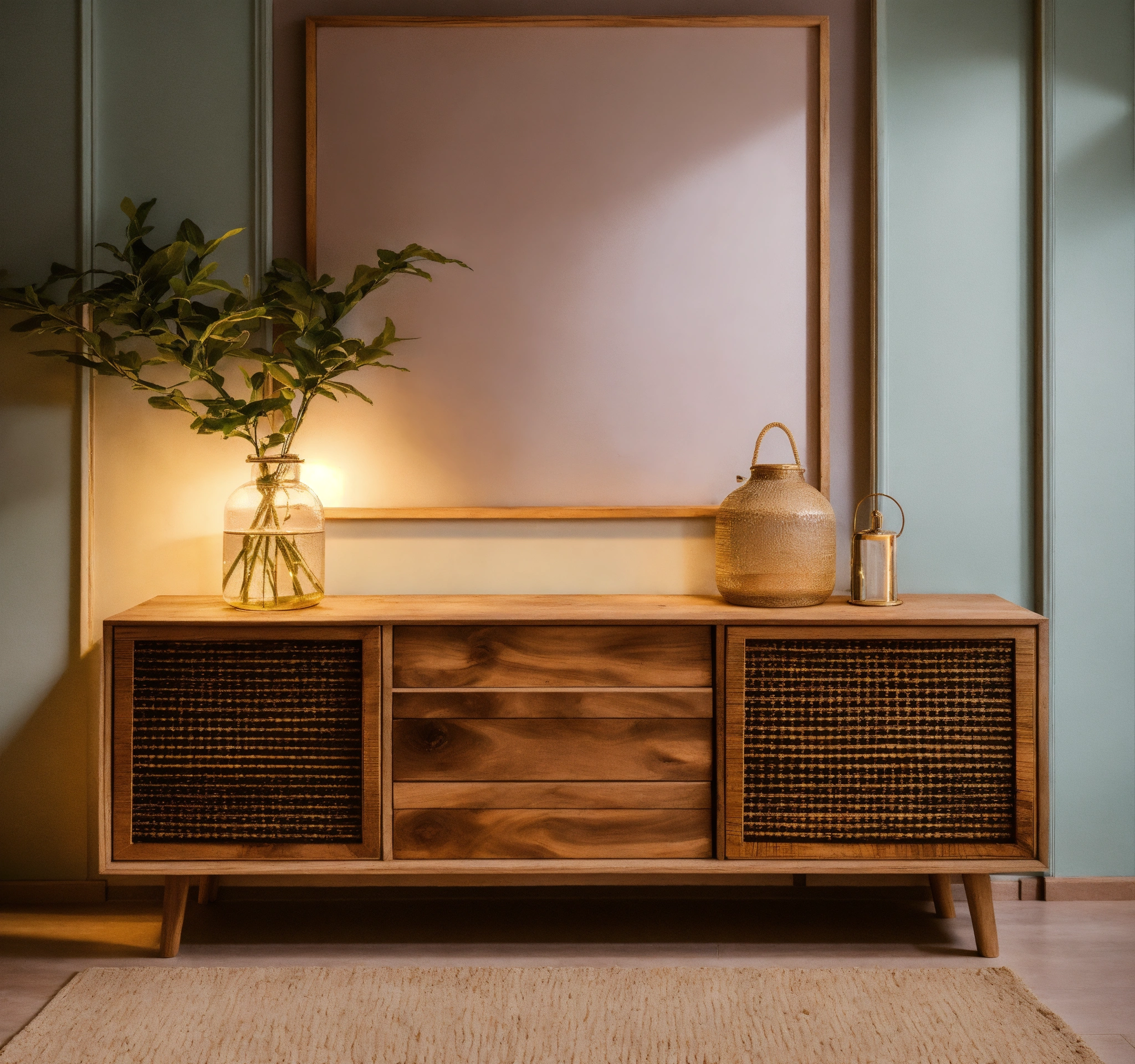 Una imagen tipo fotográfica realista con buena iluminación de un lujoso mueble de madera en primer plano en clouseup con fondo de pared yucateca en una casa de mérida