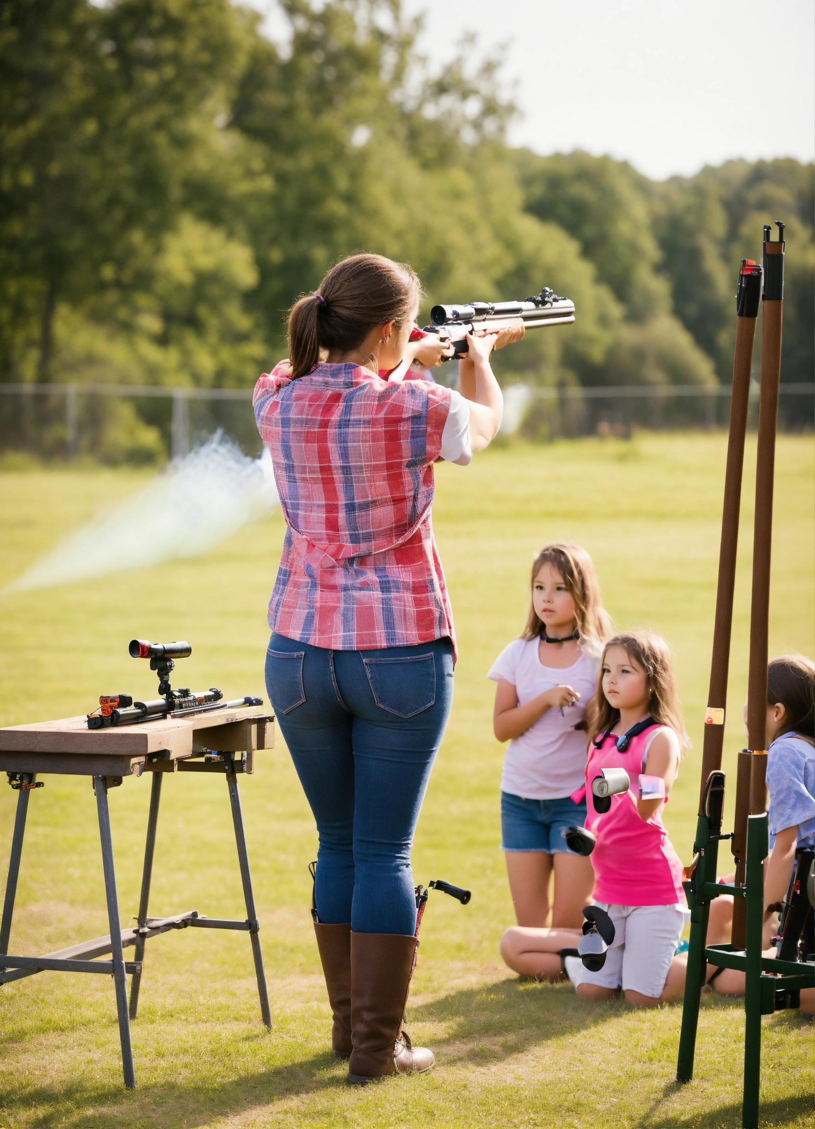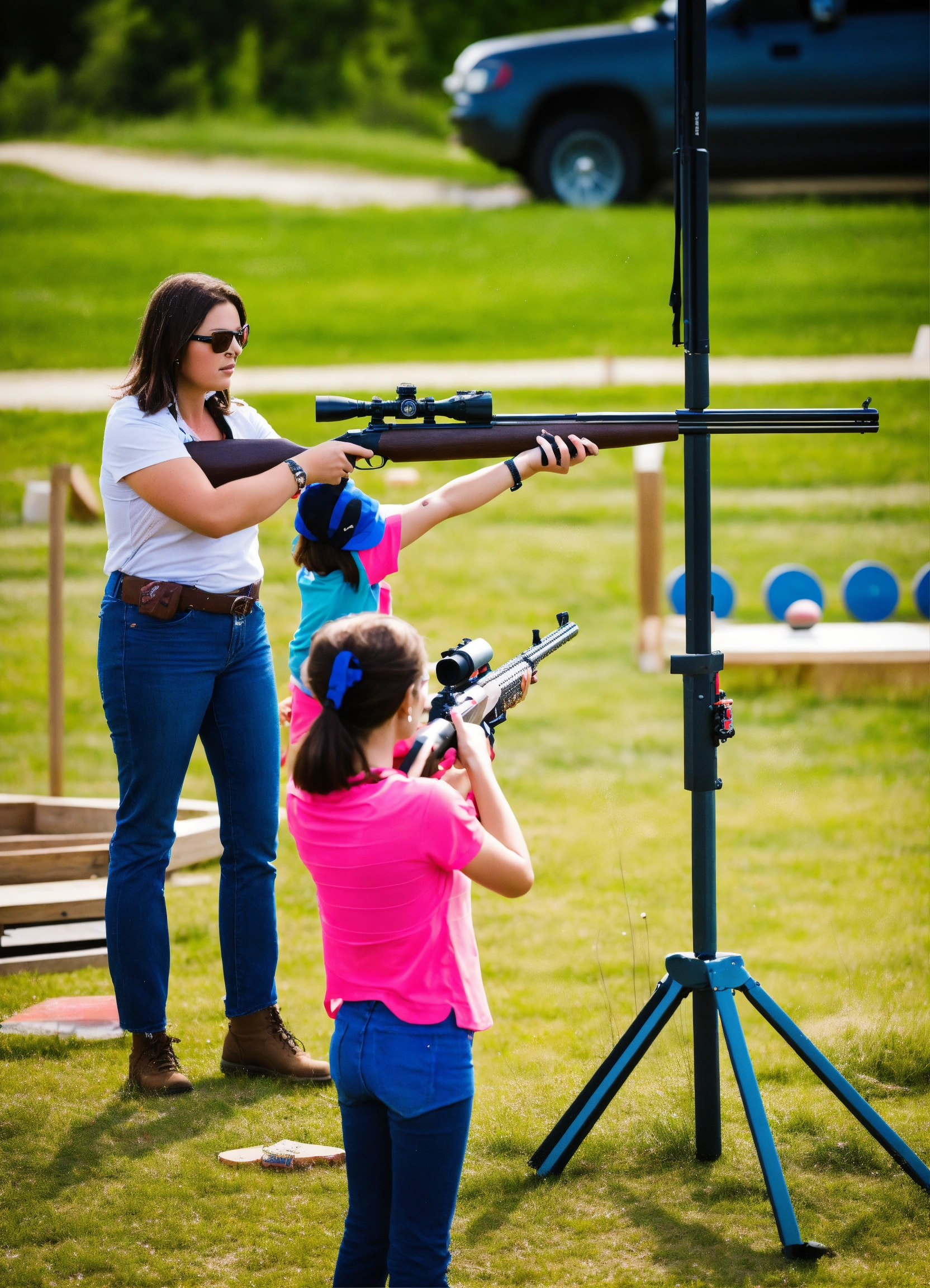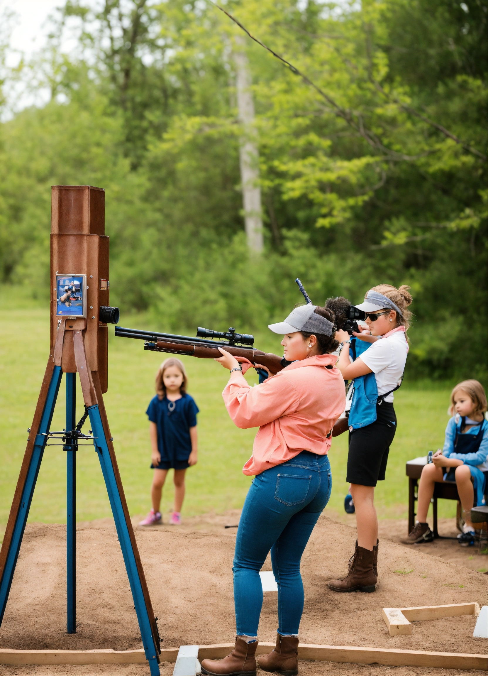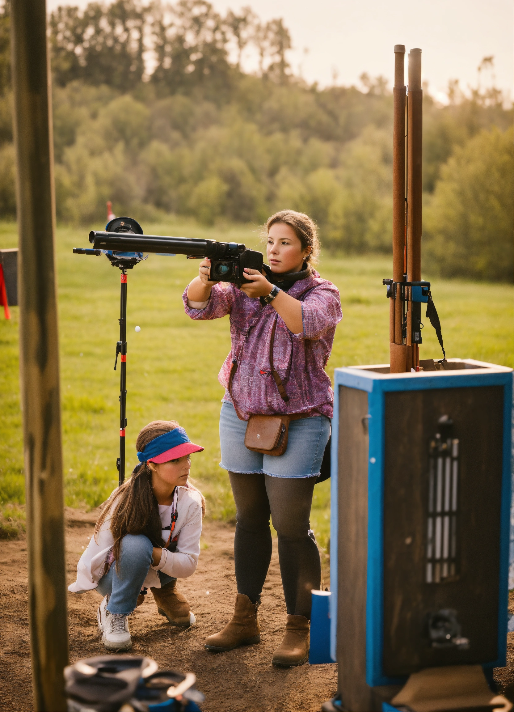 "a brunette woman aiming at clay targets in a skeet shooting range, with a camera hanging around her neck. her three daughters aged 5, 10, and 20 stand beside her."