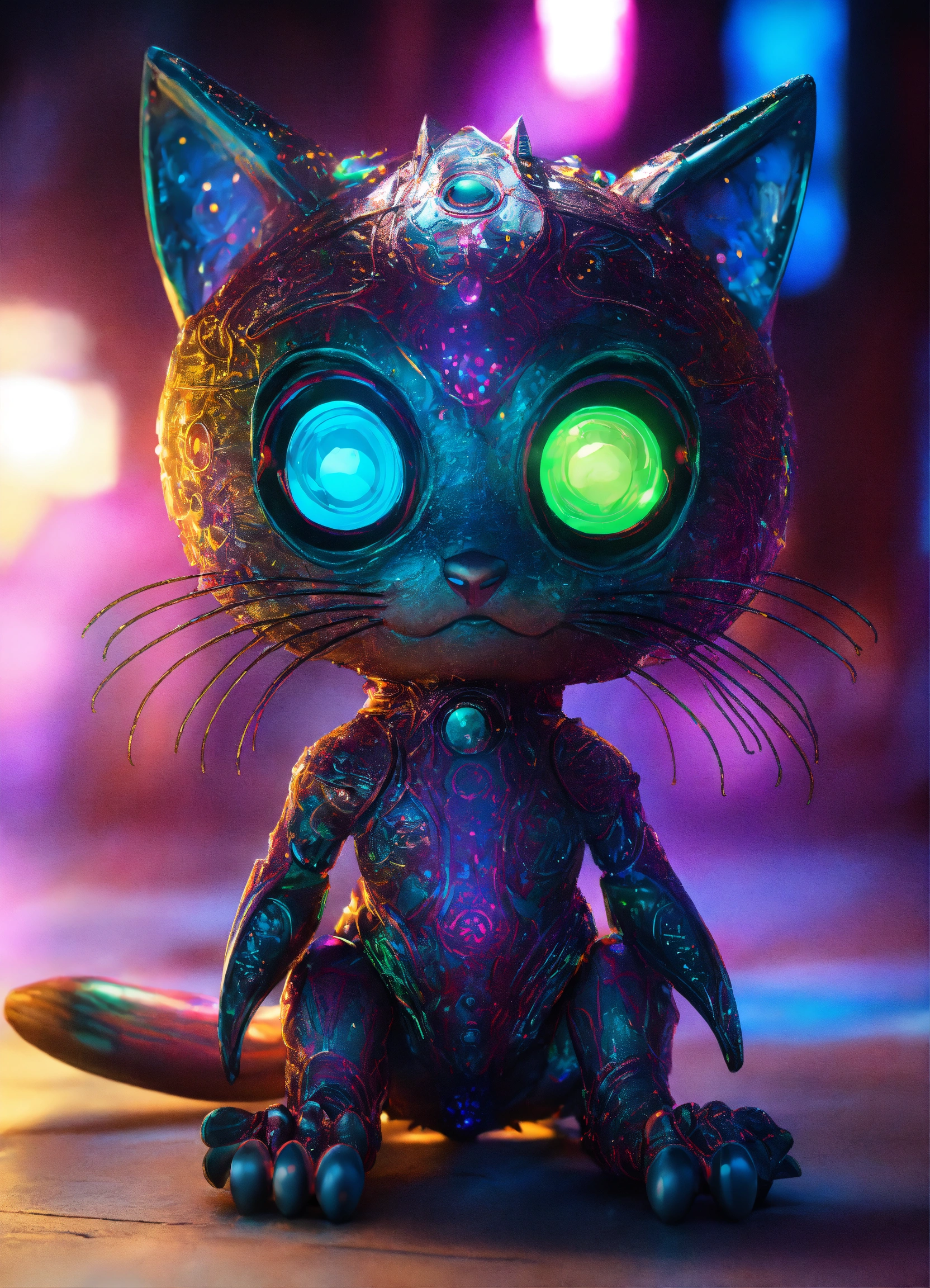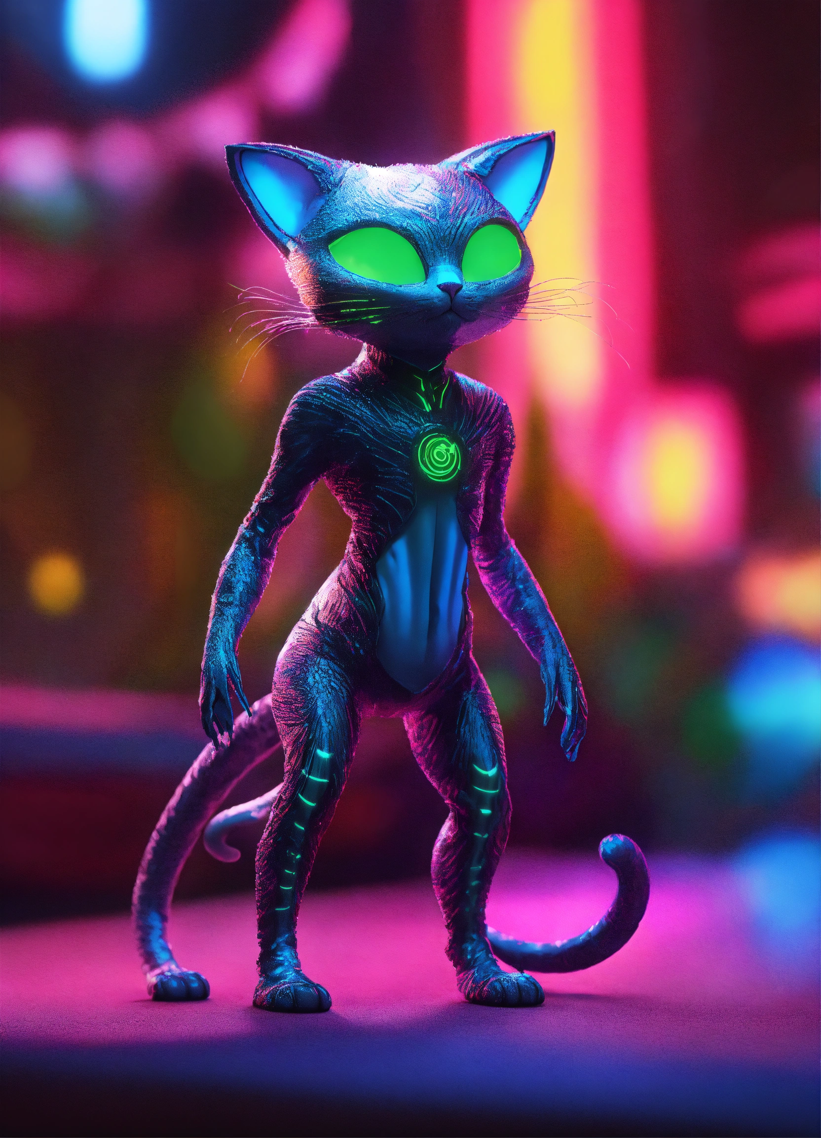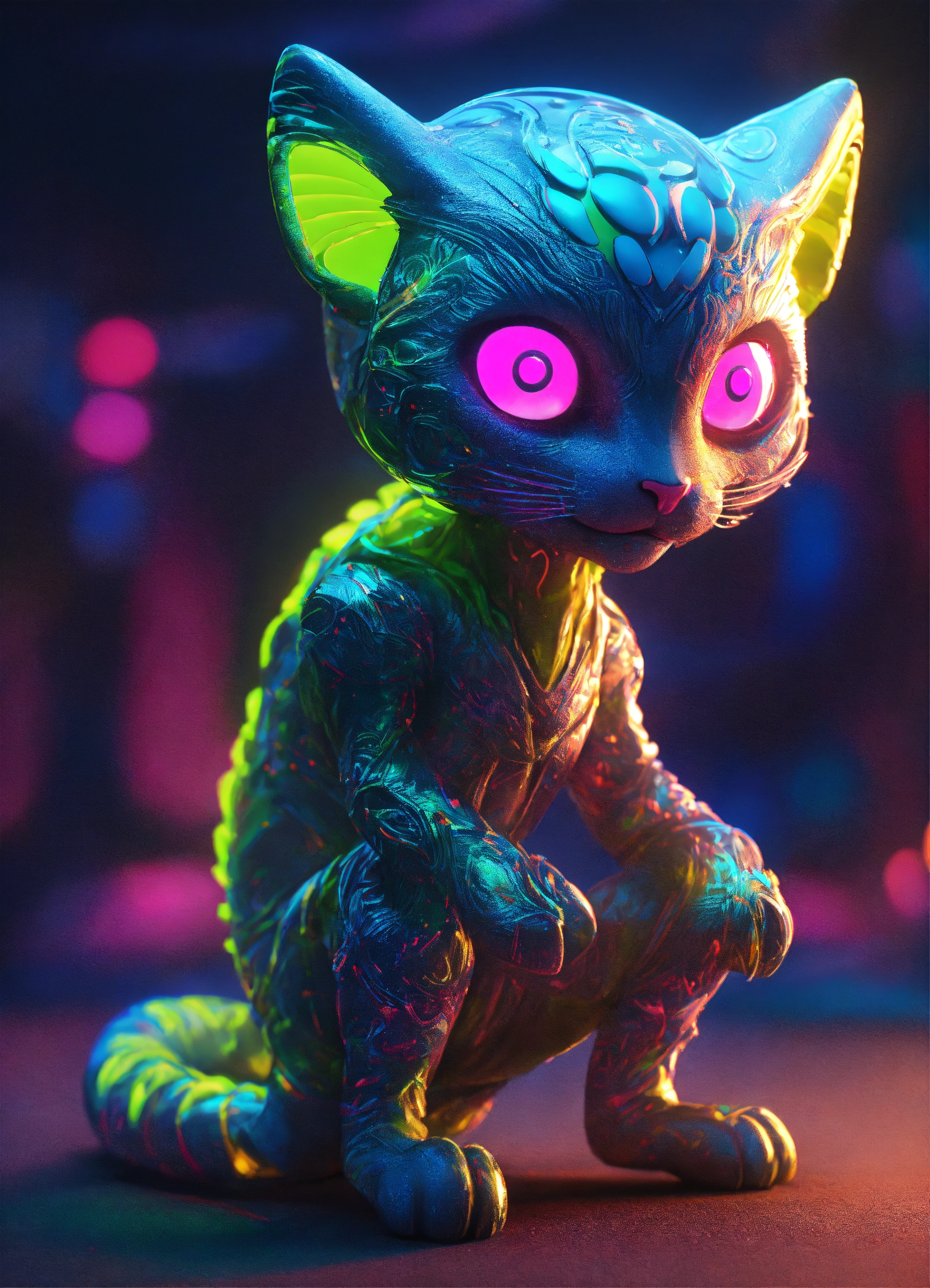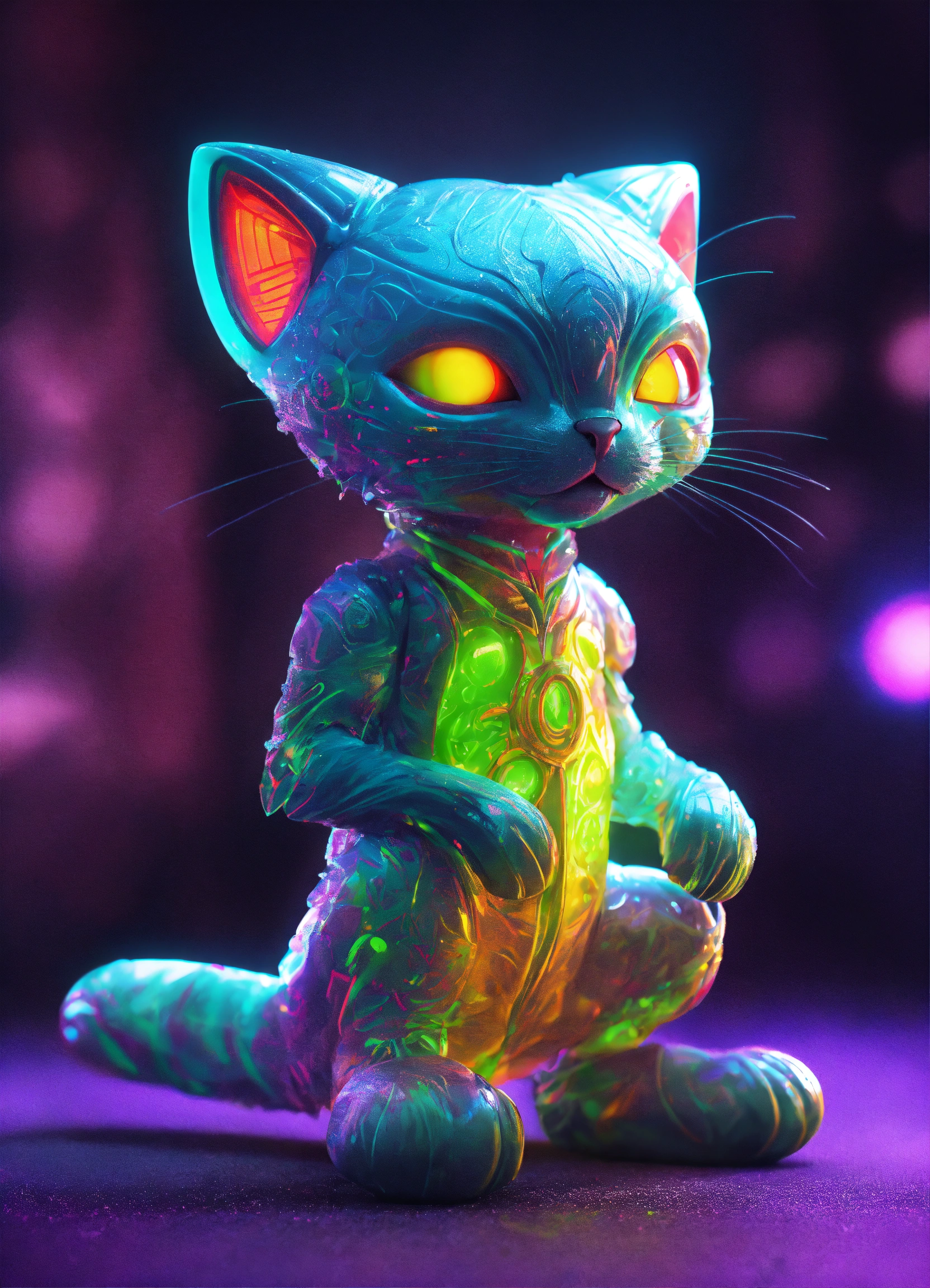 Gelly cute adorable alien monster, full-body, neon glow colours, highly intricate details, 3d, cgi, realistic light, popular on deviantart, glowing eyes, facing camera, neon details, ultra realistic details, portrait, sci fi atmosphere, global illumination, shadows, octane render, 8 k, ultra sharp, cat attributes, smooth skin, friendly, luxury toy, slick skin, cat tail, yoga asana