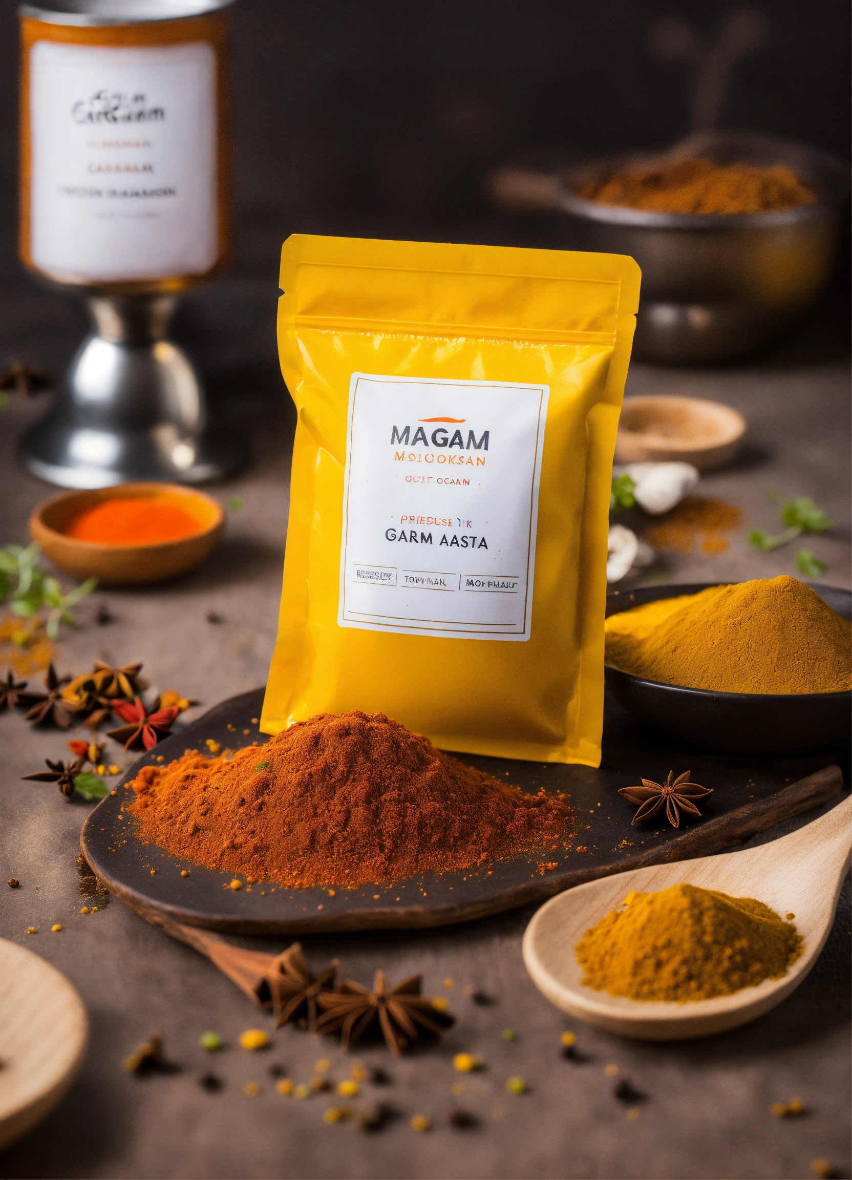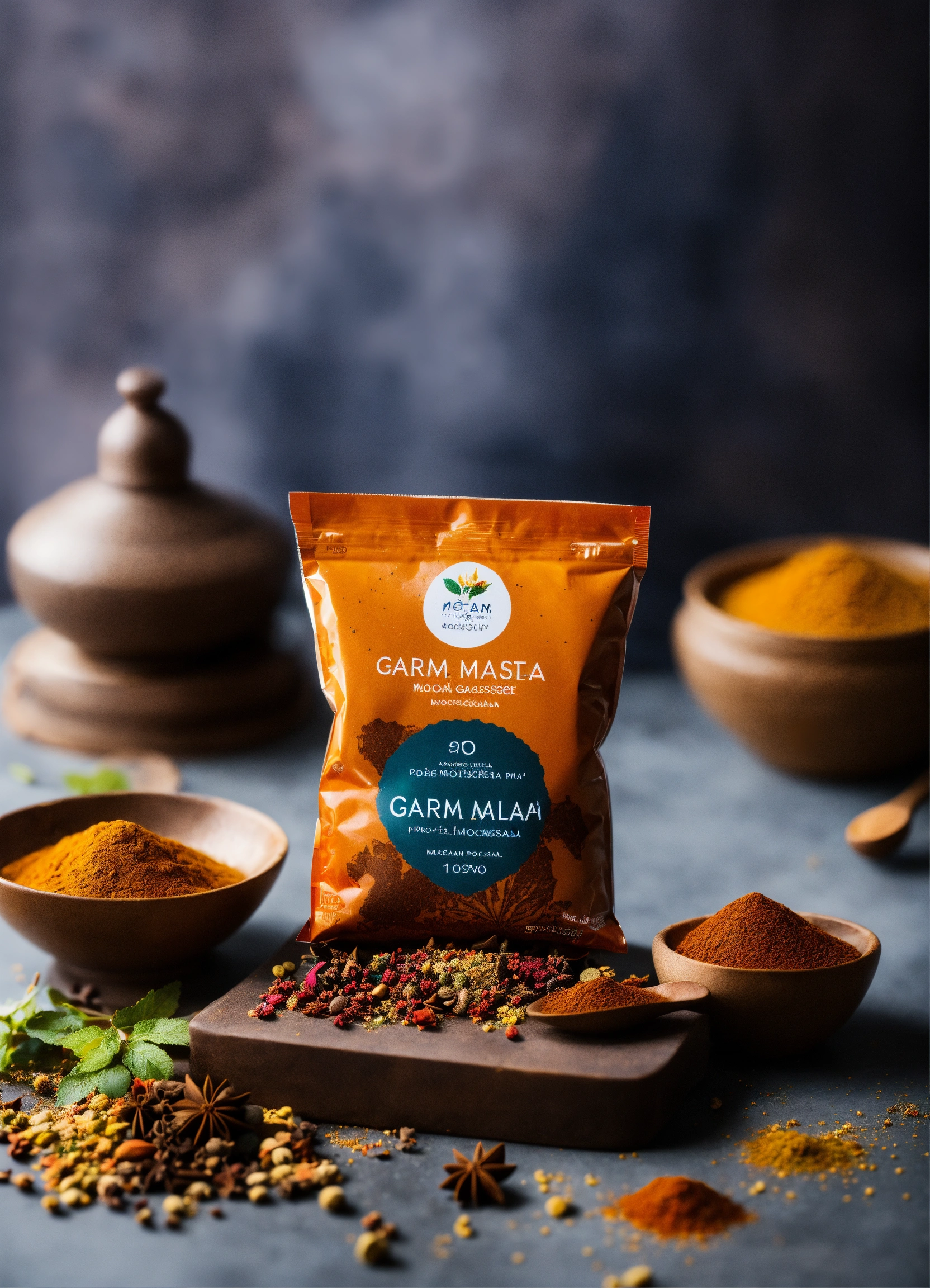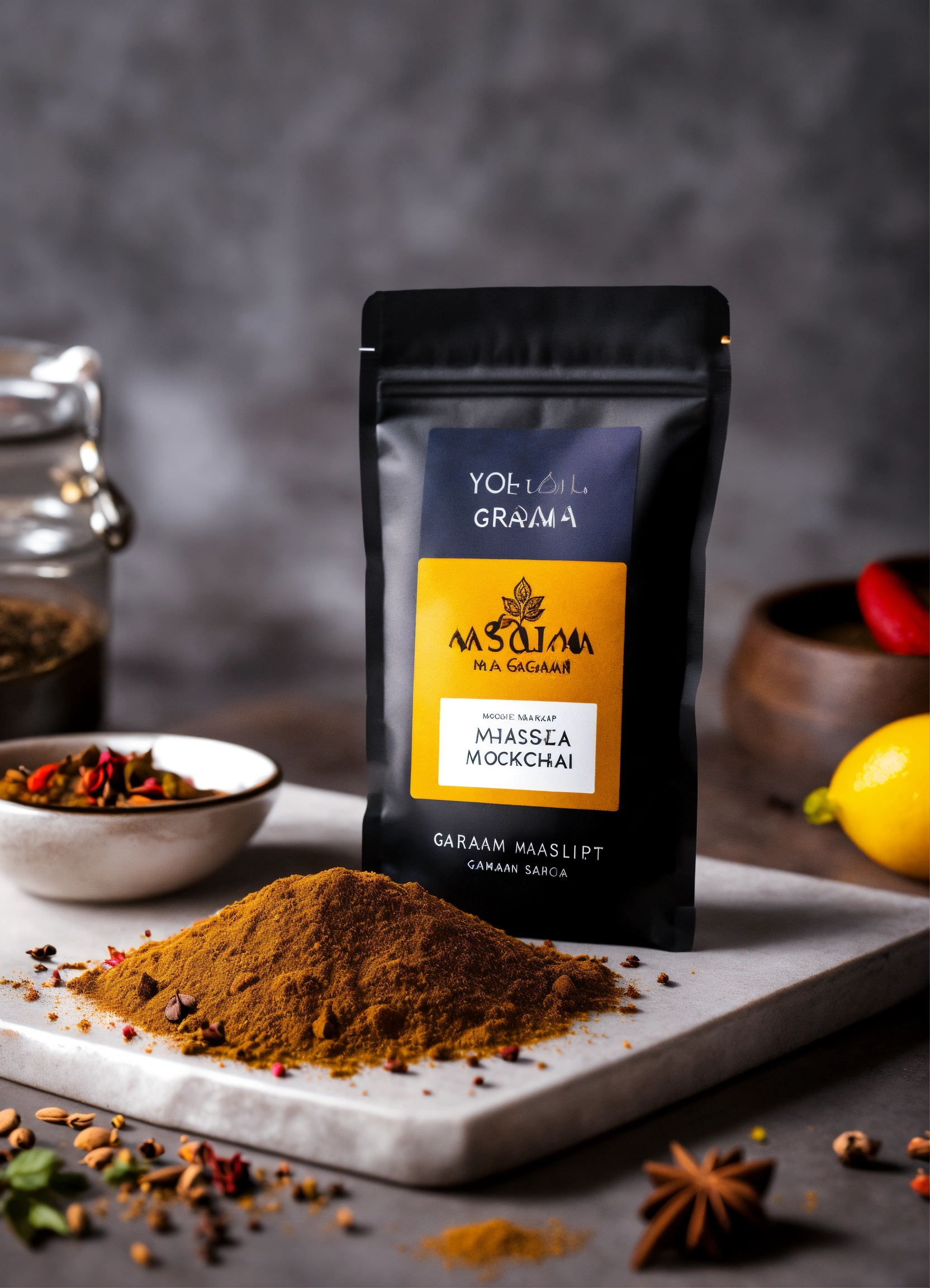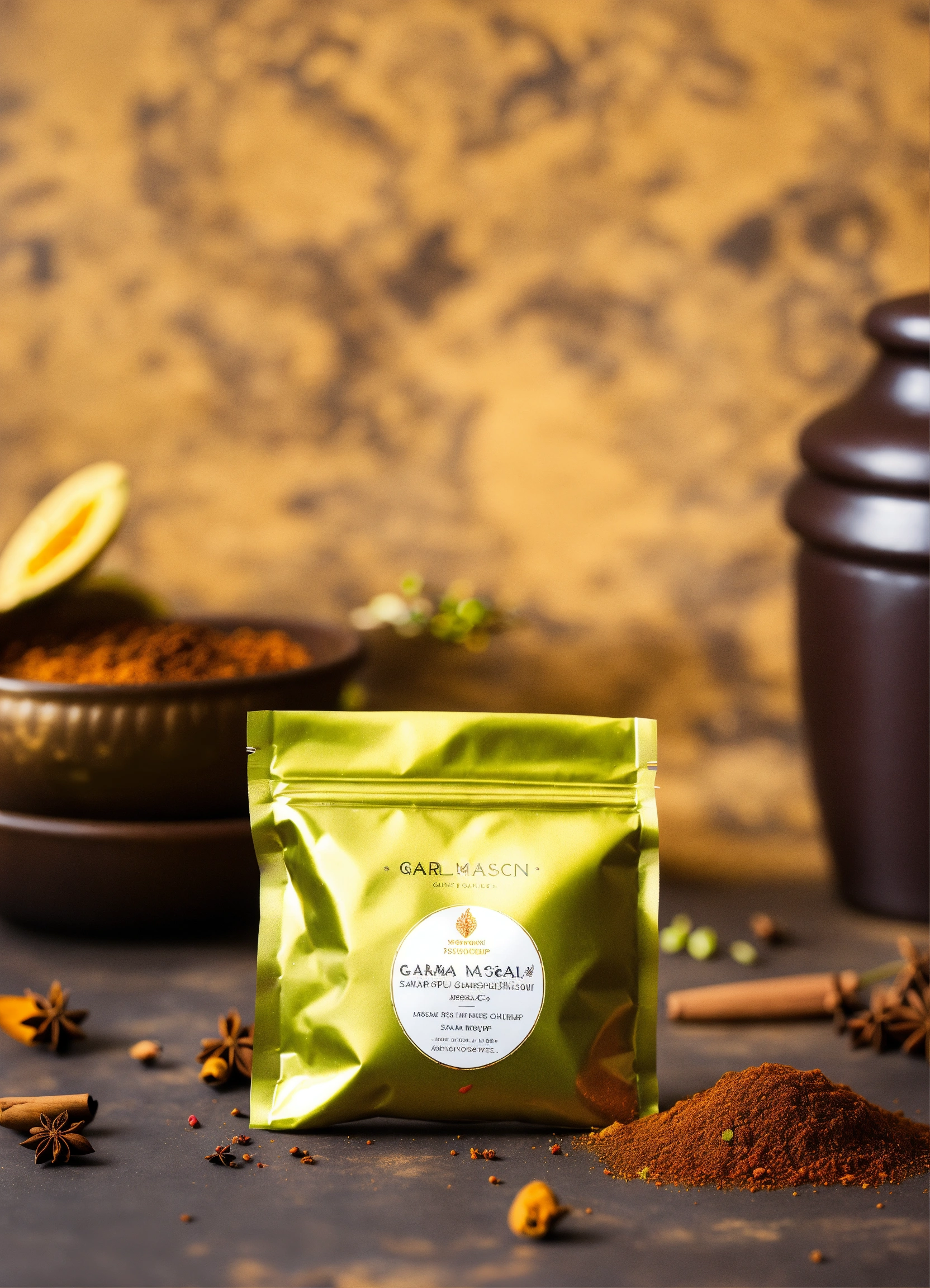 Modern product photography of a garam masala mockup sachet during a photo shoot session