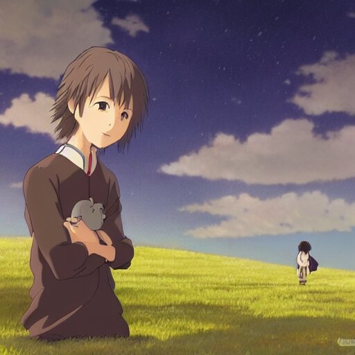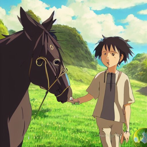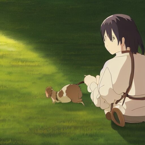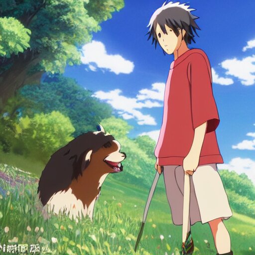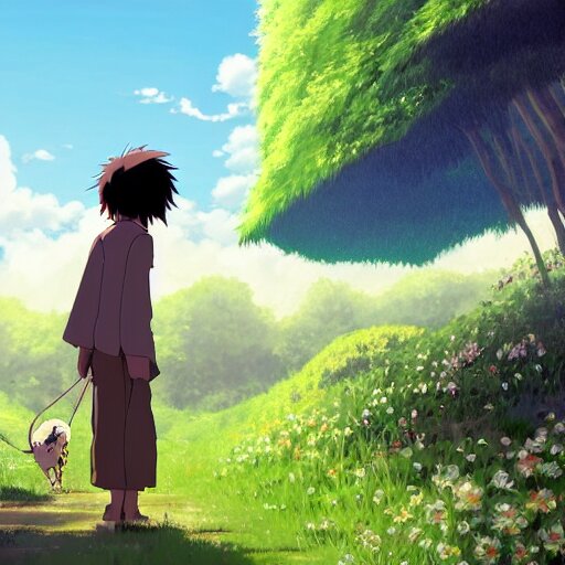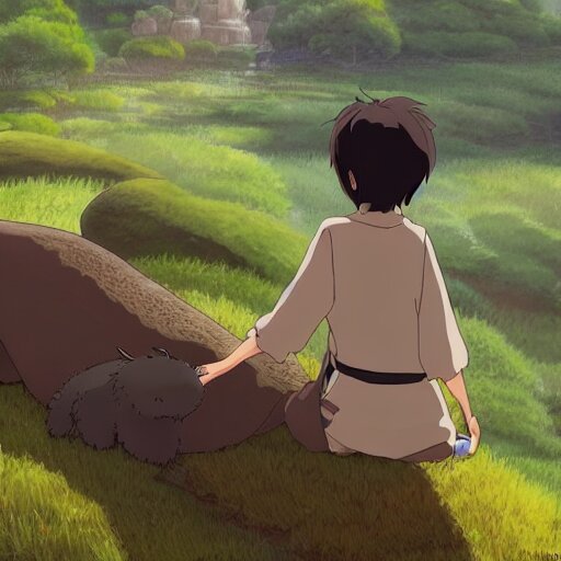 Friendly guy and a pet in the spitited away style, 4k art, high detail, smooth, anime beautiful scene, detailed face, studio ghibli, sharp focus
