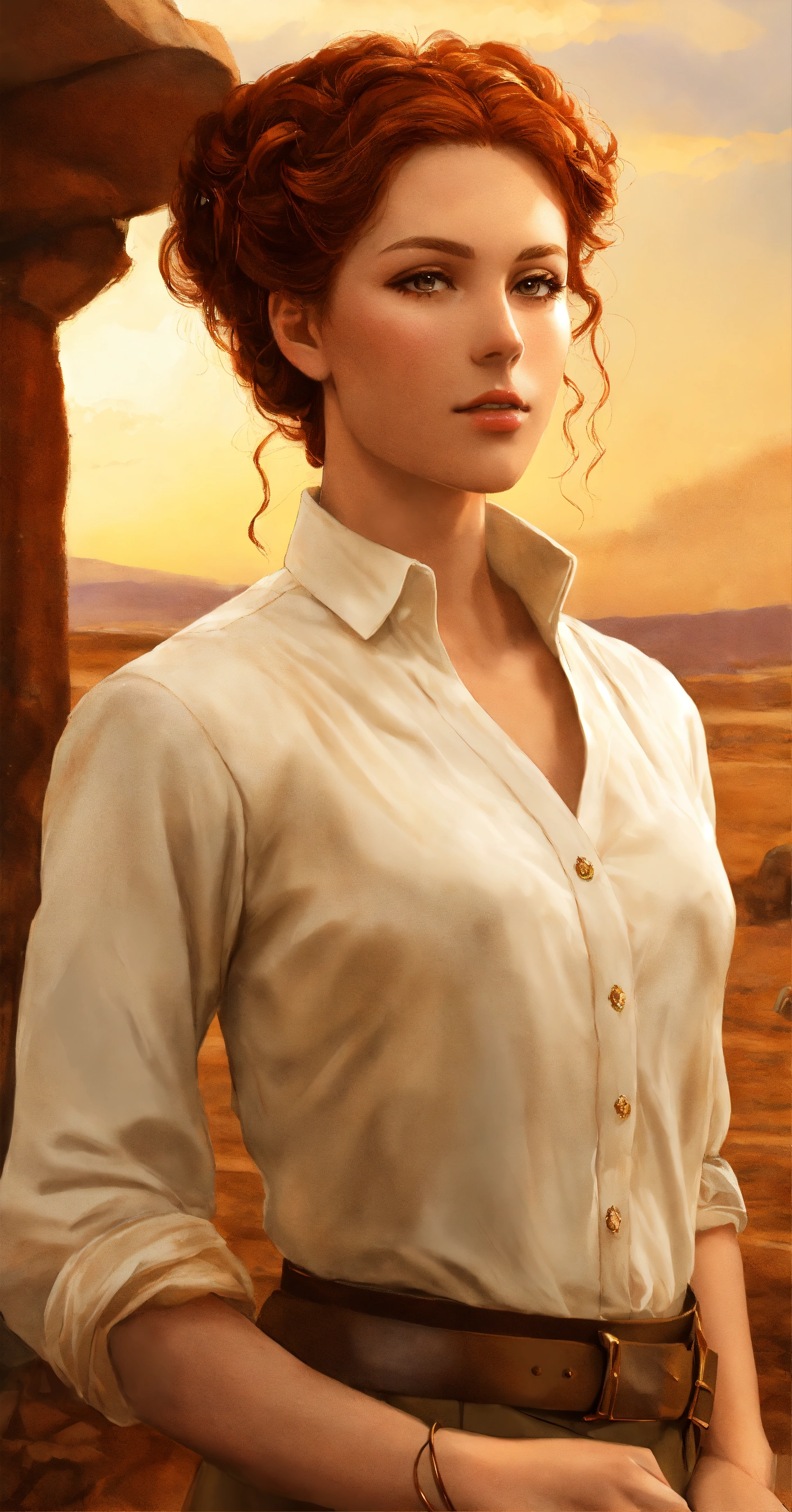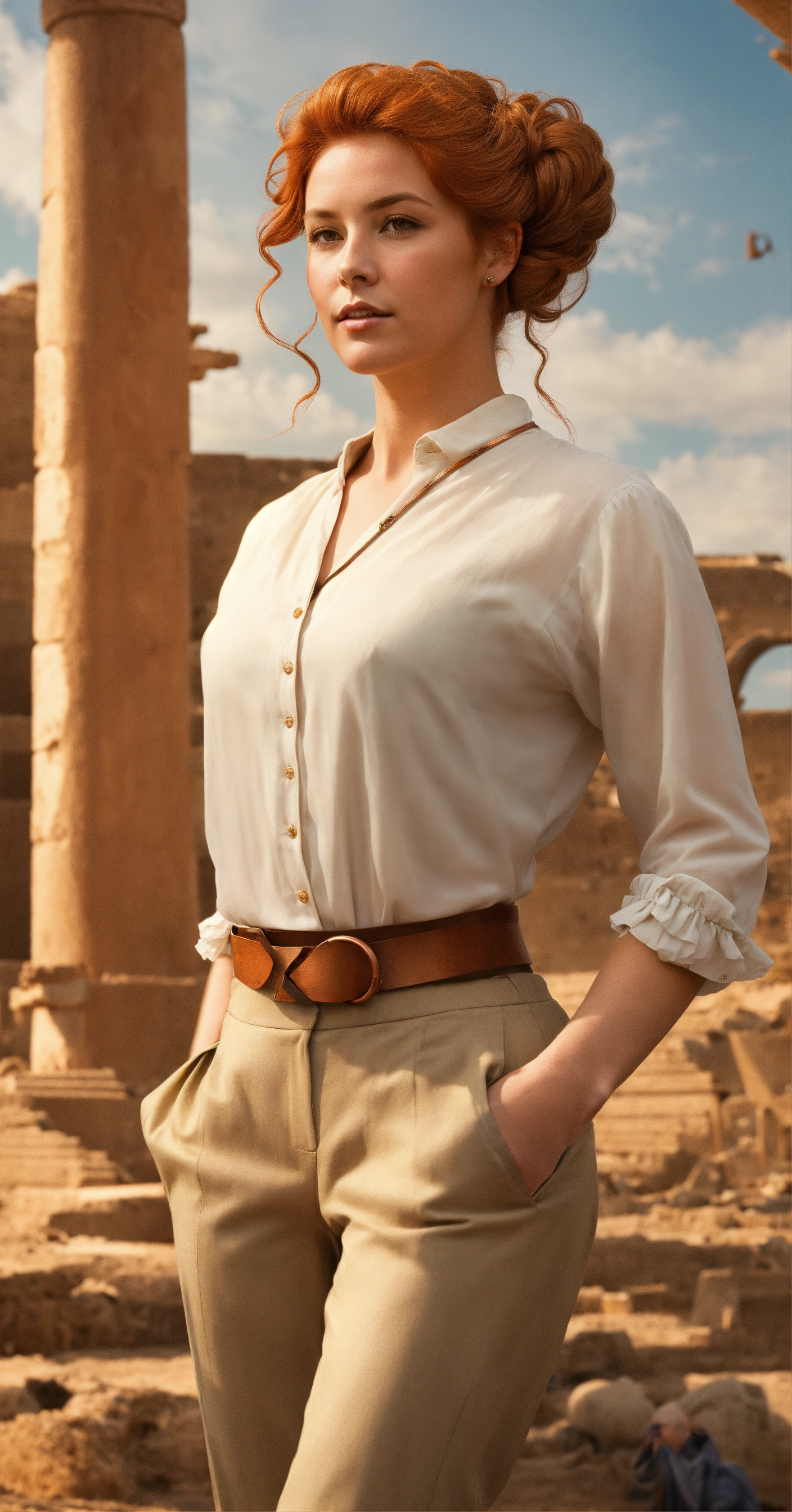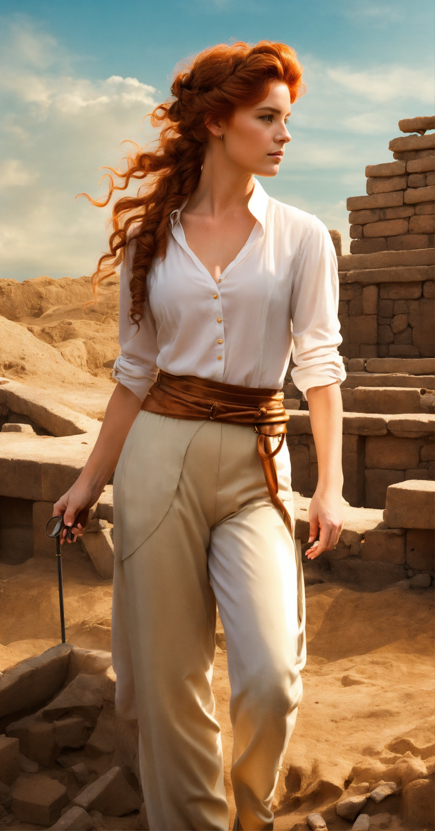 Digital art action pose portrait of a beautiful, wealthy british noblewoman with ringlet copper hair in an updo. she is wearing a low white blouse, and tan pants, at an archaeological dig site.