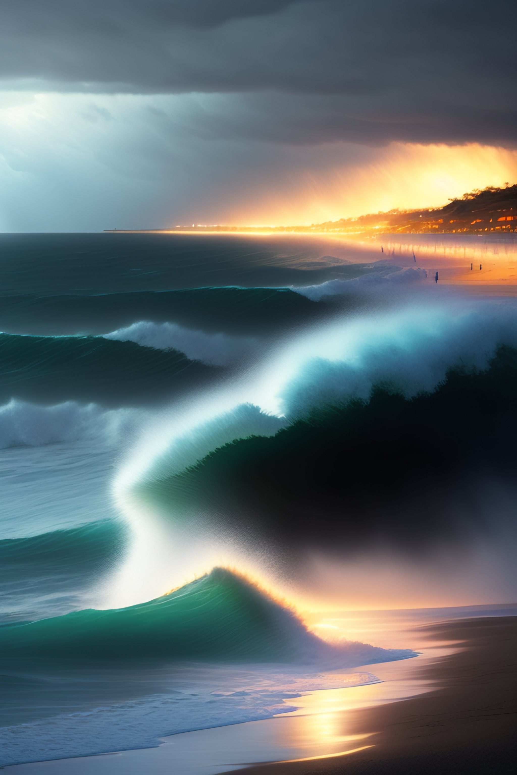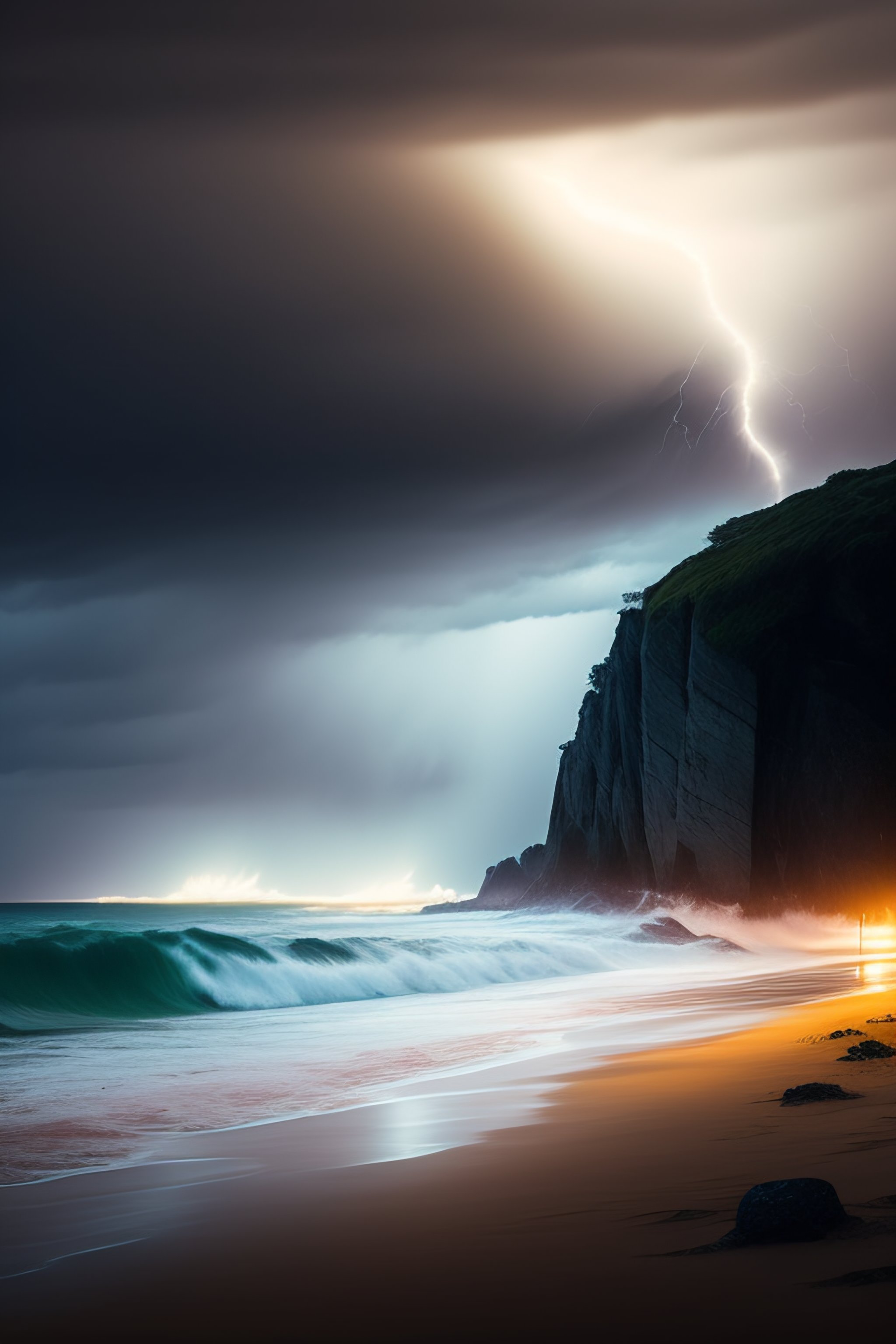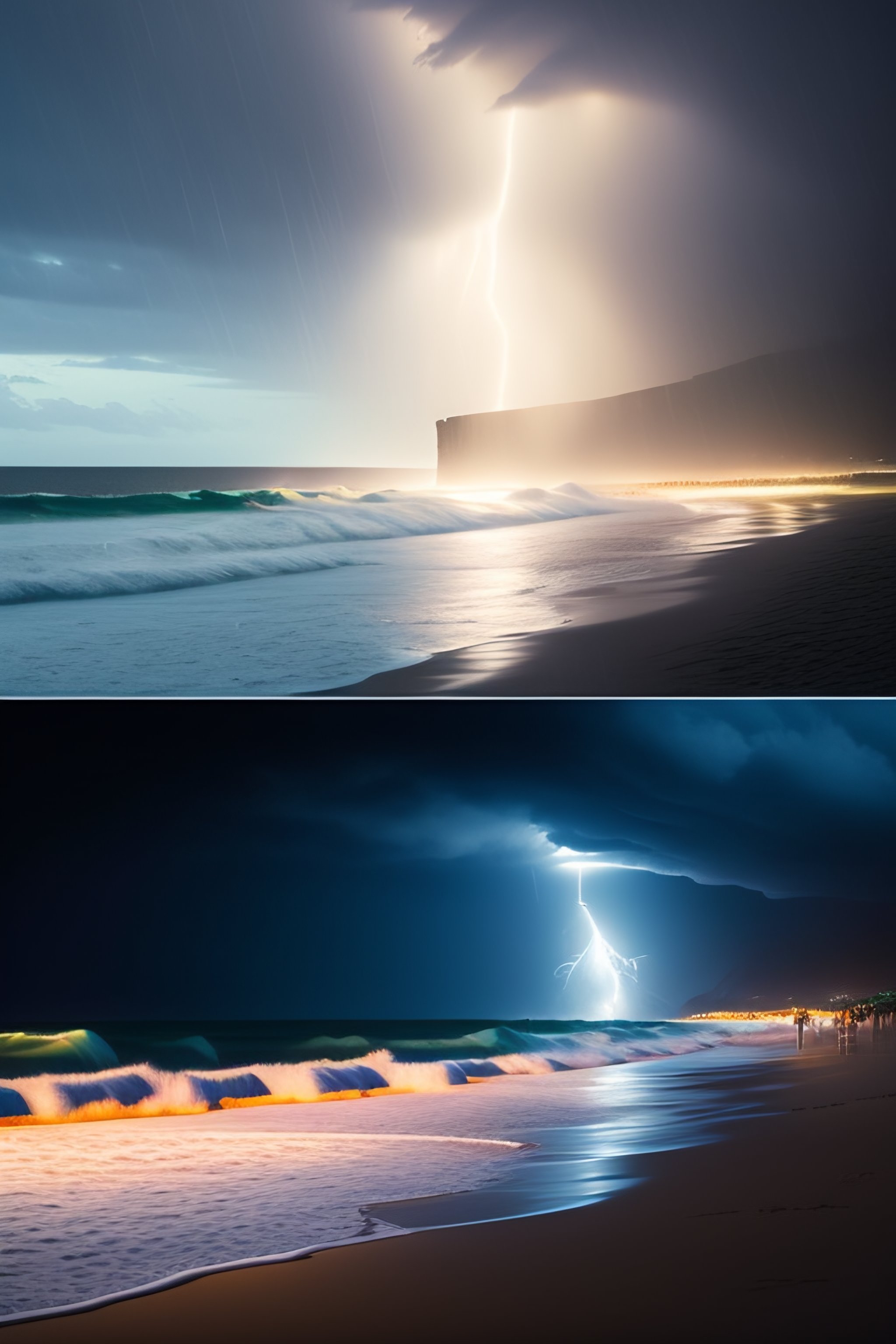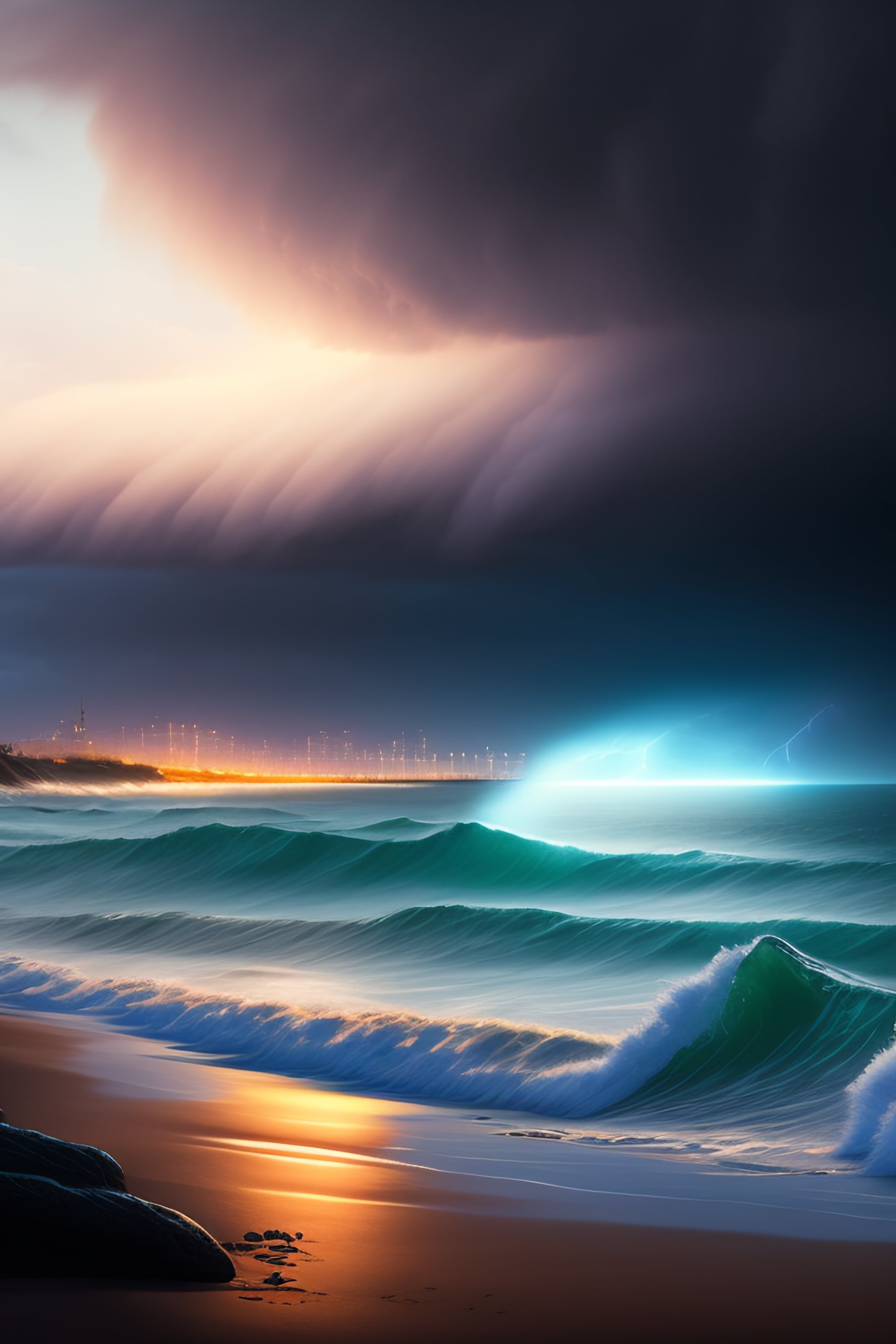 A sea storm with flash of lighting on beach near a city with night lights, greg rutkowski, ultra detailed