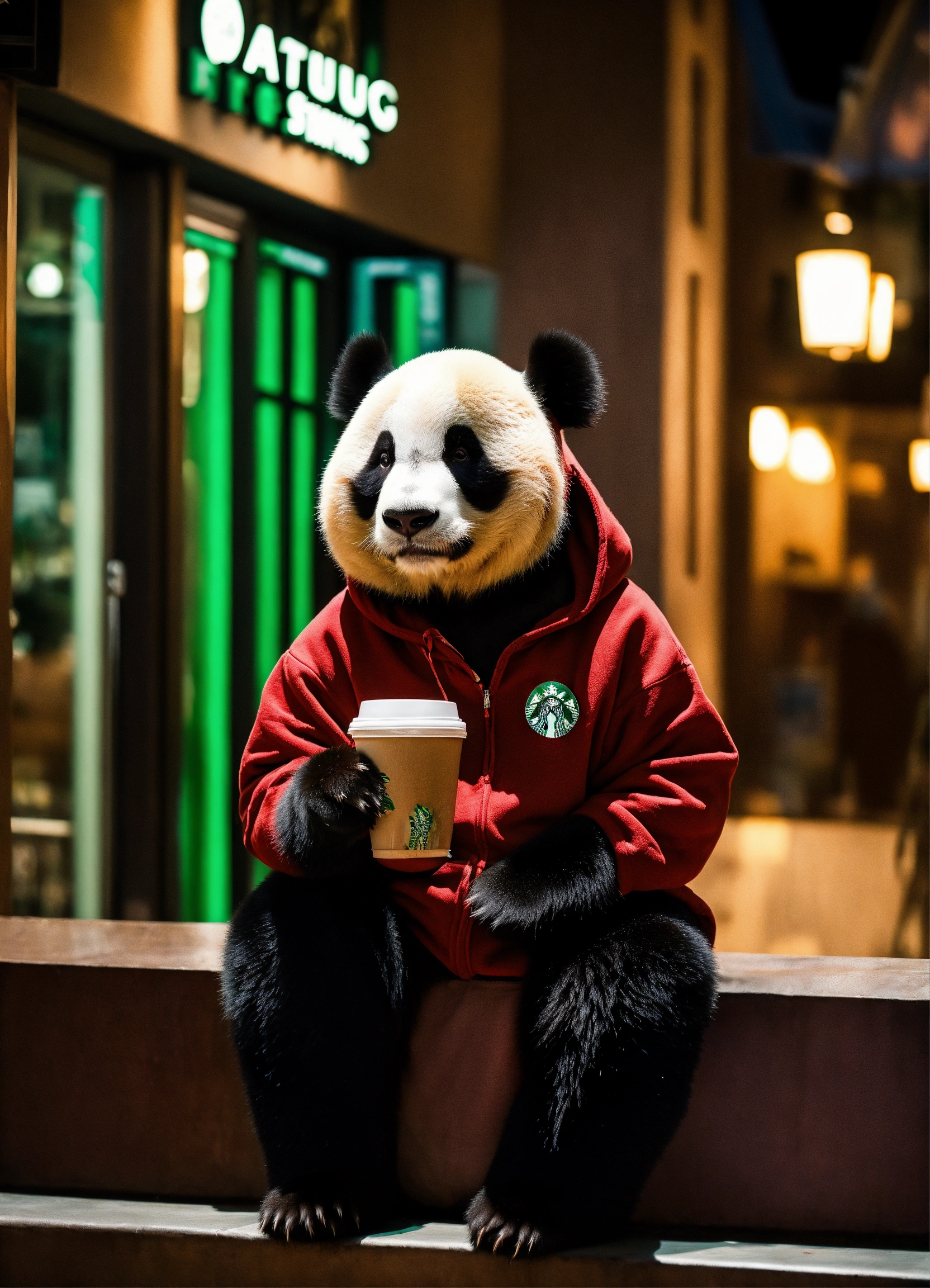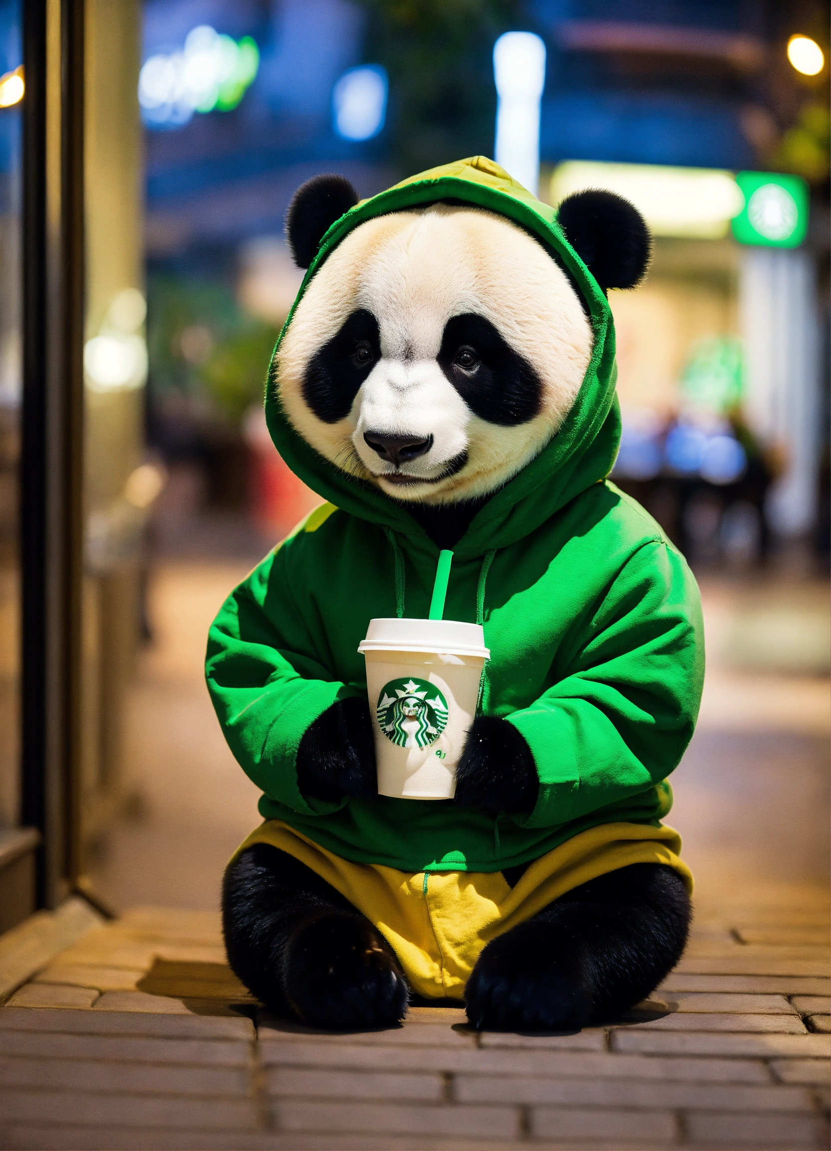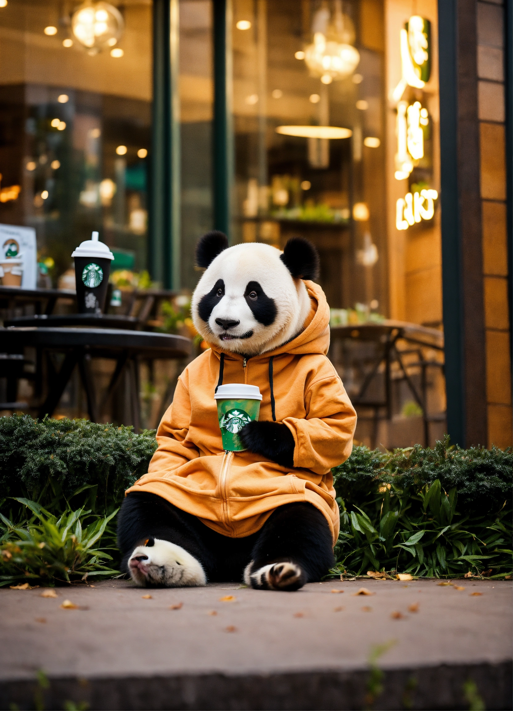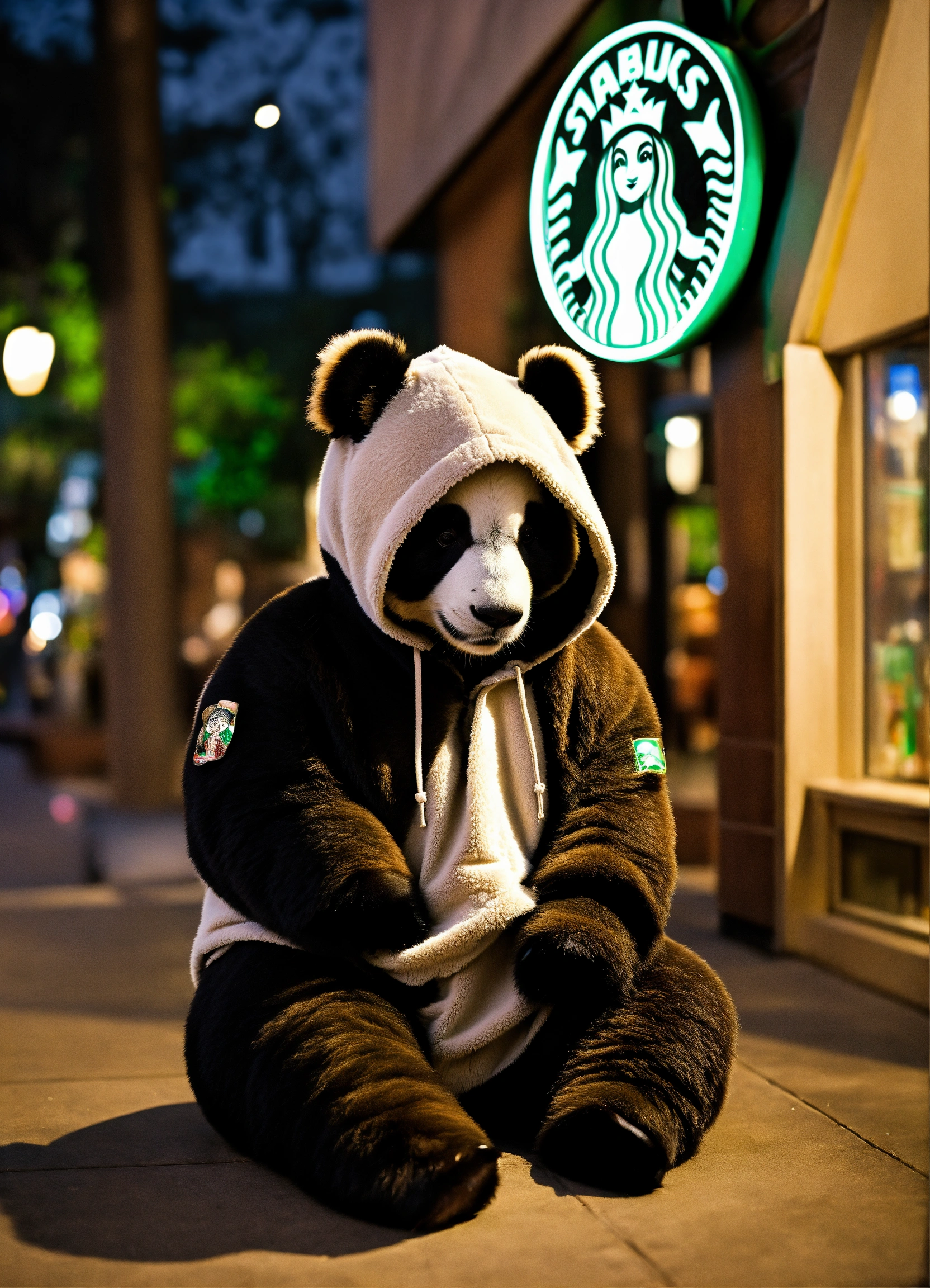 A sweet panda is wearing a hoddie in front of a starbucks