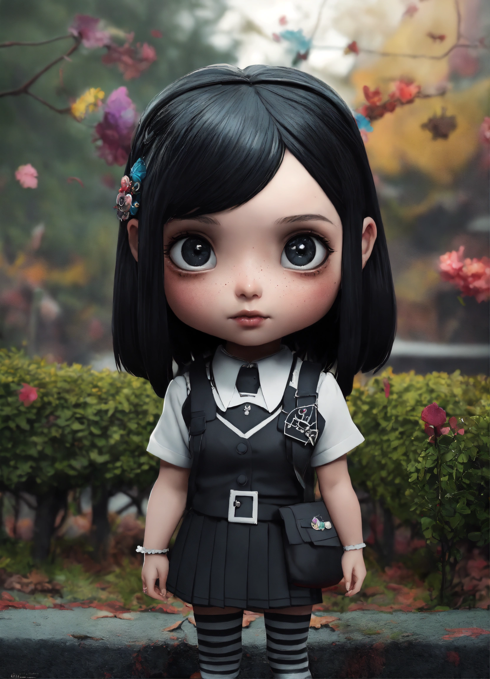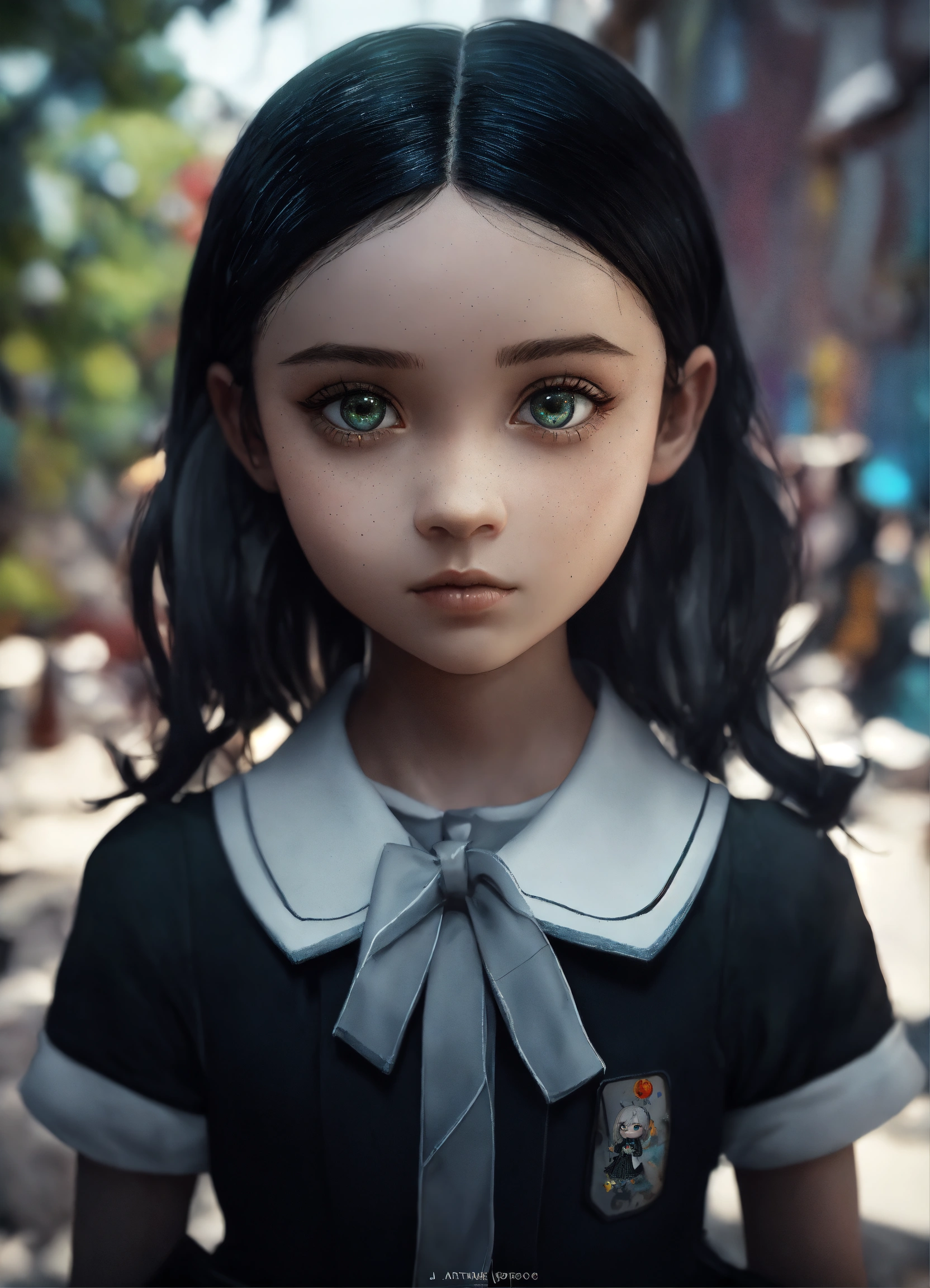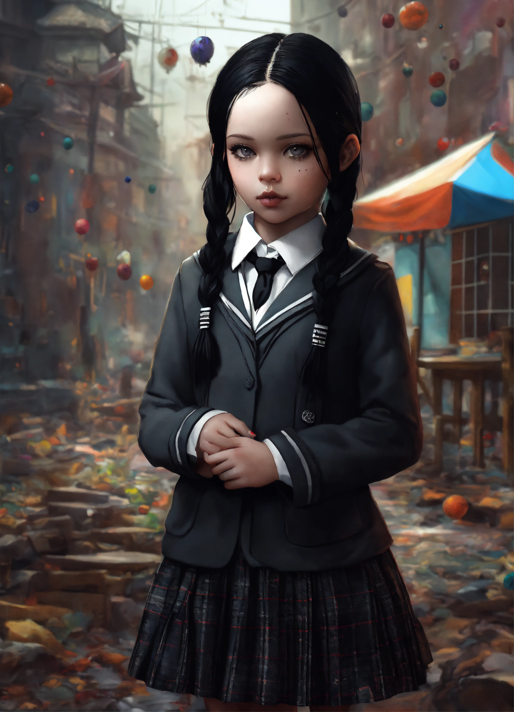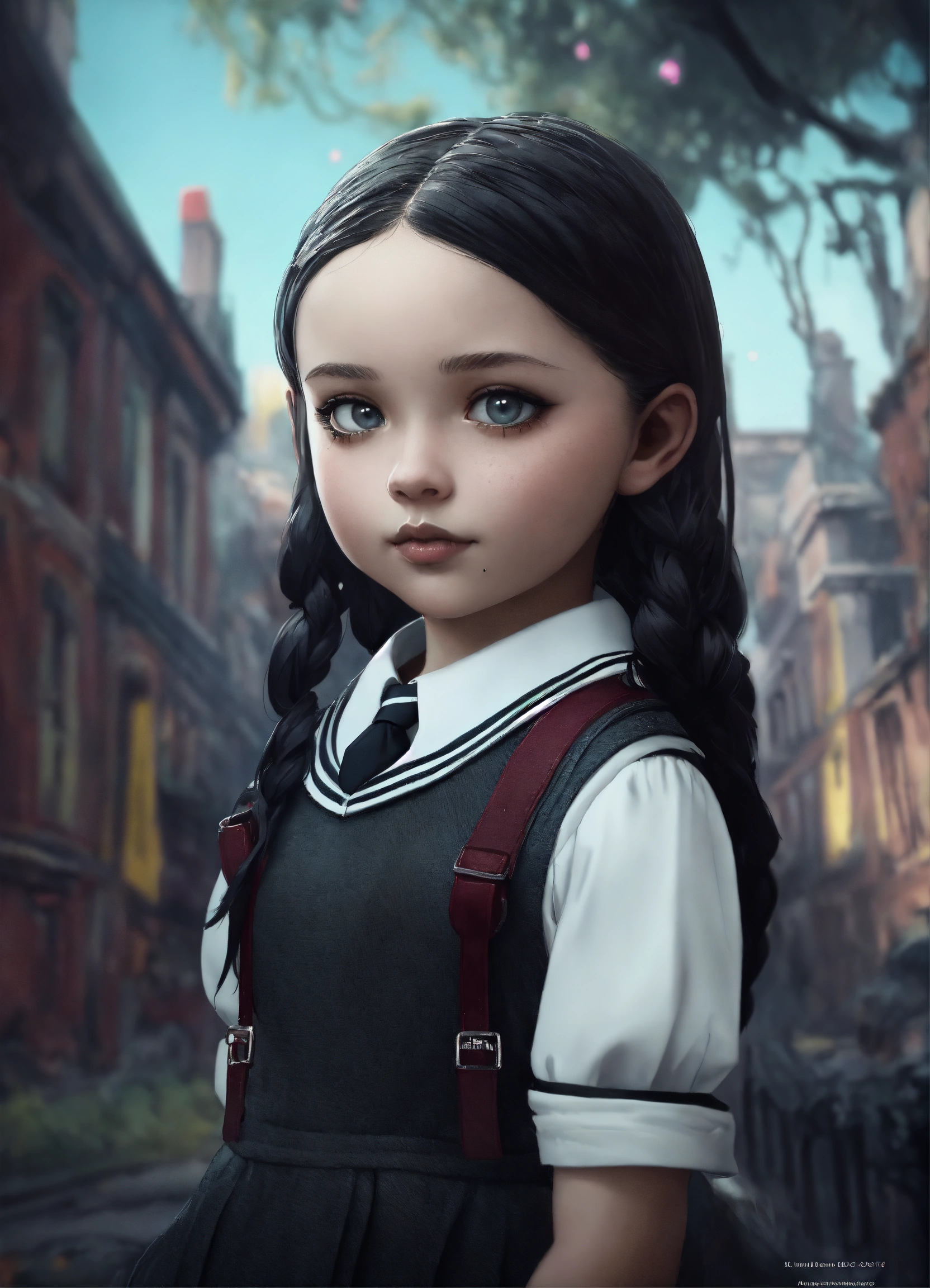 Epic greyscale portrait "adorable chibi wednesday addams in school uniform", colourful schoolyard, epic, breathtaking fantasycore artwork by android jones, jean baptiste monge, alberto seveso, erin hanson, jeremy mann. intricate photography, a masterpiece, 64k resolution artstation, unreal engine 5, cgsociety, octane, perfect compostion, epic natural lighting
