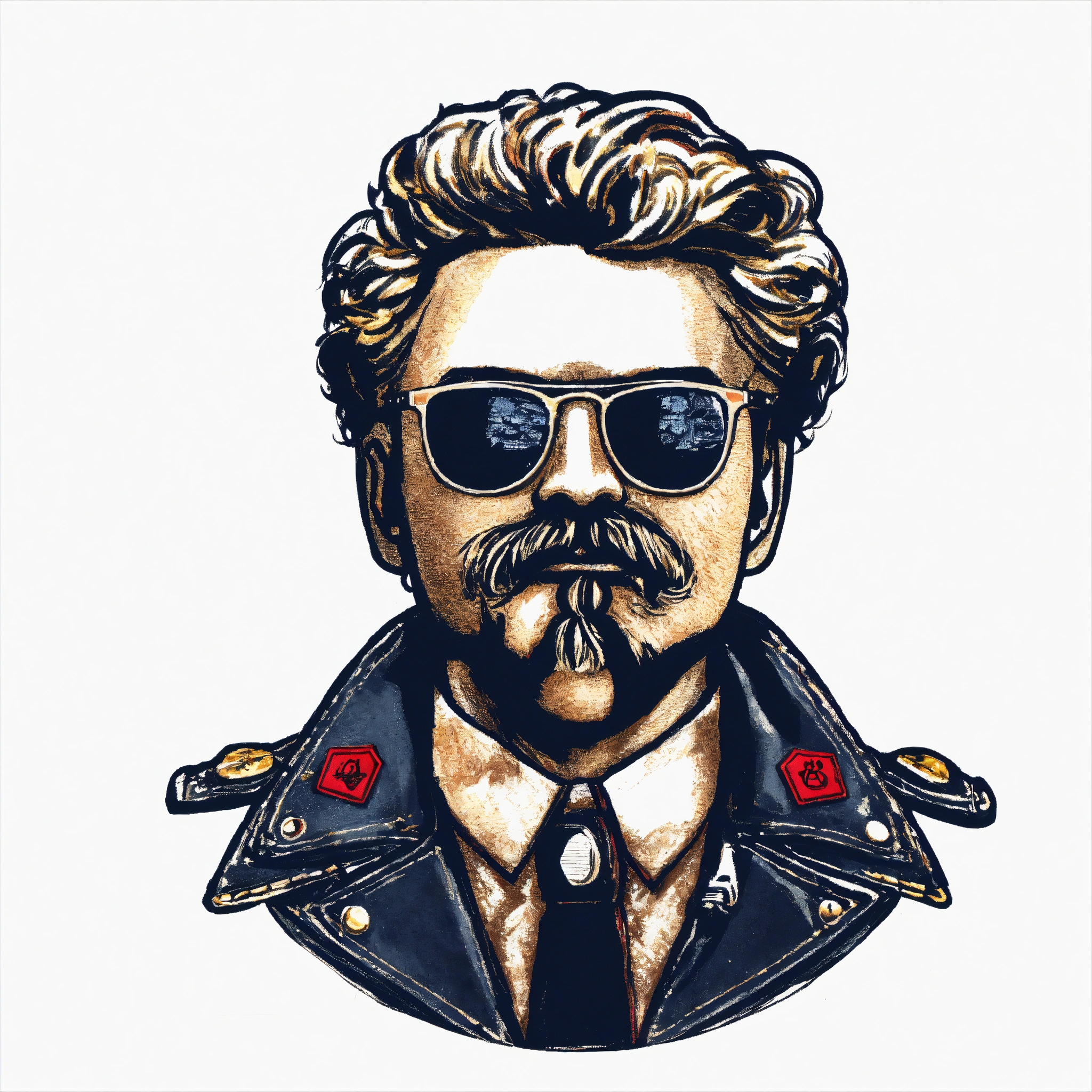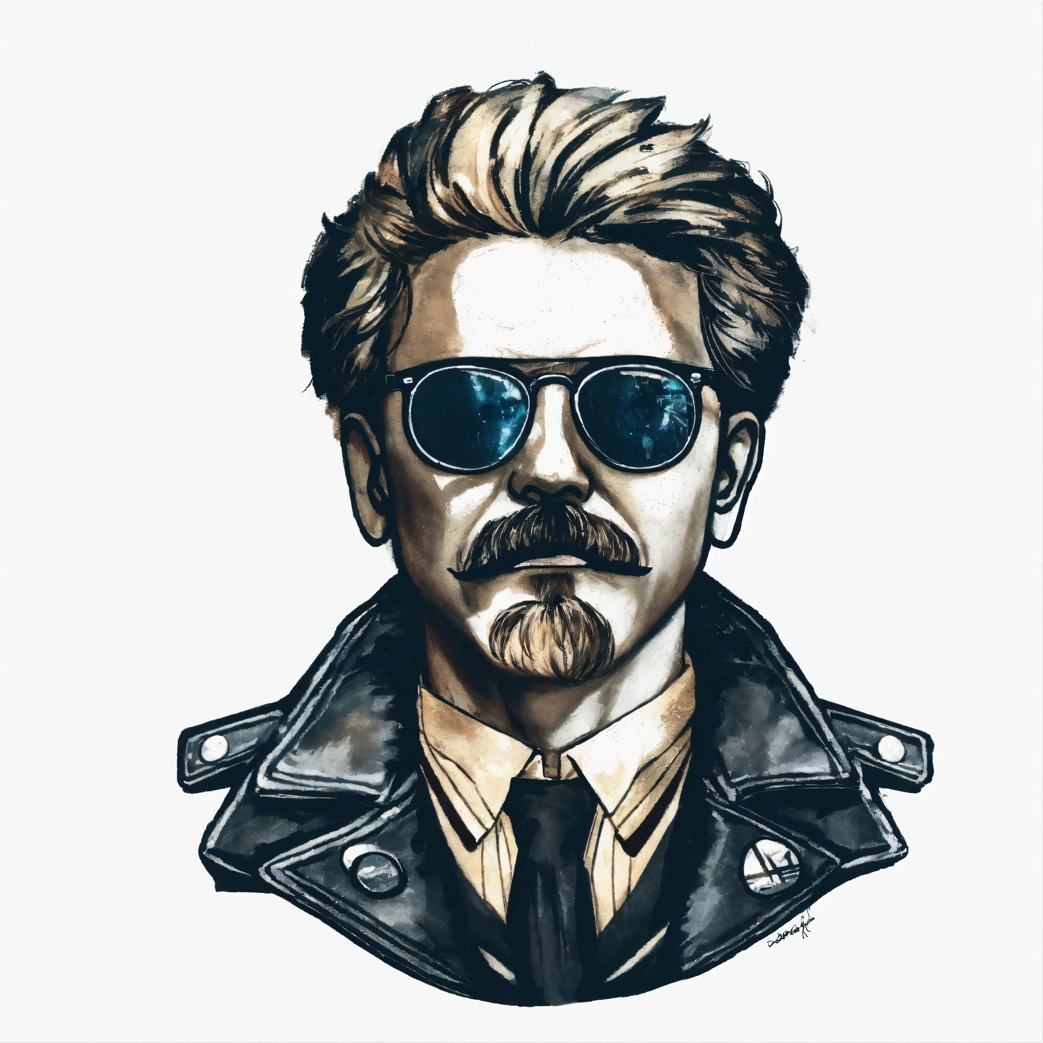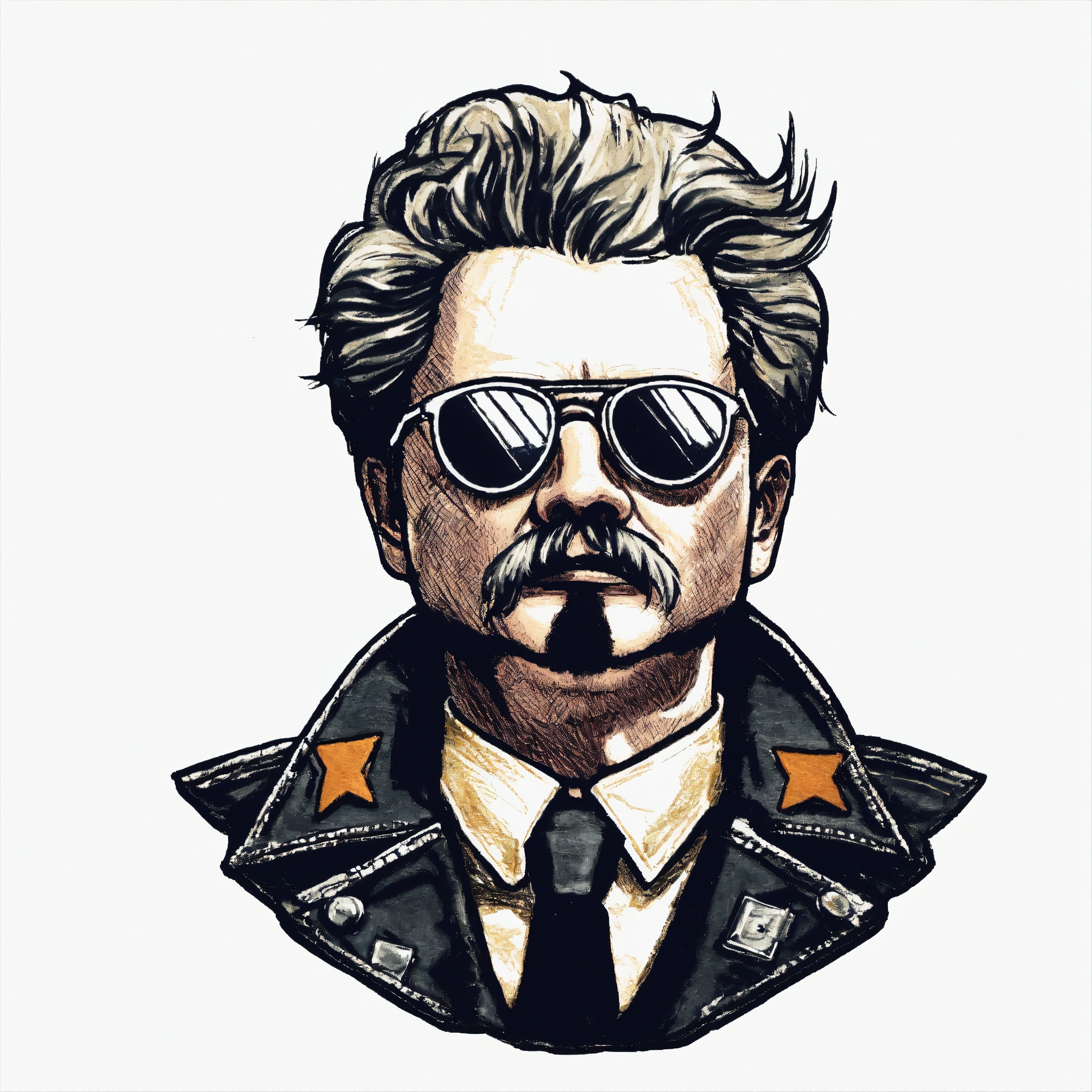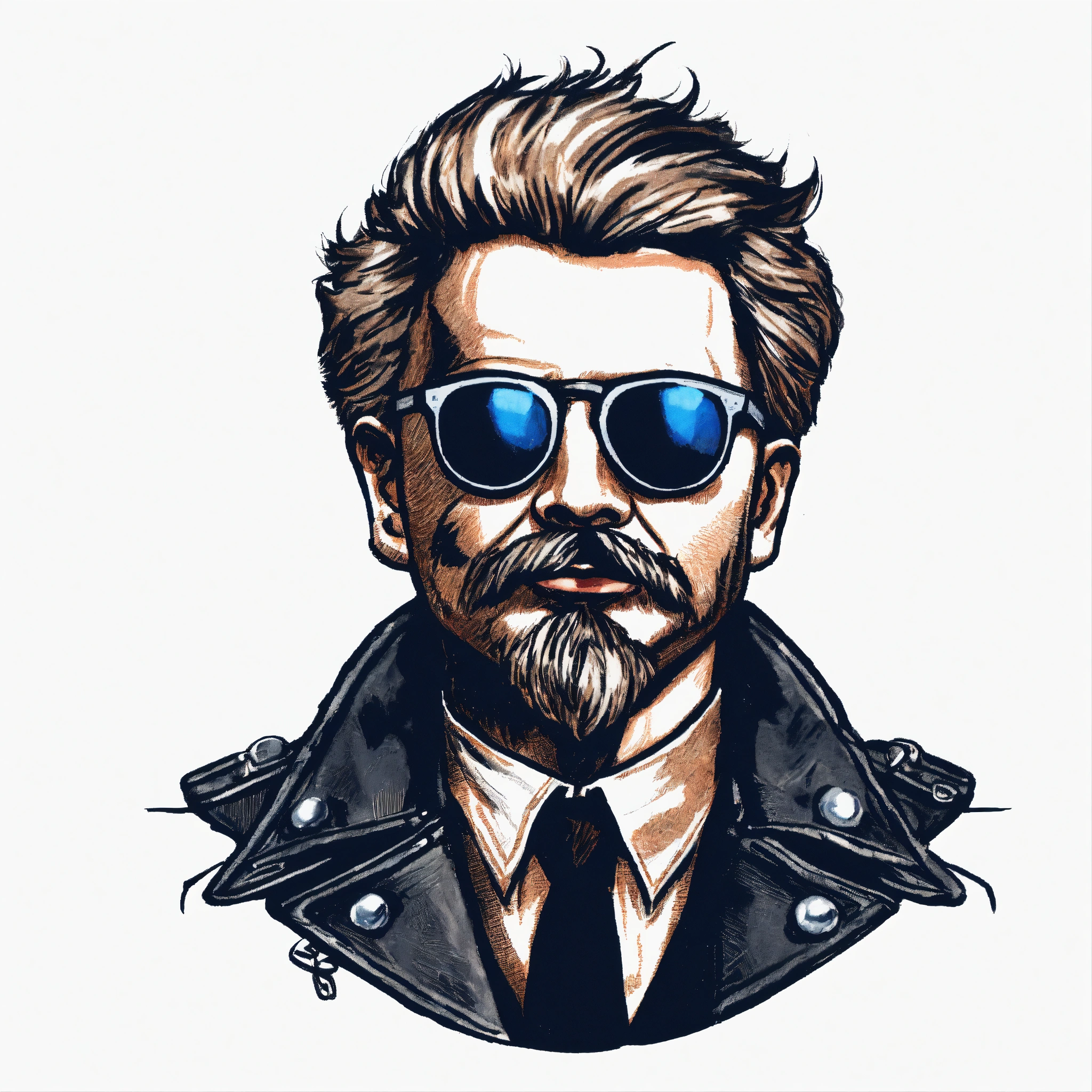 Illustration of a cool leon trotsky in a rocker avatar, donning sunglasses, wearing a leather jacket with patches, and his hair slightly tousled, giving an aura of a rock star.