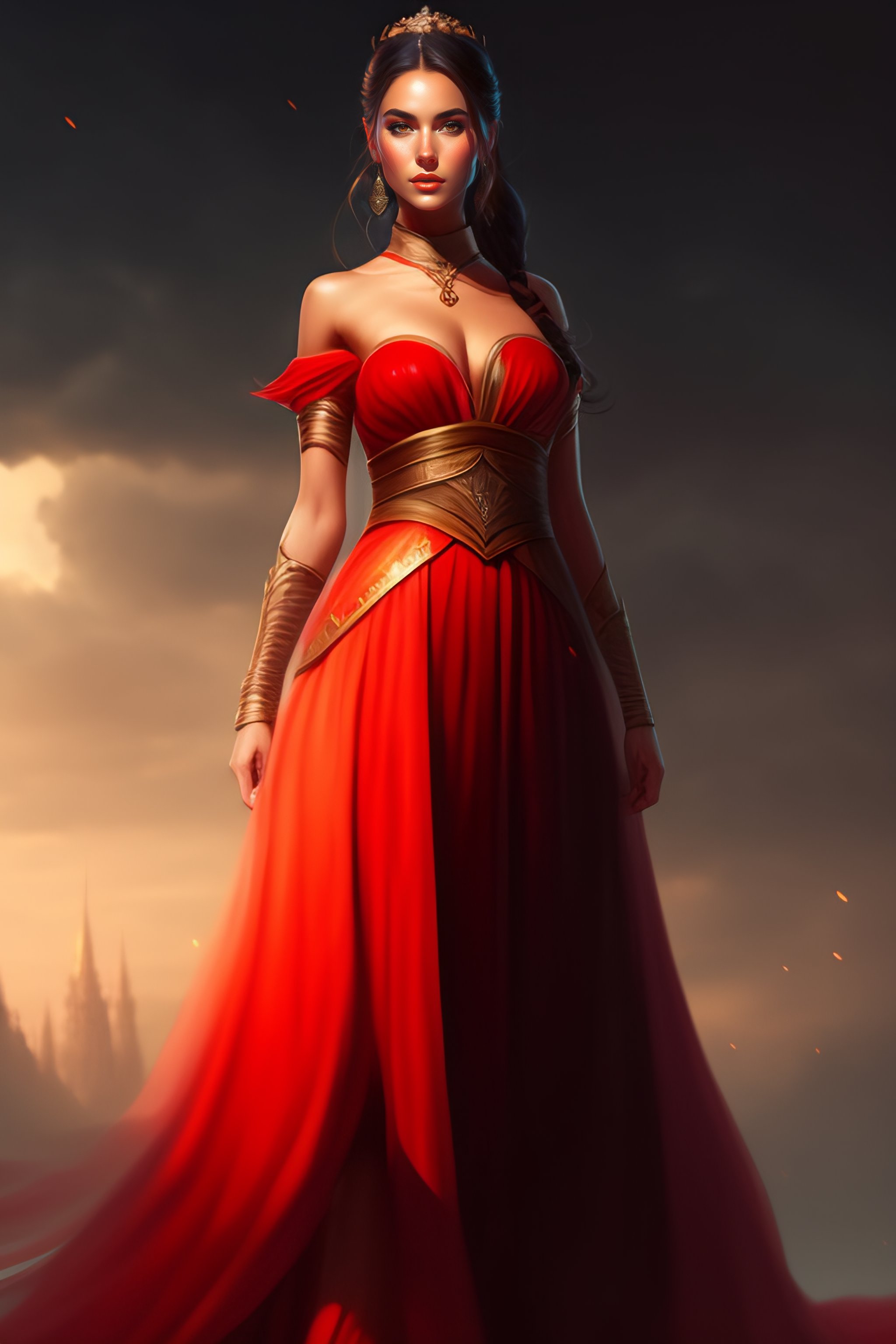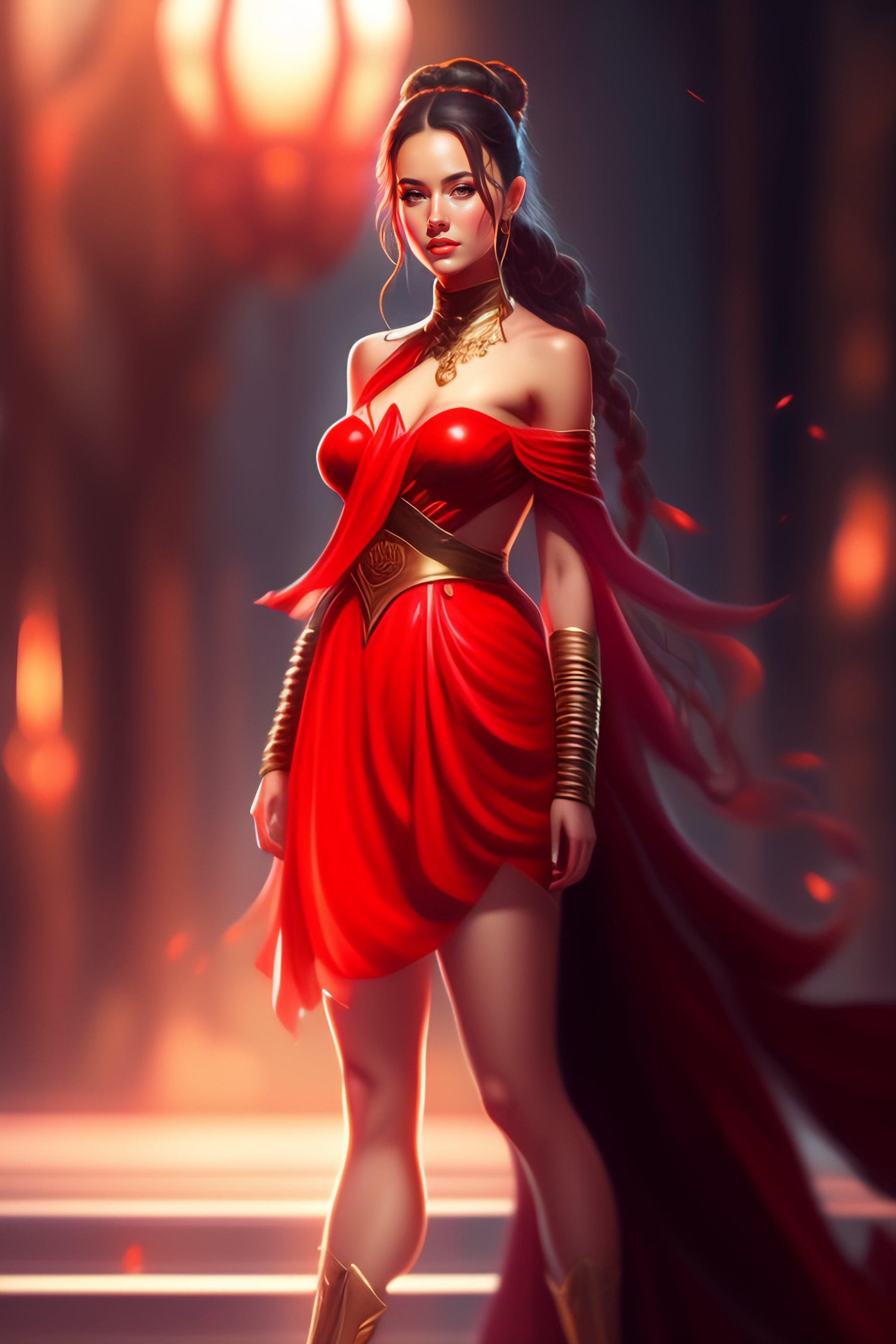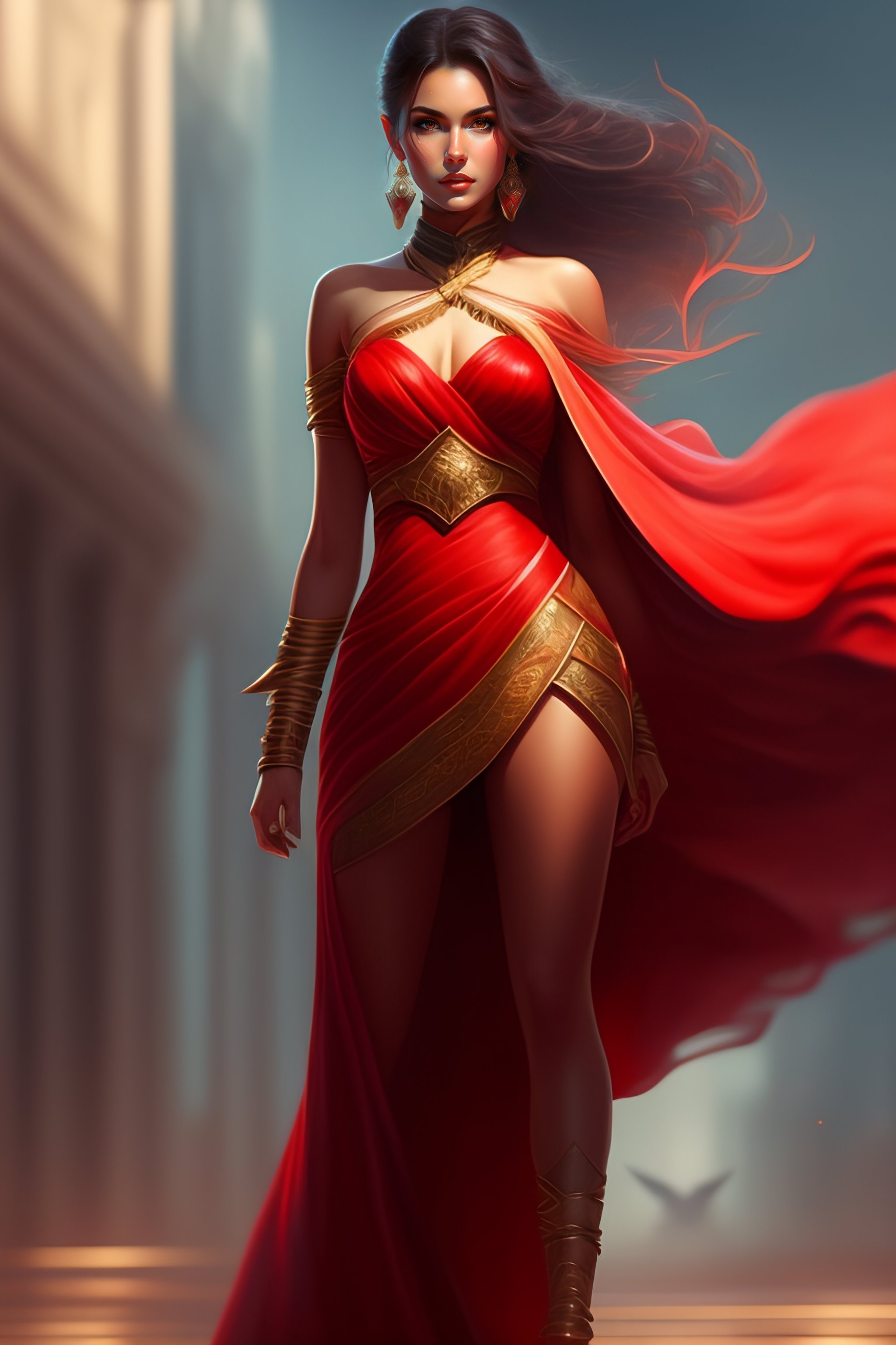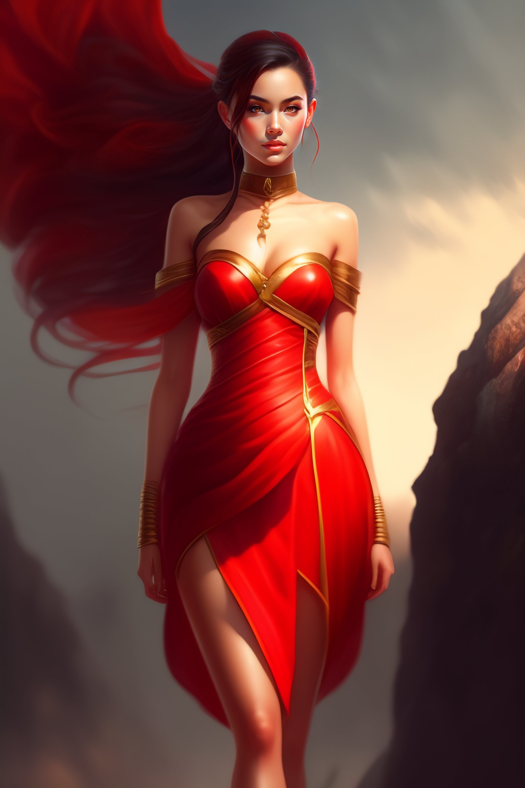 Full body girl, concept art, character design, rey tracing, epic fantasy, beautiful lighting, painting, rule of thirds, red transparent dress