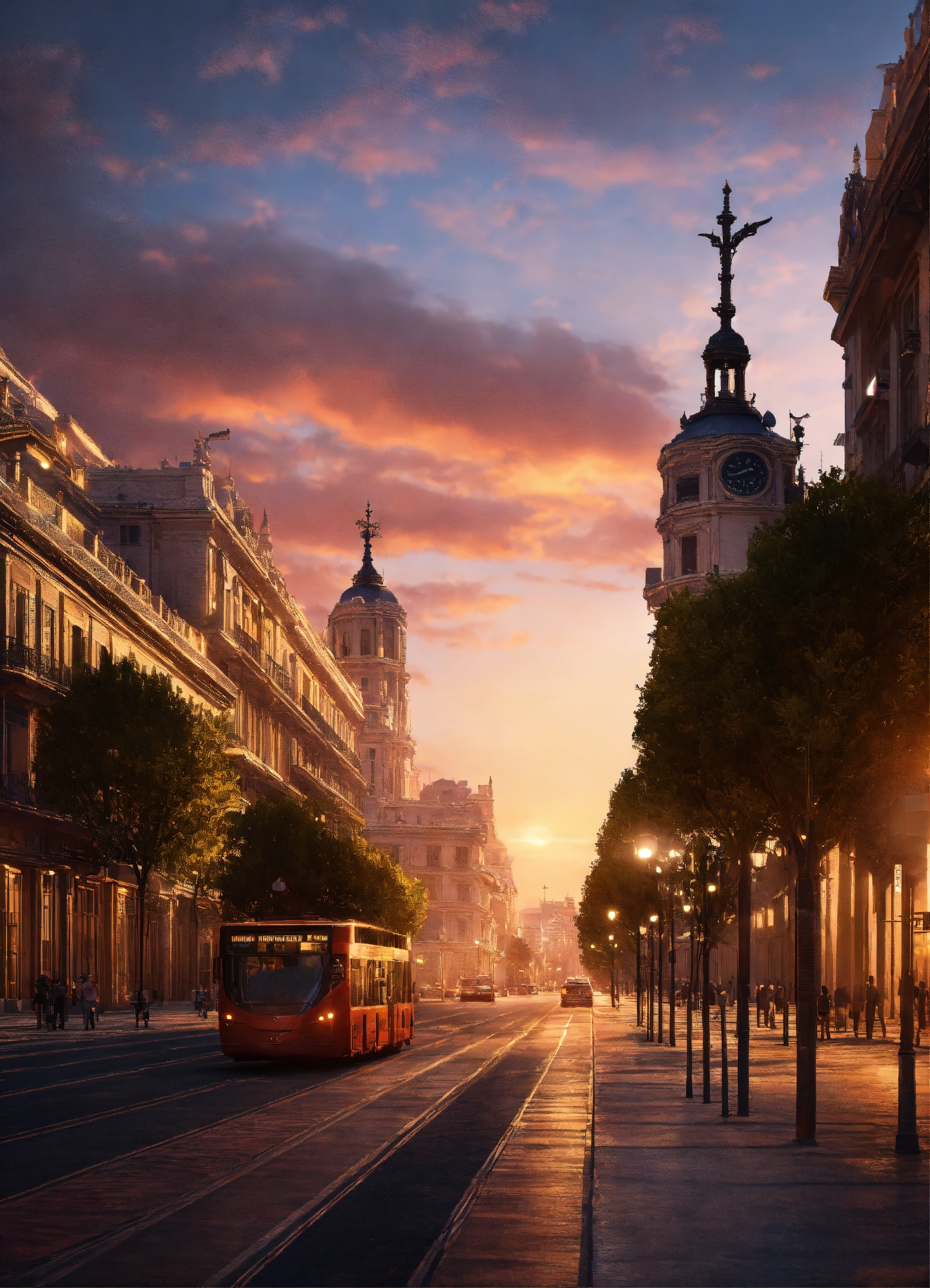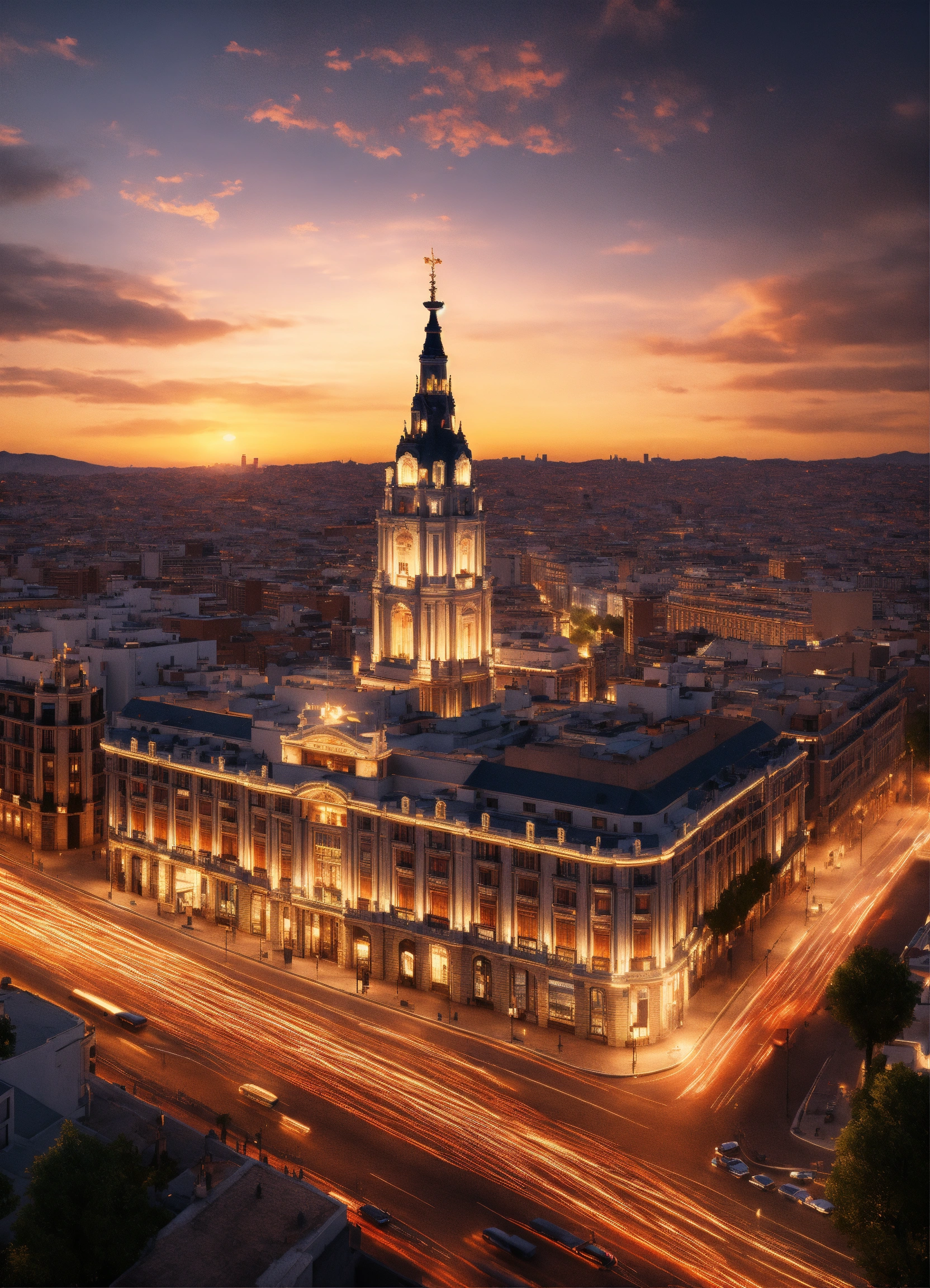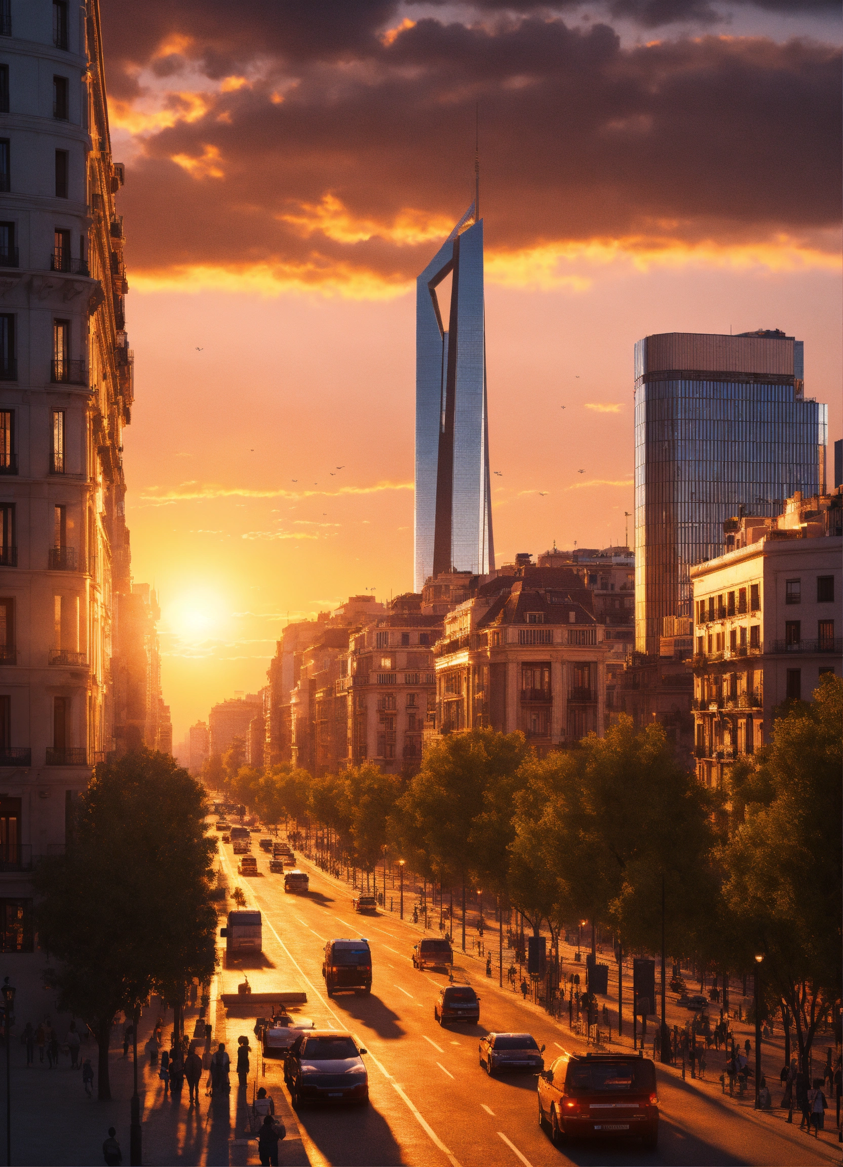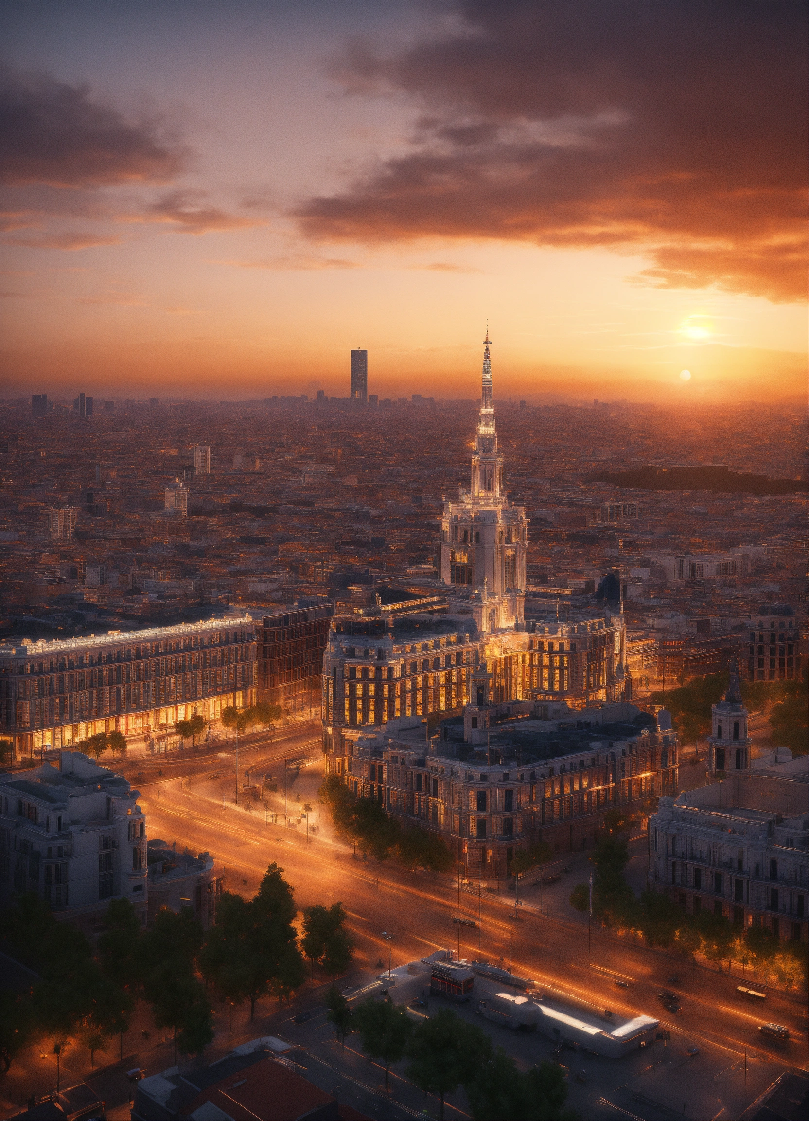 Skyline of madrid, sunset, photorealistic design poster, romantic, 4k, epic composition, stunning realism, long shot, unreal engine 4d