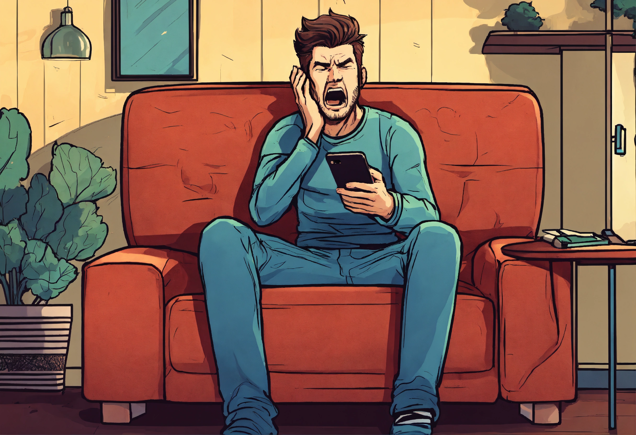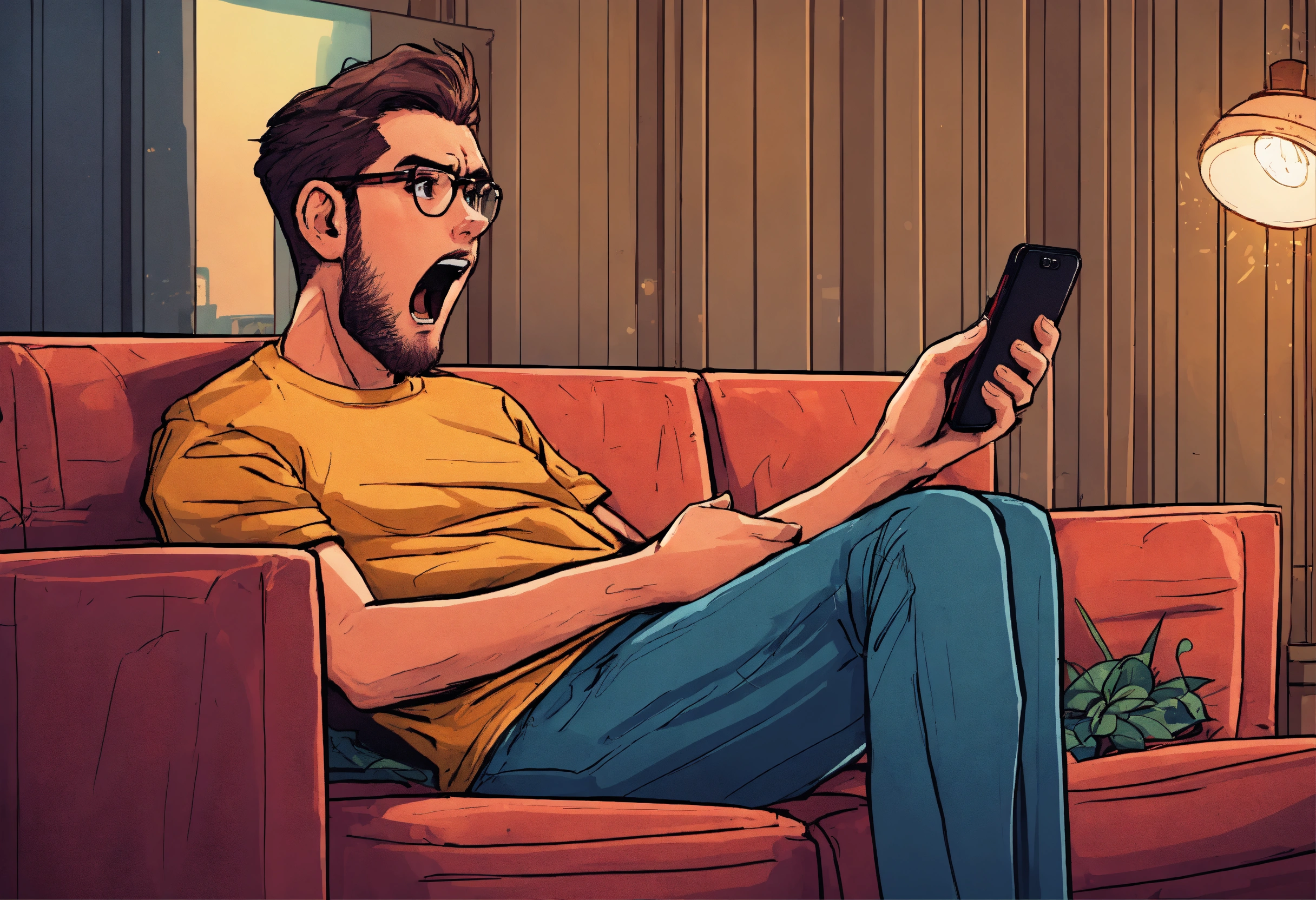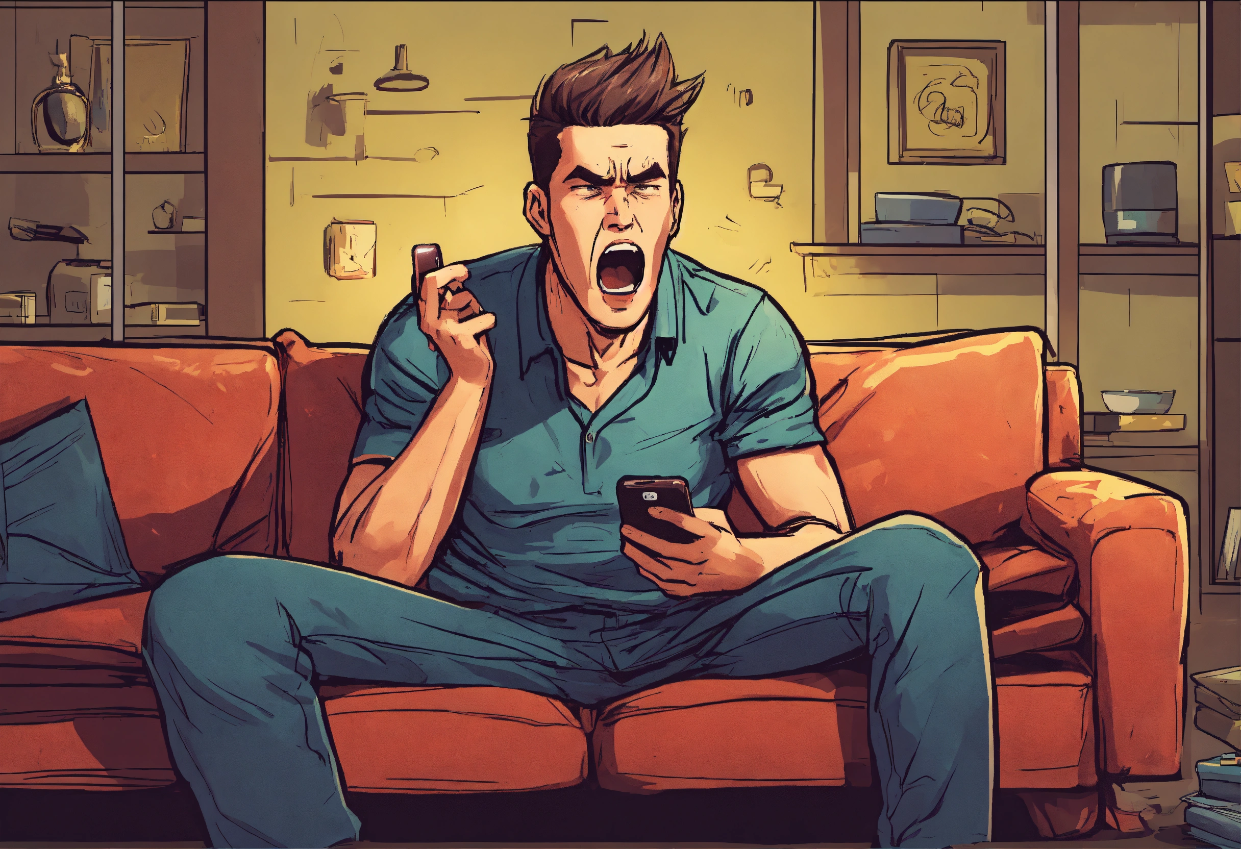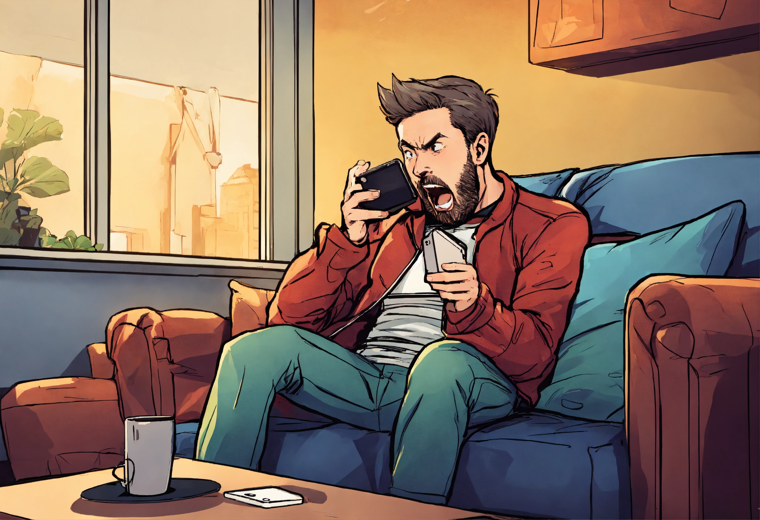 A man is sitting on a couch, he is yelling into his smartphone, he is very shocked and nervous, comic style