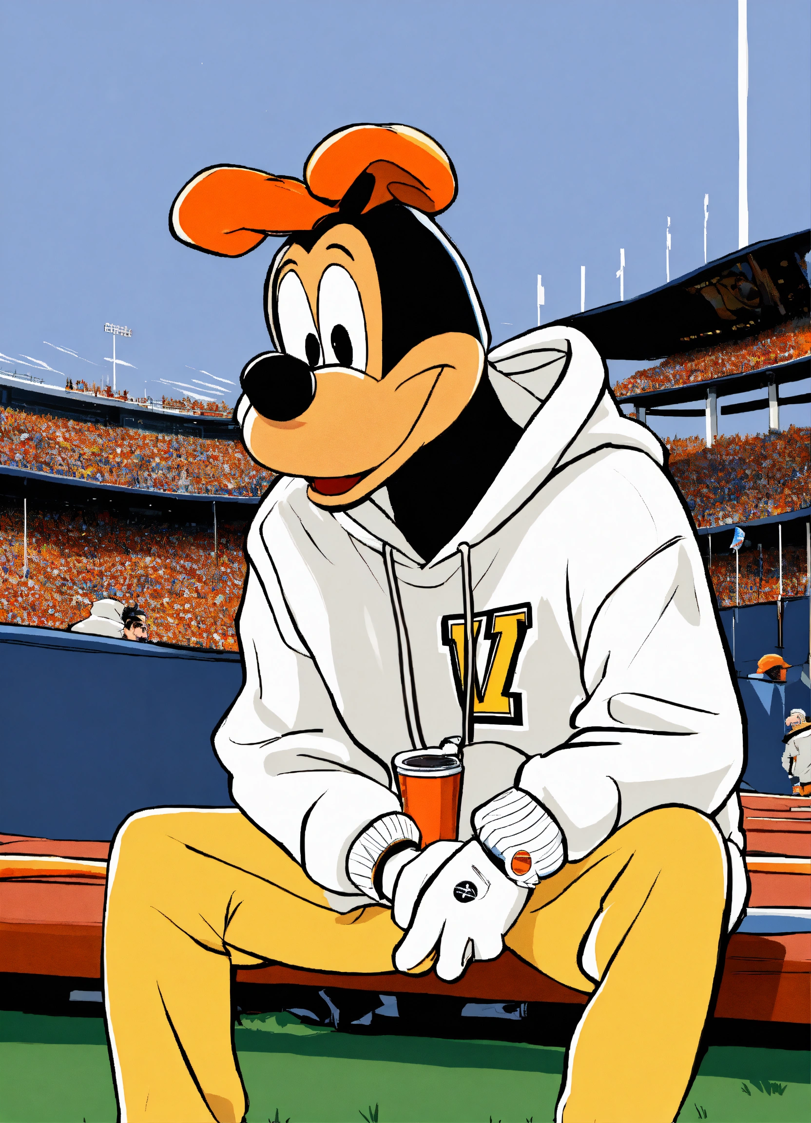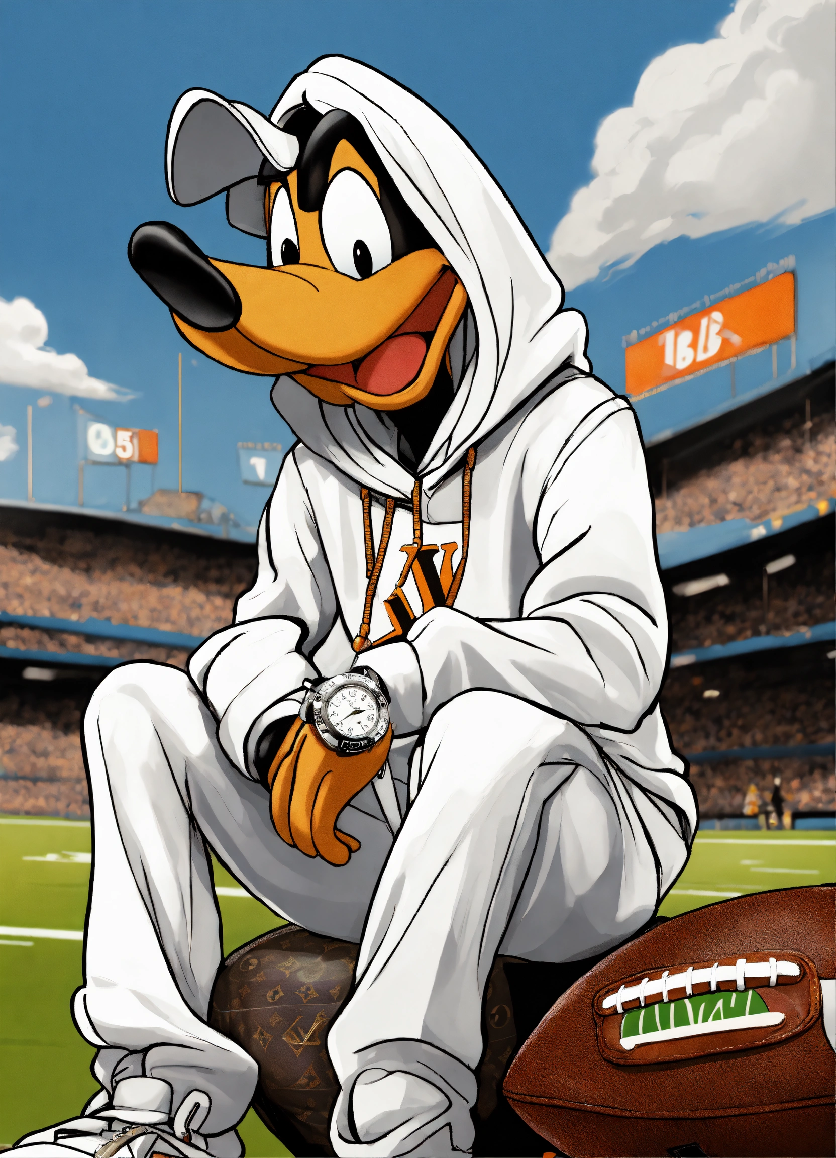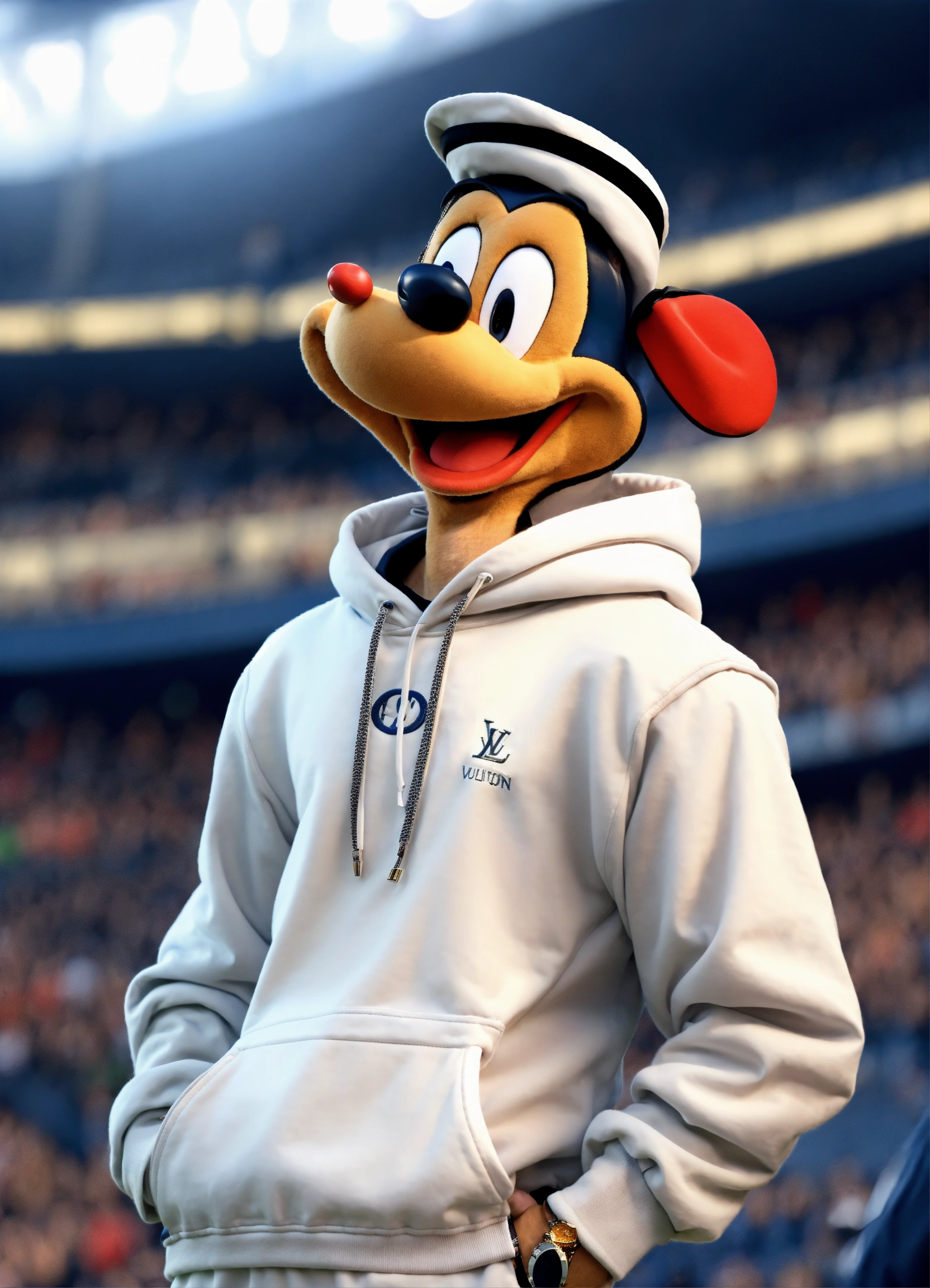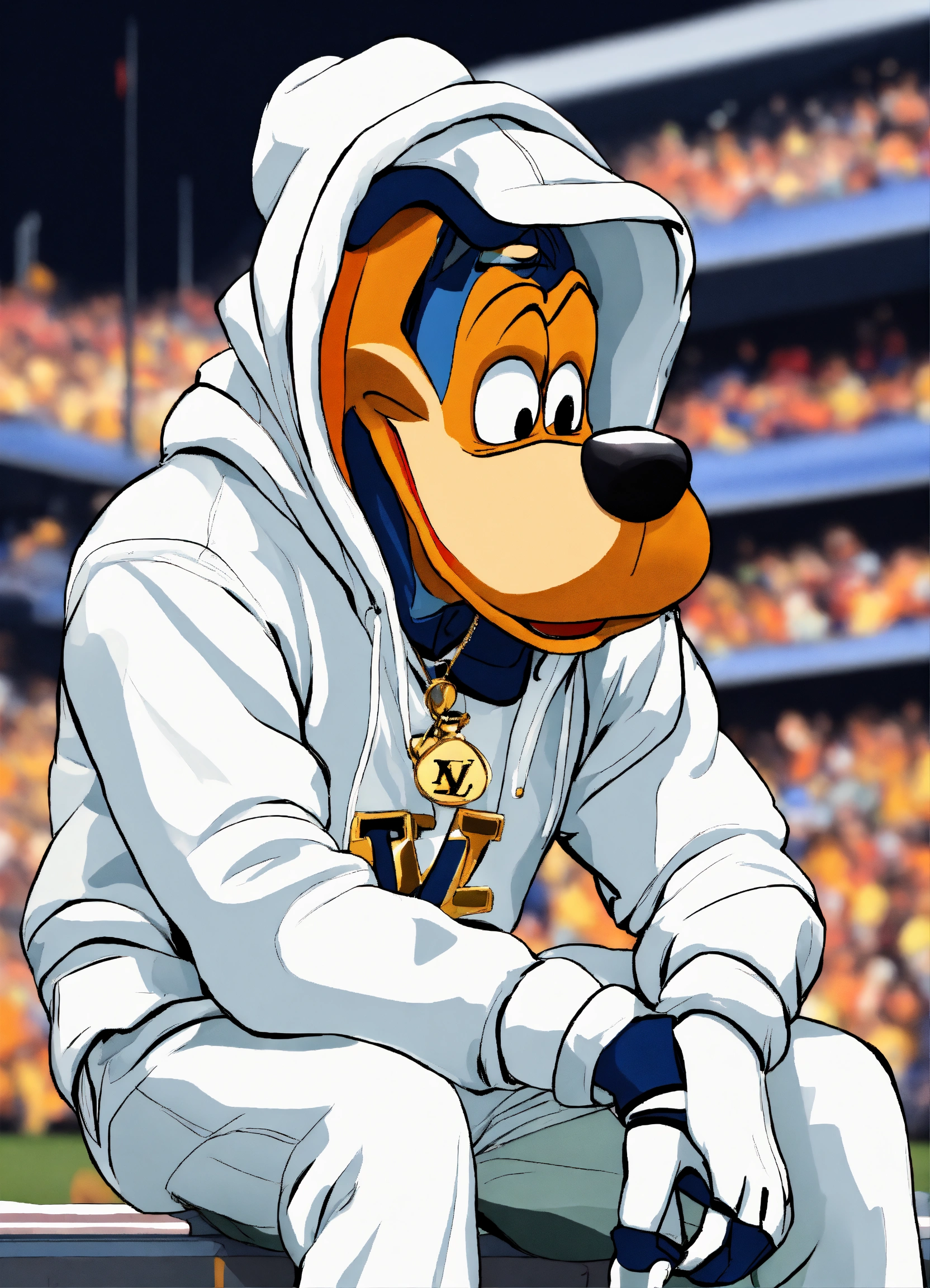 Handsome cartooned goofy in a white hoodie and wristwatch, inspired by louis vuitton, on the sideline at a college football game--v 5.0