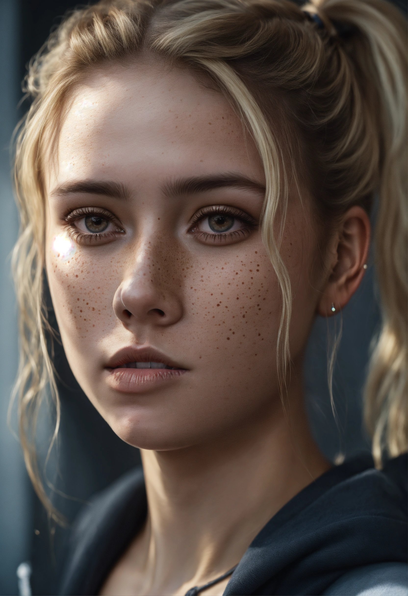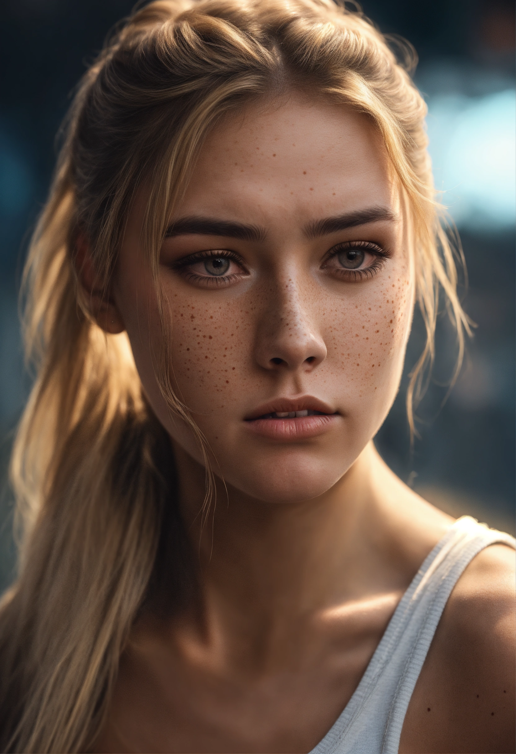 A realistic photo of a 20 years old girl with brown shiny eyes, blonde hair in a ponytail, deeply depressed expression, rounded cheeks with some freckles, fit strong body, hyperrealistic, hyperdetailed, 8 k