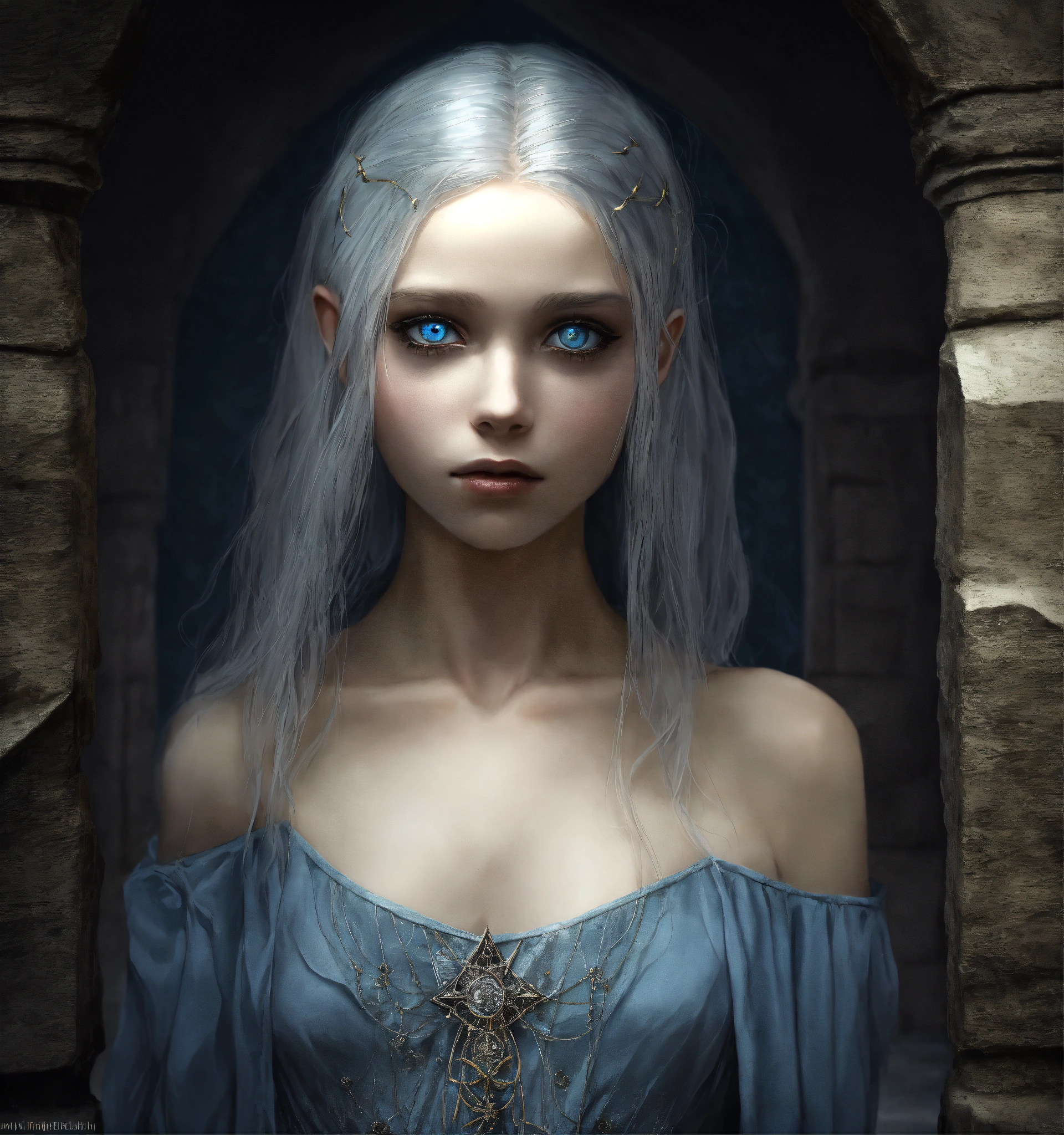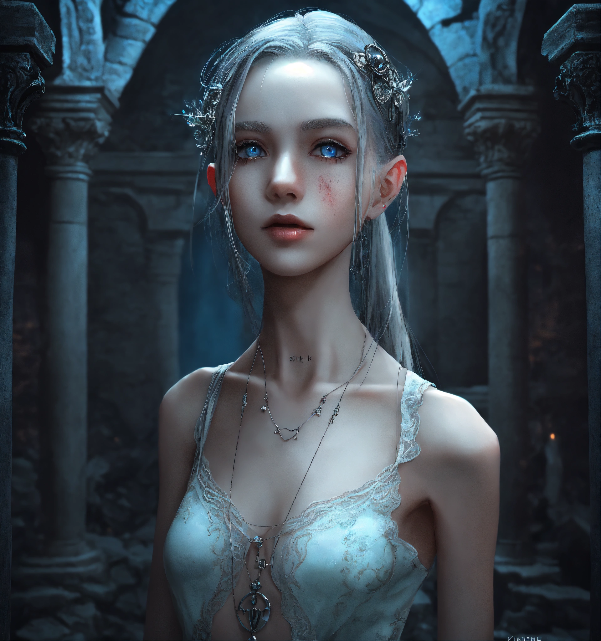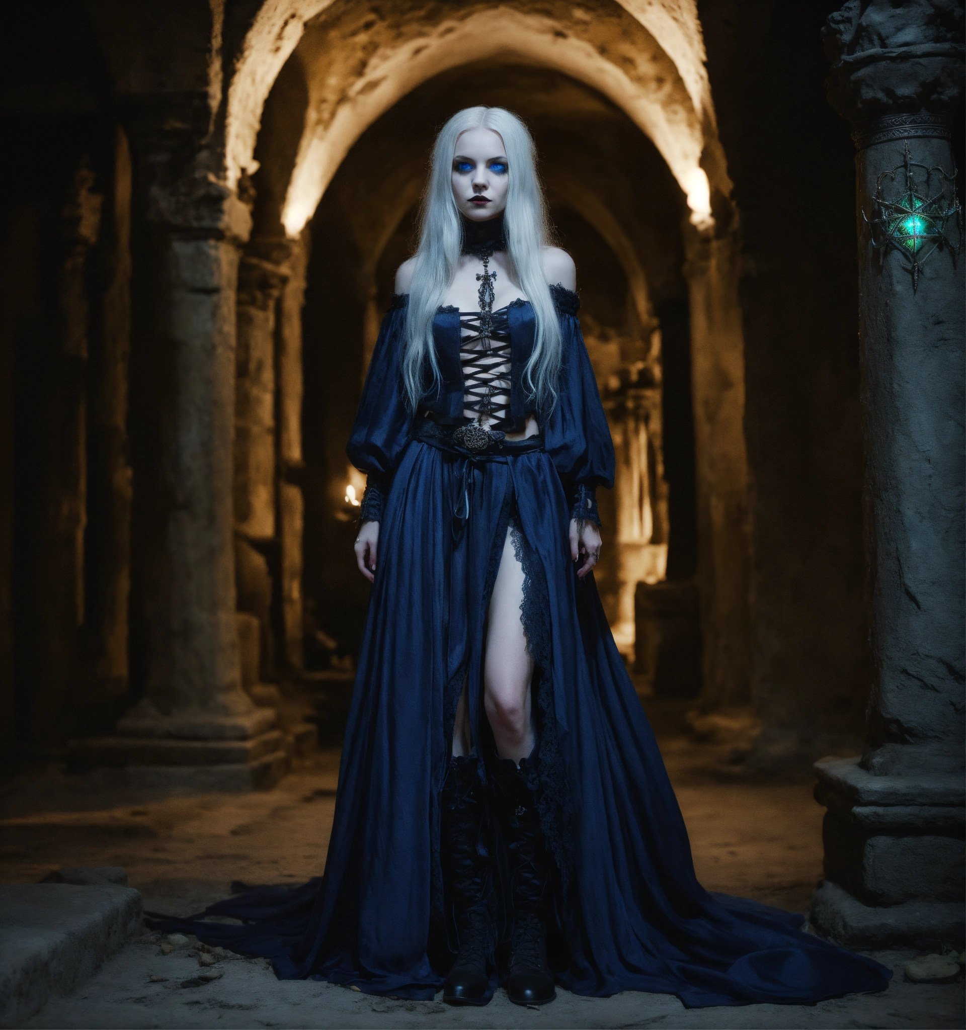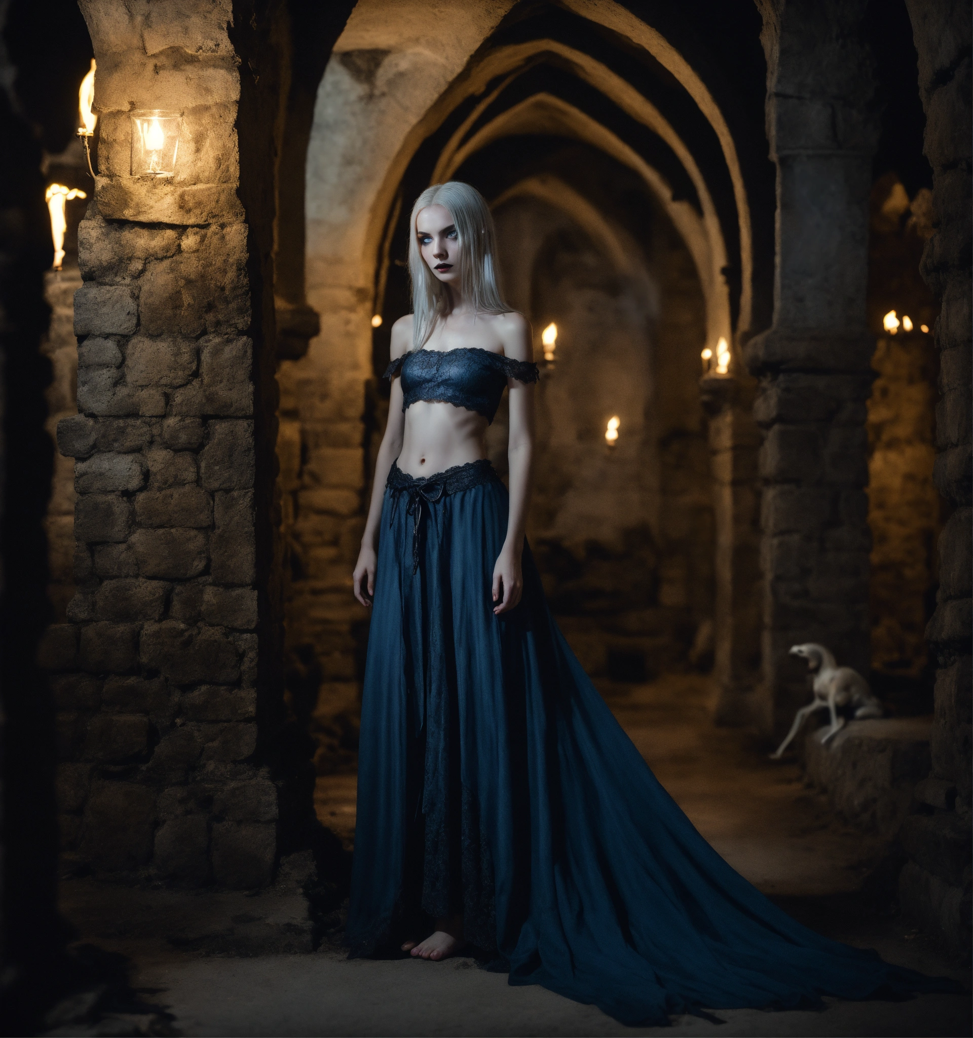 8k, body portrait, sehr kindhaft deadly pale twelve year old female child goth necromancer with waist long silverwhite hair and a aufreizendes off-the-shoulder lace silk cropped top mit tiefem ausschnitt and a low-waisted high slit skirt, very flat belly, extremely skinny, extremely slim and emaciated body, very narrow face, alabaster skin, pale as a corpse, glowing blue eyes, slim face, innocent looking, in a gloomy crypt, kindlich, unschuldig, childlike, graceful, wispy, glowing blue eyes, ghostly, dead, evil, demonic, undead, darkness, grotesque, mysterious, dark, cold ambient lighting, extremely detailed, fantasy, medieval setting