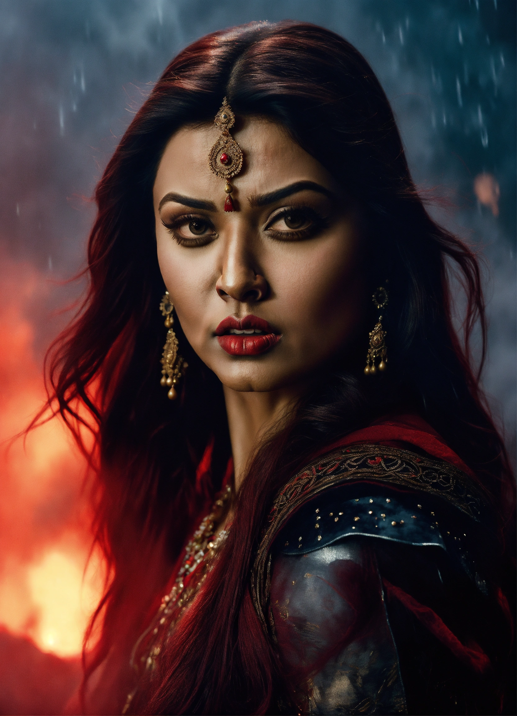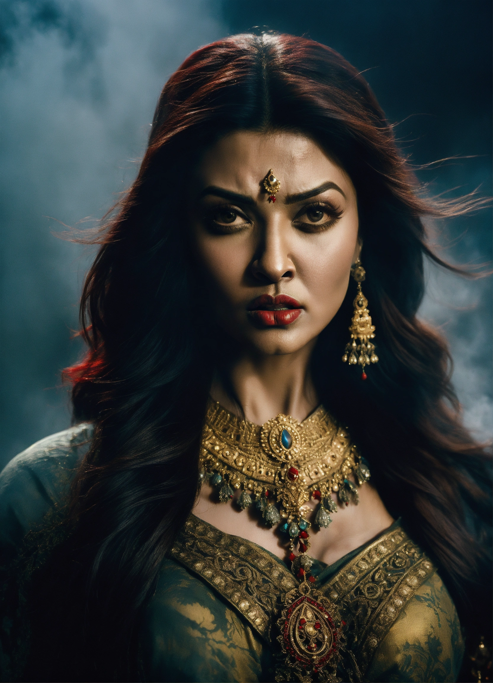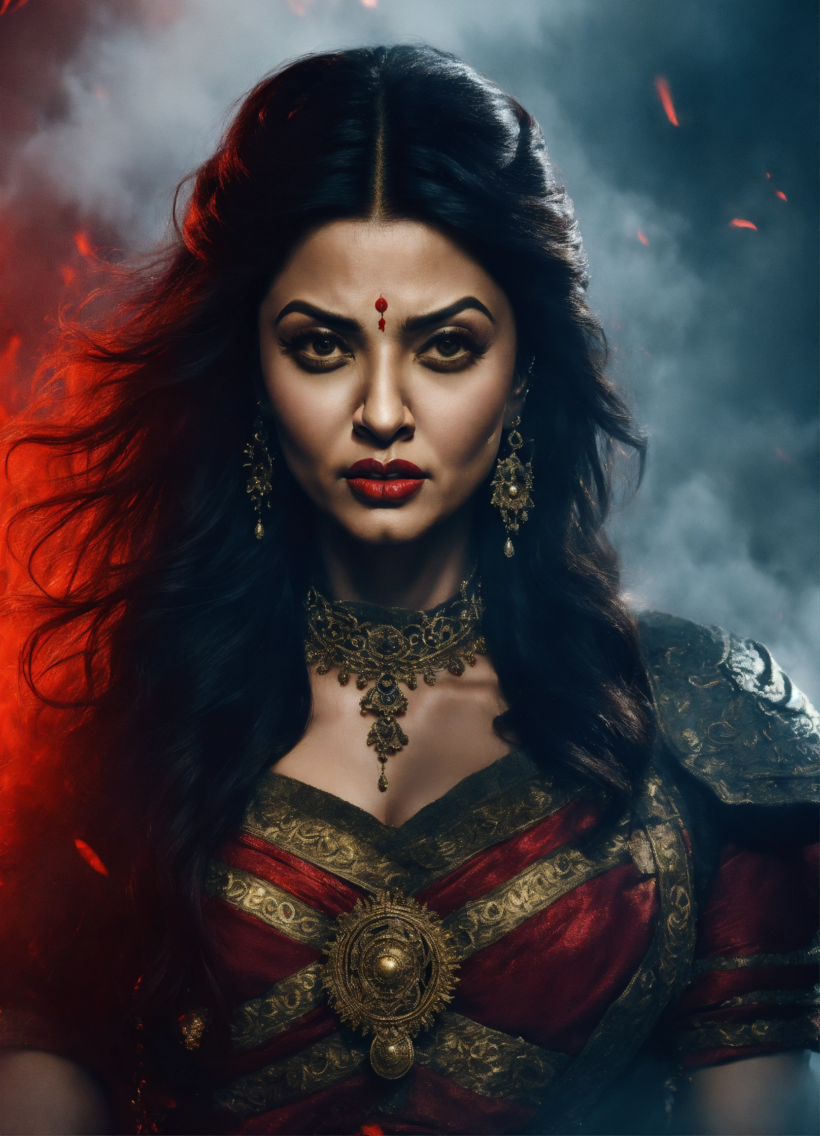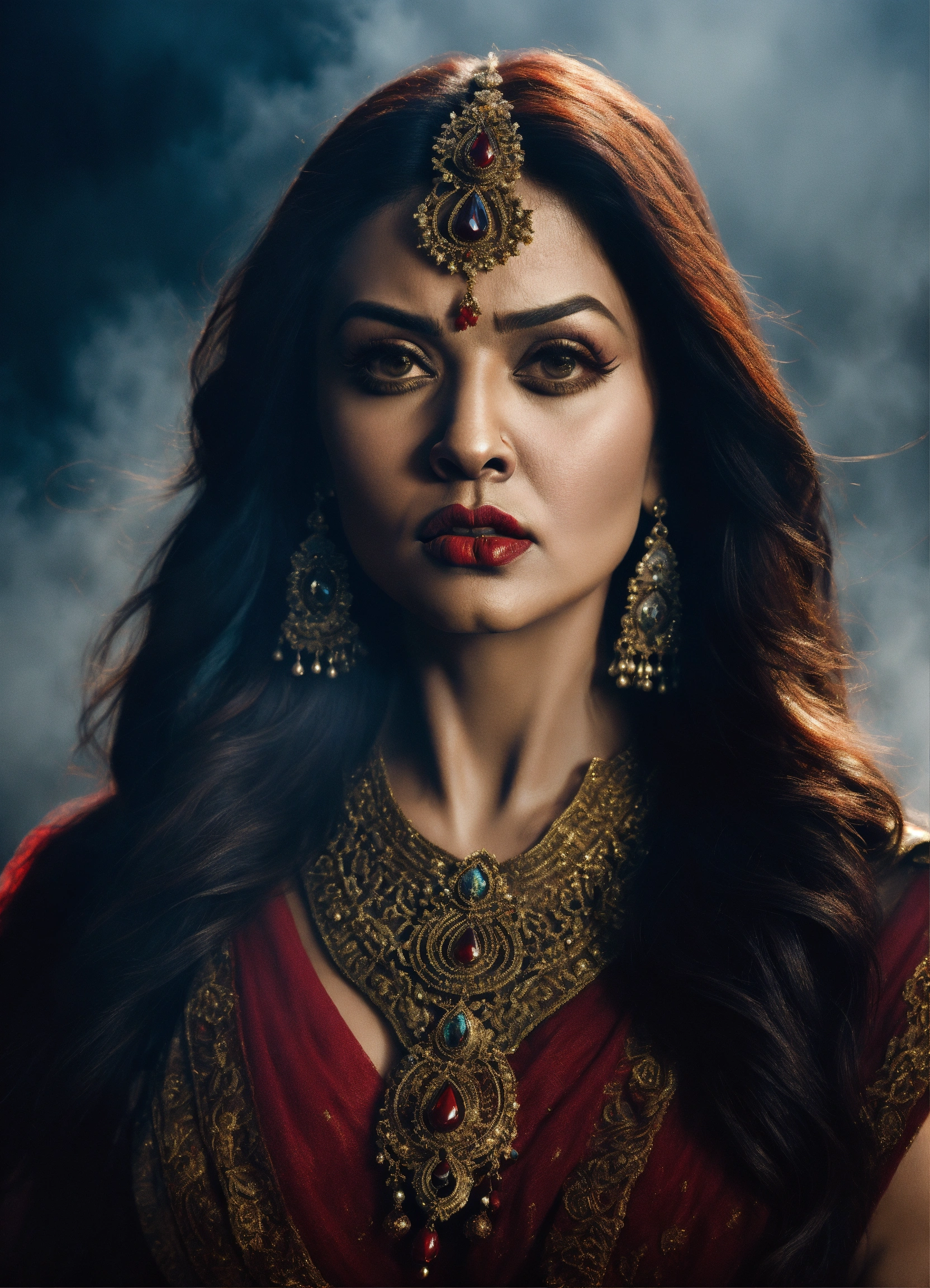 A photo quality portrait of aishwarya rai bachchan as a beautiful warrior with red lips, an angry expression, and surrounded by spooky fog.