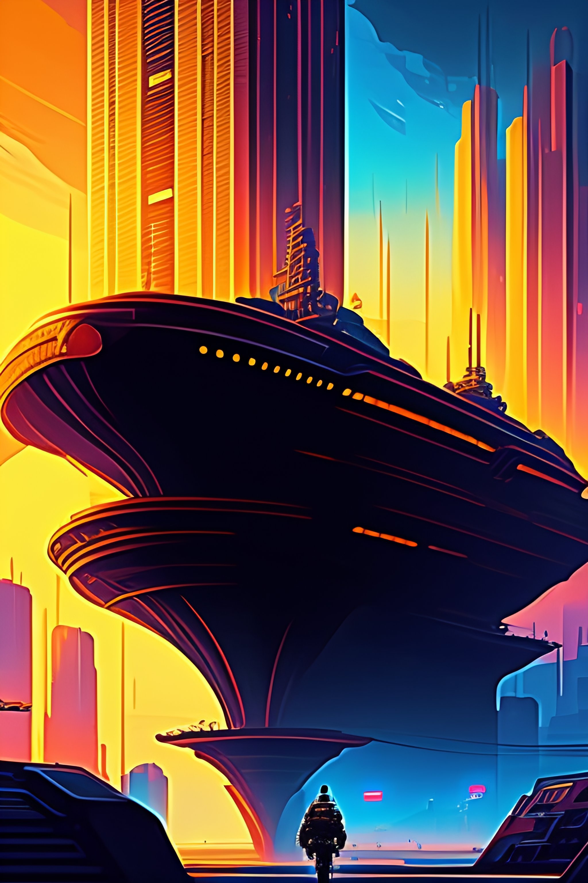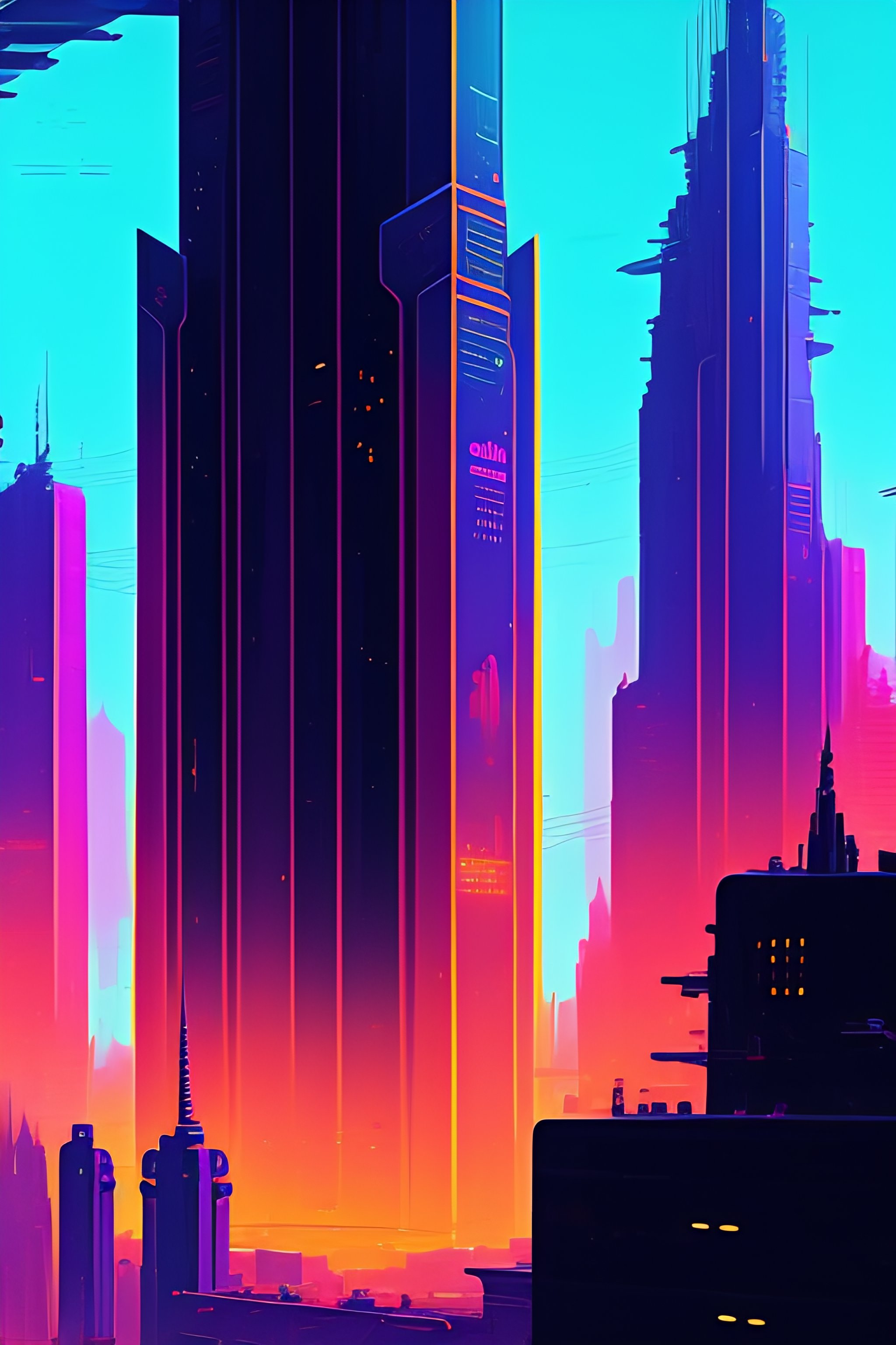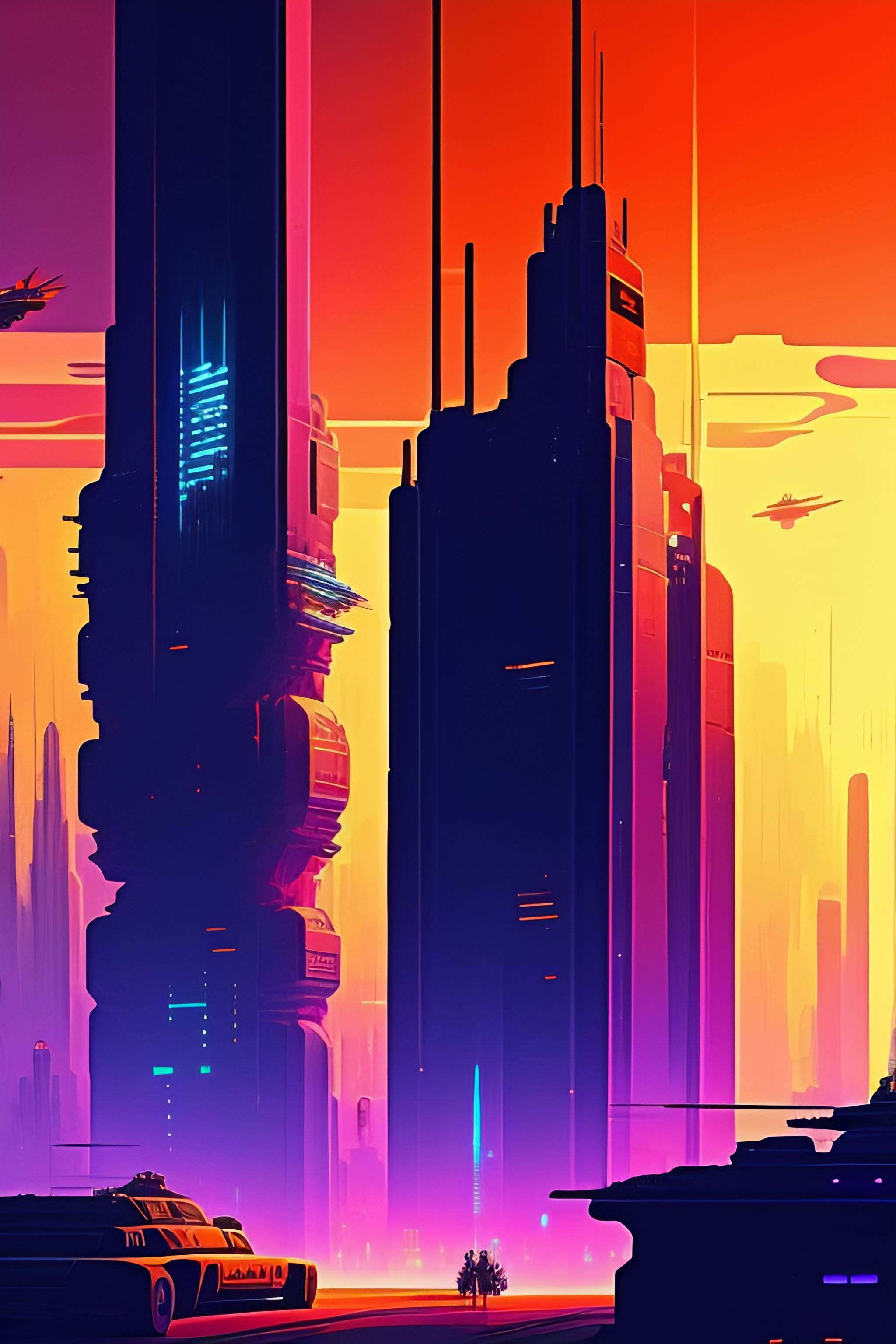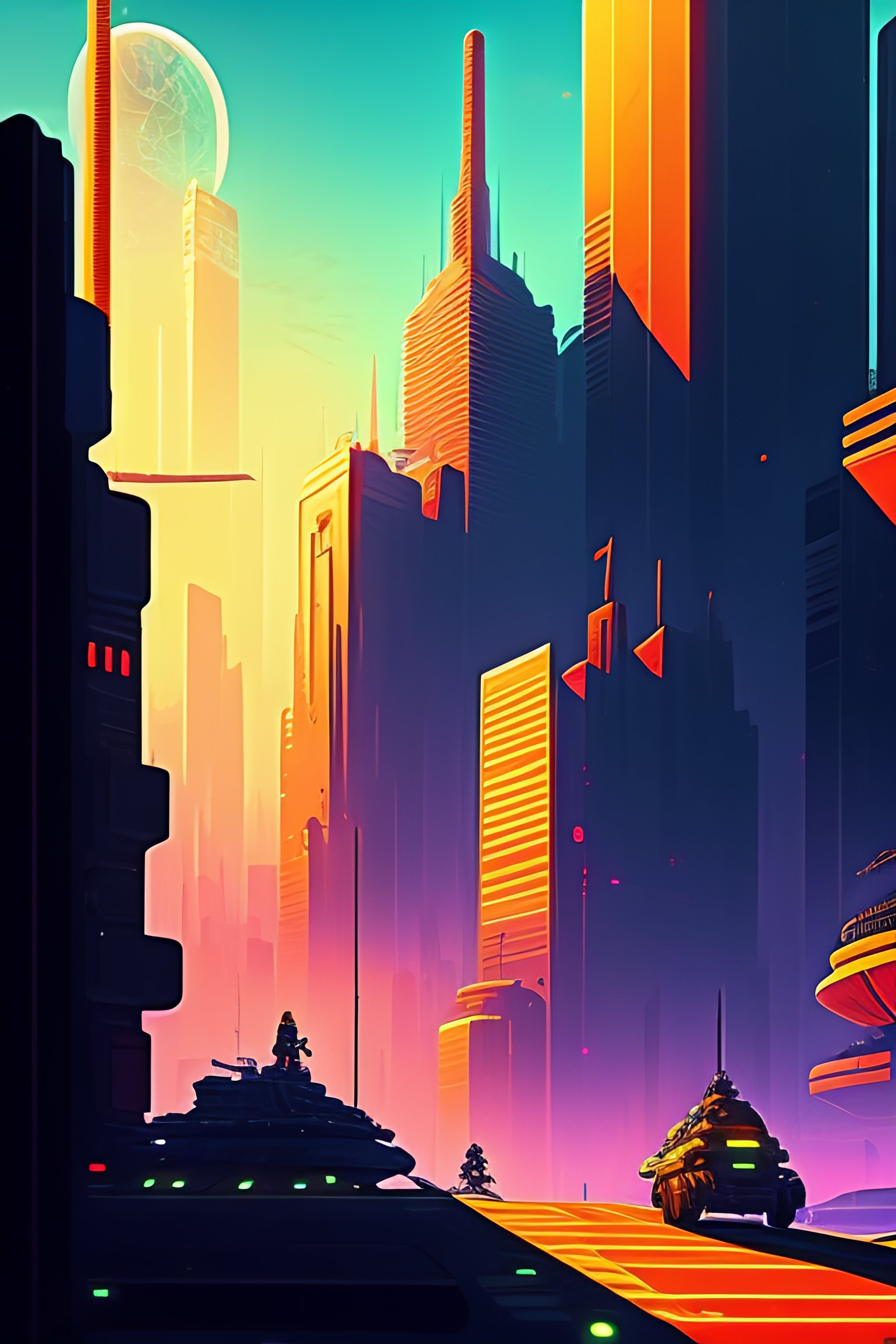 Cyberpunk city. 2d heavily-stylized vector digital drawing in the style of artists chris foss, alberto giacomettin, alexander jansson. dynamic action pose, professional illustration, cinematic composition, beautiful lighting, extremely detailed, sharp-focus, magnificent, award-winning, epic, dramatic.