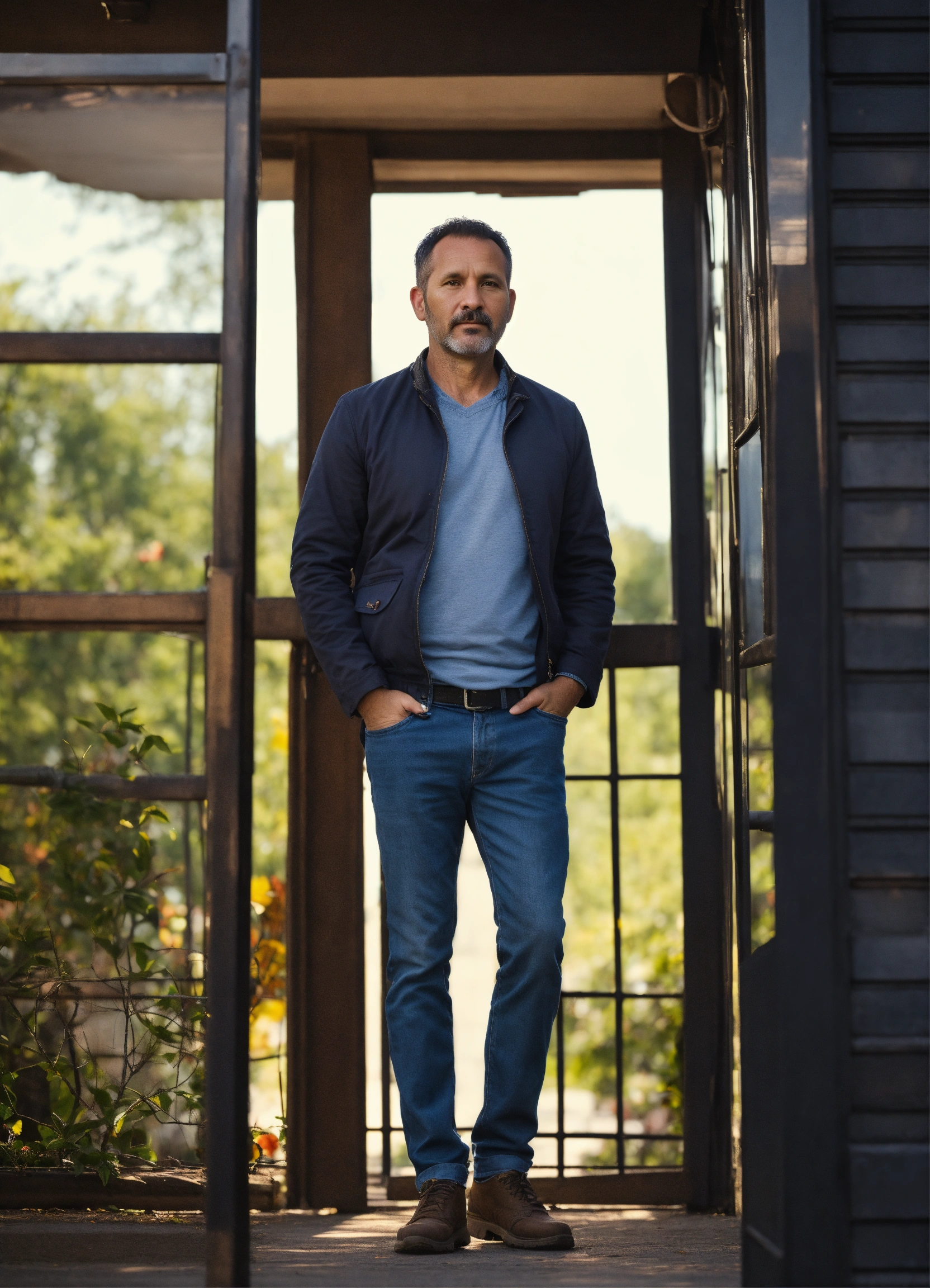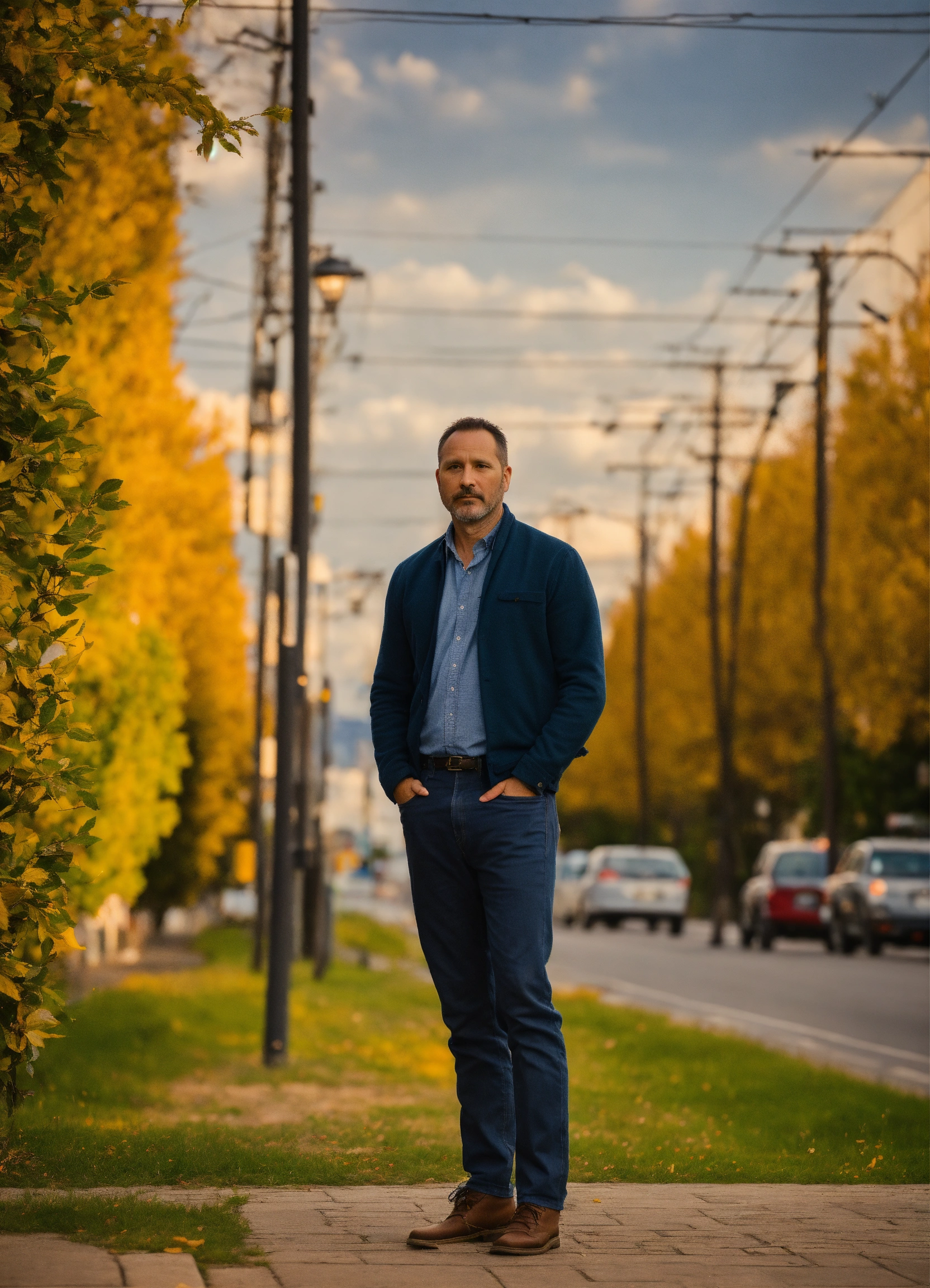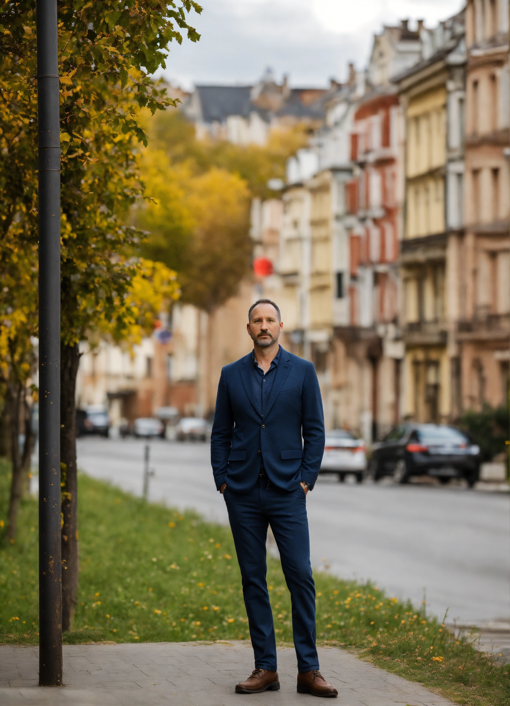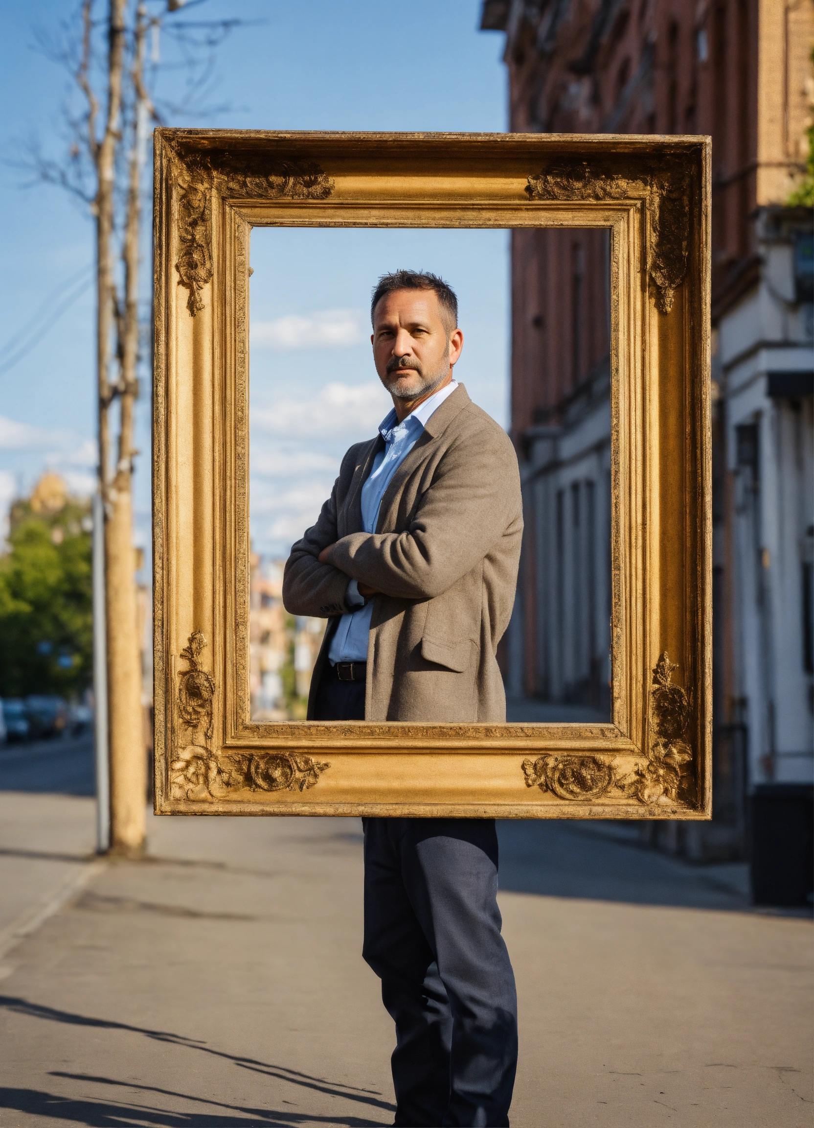 40-year-old man standing in a waist-high frame against the background of a street or nature, background blurred
