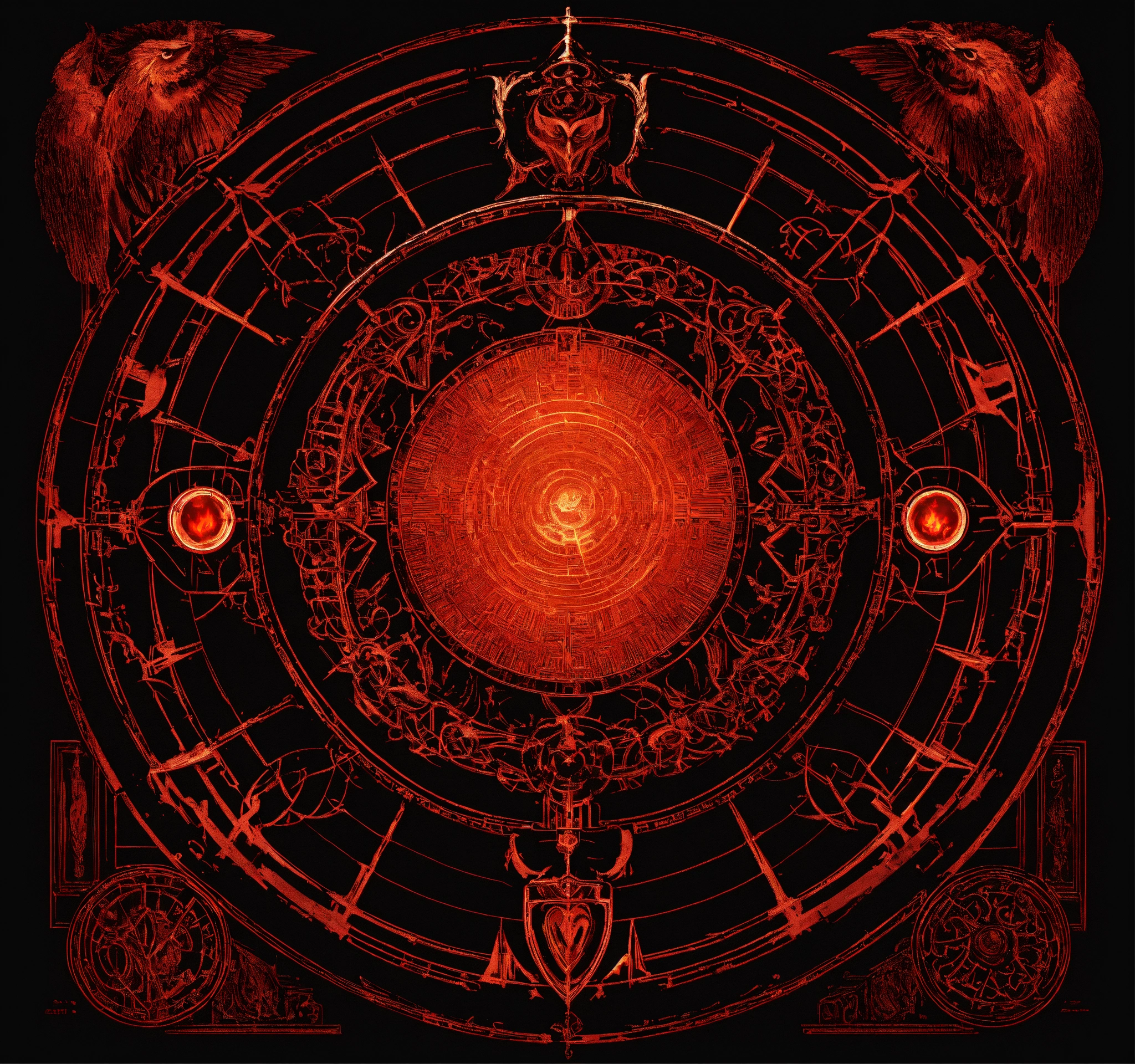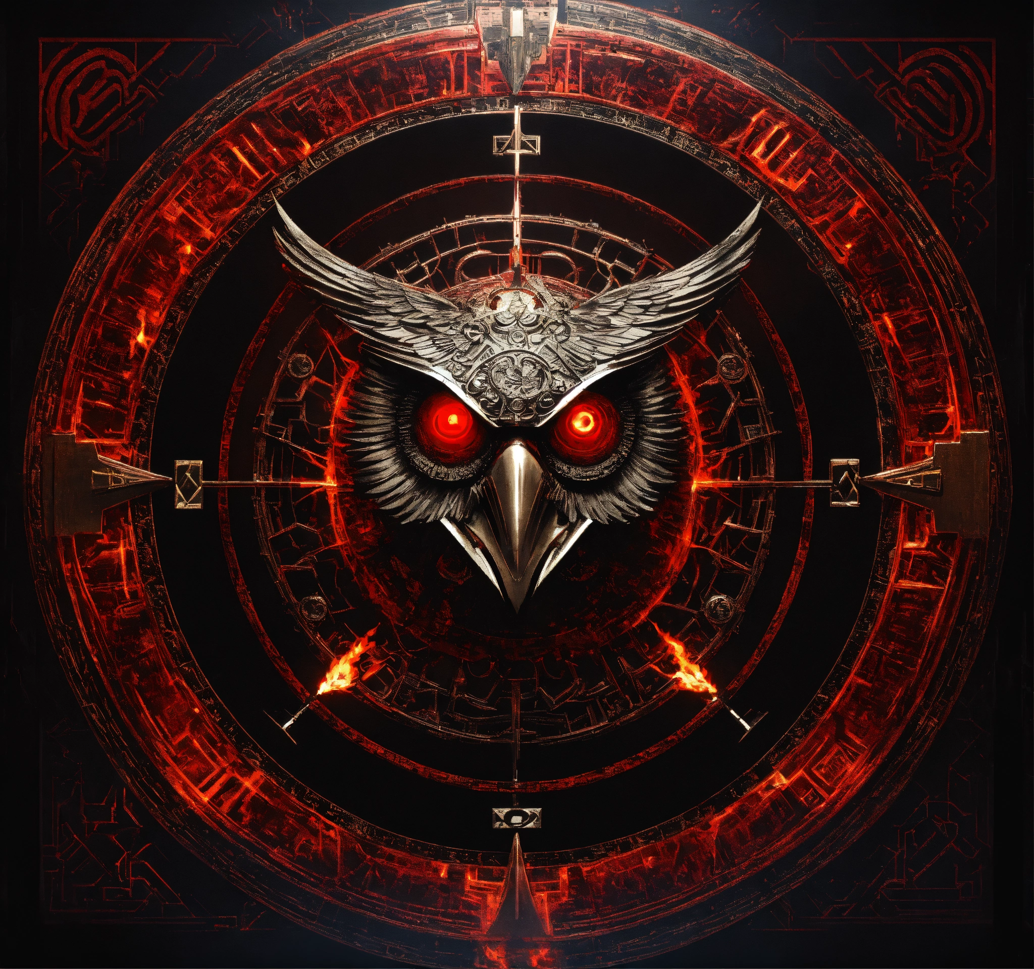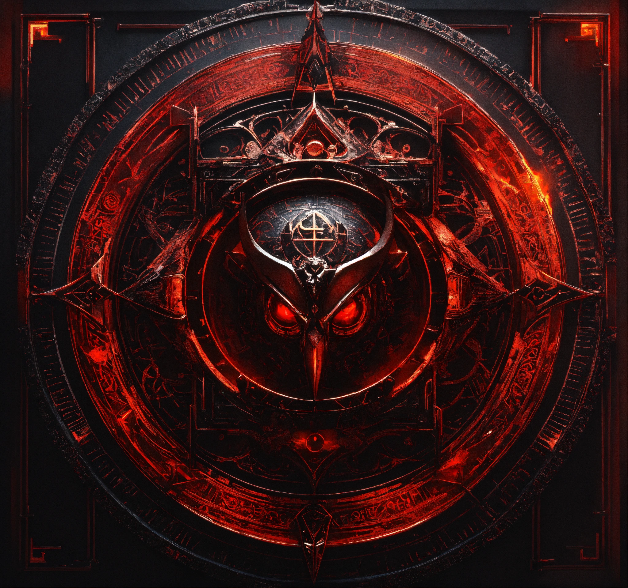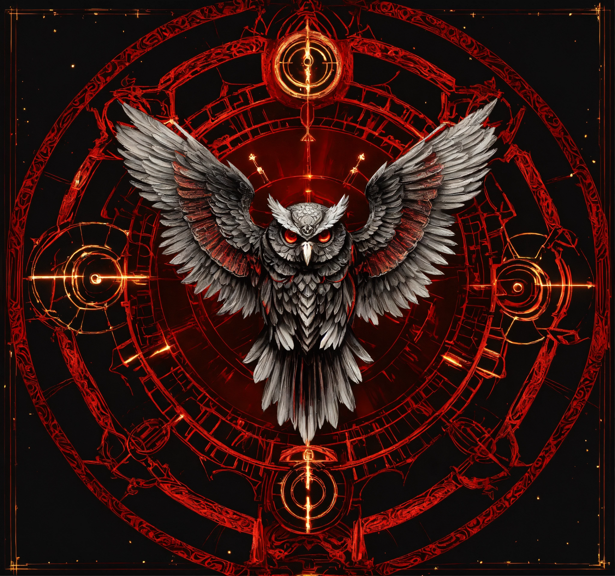 Dark evil black, red and black digital occultic sigil owl symbolic, emblem symbol, intricate detail, hyper digital, futuristic, amazing design, inspired by quantum physics cybernetic, divine, hyper futuristic, lucifer is the light bearer, christ is infinite, led, ominous, artistic, incredibly detailed, 5 dimensional, mischievous personified, mostly black, ancient gods, angular, high technology, super powerful alien technology, fire and flames, gates of hell