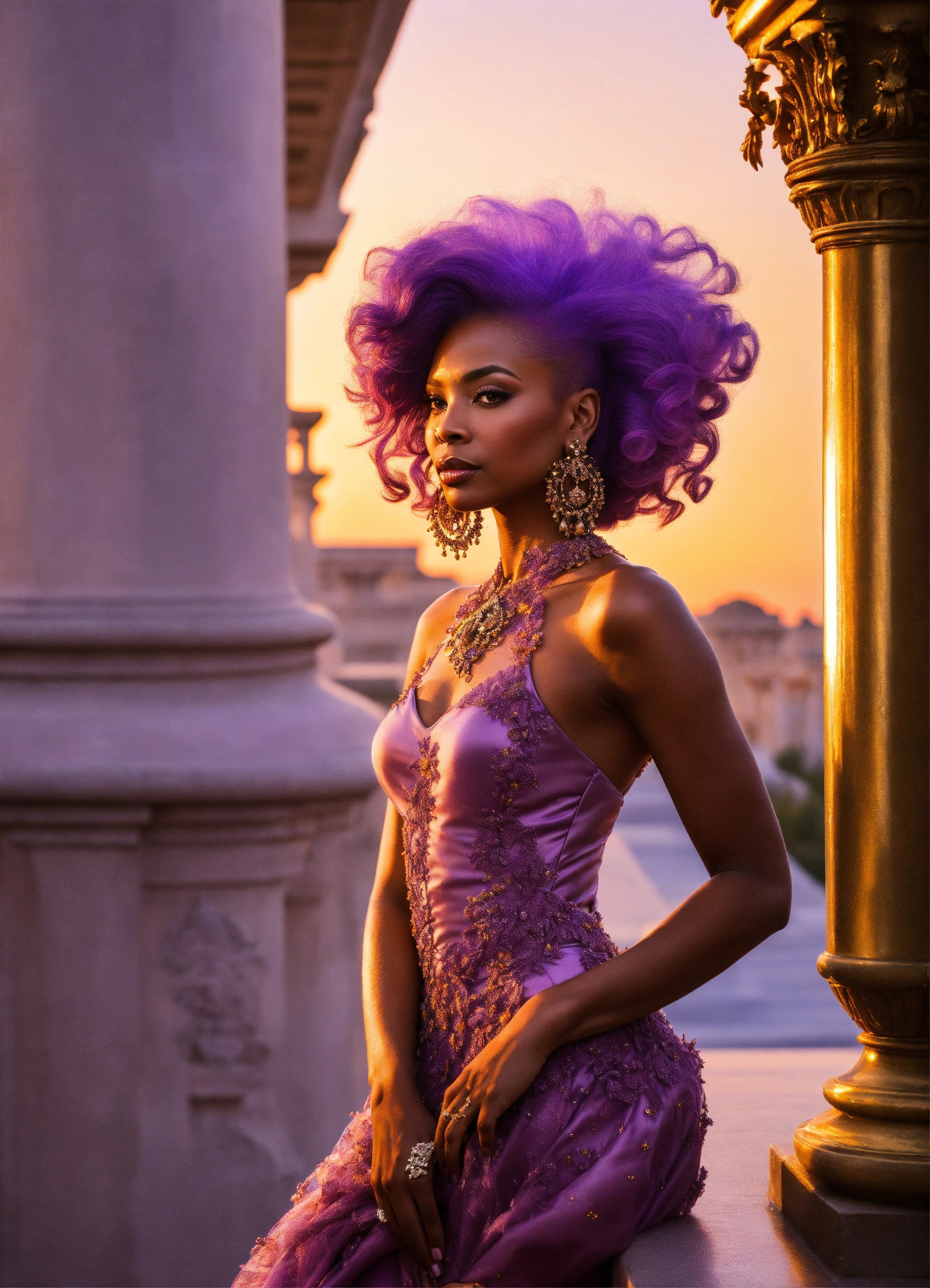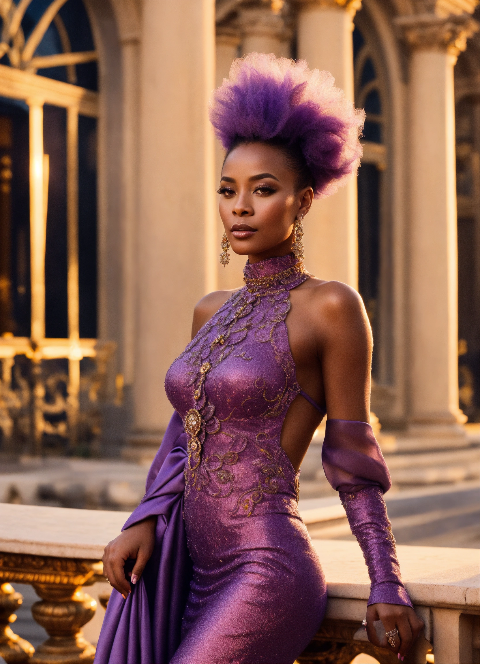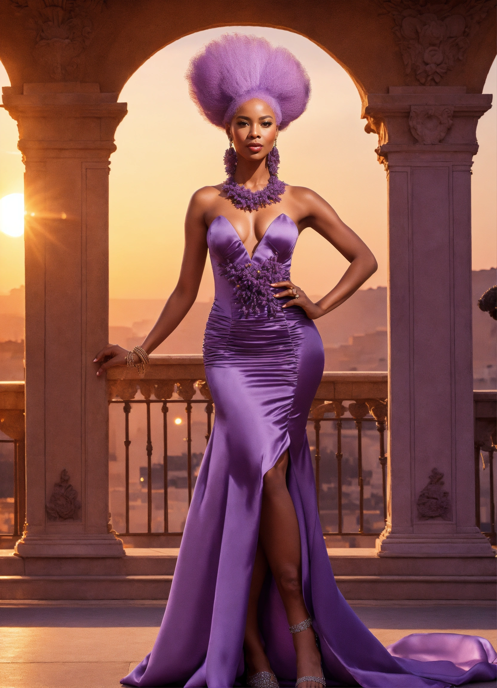Lavender-skinned alien female, amethyst hair, 50-year-old, light-skin african-american features, haute couture dress and heels standing on a sumptuous palace terrace at sunset. charismatic demeanor.