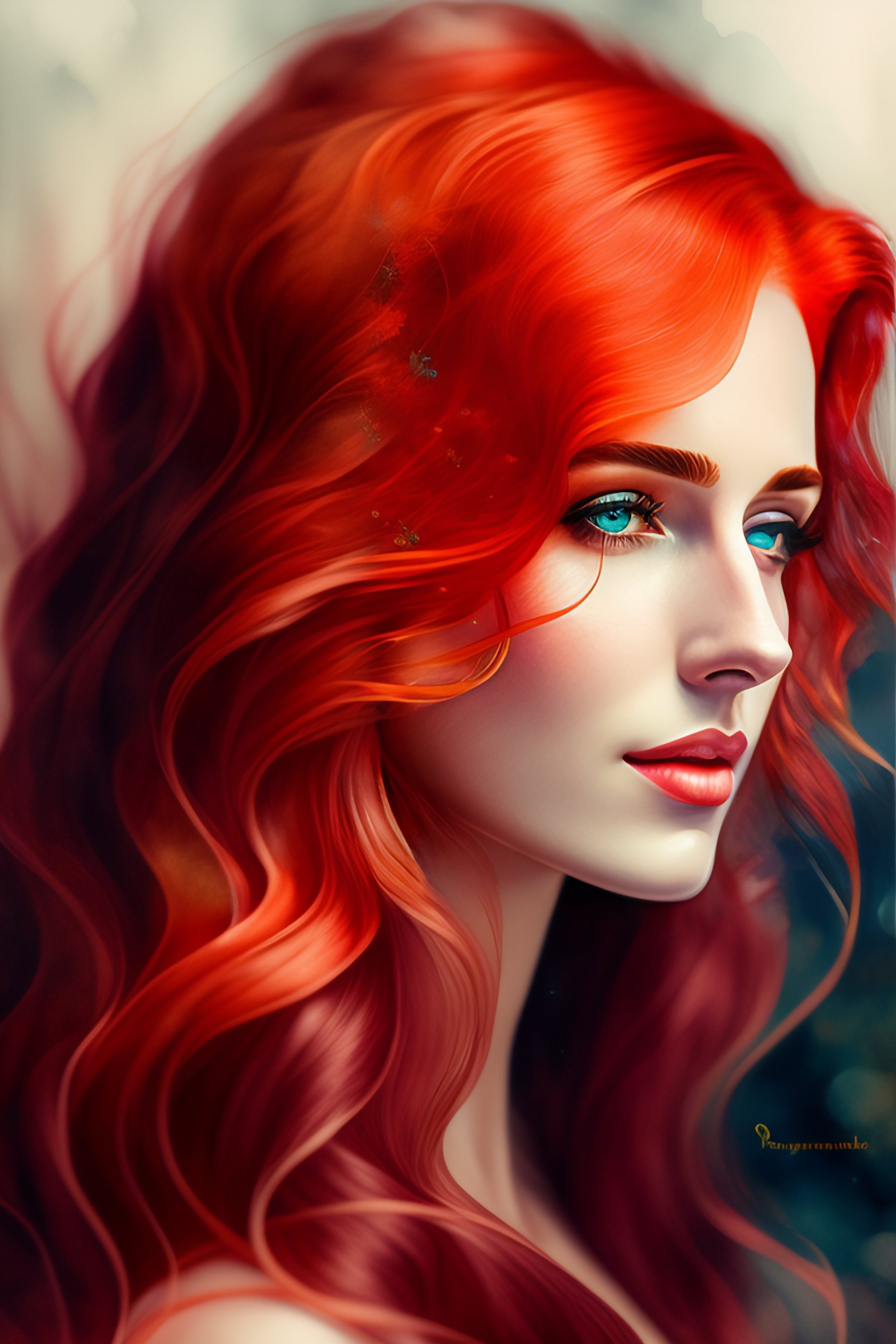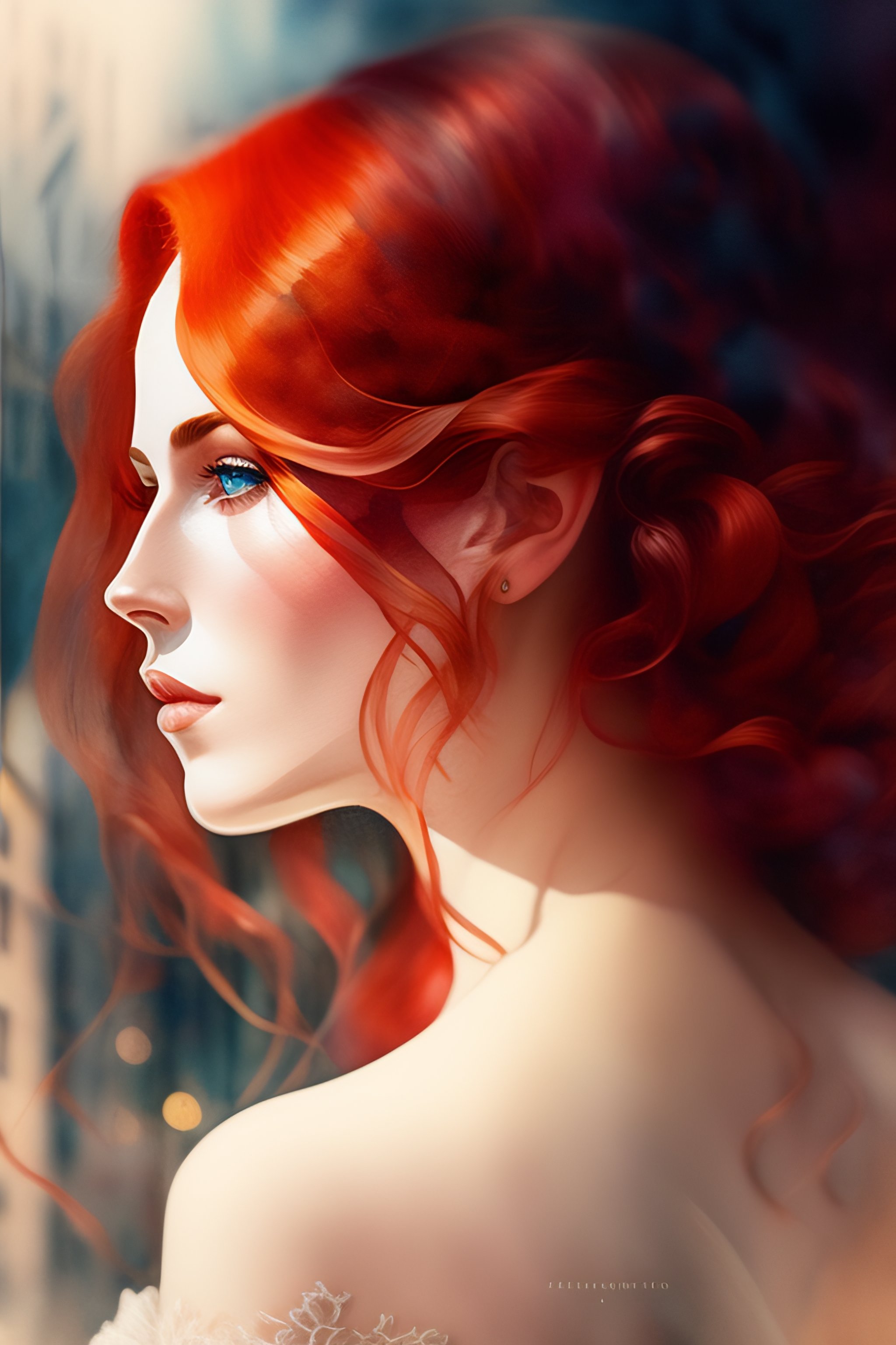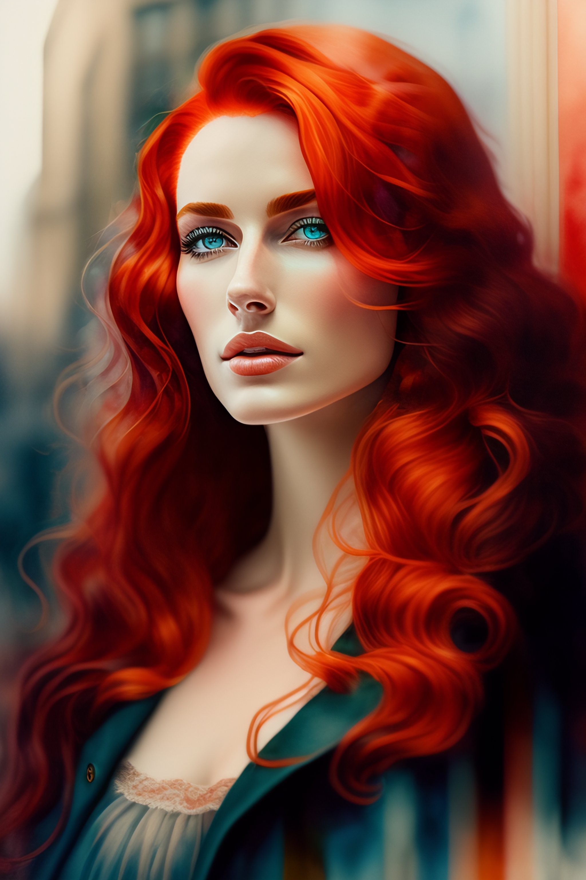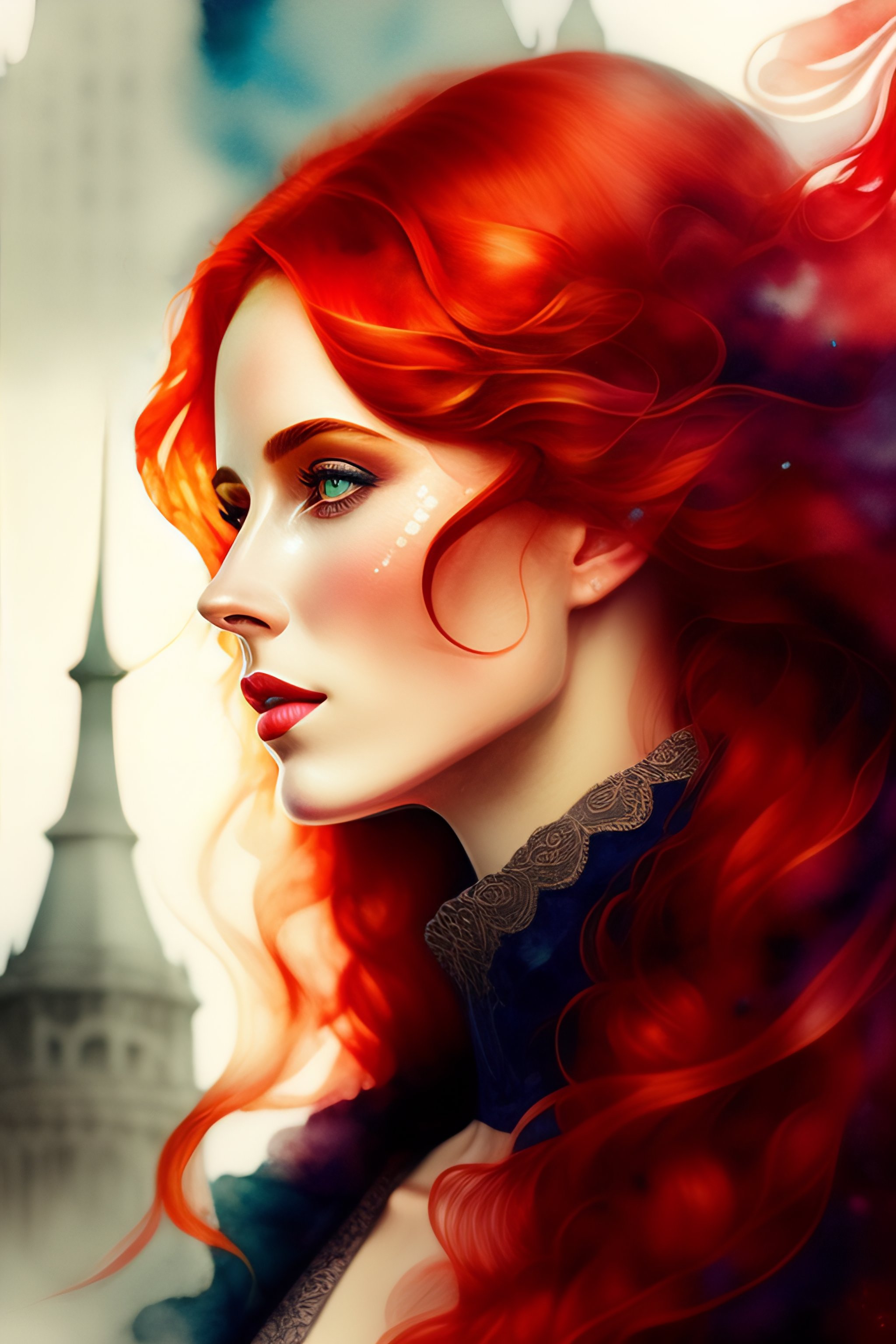 Beautiful character design, double exposure painting, front profile female character with red hair, beautiful hair and confident, insanely detailed and intricate, elegant, watercolor, cinematic, portrait, raphaelite, headroom, pierre-auguste renoir