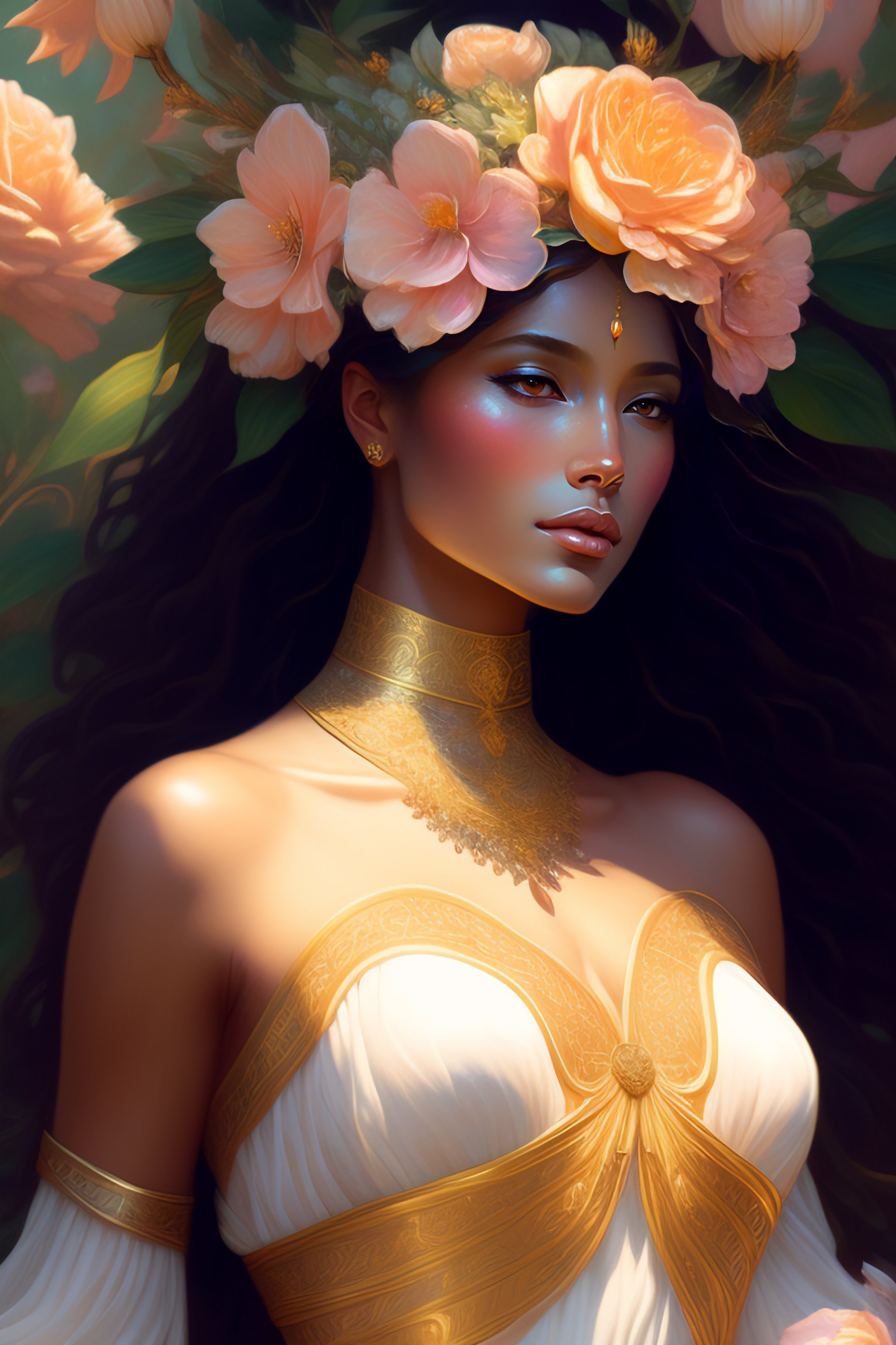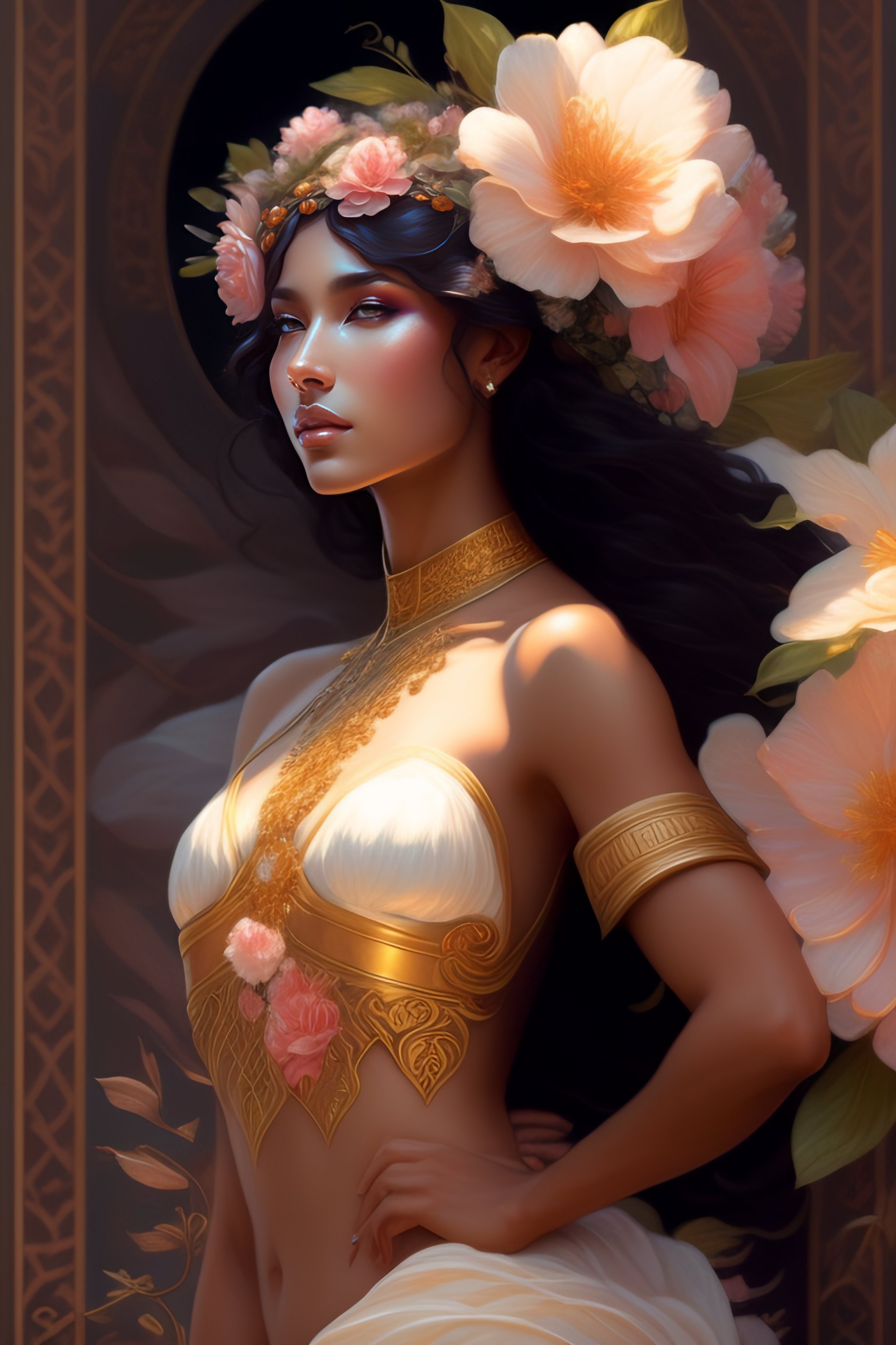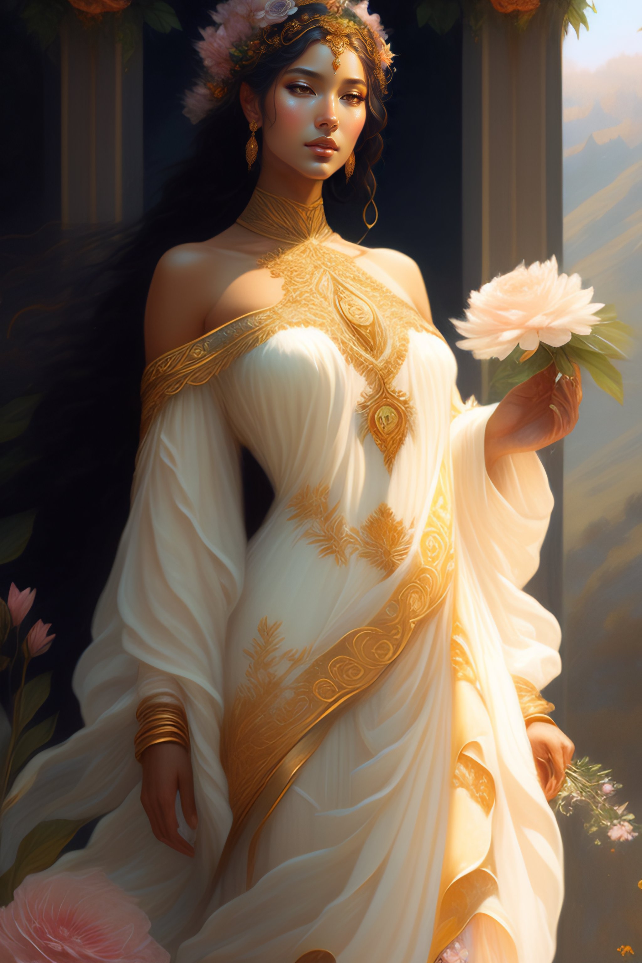 Flower goddess, full body, intricate, elegant, highly detailed, digital painting, artstation, concept art, smooth, sharp focus, illustration, art by artgerm and greg rutkowski and alphonse mucha and william - adolphe bouguereau and stephanie law