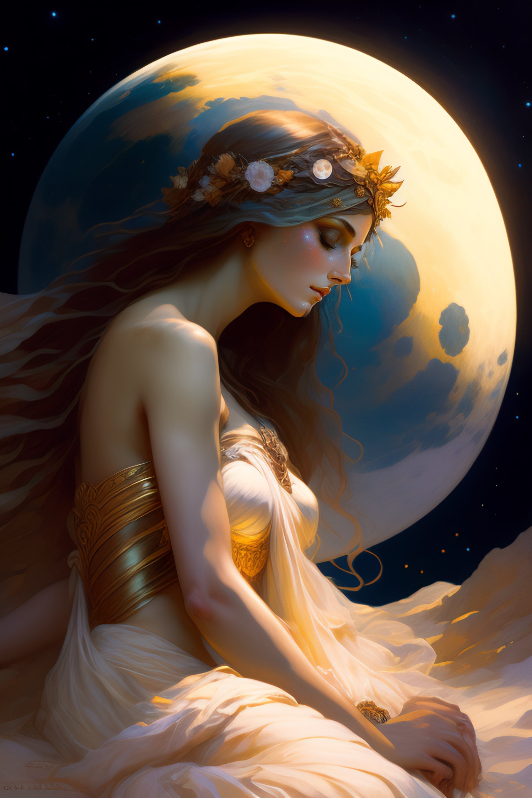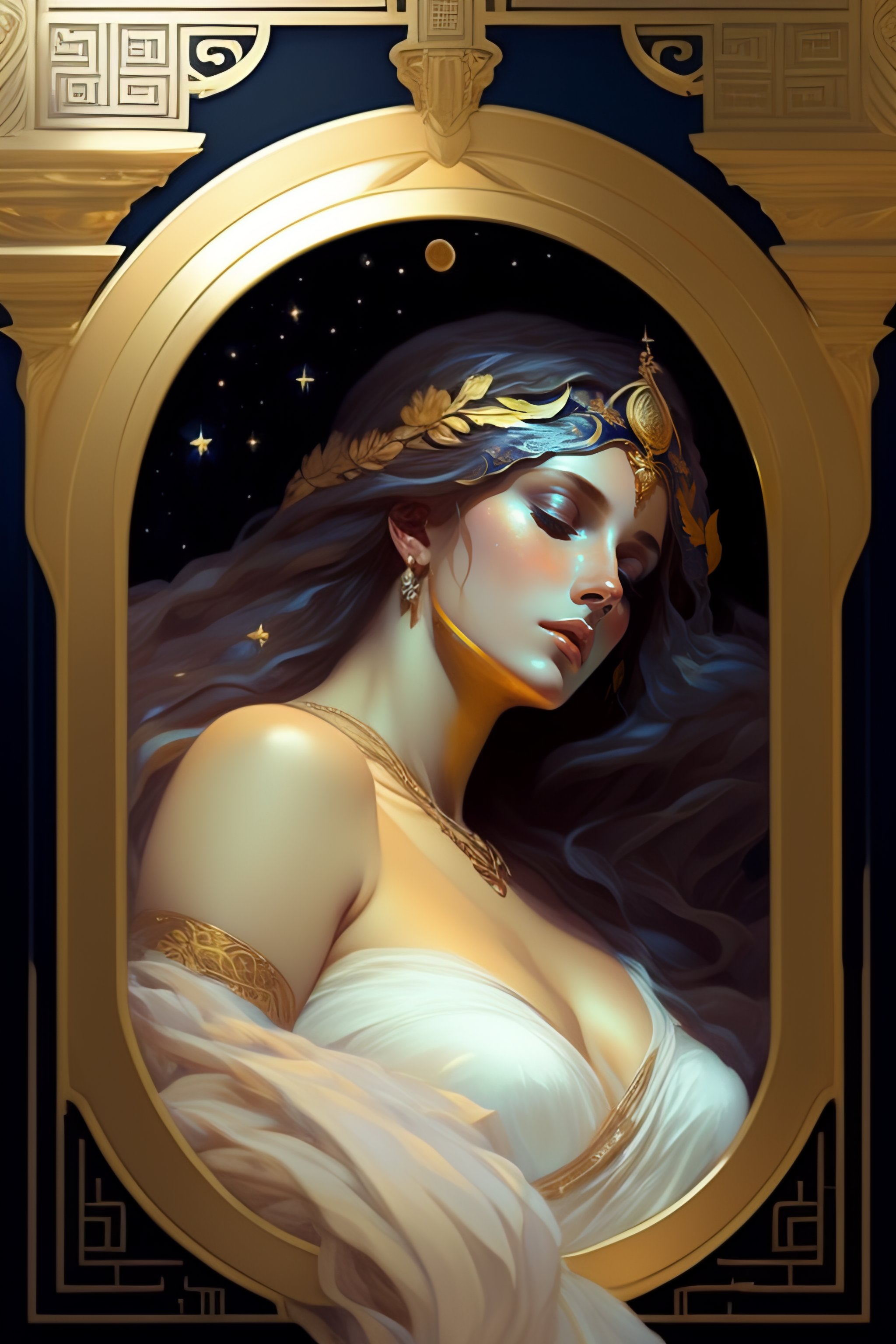 Greek goddess sleeping on moon art by greg rutkowski and alphonse mucha