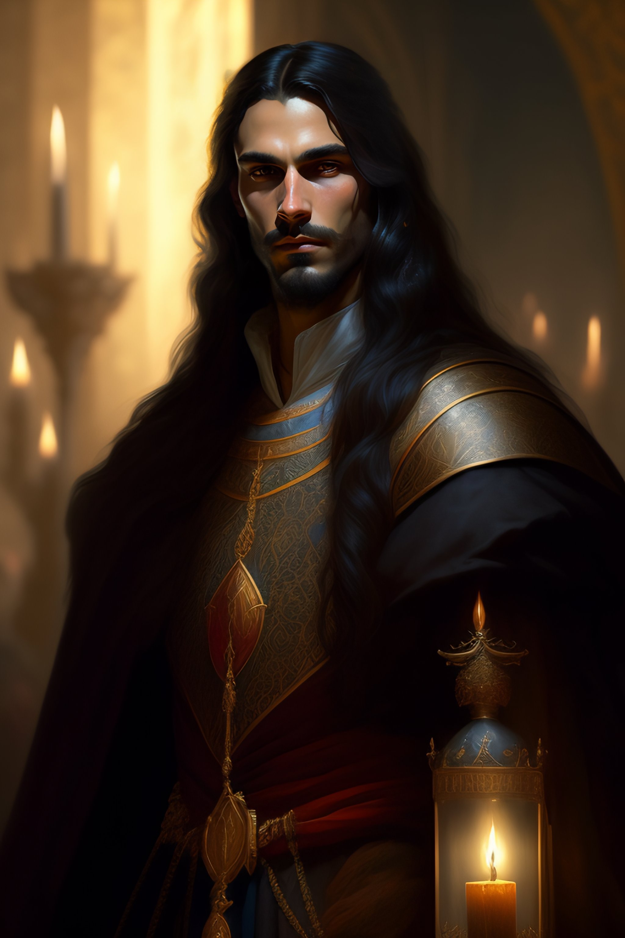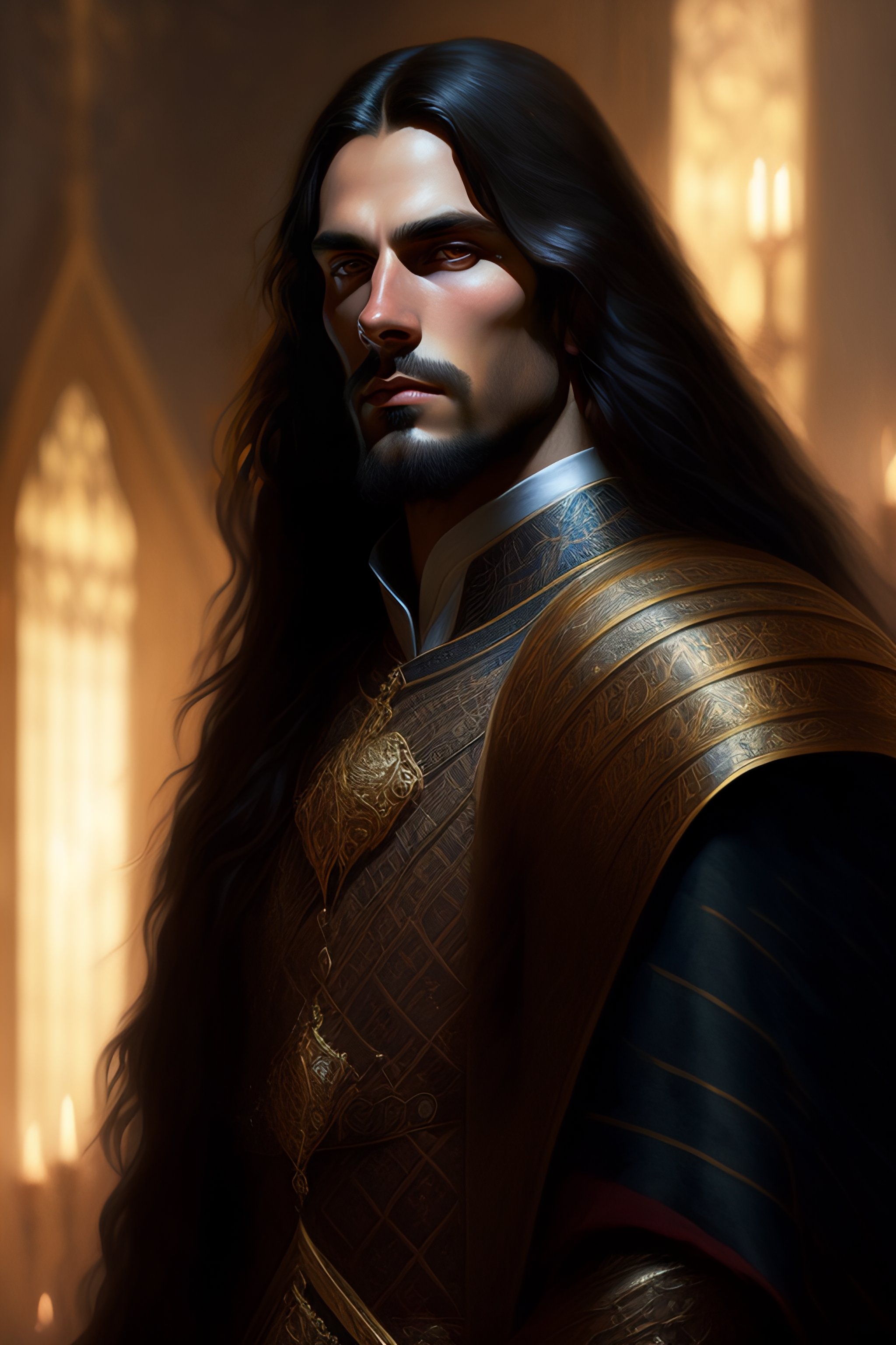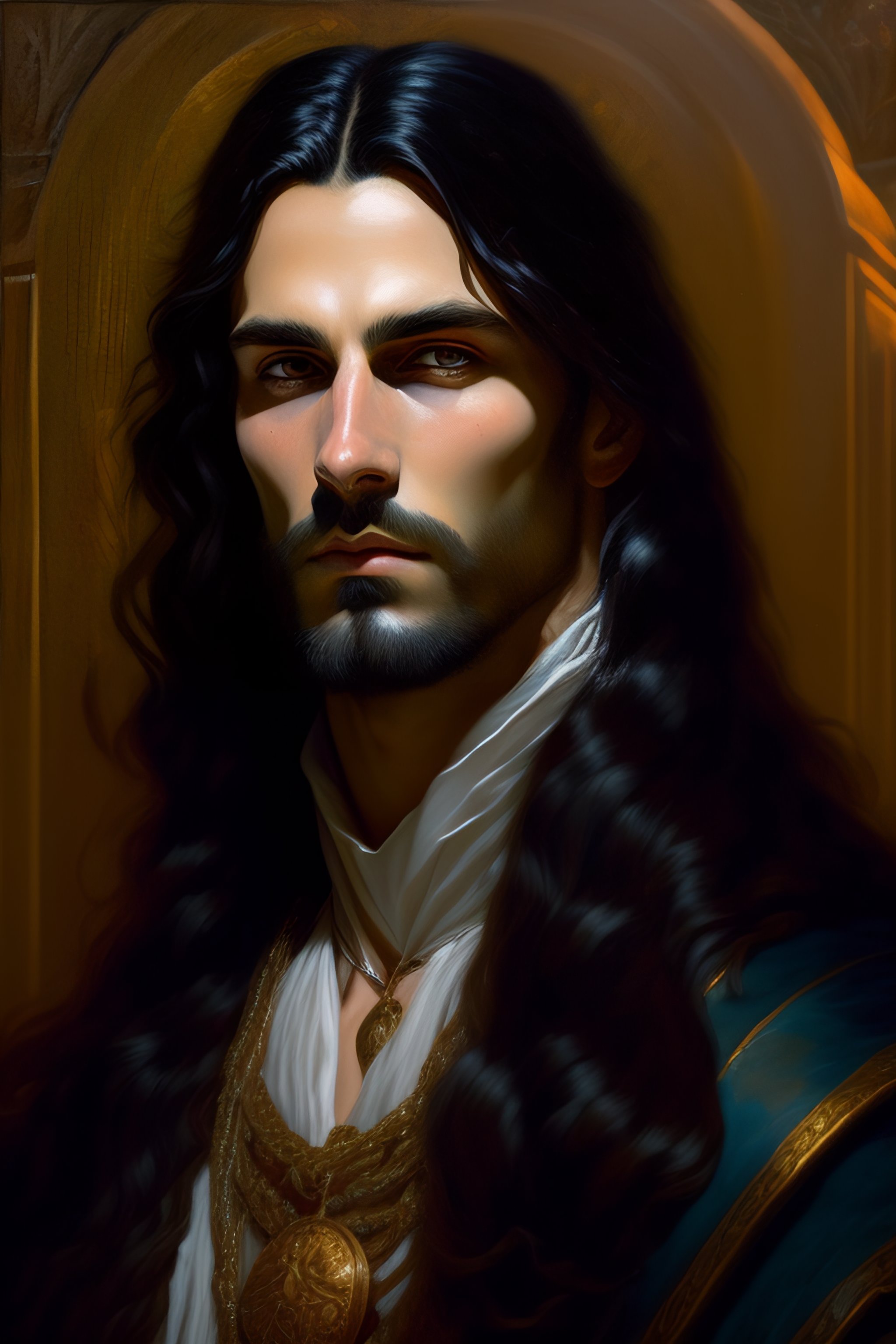 Medieval portrait of a lord man with long dark hair sharp features, grim, cold stare, dark colors, volumetric lighting, baroque oil painting by greg rutkowski, artgerm, wlop, alphonse mucha dynamic lighting hyperdetailed intricately detailed