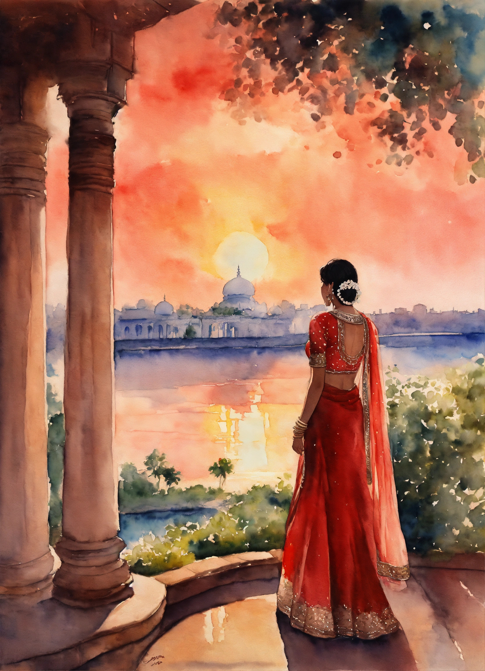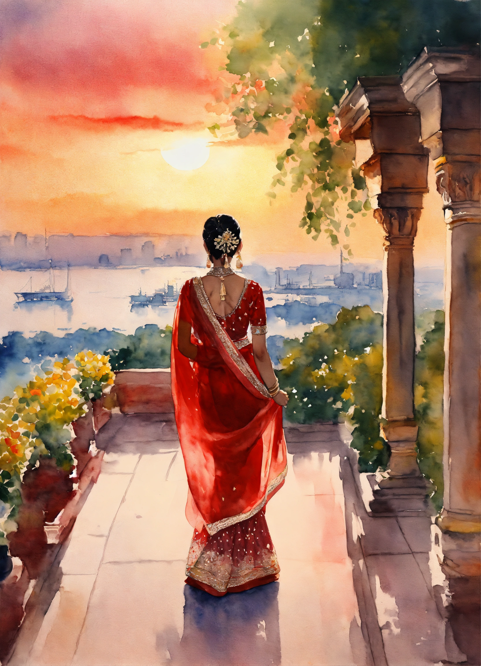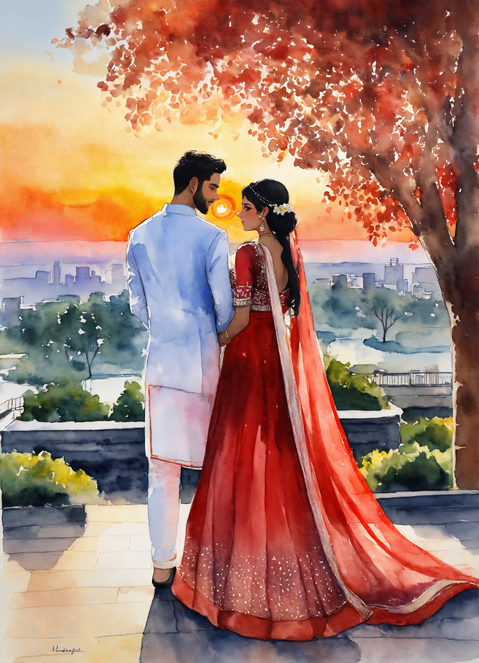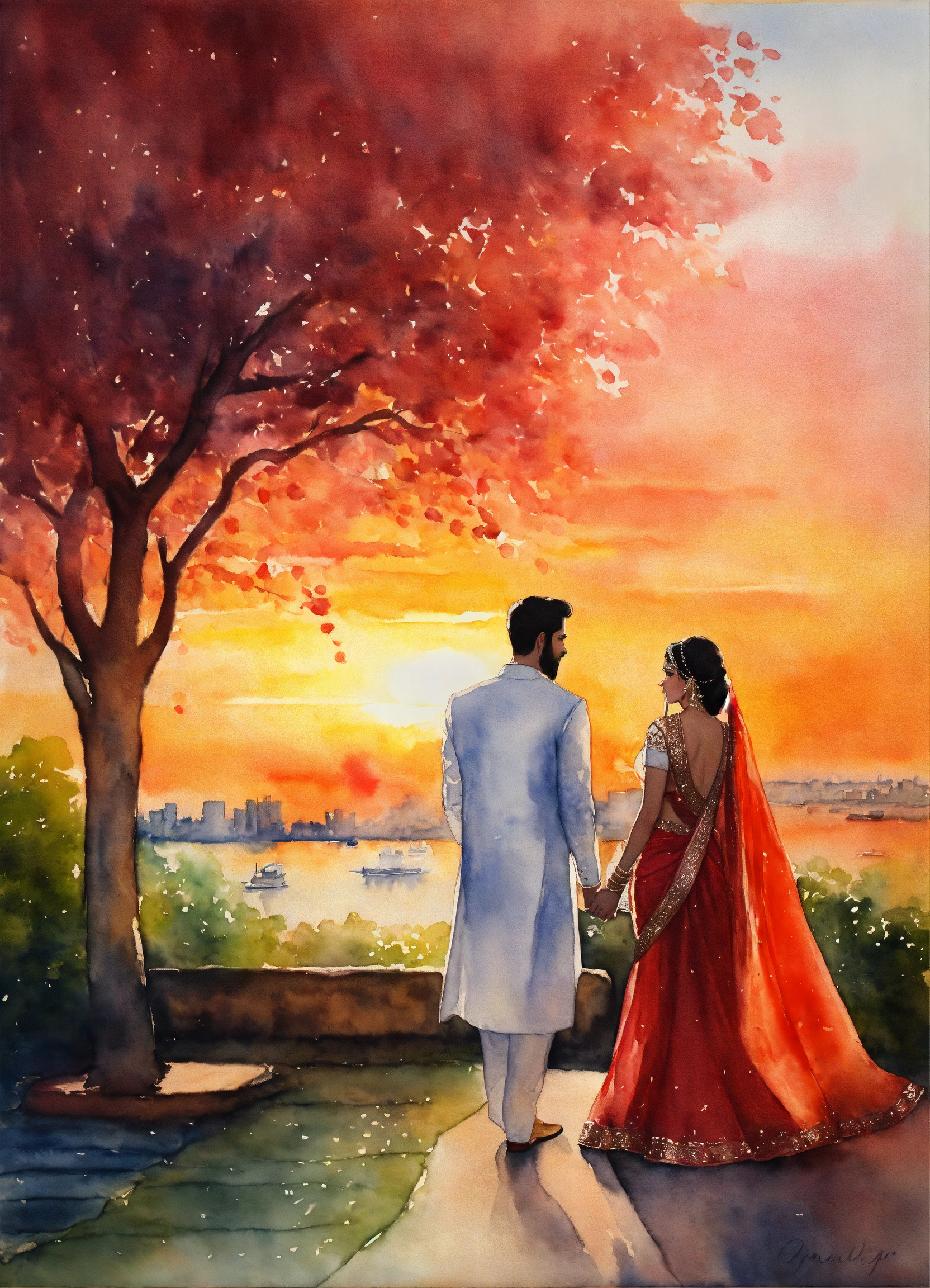 Watercolour painting, back view, indian bride in red saree, groom in white kurta, sunset, garden, trees, white mandap, city skyline, sea